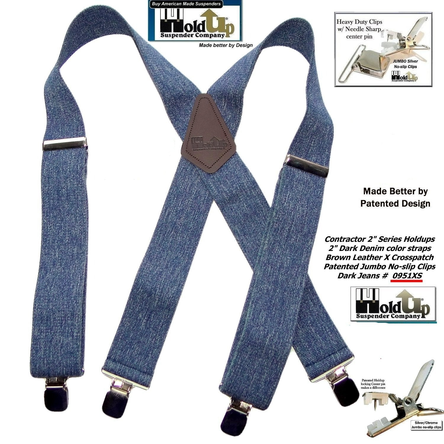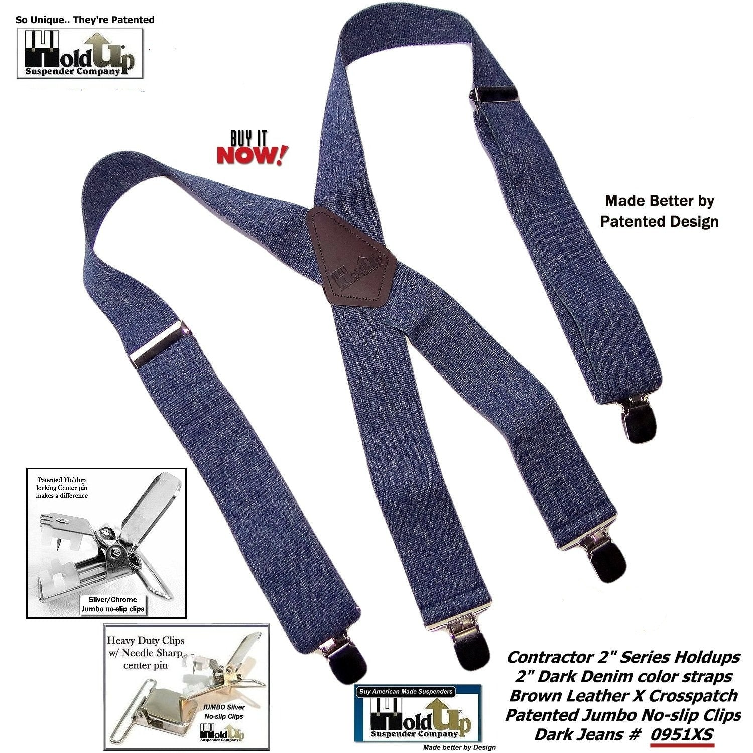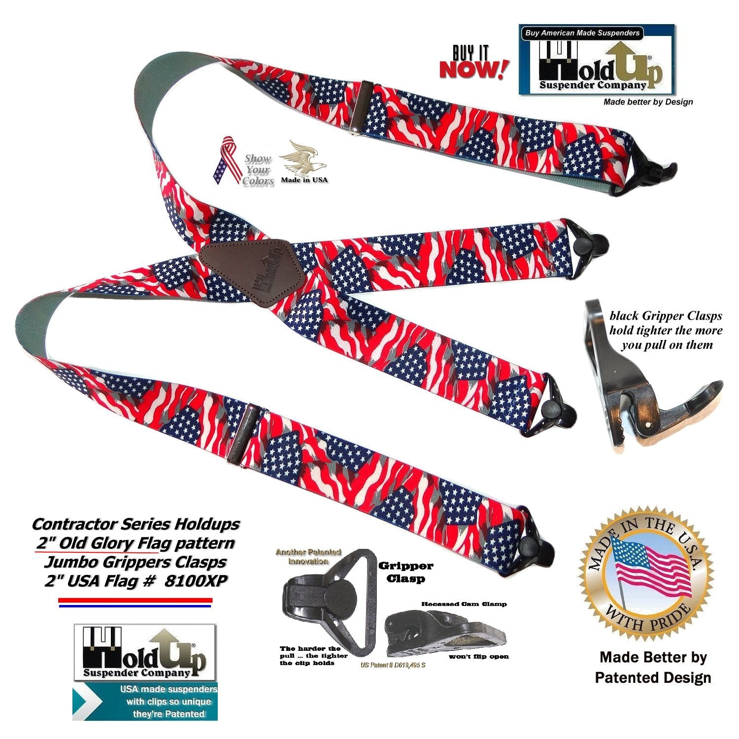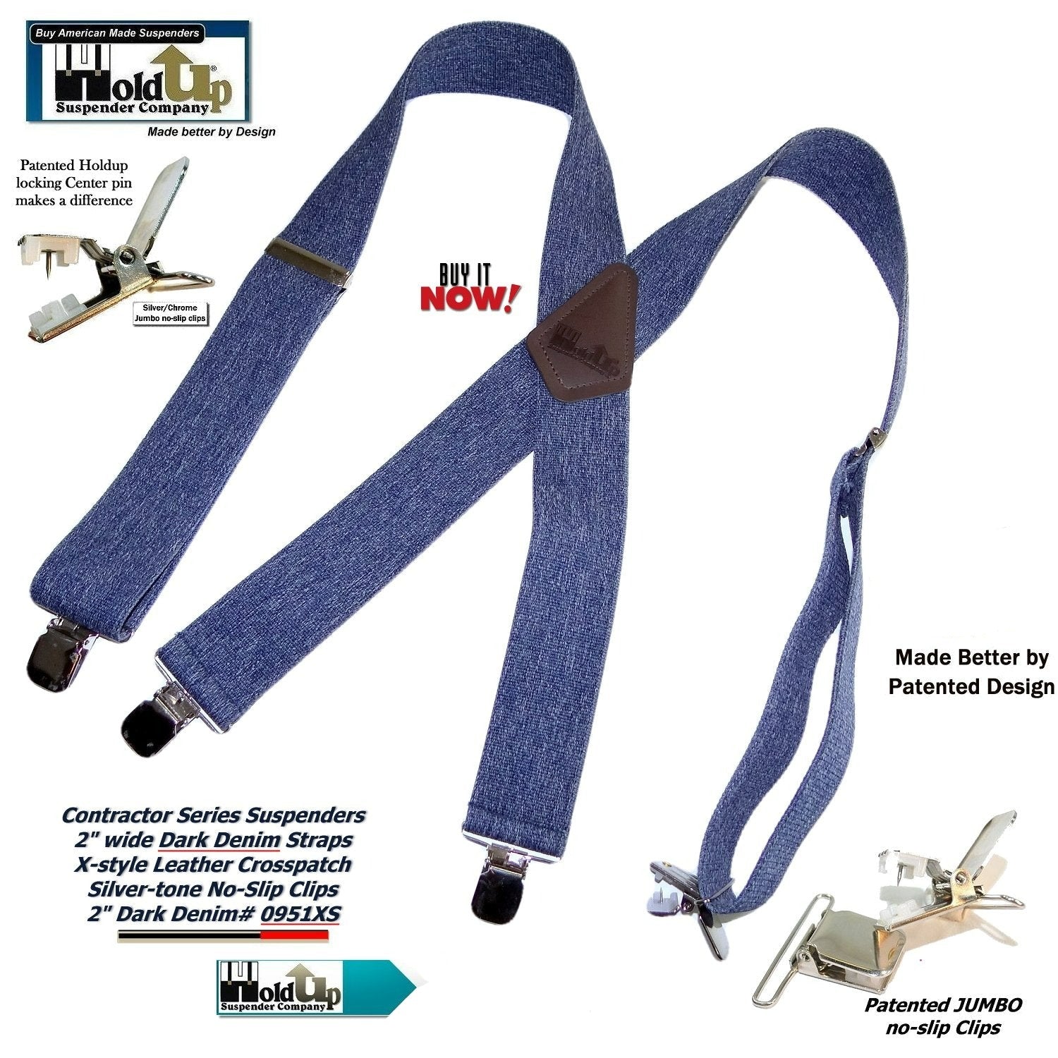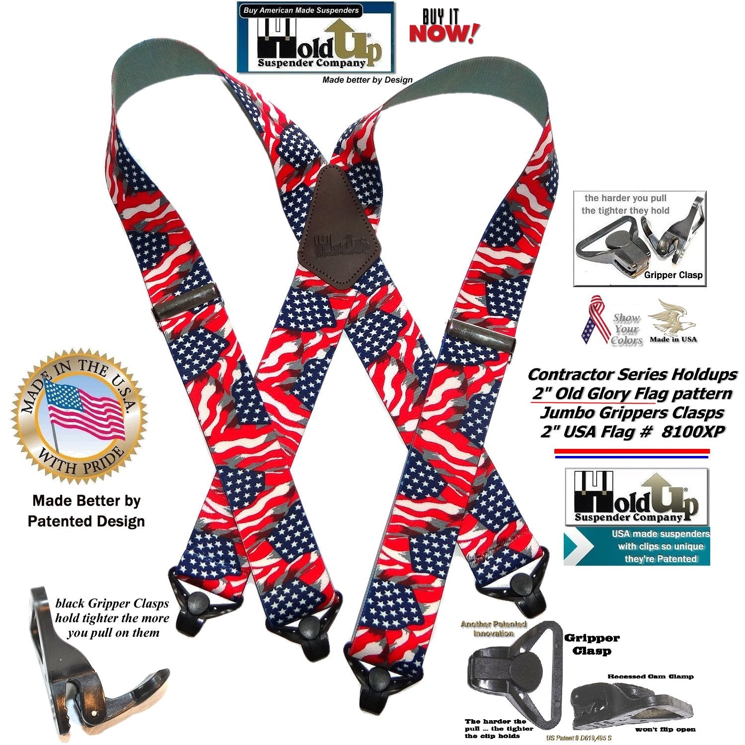 All materials are carefully chosen for elasticity, durability and Holdup's come with a limited clip guarantee that they'll never slip-slide or Pop Off your pants. Buy one of these Holdup Suspenders in a heavy-duty 2" width that are built to last a limited! All have our exclusive heavy-duty jumbo no-slip clips or Black Jumbo Gripper Clasps attached on the 4 USA made elastic suspender straps. The Holdup logo is embossed in the X-back brown leather crosspatch made from top-grade leather. Now featuring a light and Dark denim work suspenders and a 2 inch wide USA Flag pattern style on sale at our Amazon Holdup Suspender Web Shop. Get heavy-duty work suspenders for the working man from a USA company committed to being America's premier pant suspender manufacturer. You may pay by using your Amazon or PayPal account or using your preferred credit/Debit Card with Free Freight option at checkout.