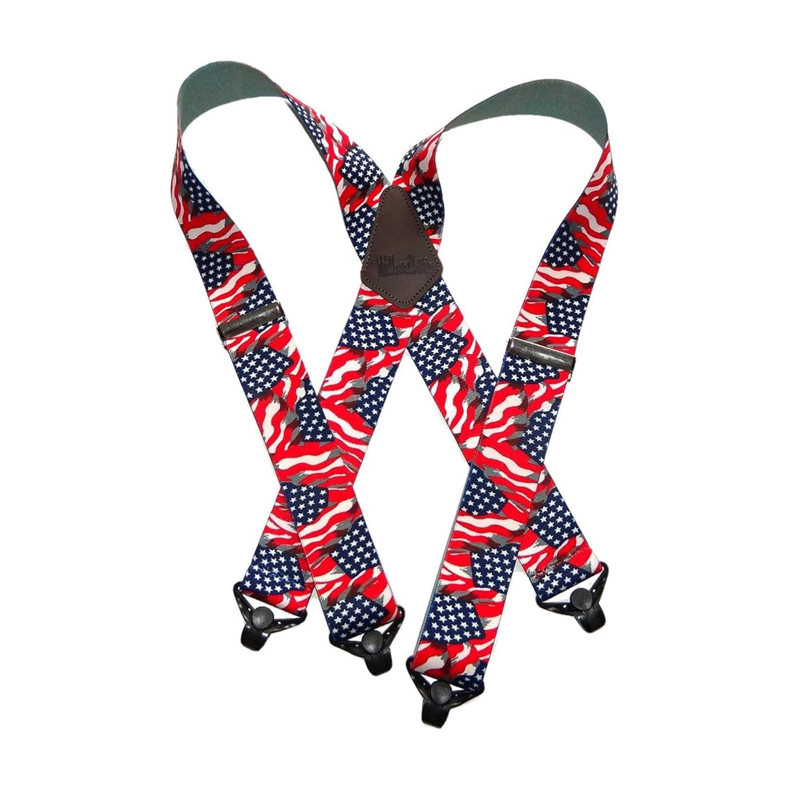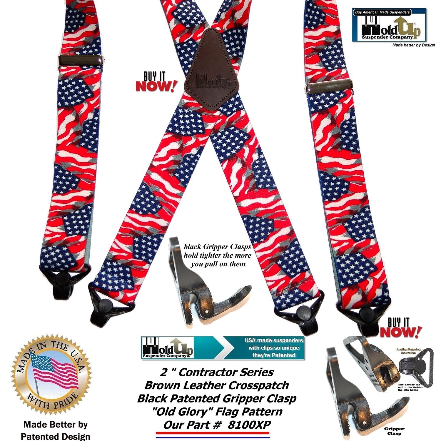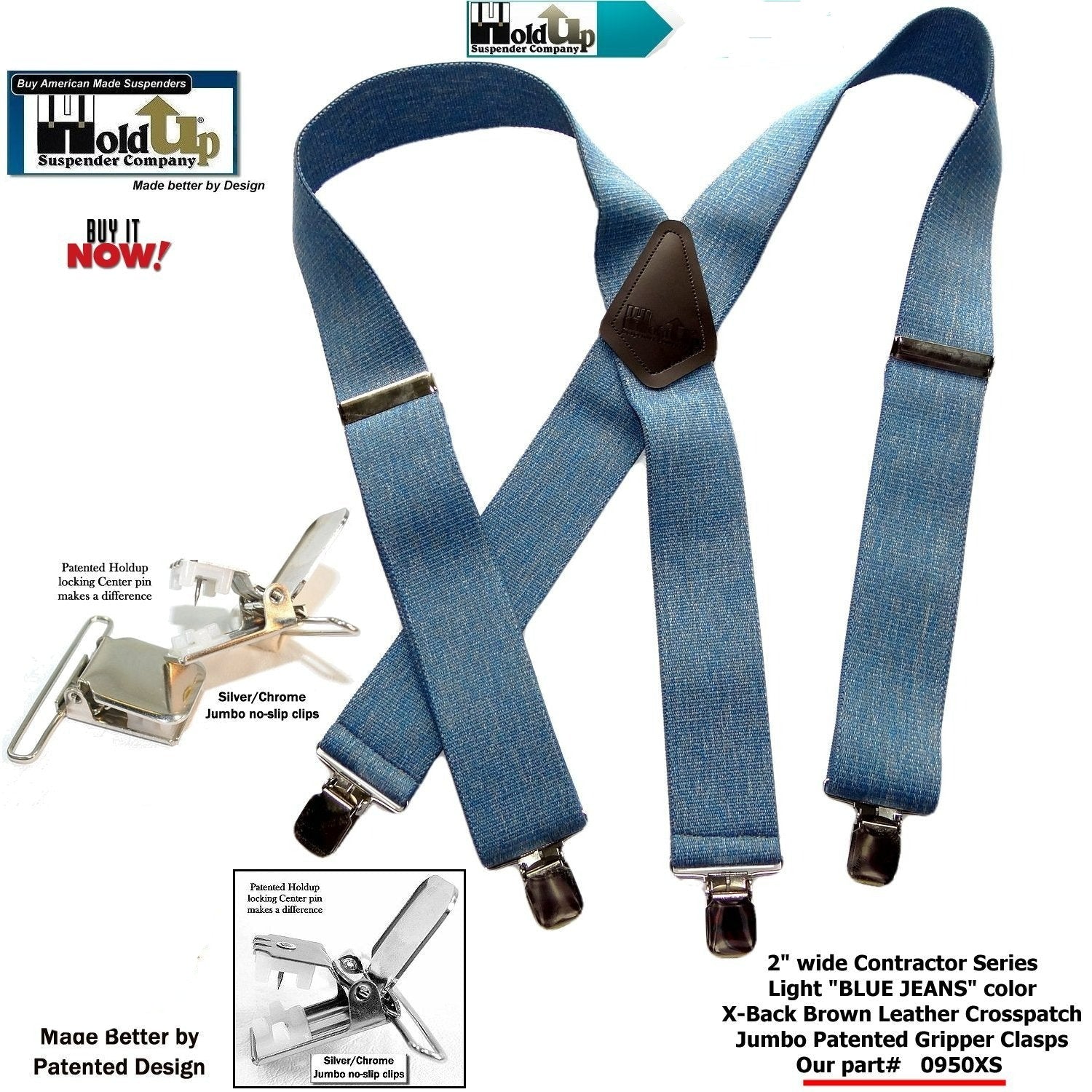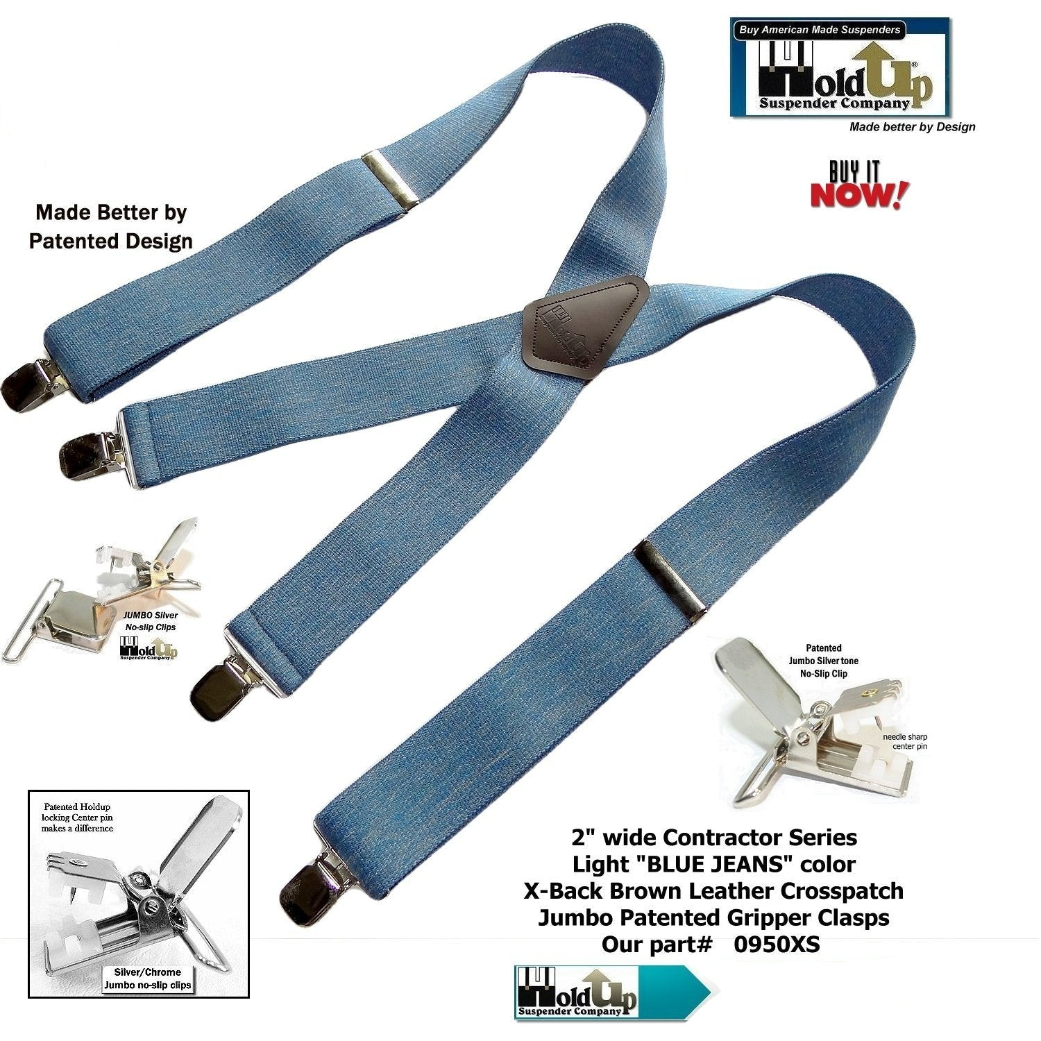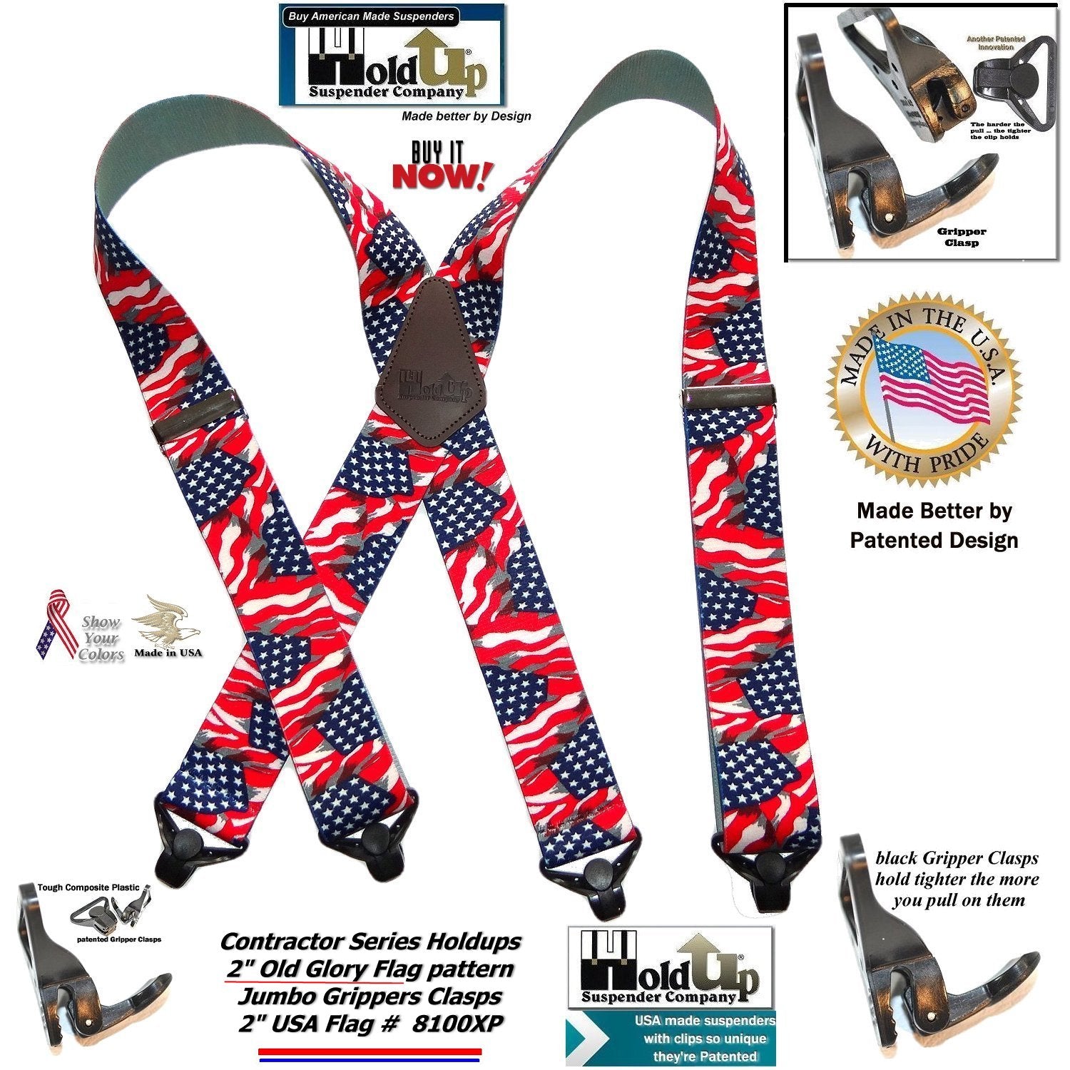 All materials are carefully chosen for elasticity, durability and Holdup's come with a limited clip guarantee that they'll never slip-slide or Pop Off your pants. Buy one of these Holdup Suspenders in a heavy-duty 2" width that are built to last a limited! All have our exclusive heavy-duty jumbo no-slip clips or Black Jumbo Gripper Clasps attached on the 4 USA made elastic suspender straps. The Holdup logo is embossed in the X-back brown leather crosspatch made from top-grade leather. Now featuring a light and Dark denim work suspenders and a 2 inch wide USA Flag pattern style on sale at our Amazon Holdup Suspender Web Shop. Get heavy-duty work suspenders for the working man from a USA company committed to being America's premier pant suspender manufacturer. You may pay by using your Amazon or PayPal account or using your preferred credit/Debit Card with Free Freight option at checkout.