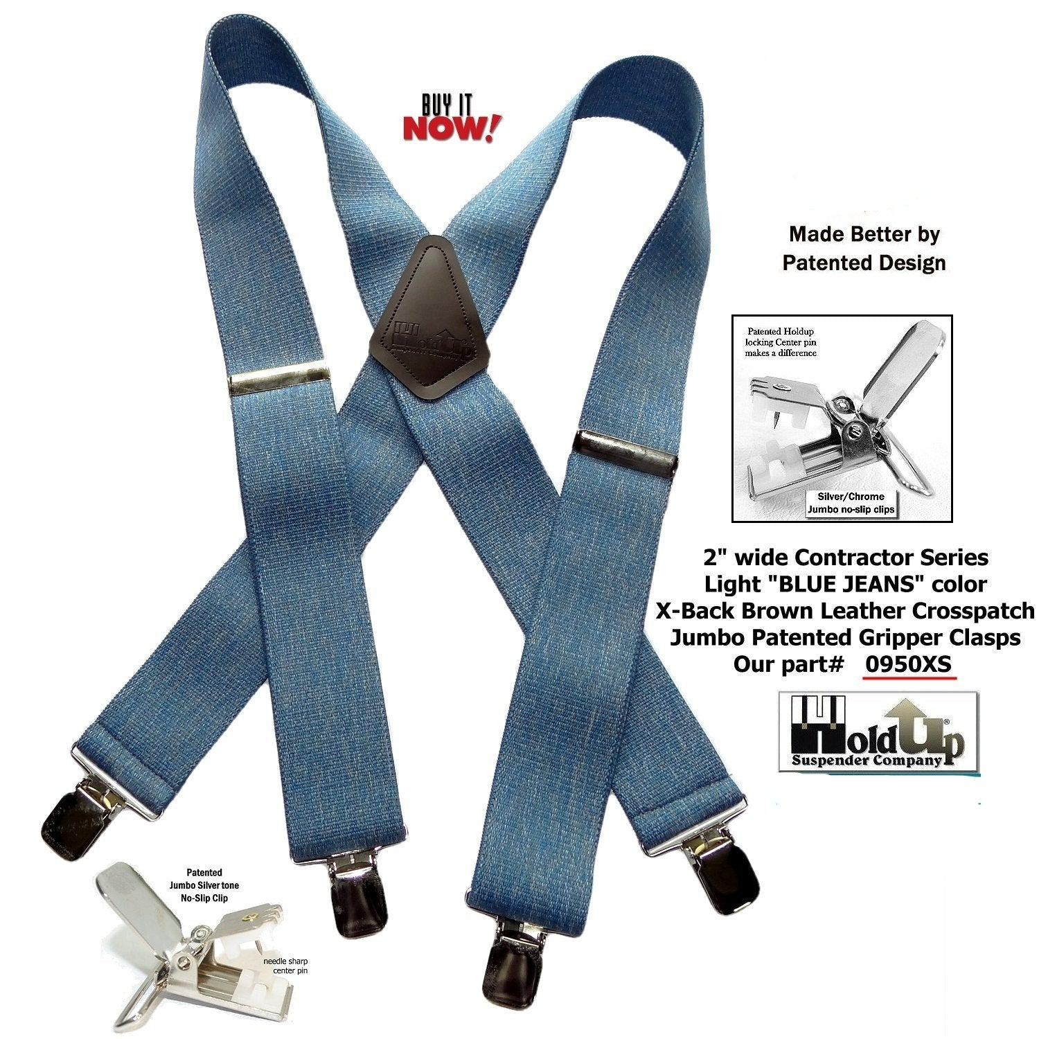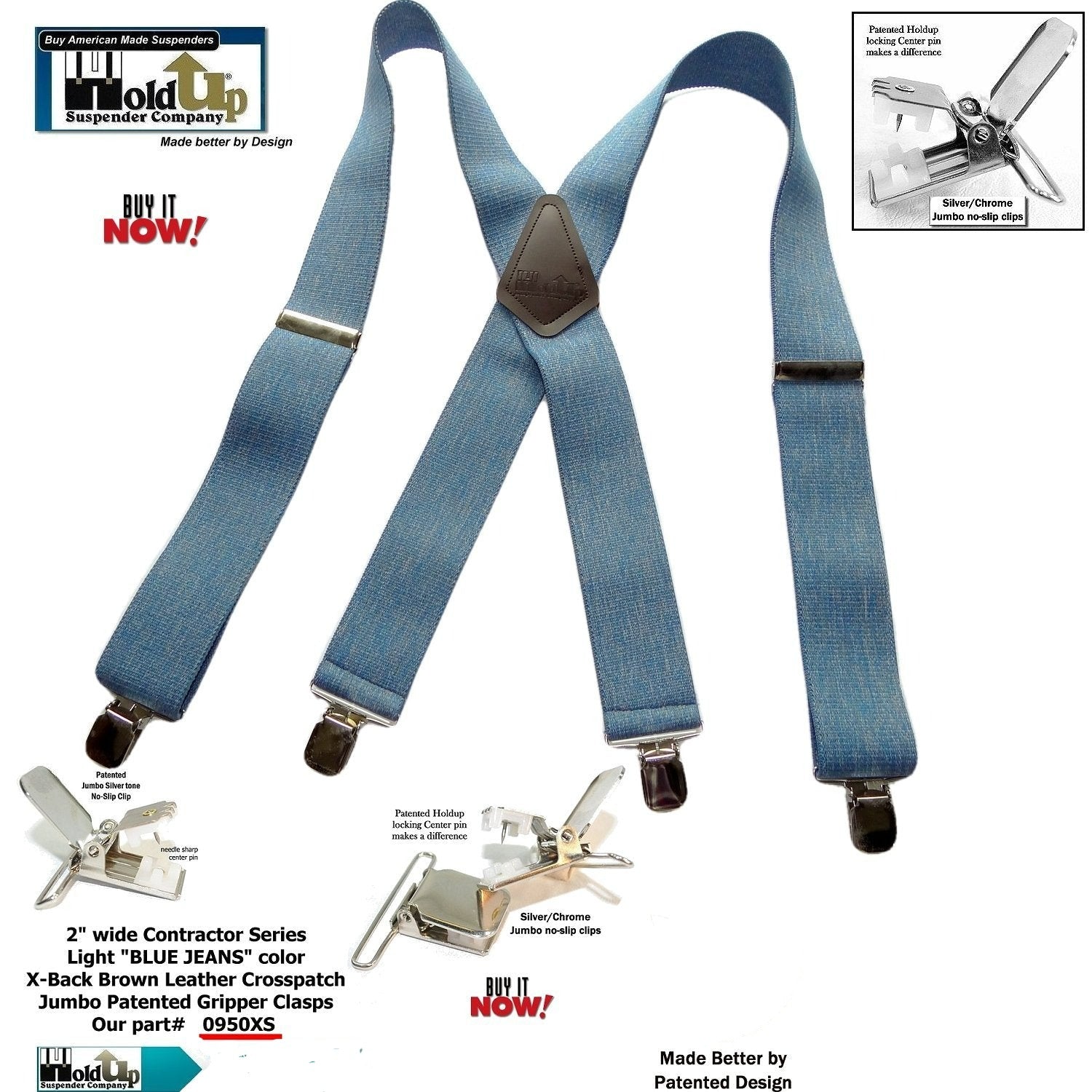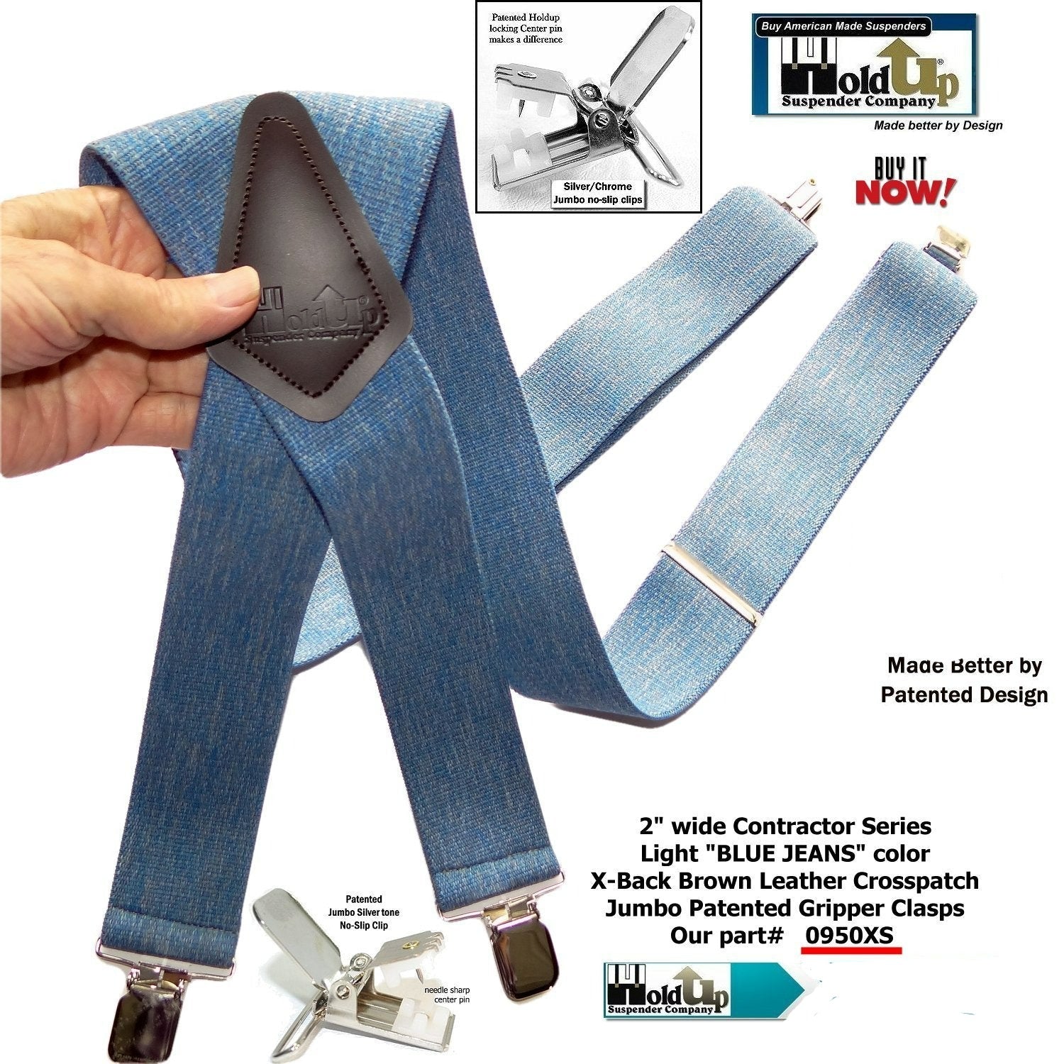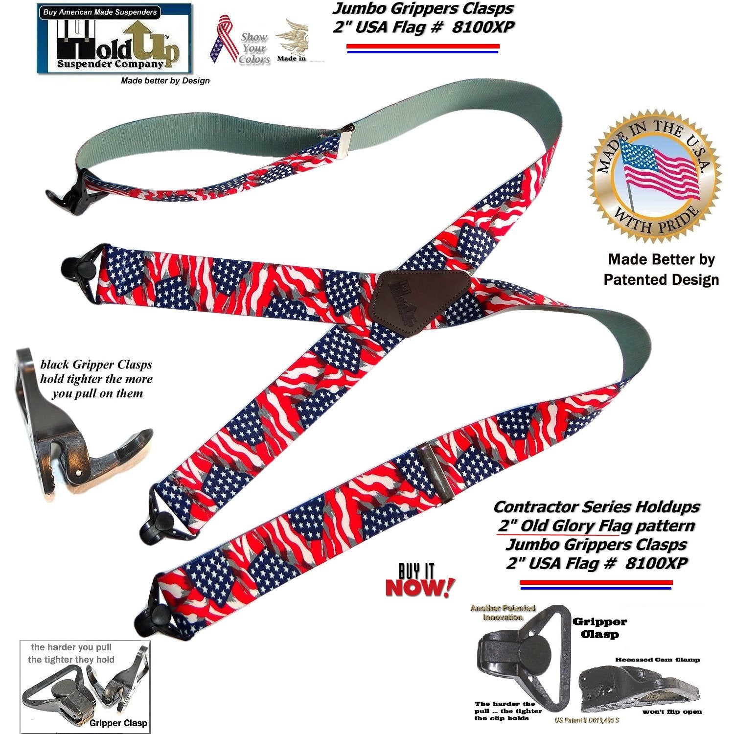 All materials are carefully chosen for elasticity, durability and Holdup's come with a limited clip guarantee that they'll never slip-slide or Pop Off your pants. Buy one of these Holdup Suspenders in a heavy-duty 2" width that are built to last a limited! All have our exclusive heavy-duty jumbo no-slip clips or Black Jumbo Gripper Clasps attached on the 4 USA made elastic suspender straps. The Holdup logo is embossed in the X-back brown leather crosspatch made from top-grade leather. Now featuring a light and Dark denim work suspenders and a 2 inch wide USA Flag pattern style on sale at our Amazon Holdup Suspender Web Shop. Get heavy-duty work suspenders for the working man from a USA company committed to being America's premier pant suspender manufacturer. You may pay by using your Amazon or PayPal account or using your preferred credit/Debit Card with Free Freight option at checkout.