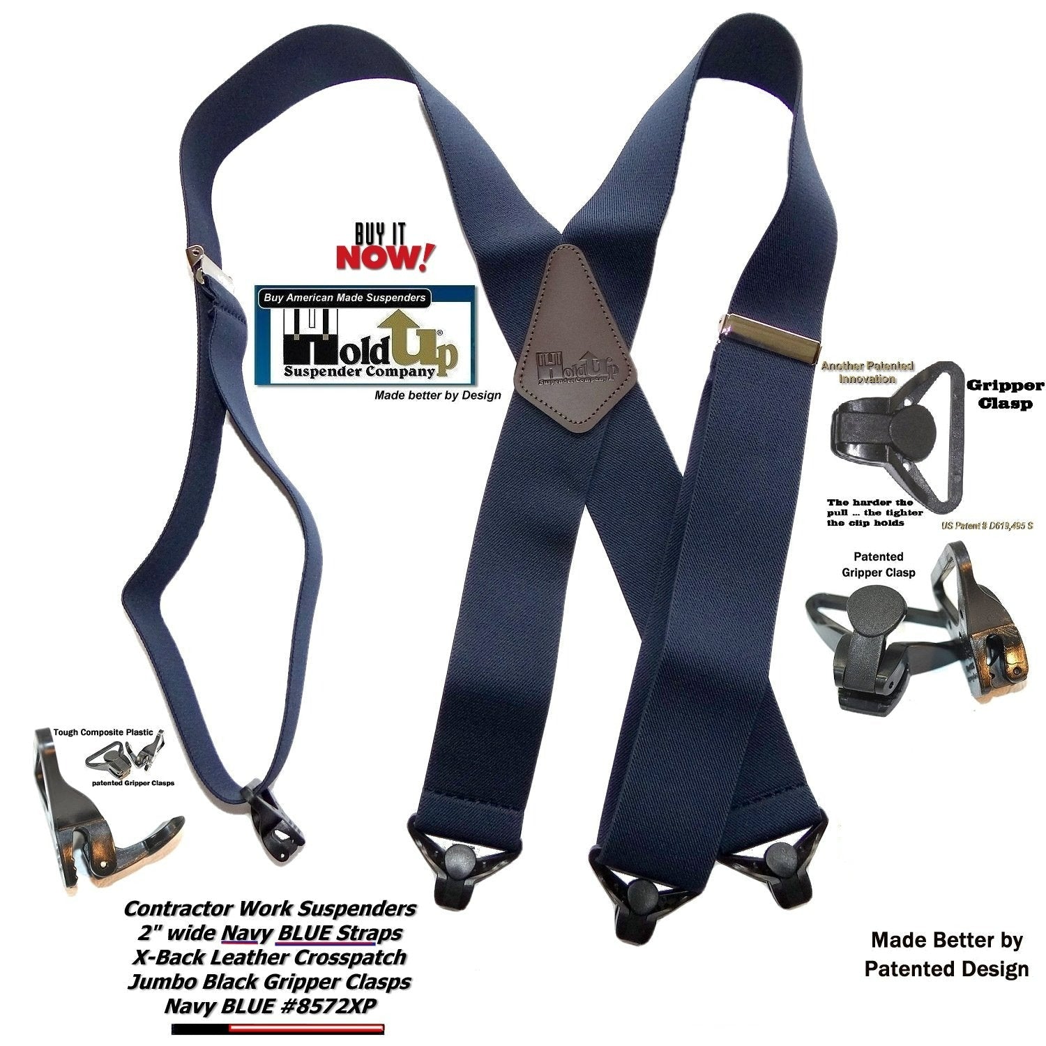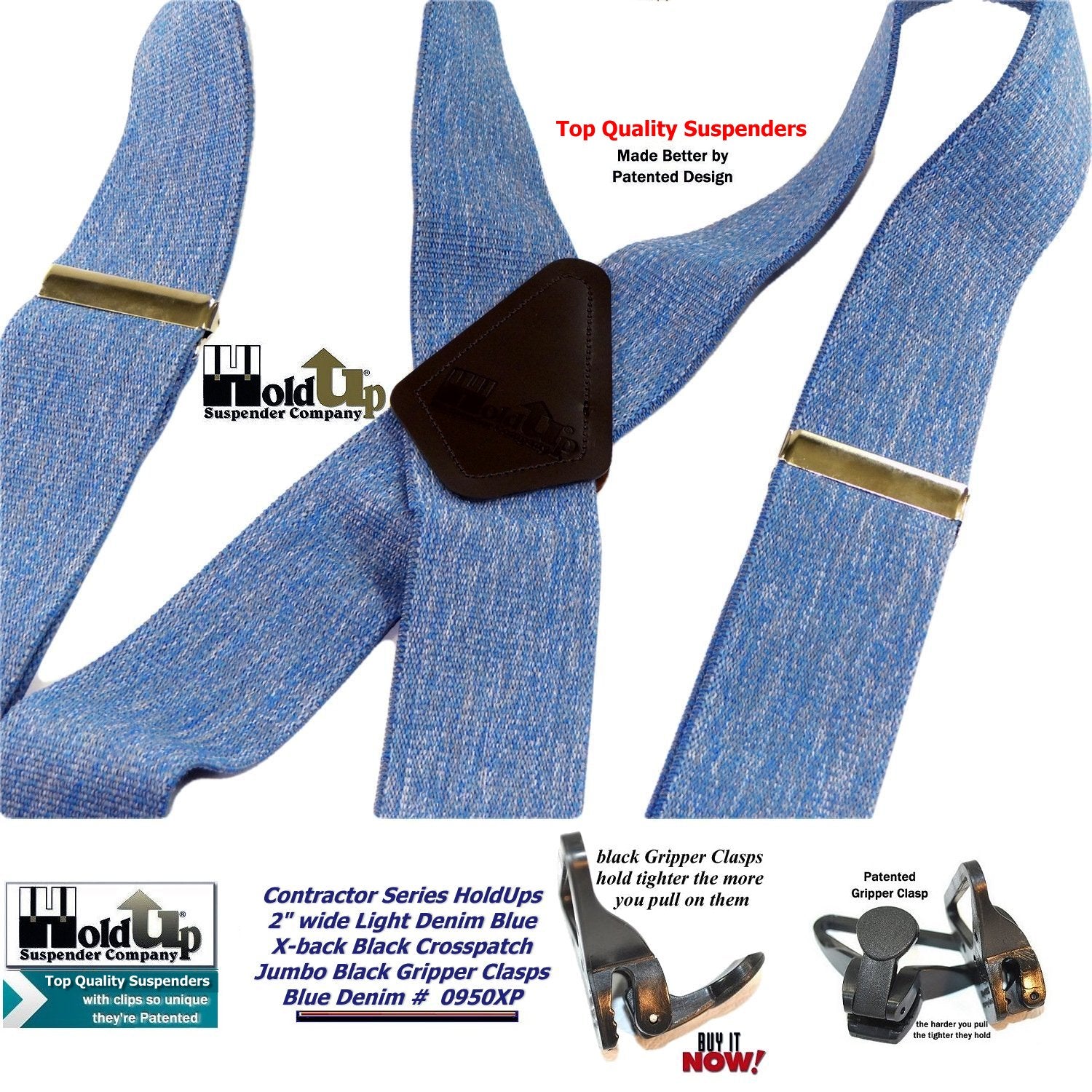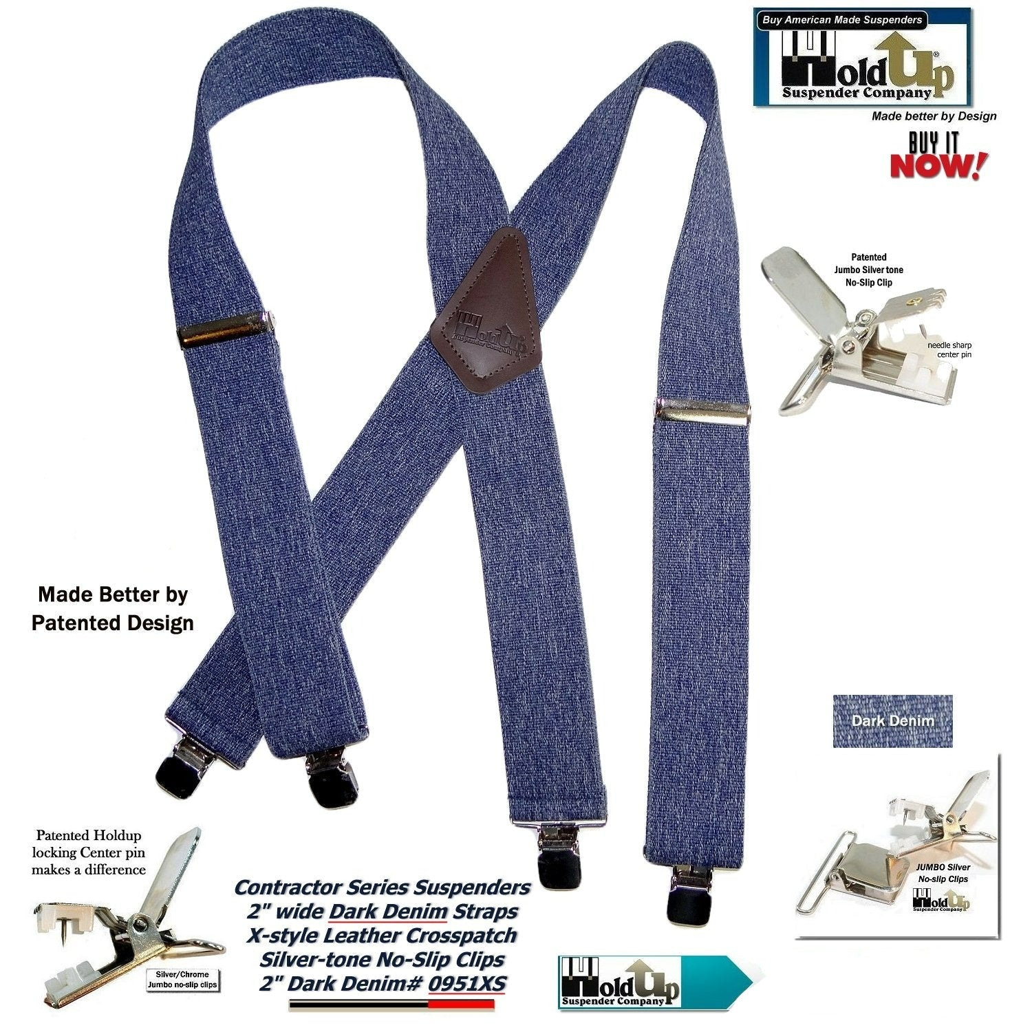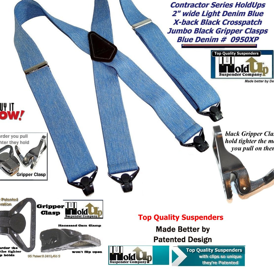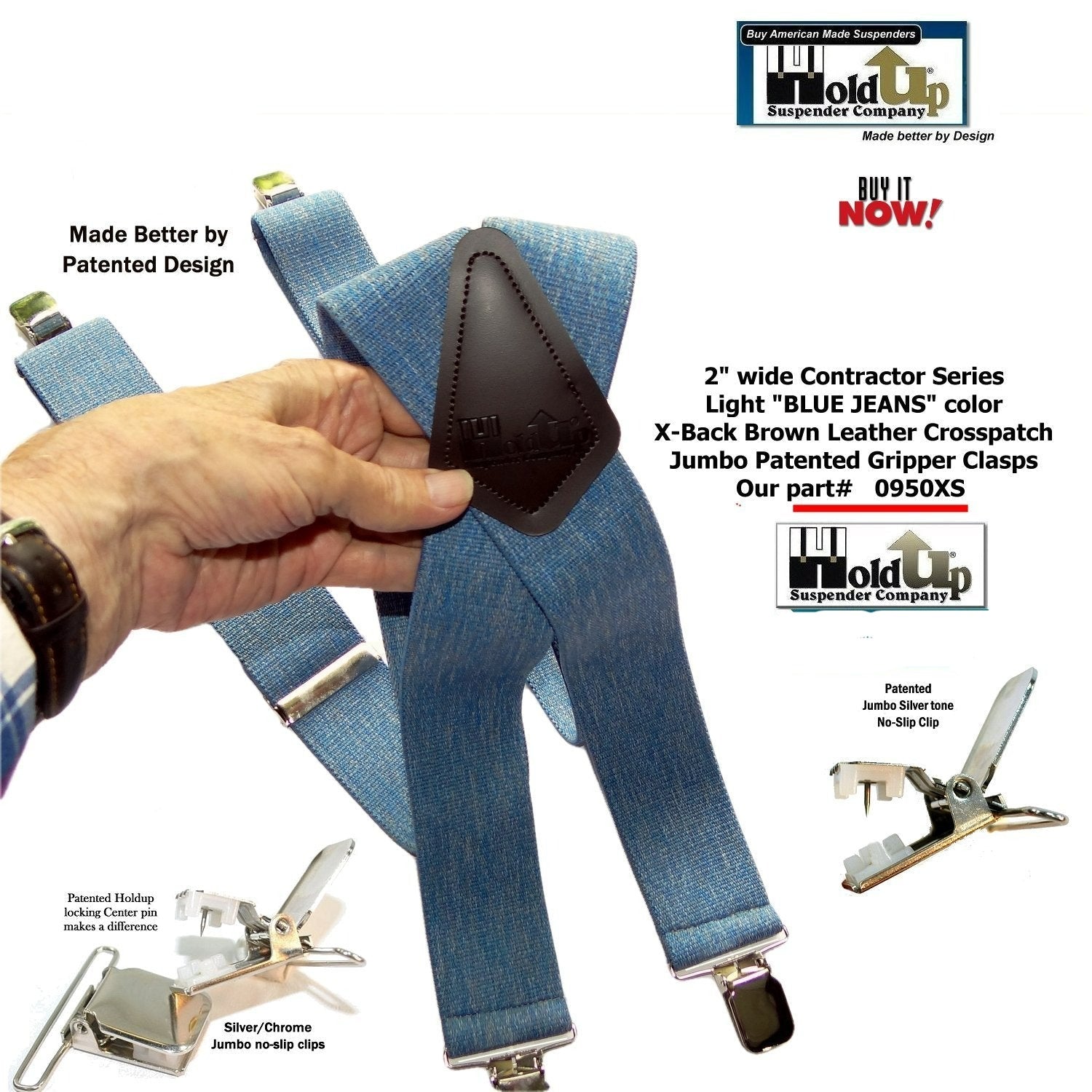 All materials are carefully chosen for elasticity, durability and Holdup's come with a limited clip guarantee that they'll never slip-slide or Pop Off your pants. Buy one of these Holdup Suspenders in a heavy-duty 2" width that are built to last a limited! All have our exclusive heavy-duty jumbo no-slip clips or Black Jumbo Gripper Clasps attached on the 4 USA made elastic suspender straps. The Holdup logo is embossed in the X-back brown leather crosspatch made from top-grade leather. Now featuring a light and Dark denim work suspenders and a 2 inch wide USA Flag pattern style on sale at our Amazon Holdup Suspender Web Shop. Get heavy-duty work suspenders for the working man from a USA company committed to being America's premier pant suspender manufacturer. You may pay by using your Amazon or PayPal account or using your preferred credit/Debit Card with Free Freight option at checkout.