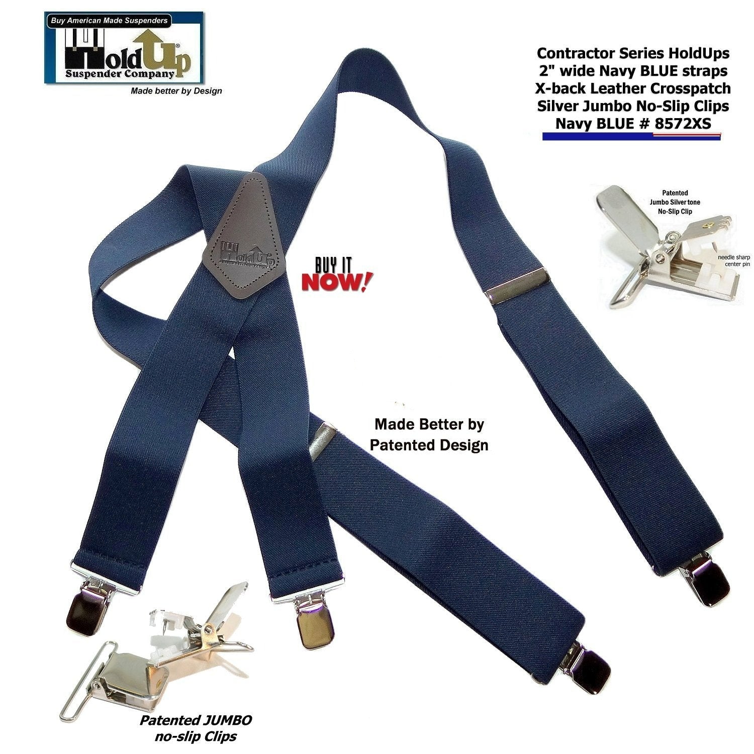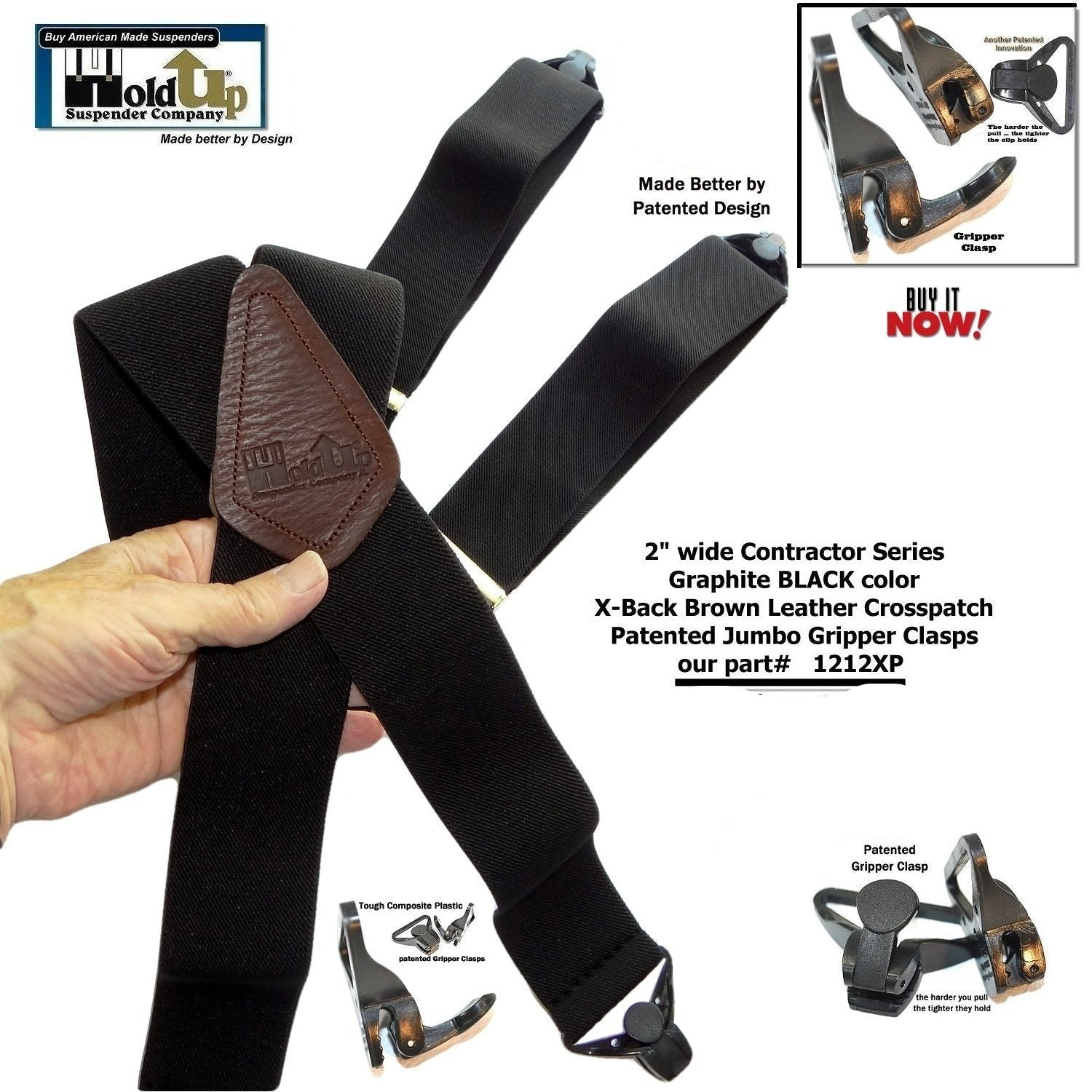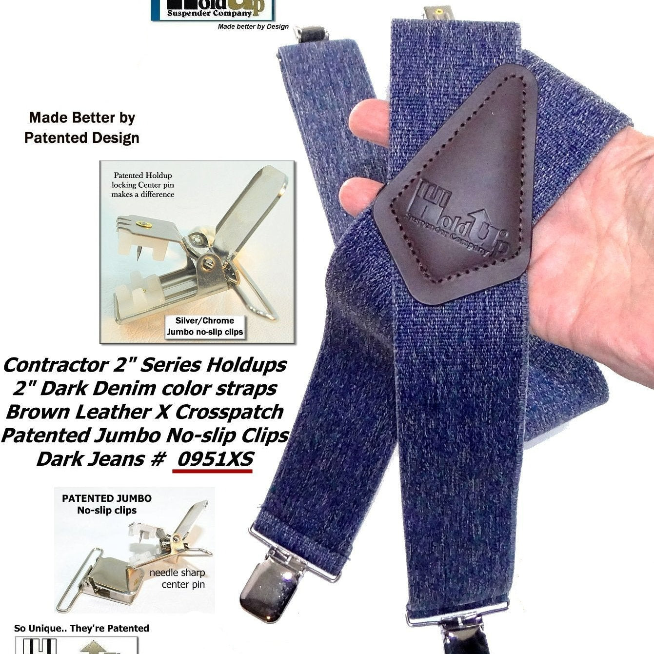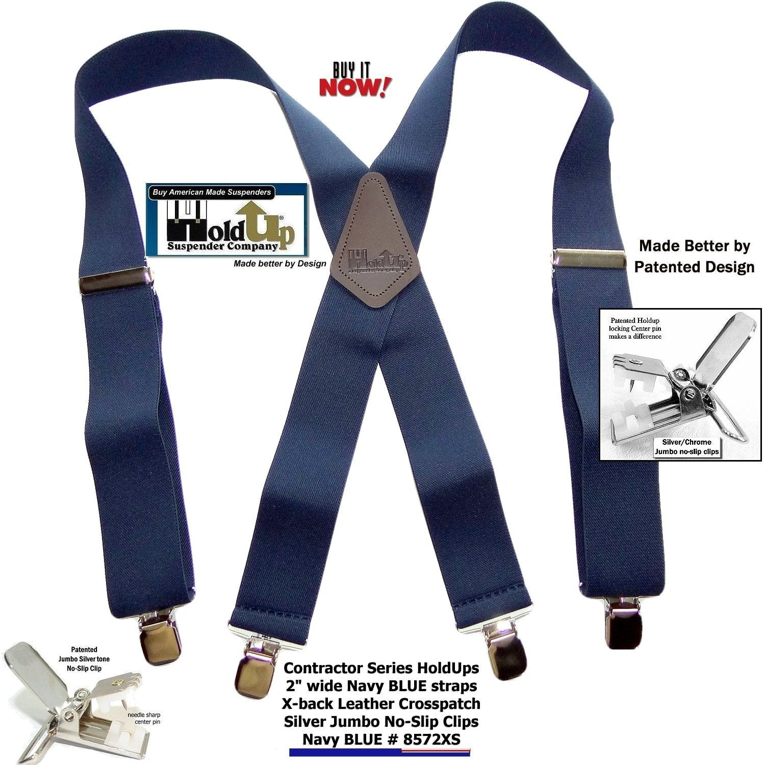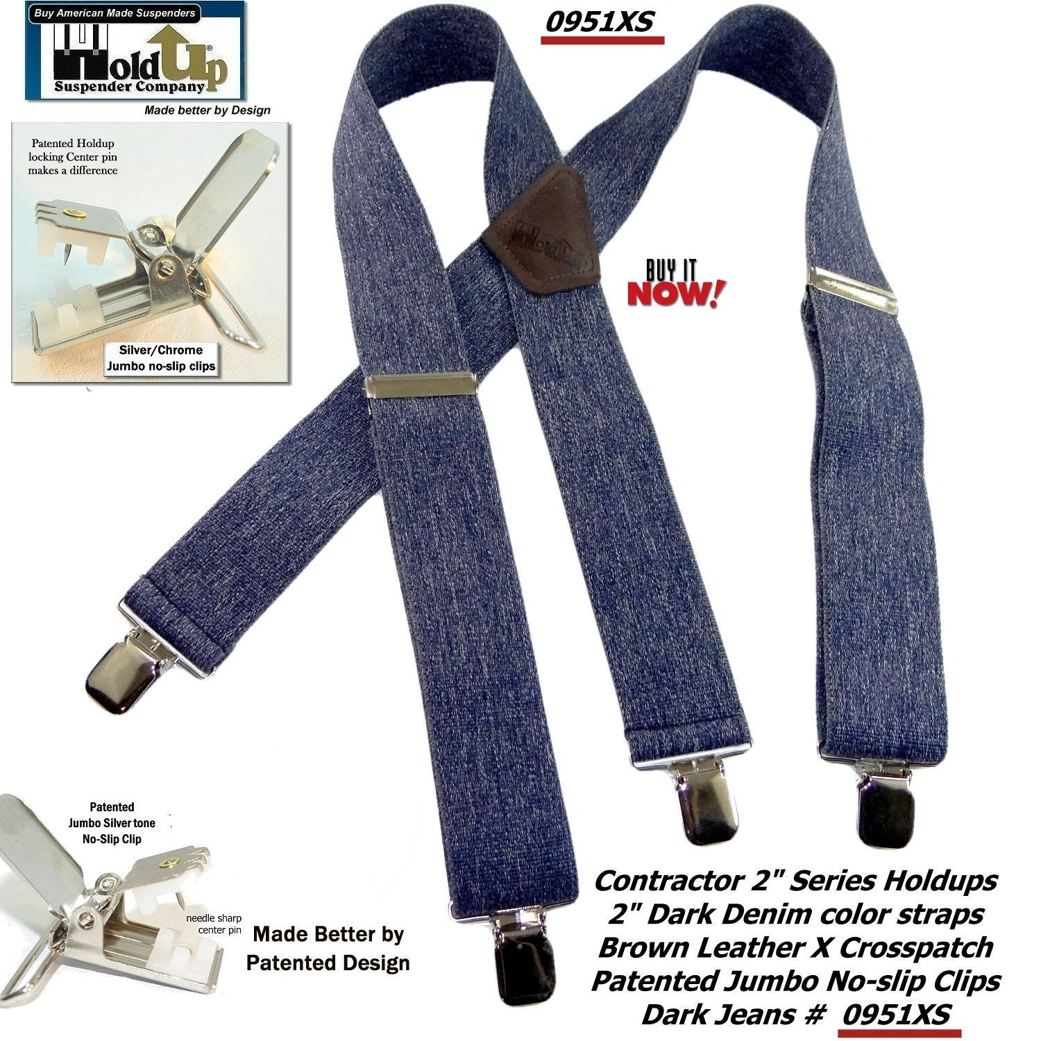 All materials are carefully chosen for elasticity, durability and Holdup's come with a limited clip guarantee that they'll never slip-slide or Pop Off your pants. Buy one of these Holdup Suspenders in a heavy-duty 2" width that are built to last a limited! All have our exclusive heavy-duty jumbo no-slip clips or Black Jumbo Gripper Clasps attached on the 4 USA made elastic suspender straps. The Holdup logo is embossed in the X-back brown leather crosspatch made from top-grade leather. Now featuring a light and Dark denim work suspenders and a 2 inch wide USA Flag pattern style on sale at our Amazon Holdup Suspender Web Shop. Get heavy-duty work suspenders for the working man from a USA company committed to being America's premier pant suspender manufacturer. You may pay by using your Amazon or PayPal account or using your preferred credit/Debit Card with Free Freight option at checkout.