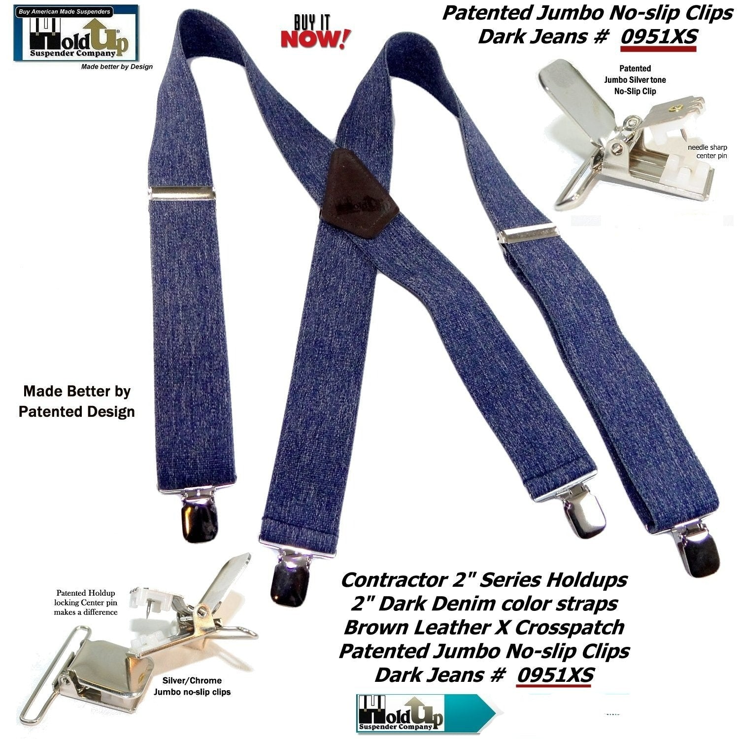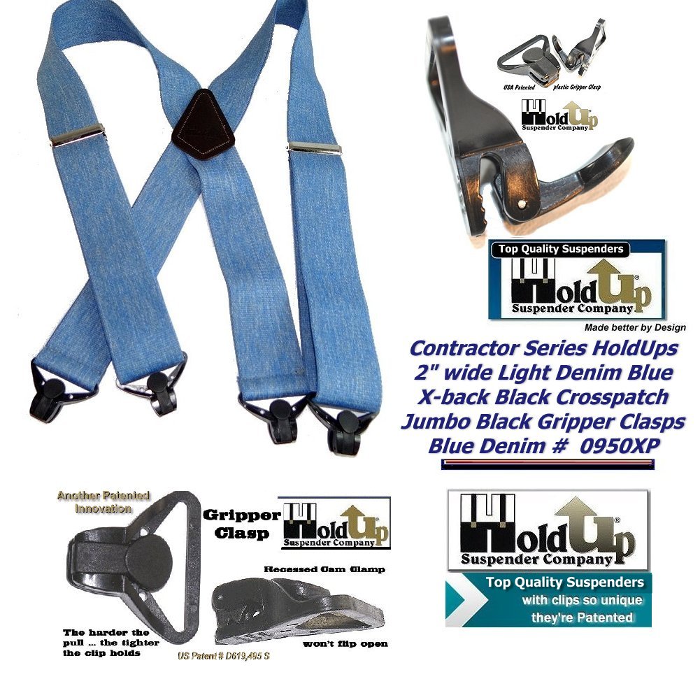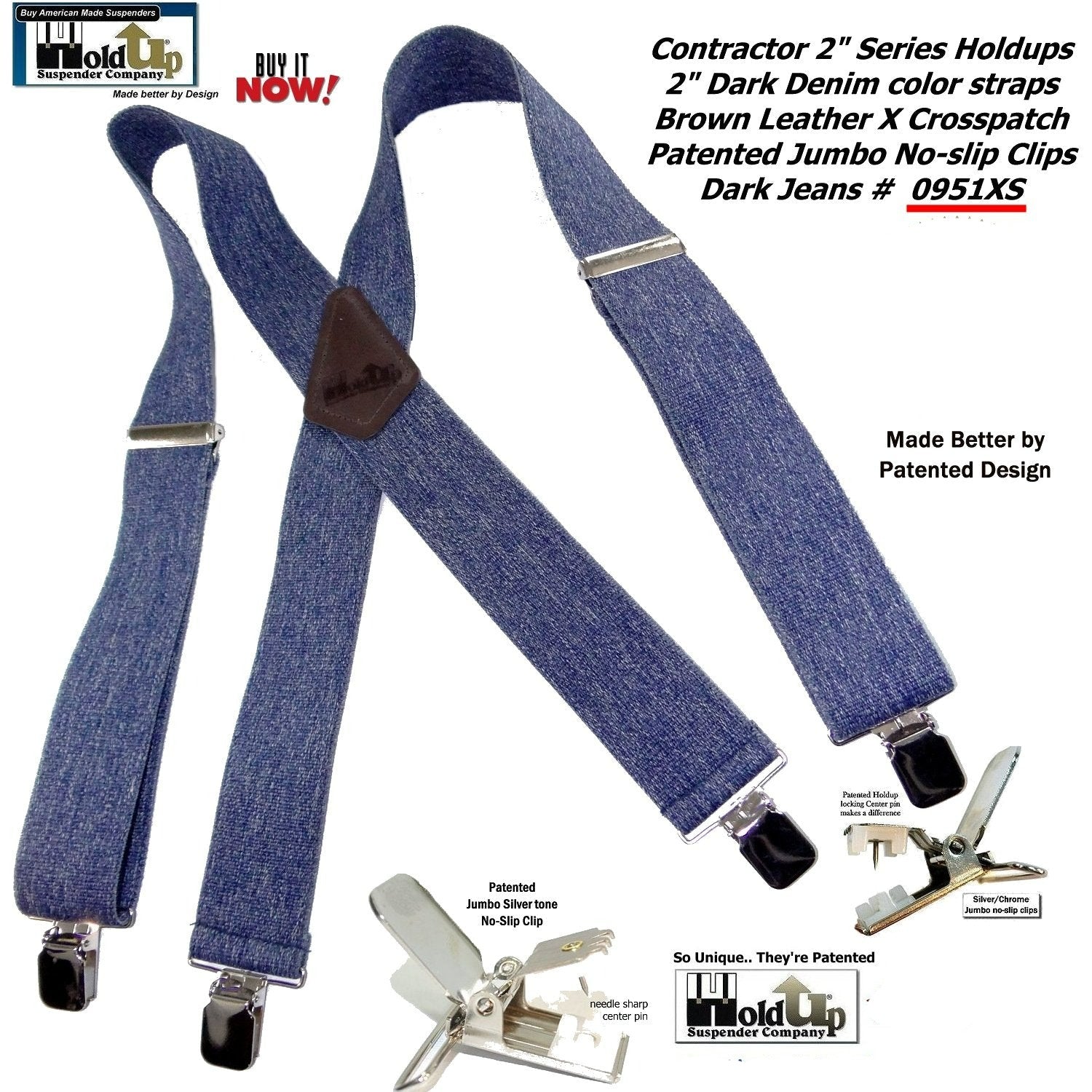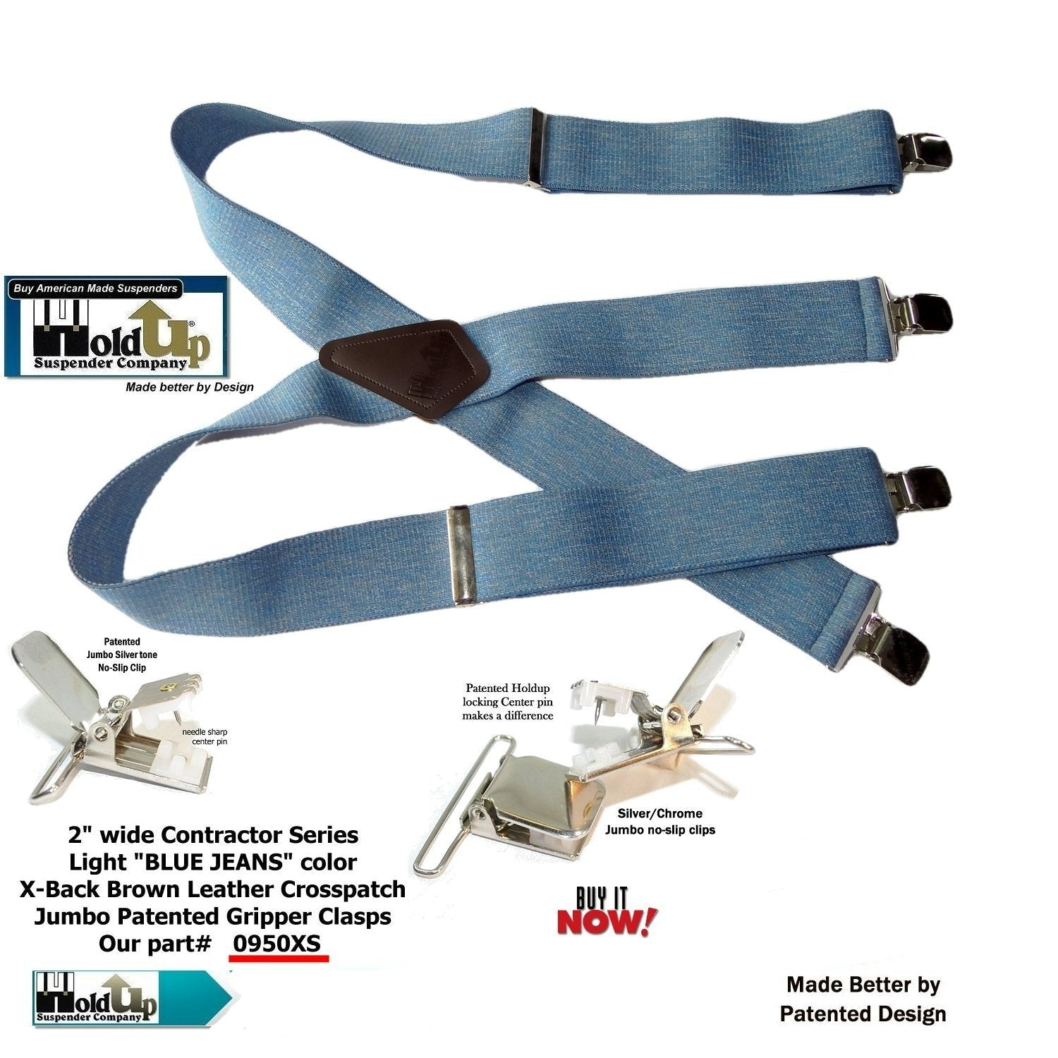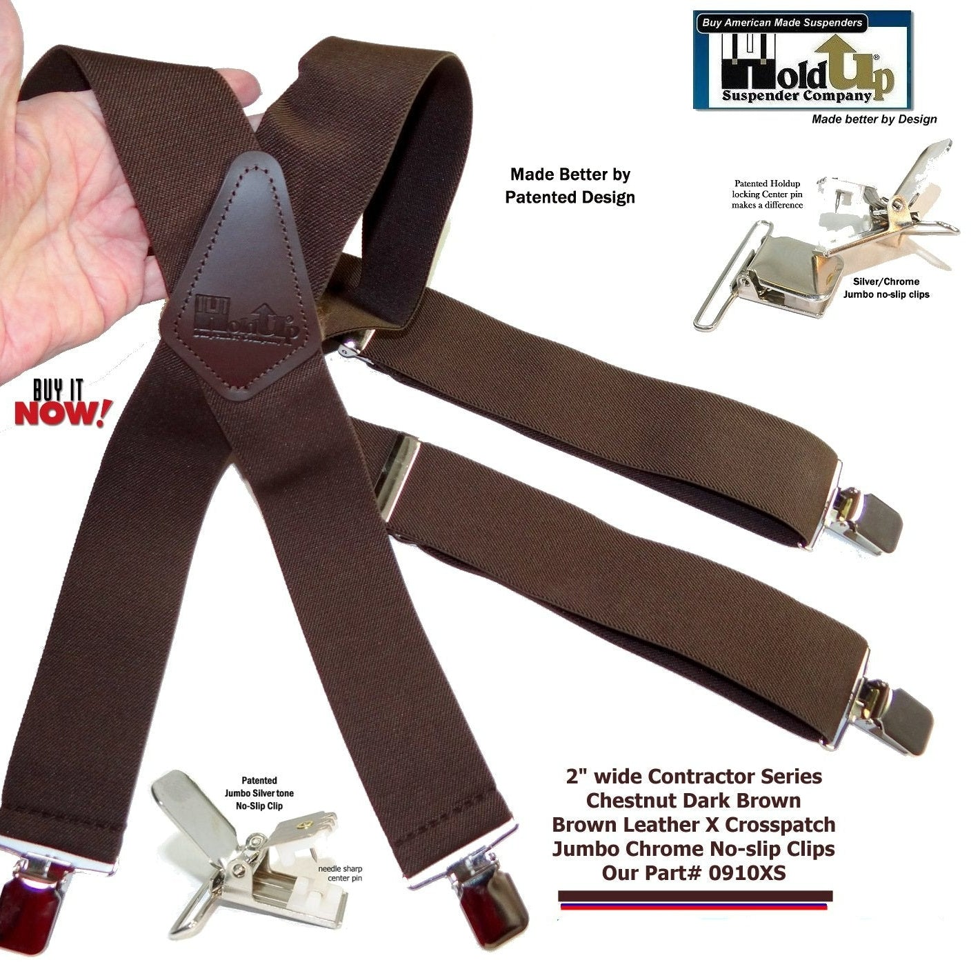 All materials are carefully chosen for elasticity, durability and Holdup's come with a limited clip guarantee that they'll never slip-slide or Pop Off your pants. Buy one of these Holdup Suspenders in a heavy-duty 2" width that are built to last a limited! All have our exclusive heavy-duty jumbo no-slip clips or Black Jumbo Gripper Clasps attached on the 4 USA made elastic suspender straps. The Holdup logo is embossed in the X-back brown leather crosspatch made from top-grade leather. Now featuring a light and Dark denim work suspenders and a 2 inch wide USA Flag pattern style on sale at our Amazon Holdup Suspender Web Shop. Get heavy-duty work suspenders for the working man from a USA company committed to being America's premier pant suspender manufacturer. You may pay by using your Amazon or PayPal account or using your preferred credit/Debit Card with Free Freight option at checkout.