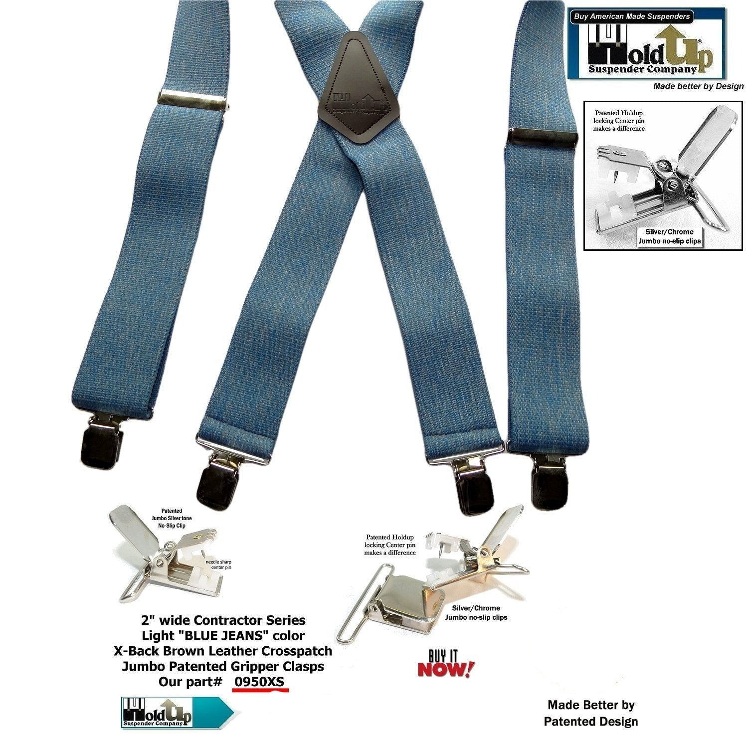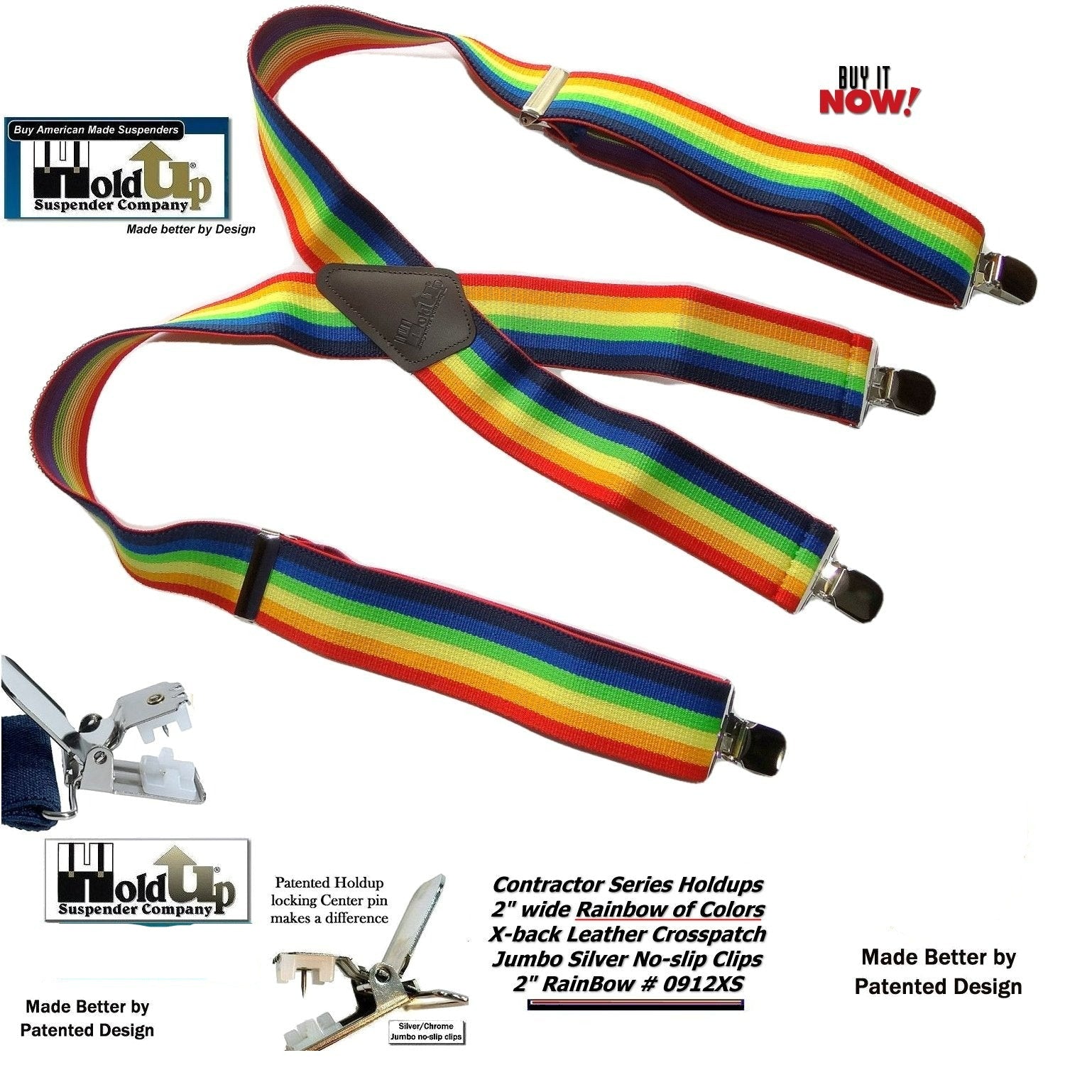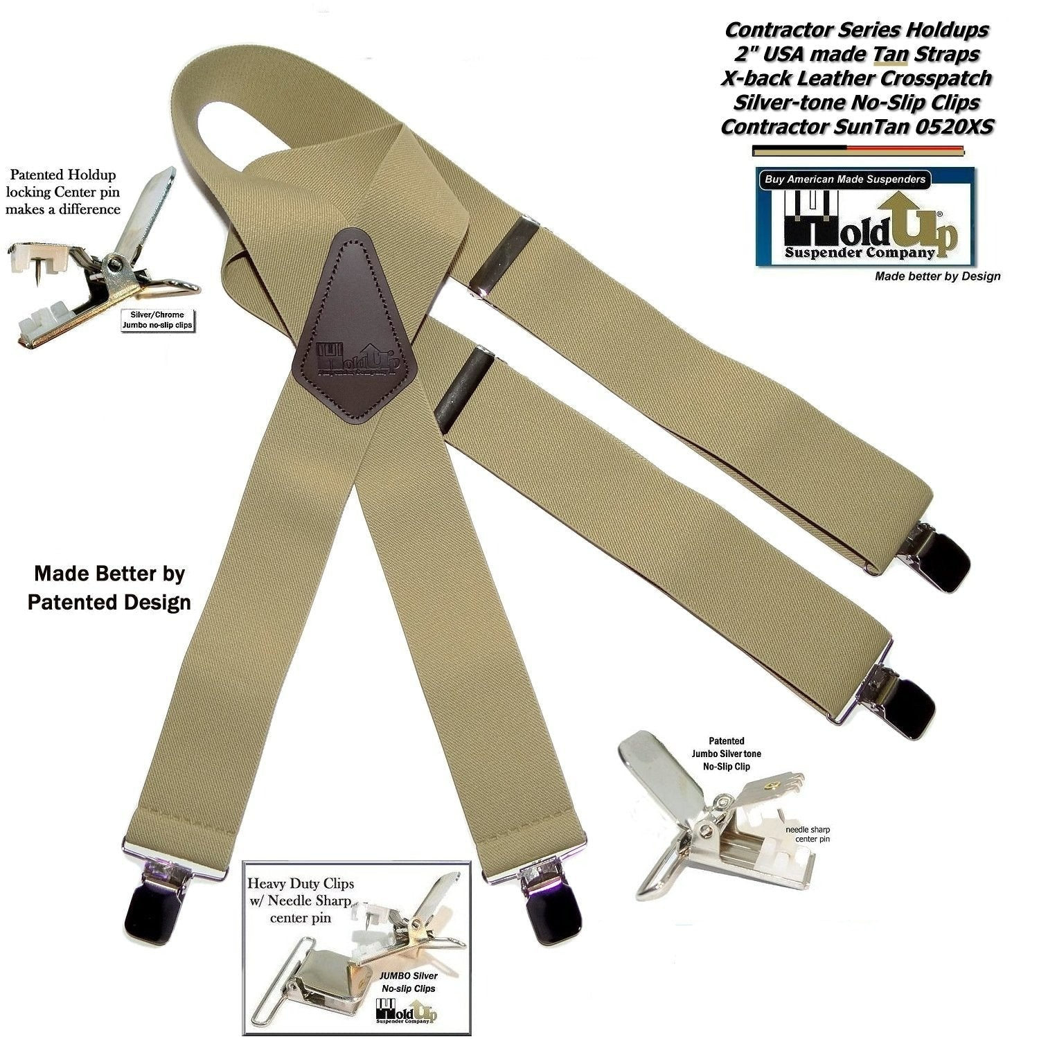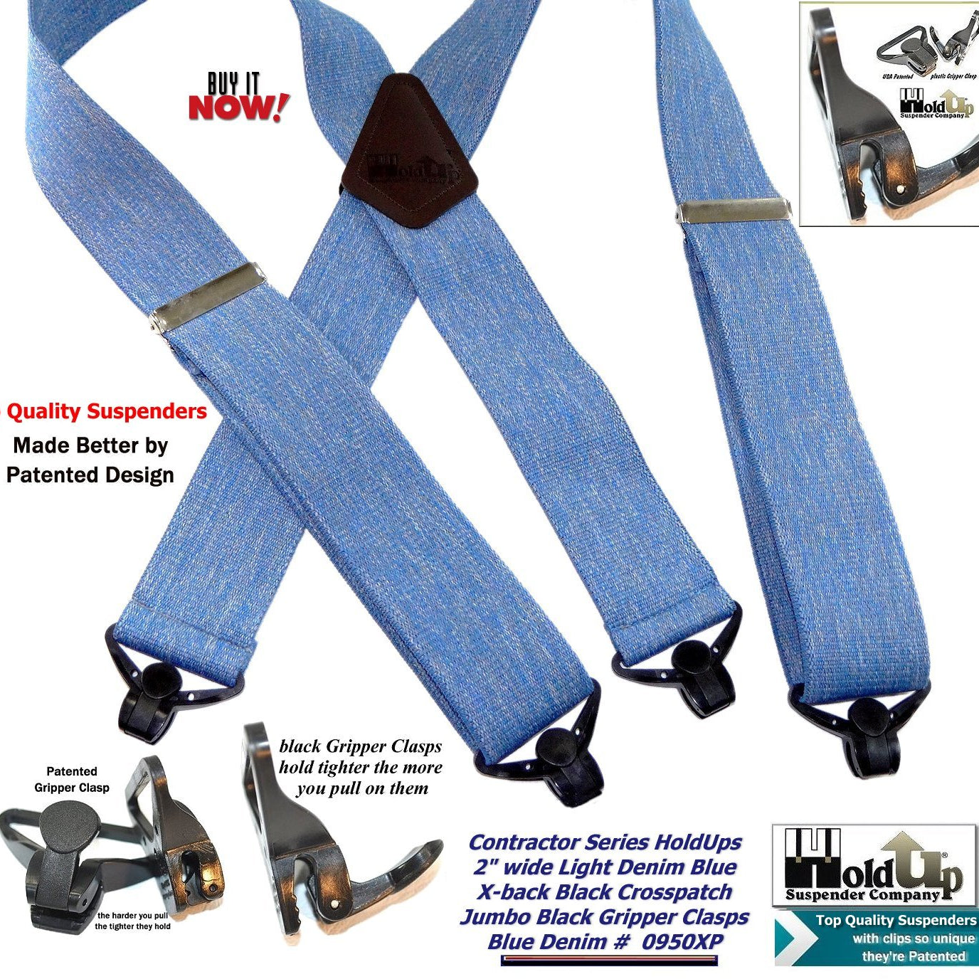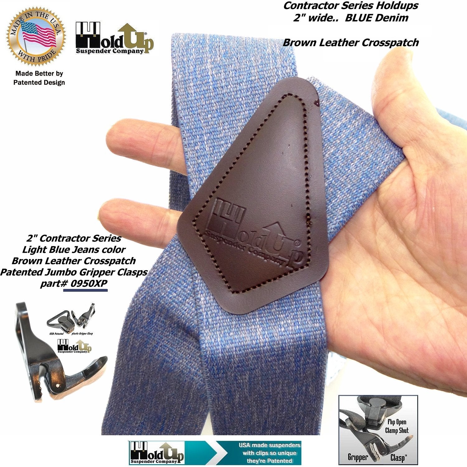 All materials are carefully chosen for elasticity, durability and Holdup's come with a limited clip guarantee that they'll never slip-slide or Pop Off your pants. Buy one of these Holdup Suspenders in a heavy-duty 2" width that are built to last a limited! All have our exclusive heavy-duty jumbo no-slip clips or Black Jumbo Gripper Clasps attached on the 4 USA made elastic suspender straps. The Holdup logo is embossed in the X-back brown leather crosspatch made from top-grade leather. Now featuring a light and Dark denim work suspenders and a 2 inch wide USA Flag pattern style on sale at our Amazon Holdup Suspender Web Shop. Get heavy-duty work suspenders for the working man from a USA company committed to being America's premier pant suspender manufacturer. You may pay by using your Amazon or PayPal account or using your preferred credit/Debit Card with Free Freight option at checkout.