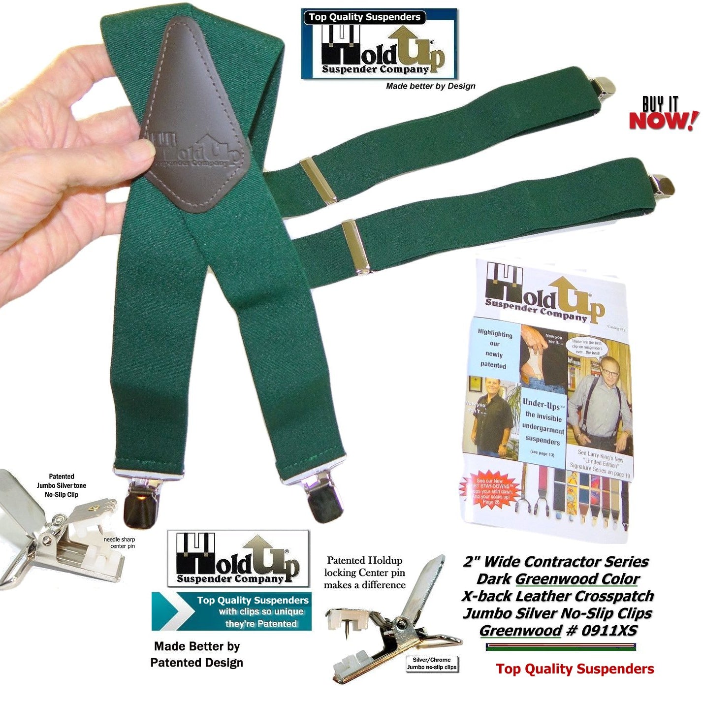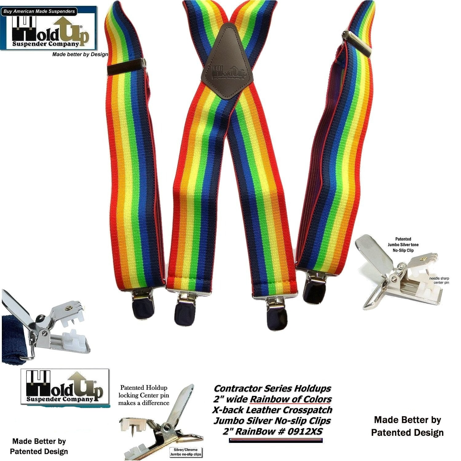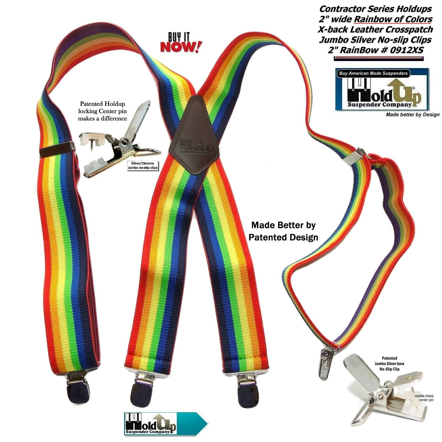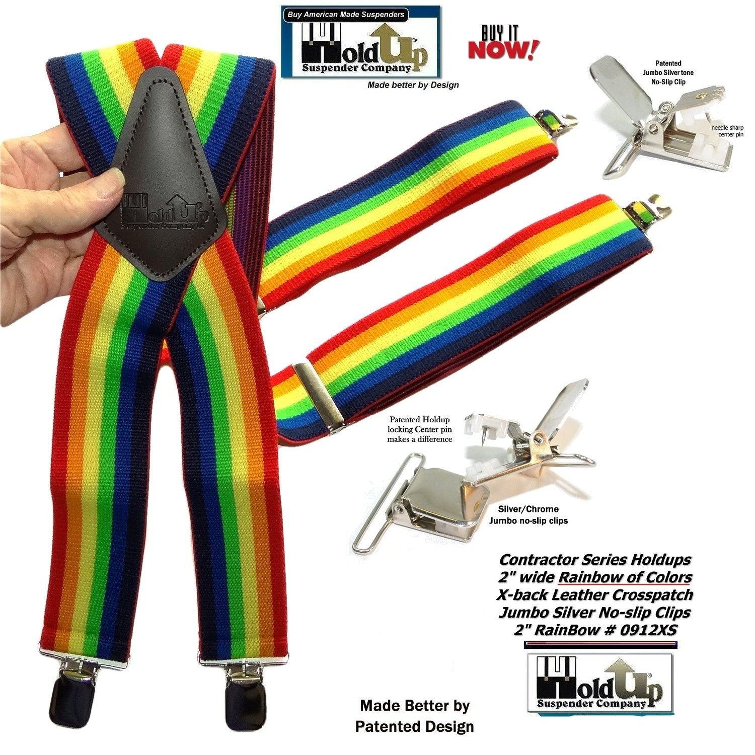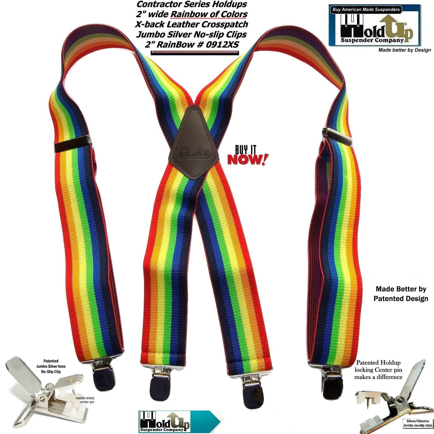 All materials are carefully chosen for elasticity, durability and Holdup's come with a limited clip guarantee that they'll never slip-slide or Pop Off your pants. Buy one of these Holdup Suspenders in a heavy-duty 2" width that are built to last a limited! All have our exclusive heavy-duty jumbo no-slip clips or Black Jumbo Gripper Clasps attached on the 4 USA made elastic suspender straps. The Holdup logo is embossed in the X-back brown leather crosspatch made from top-grade leather. Now featuring a light and Dark denim work suspenders and a 2 inch wide USA Flag pattern style on sale at our Amazon Holdup Suspender Web Shop. Get heavy-duty work suspenders for the working man from a USA company committed to being America's premier pant suspender manufacturer. You may pay by using your Amazon or PayPal account or using your preferred credit/Debit Card with Free Freight option at checkout.