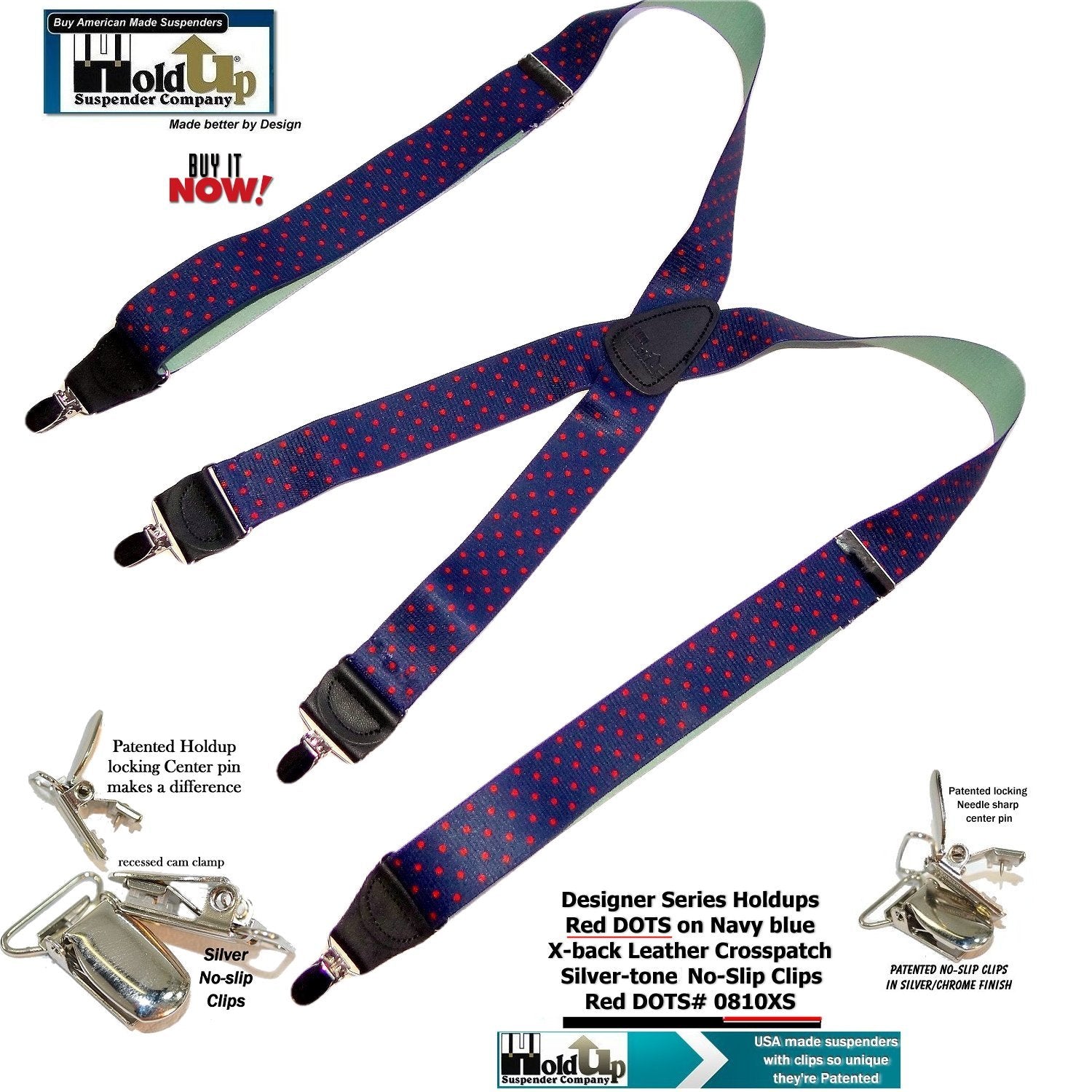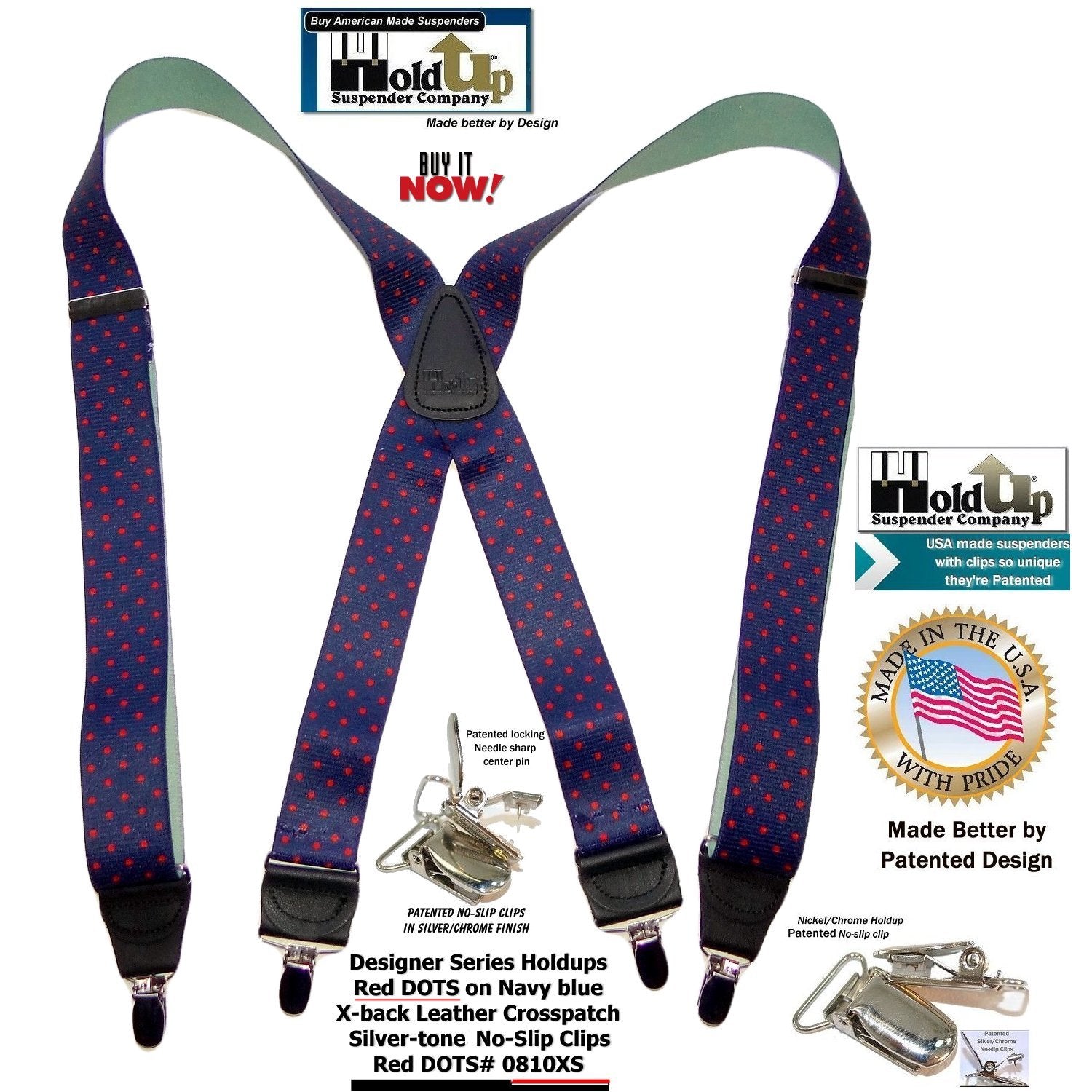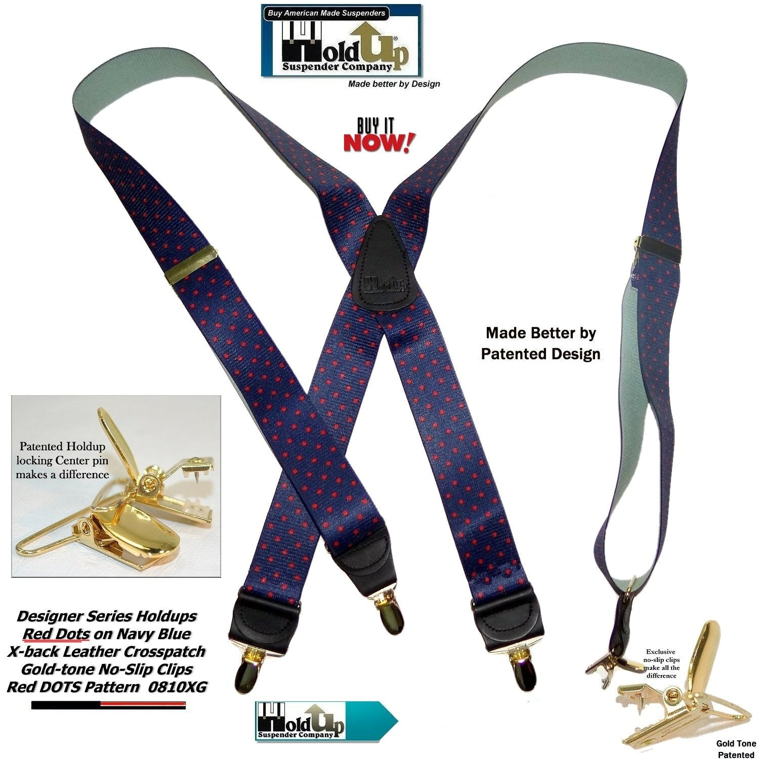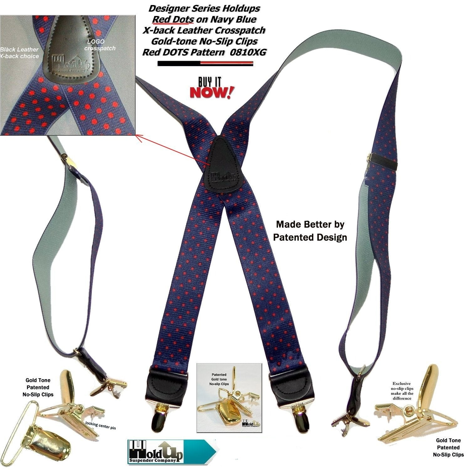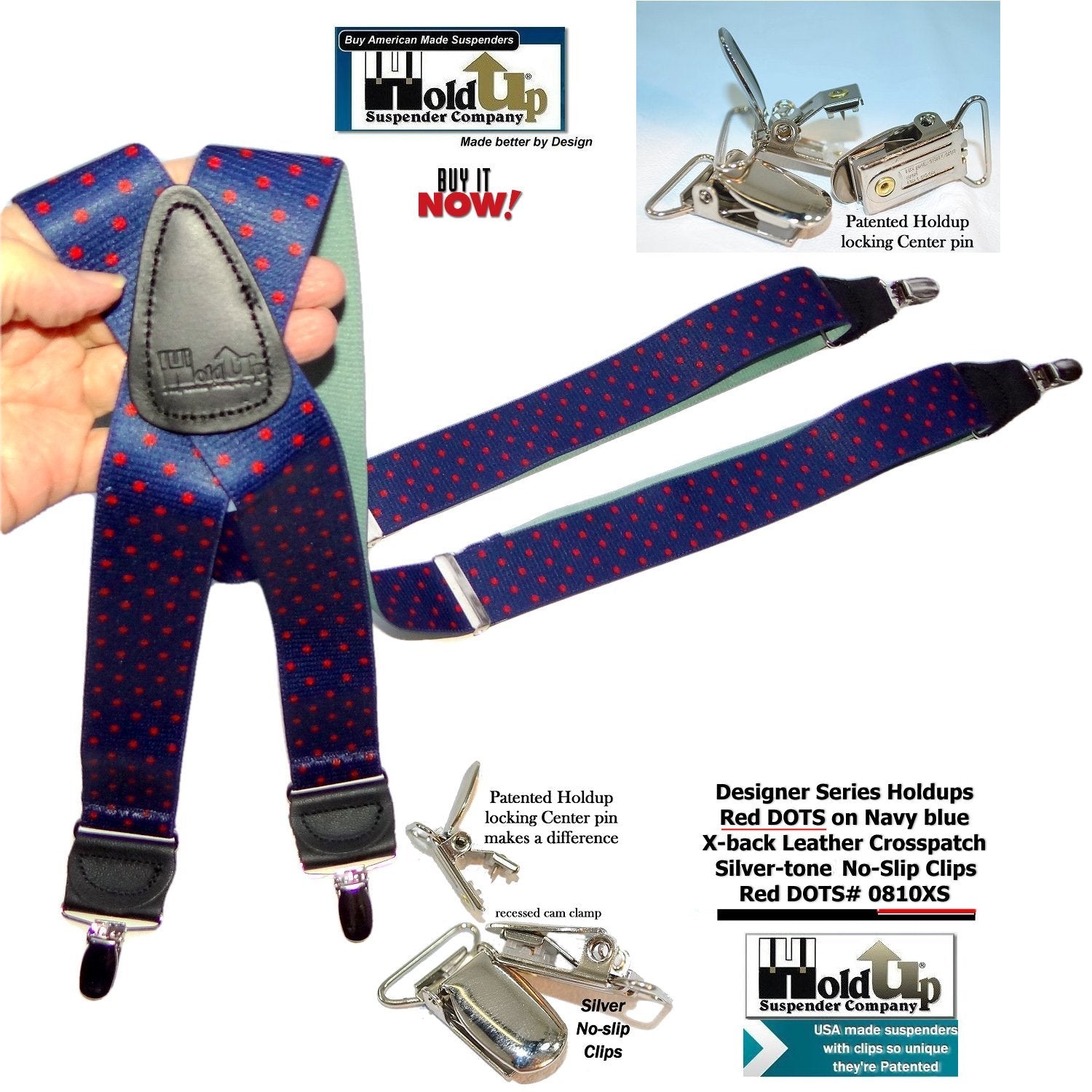 - The DESIGNER SERIES suspenders have 1 1/2" wide straps and have a black leather crosspatch embossed with our Holdup Logo in choice of Y or X-back styles.