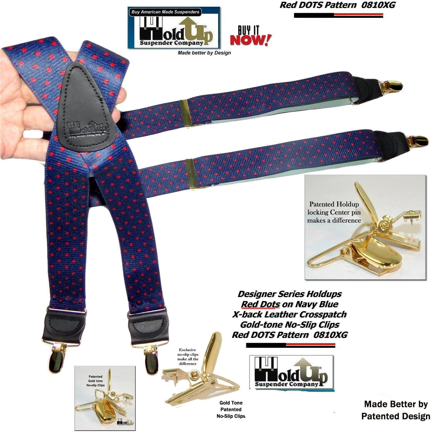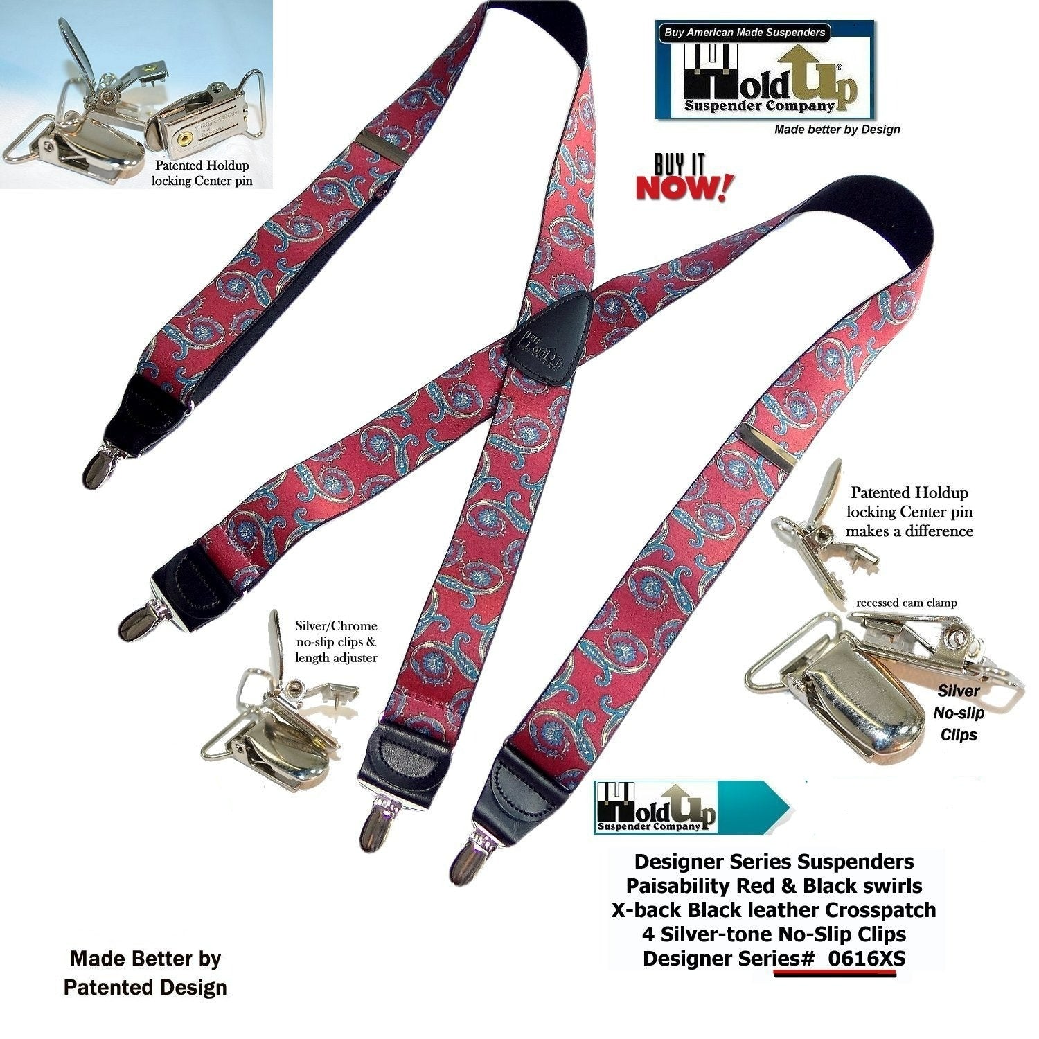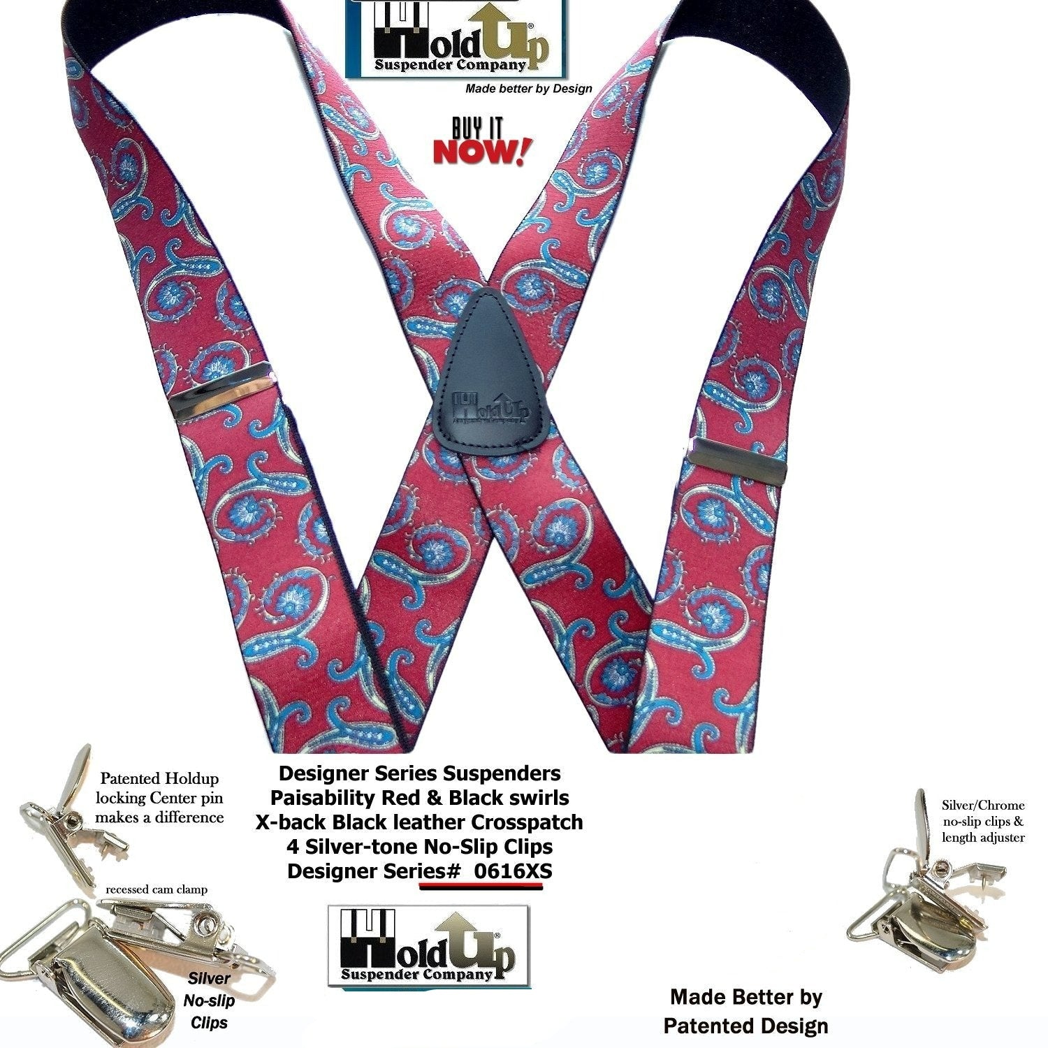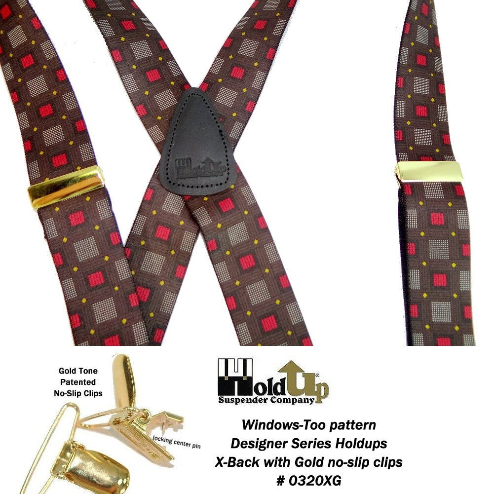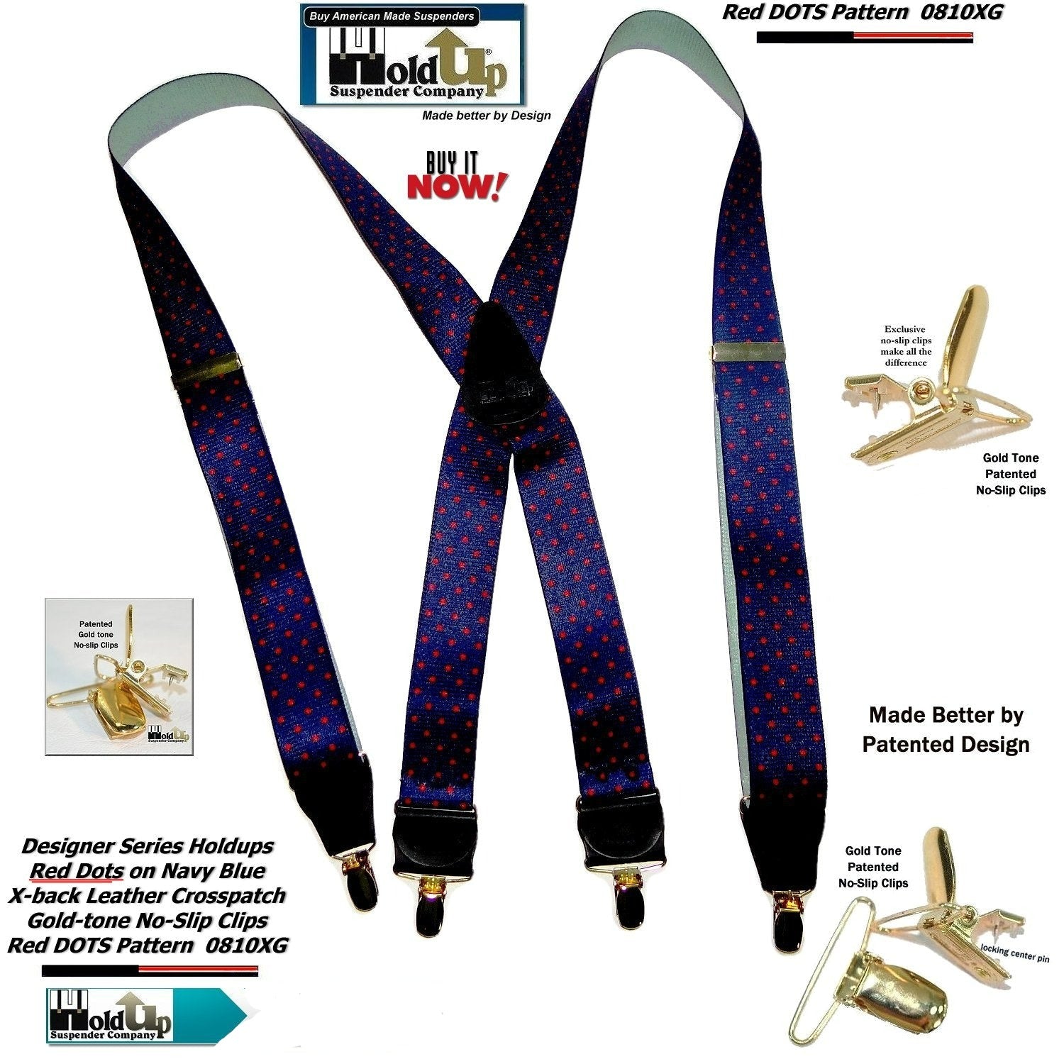 - The DESIGNER SERIES suspenders have 1 1/2" wide straps and have a black leather crosspatch embossed with our Holdup Logo in choice of Y or X-back styles.