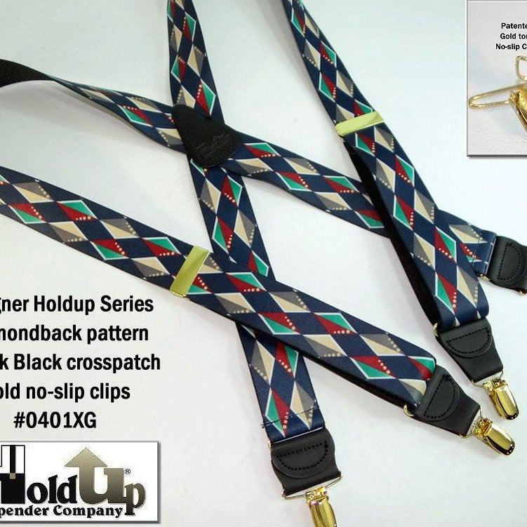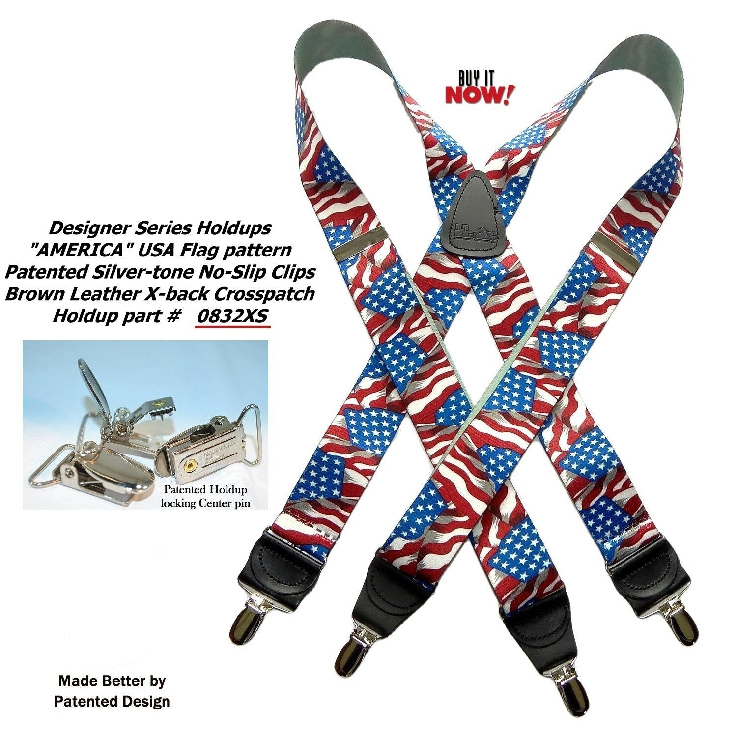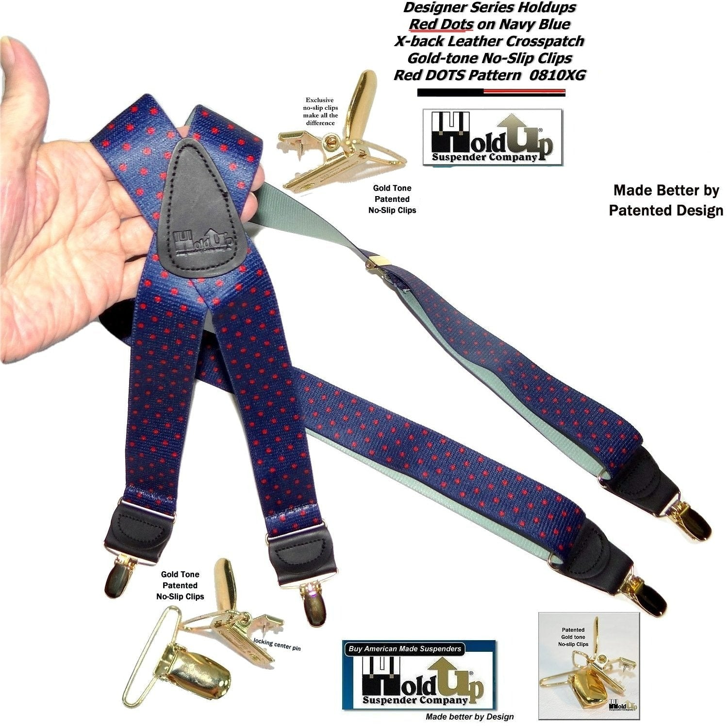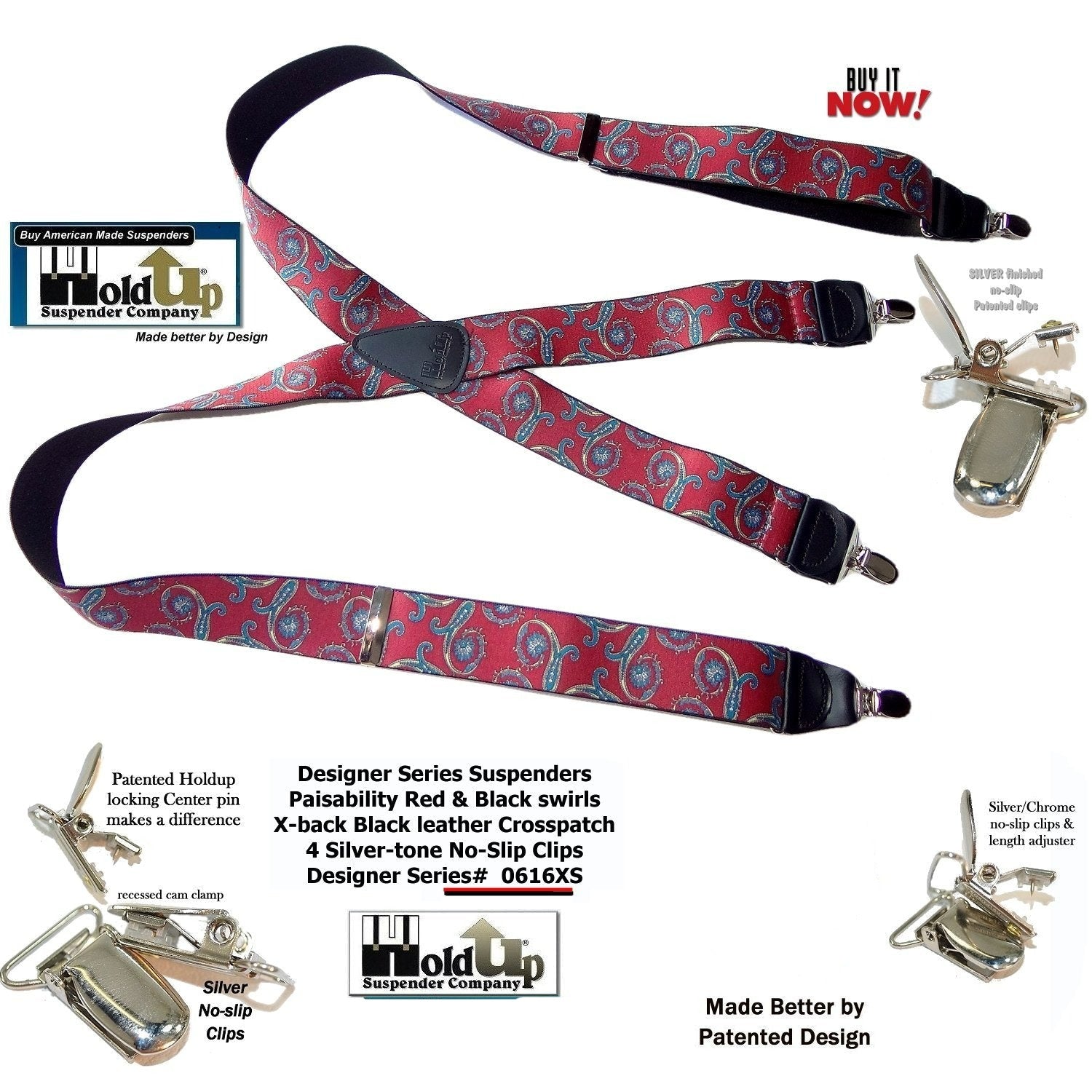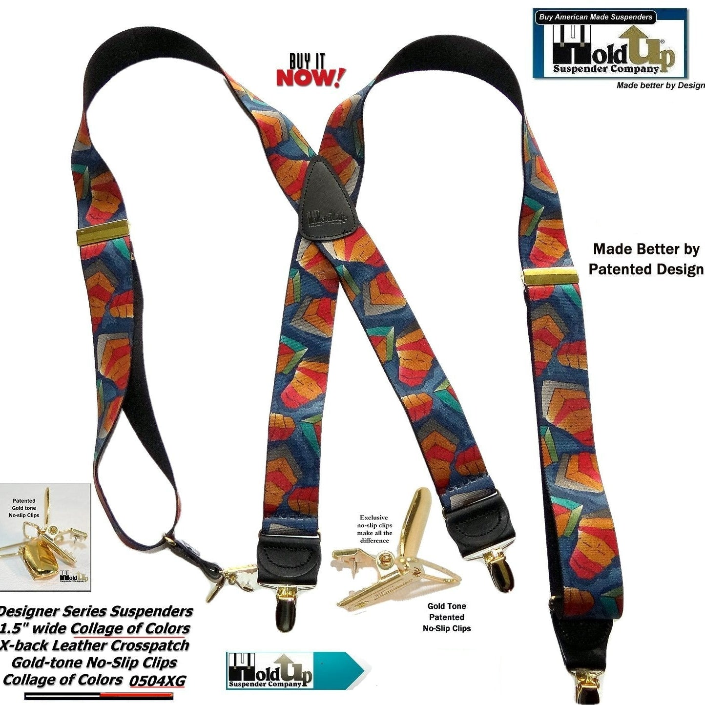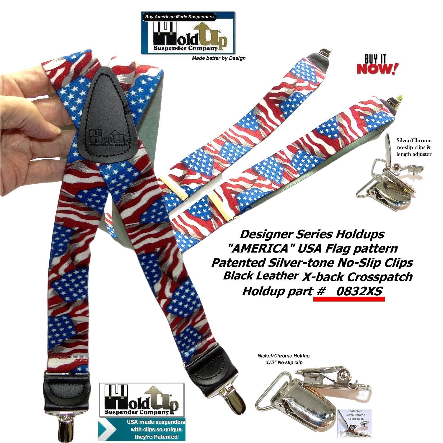- The DESIGNER SERIES suspenders have 1 1/2" wide straps and have a black leather crosspatch embossed with our Holdup Logo in choice of Y or X-back styles.