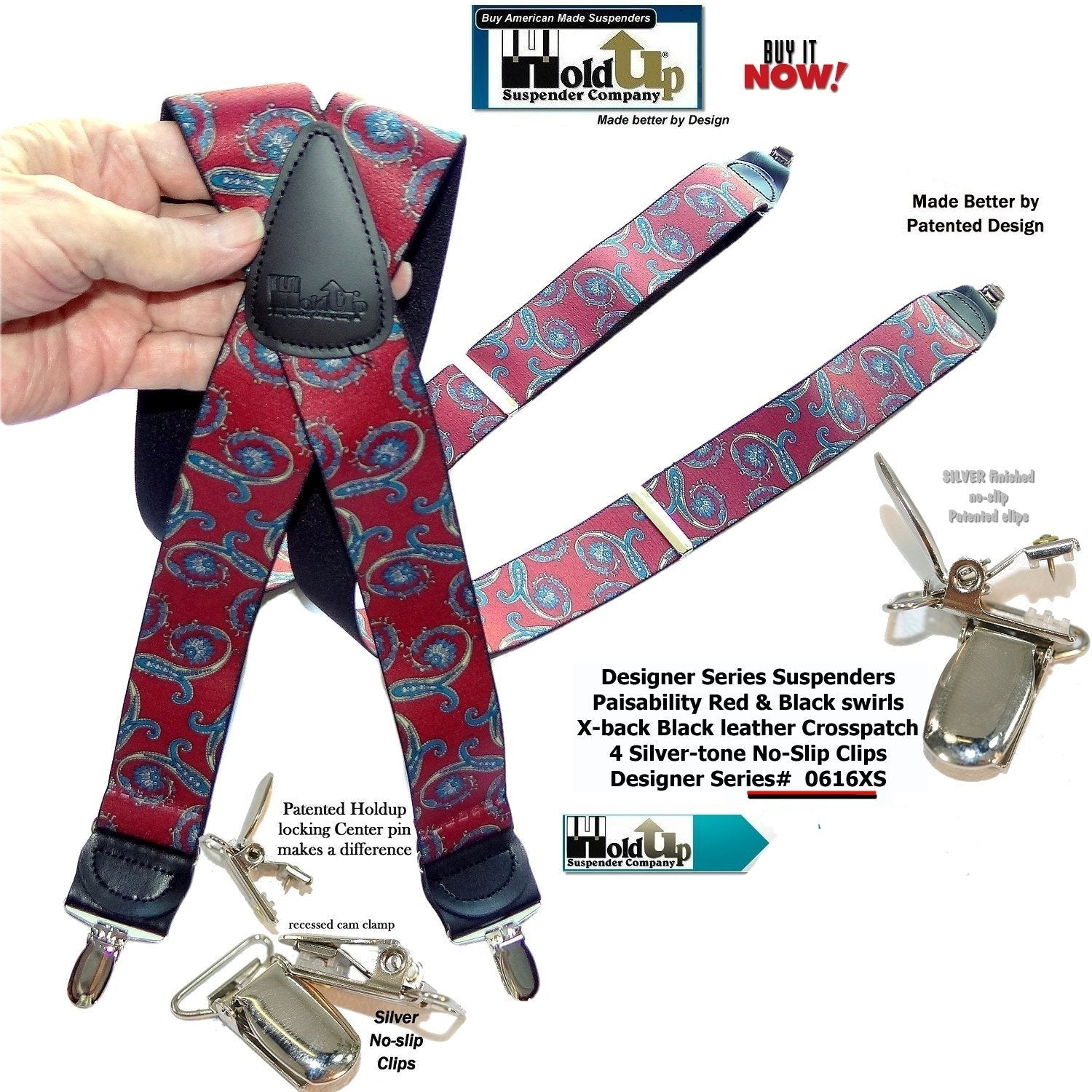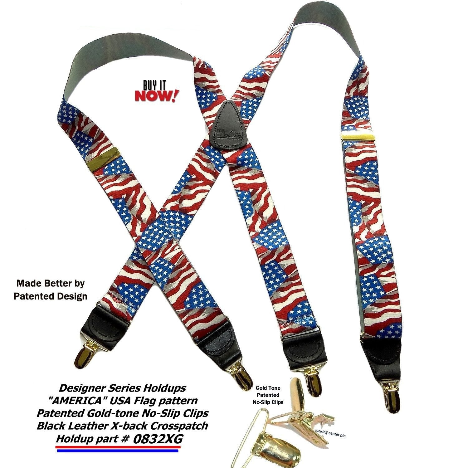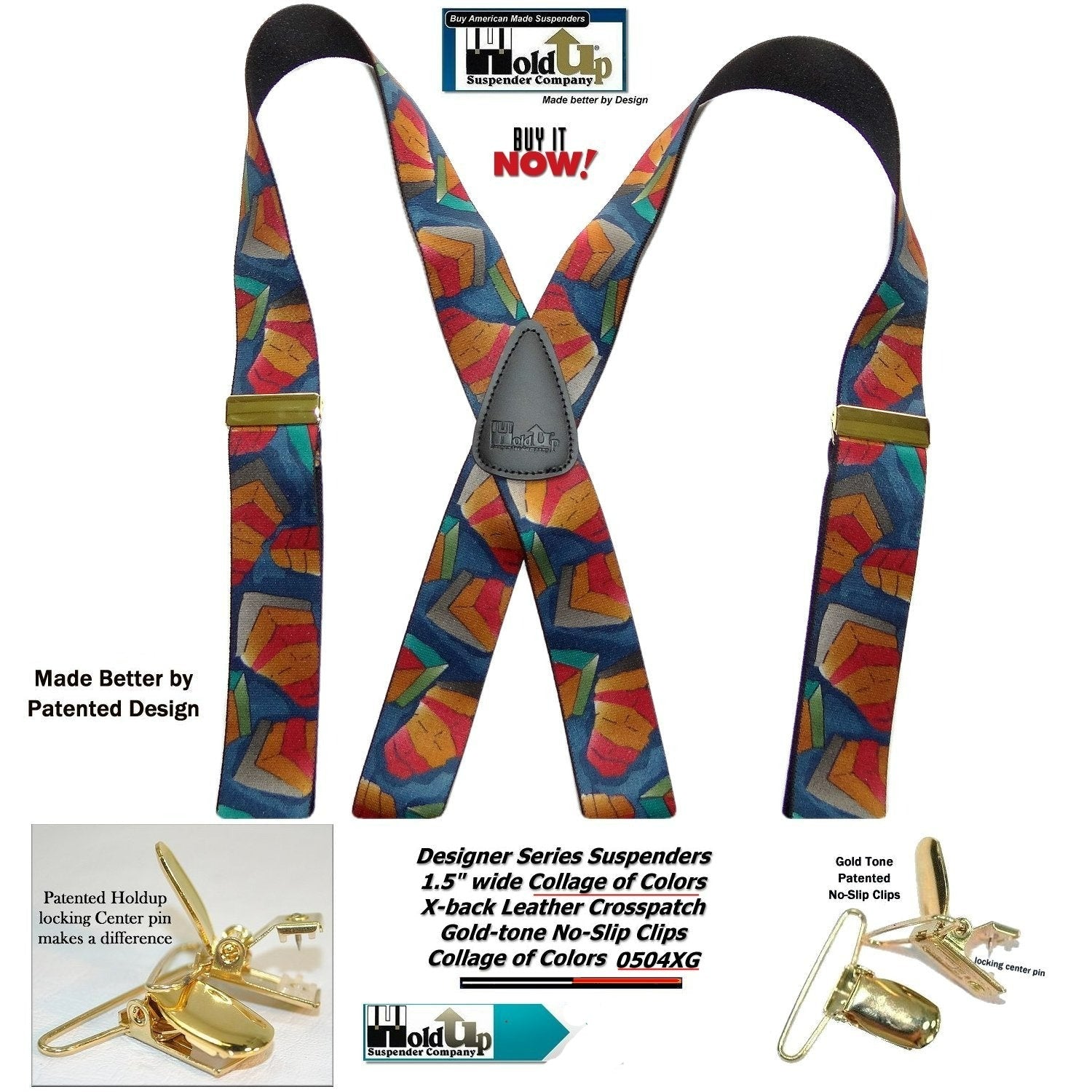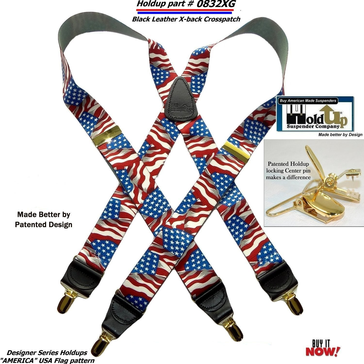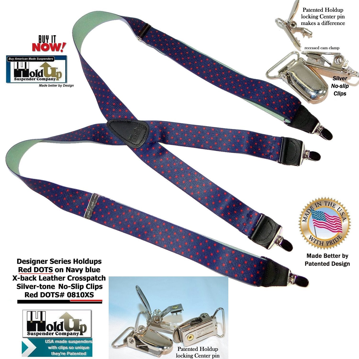- The DESIGNER SERIES suspenders have 1 1/2" wide straps and have a black leather crosspatch embossed with our Holdup Logo in choice of Y or X-back styles.