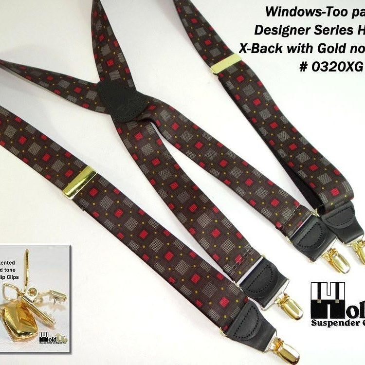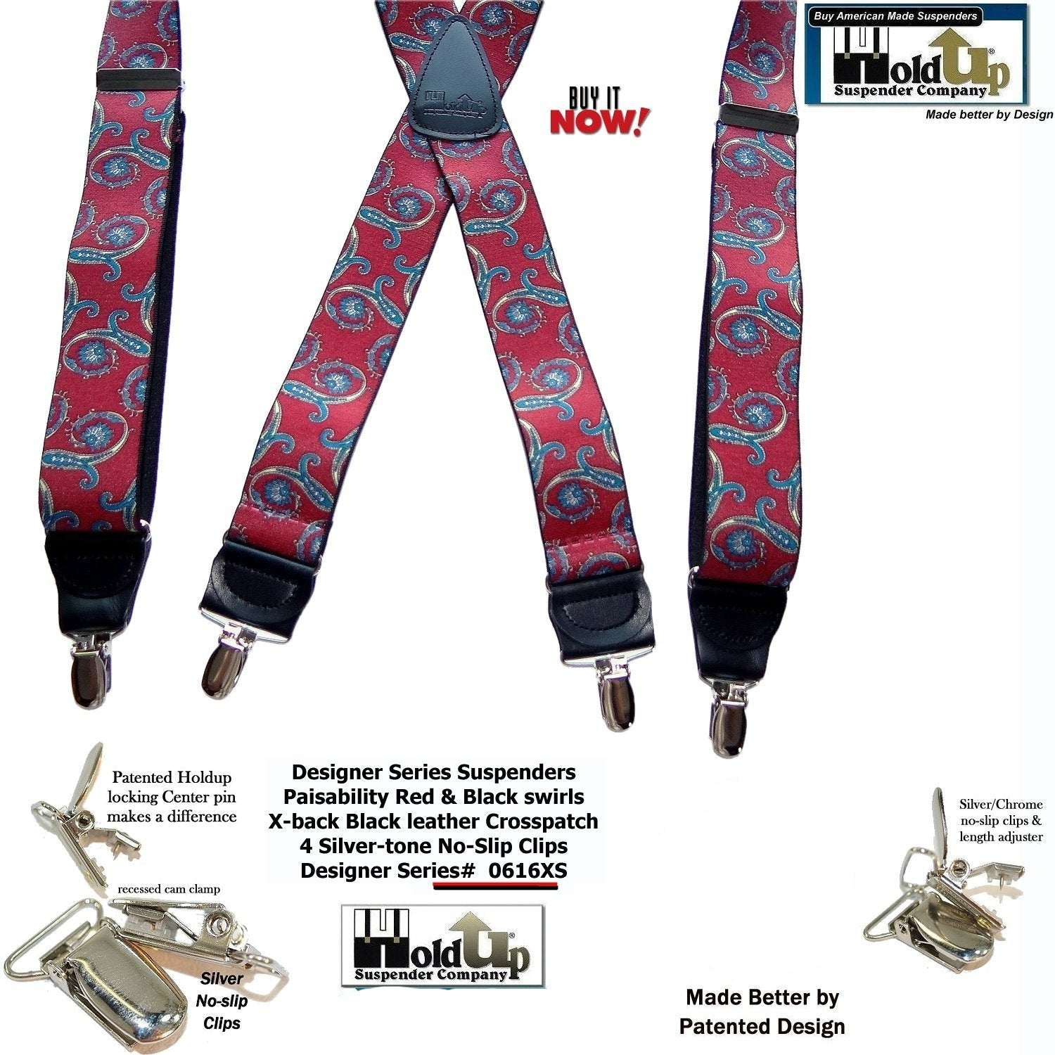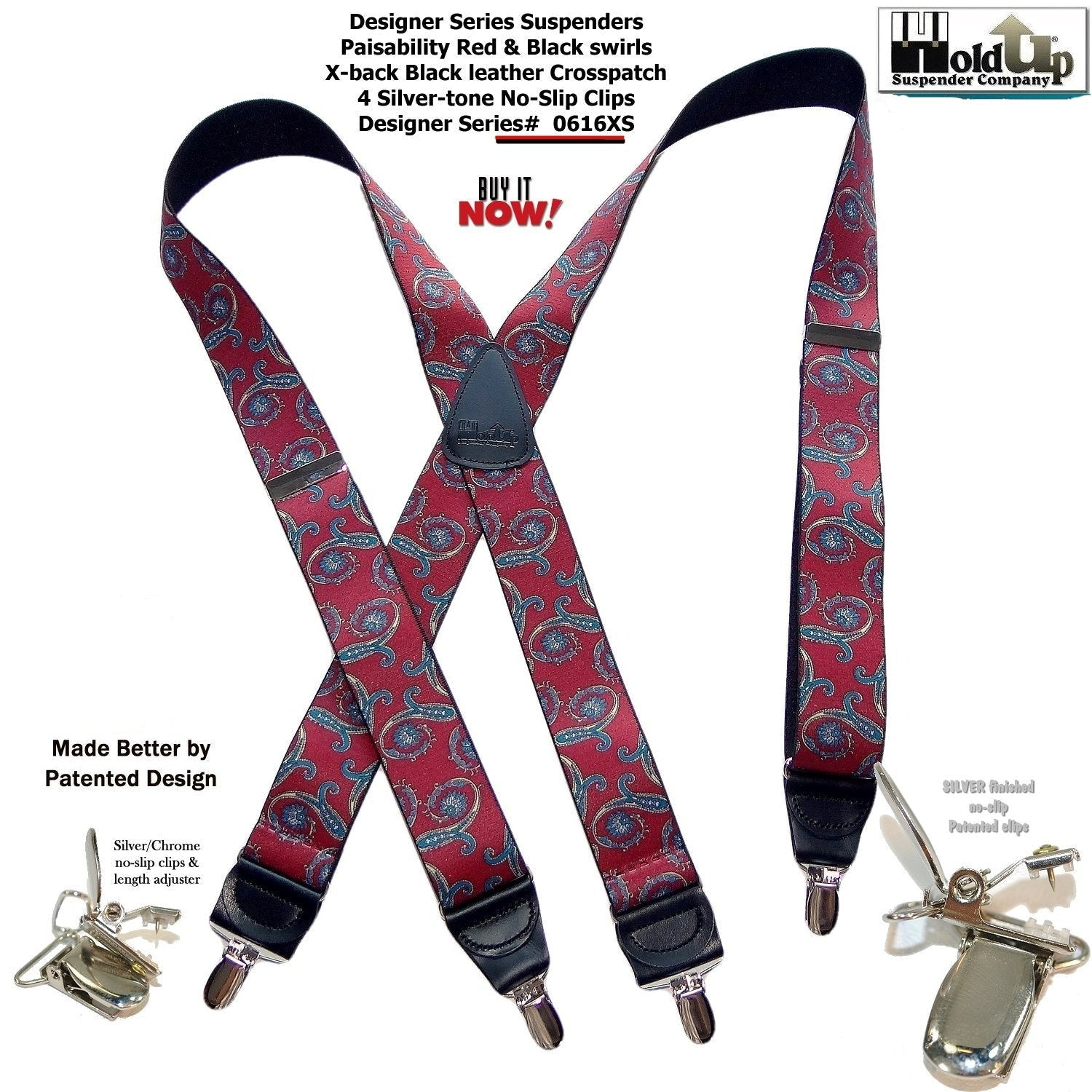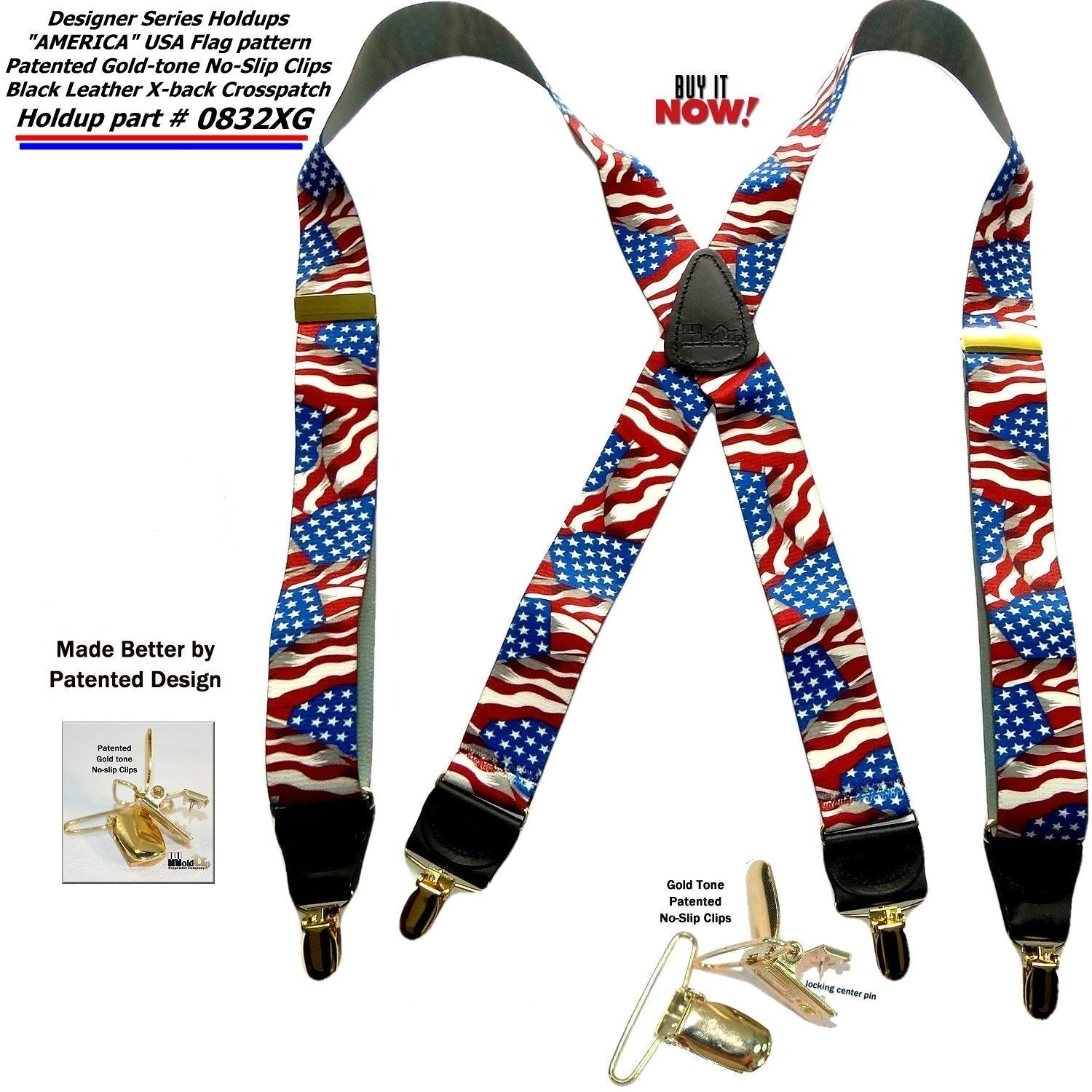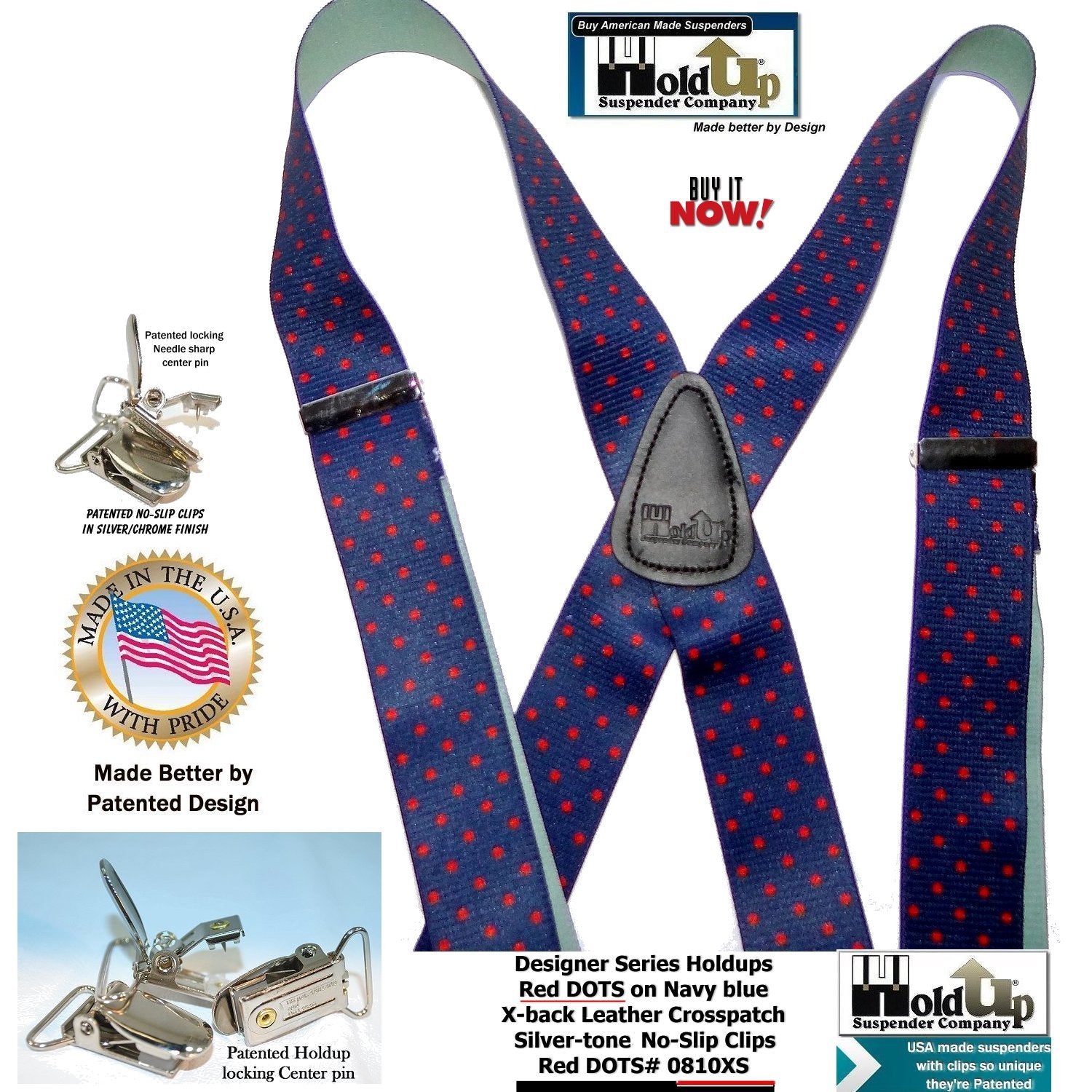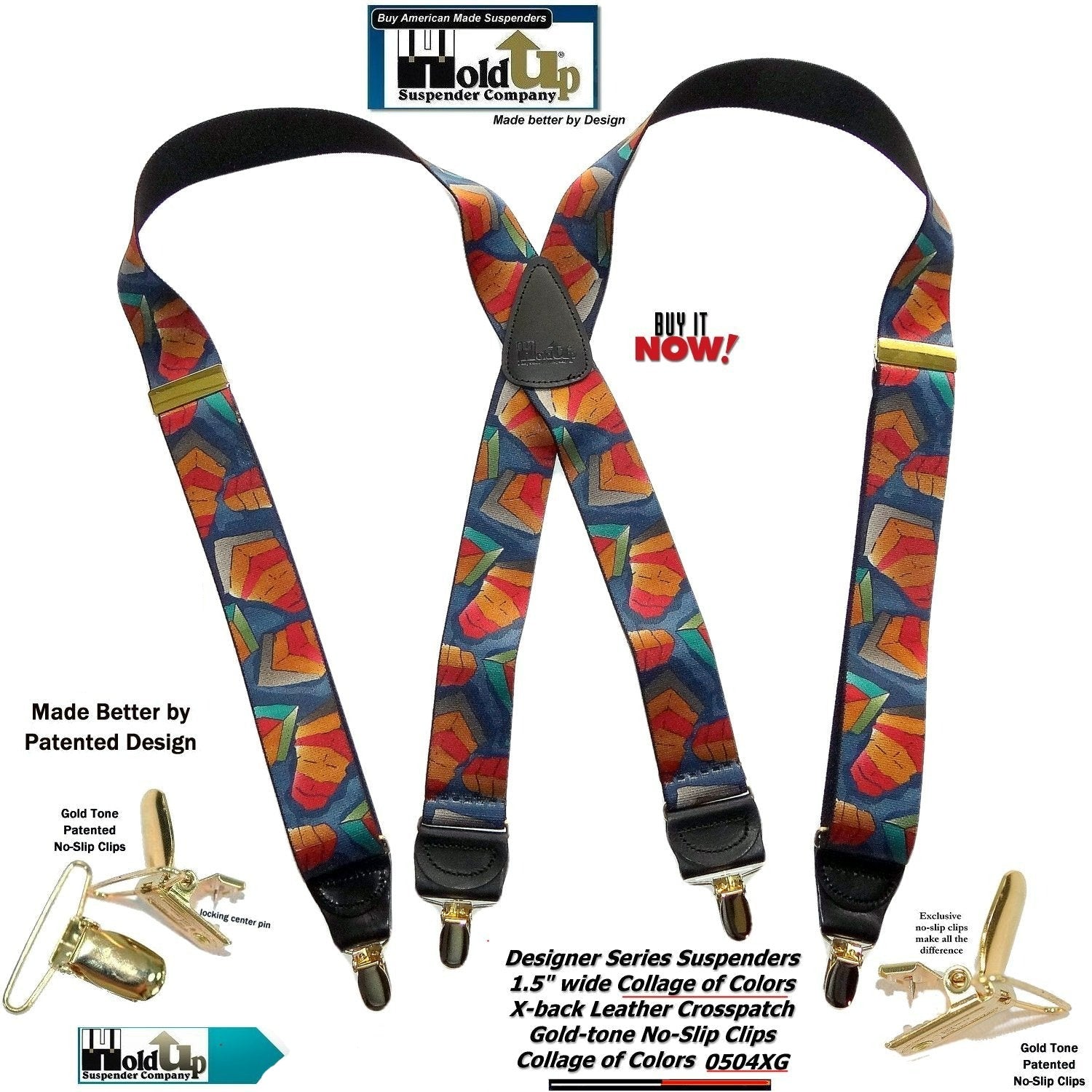 - The DESIGNER SERIES suspenders have 1 1/2" wide straps and have a black leather crosspatch embossed with our Holdup Logo in choice of Y or X-back styles.