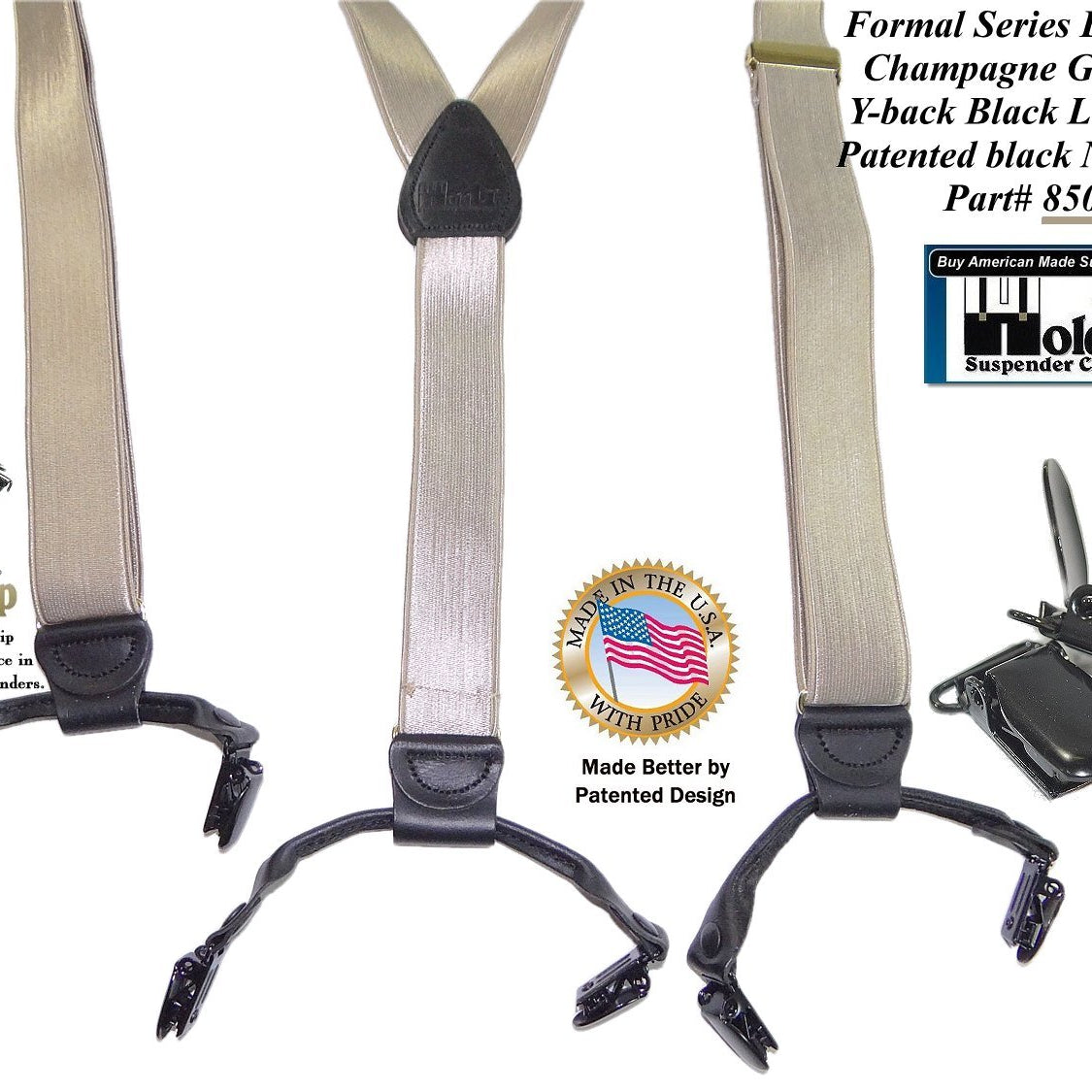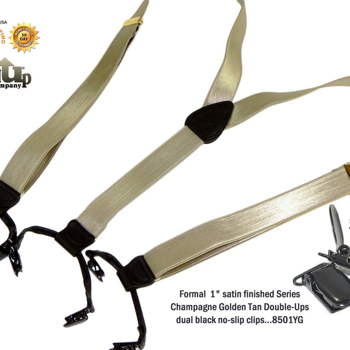 The below Formal Series Double-Upsâ„¢ men's suspender braces come in a variety of tasteful colors with a satin finish all featuring our newly re-designed no-slip Holdup suspender clip. These have a dense satin shiny finished 1 inch wide straps for a more formal look. Perfect for weddings, a special occasion parties. We have some colors in the Extra Long 54" XL length for a few dollars more!Â