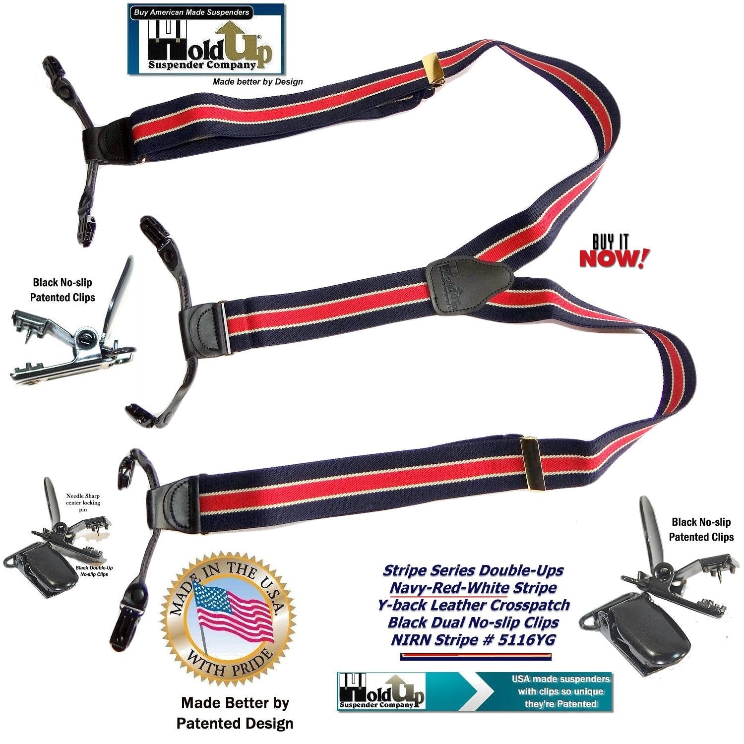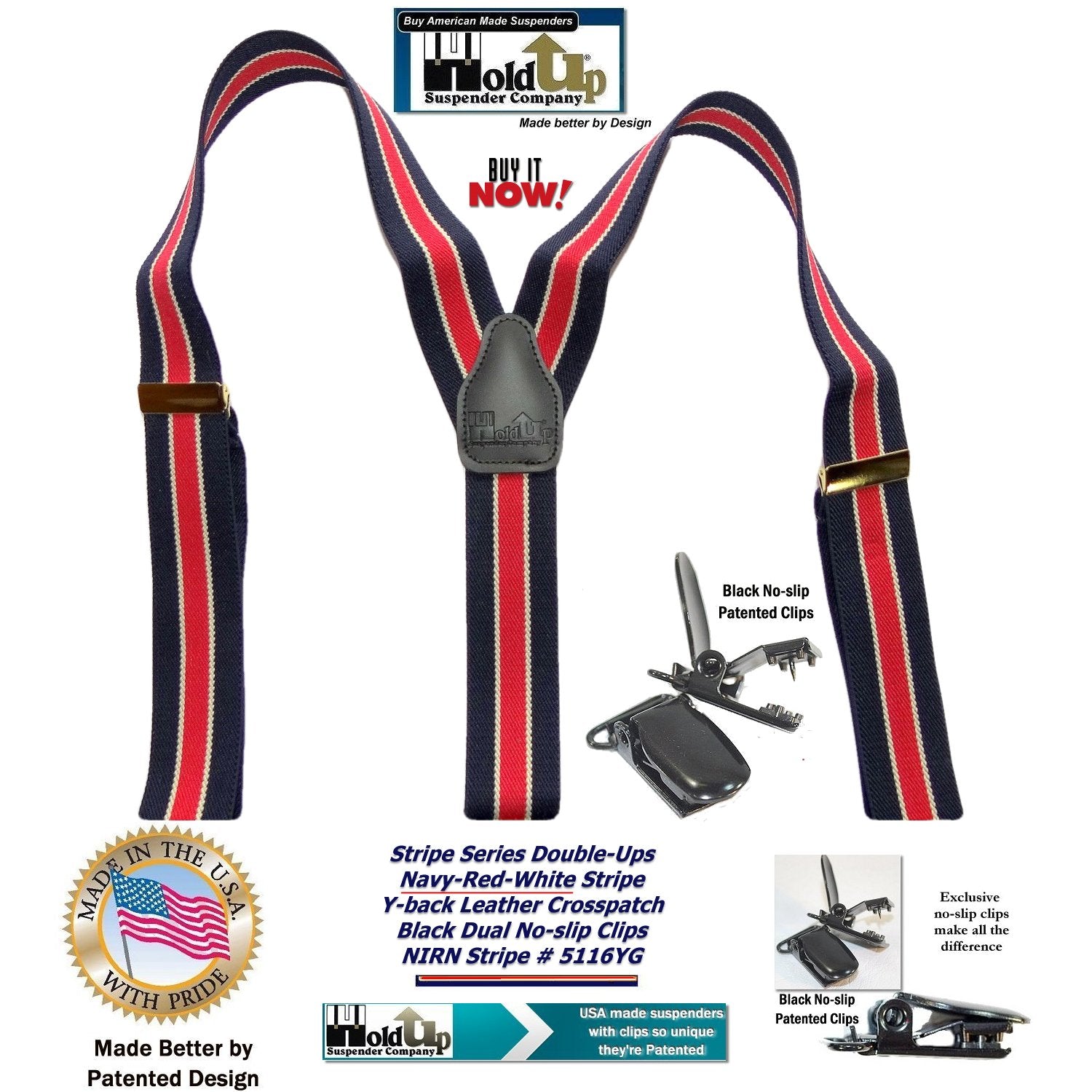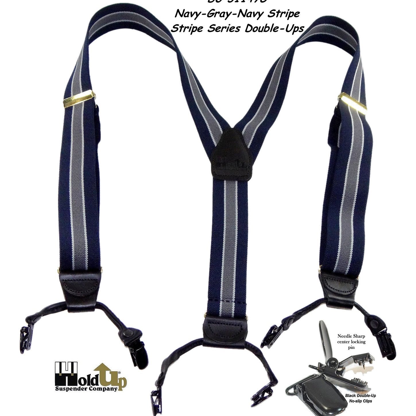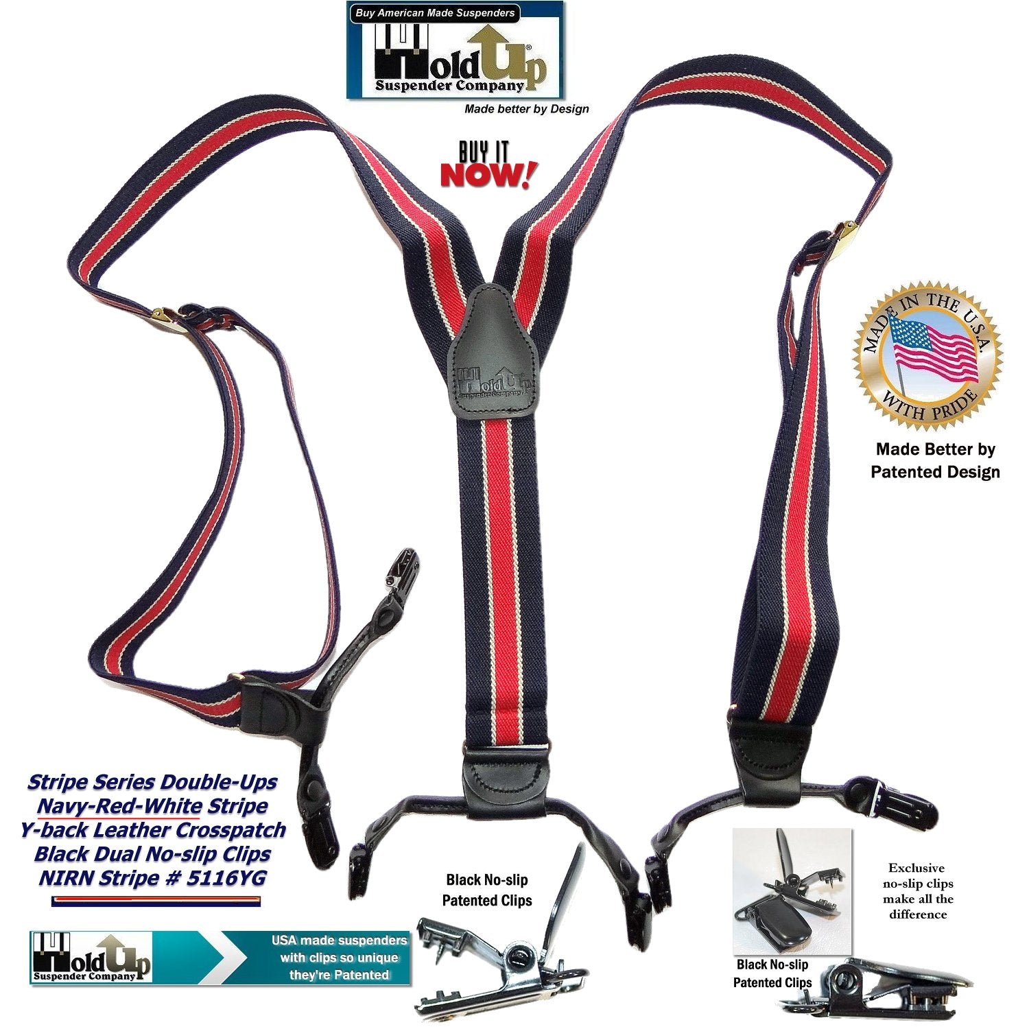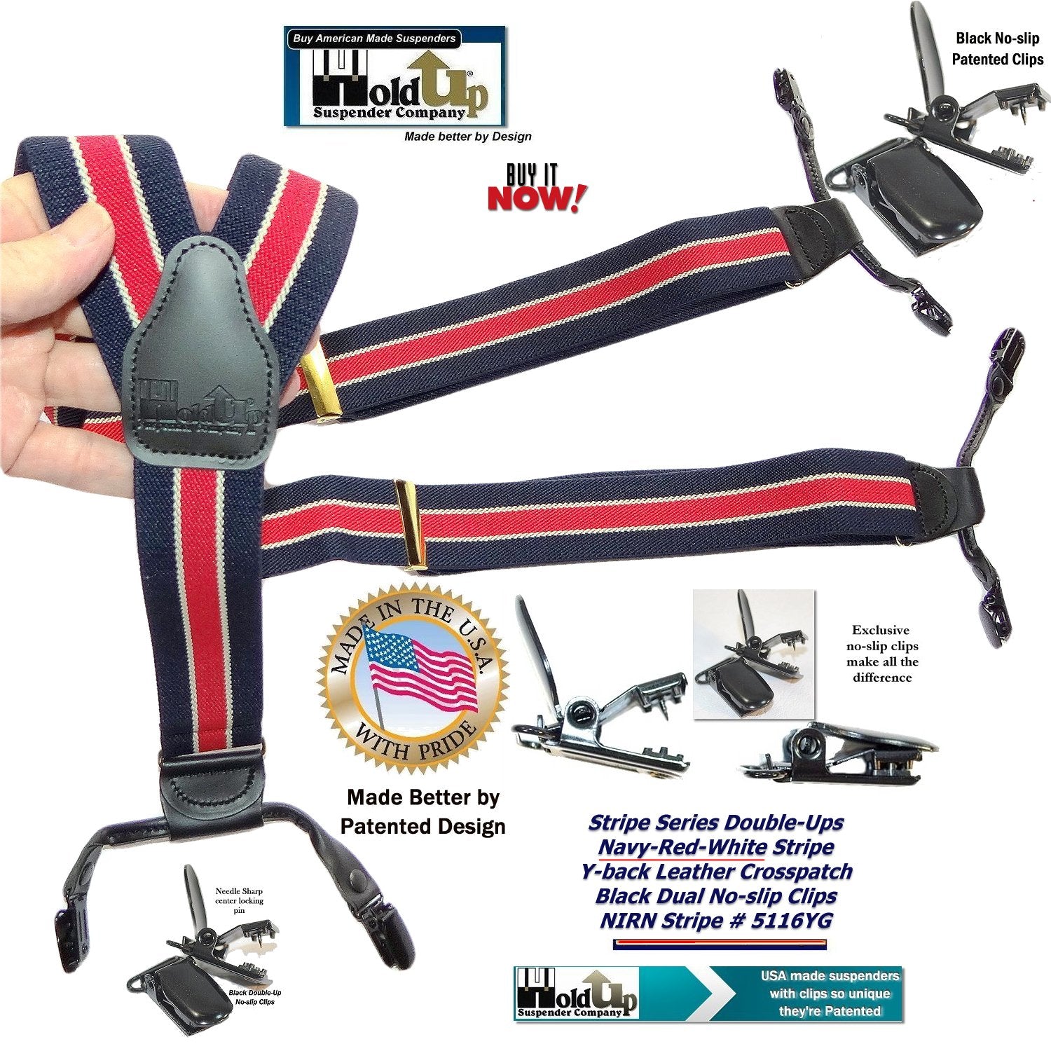 Stripes Series dual clip Double-Ups style Suspenders are made by Holdup Suspender Company. All Striped Holdups come in Y-back only with Holdup embossed logo in a top quality black leather crosspatch and have patented black no-slip center pin type clips.