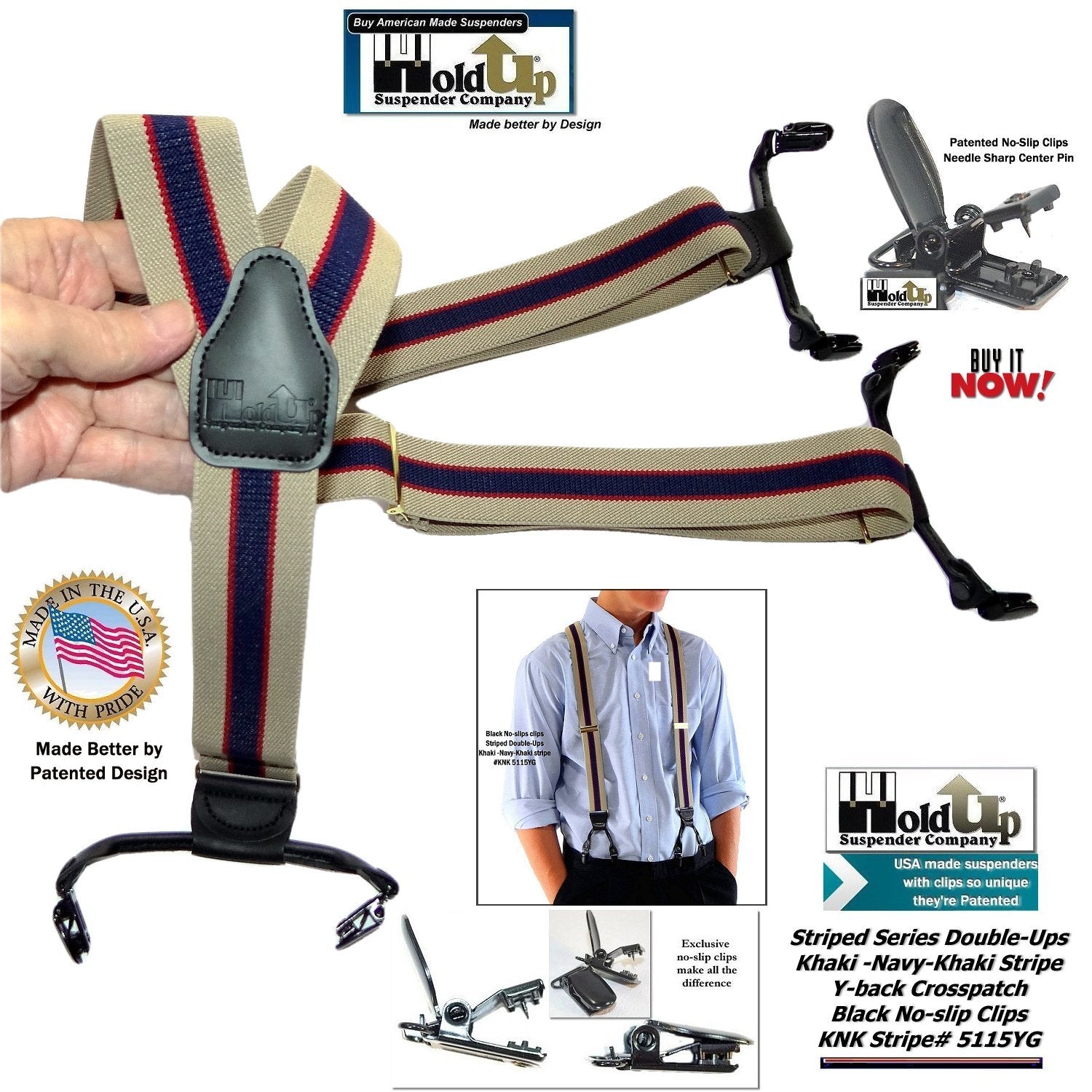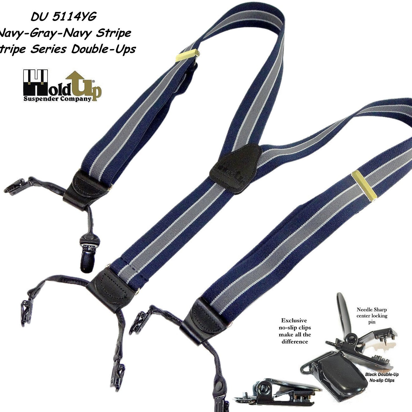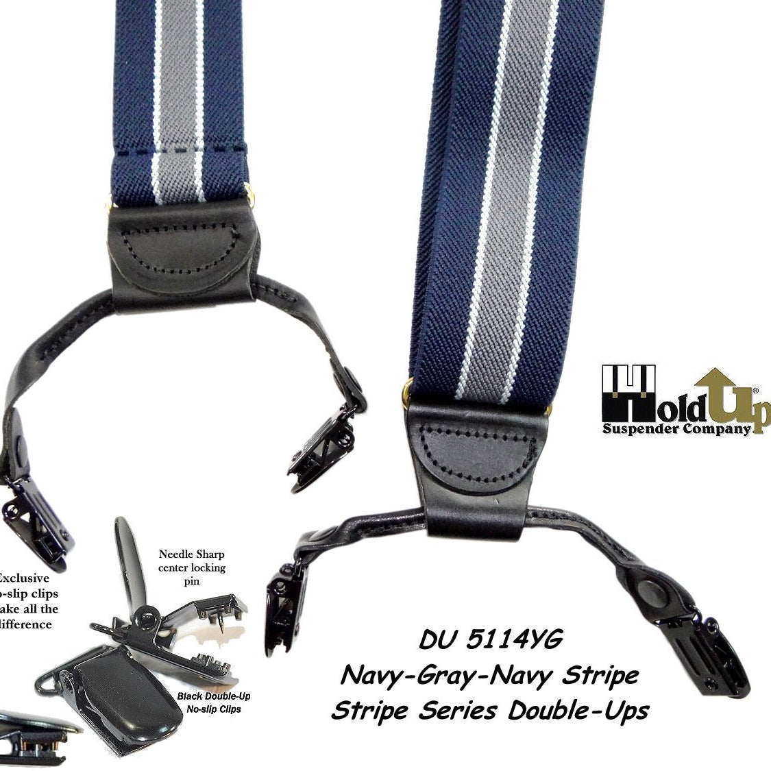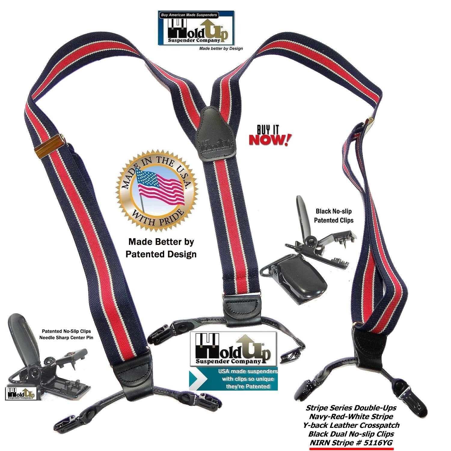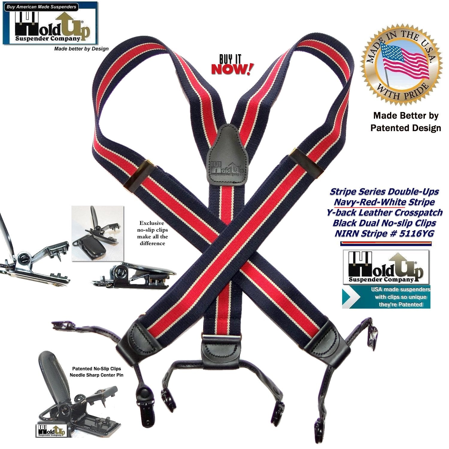Stripes Series dual clip Double-Ups style Suspenders are made by Holdup Suspender Company. All Striped Holdups come in Y-back only with Holdup embossed logo in a top quality black leather crosspatch and have patented black no-slip center pin type clips.