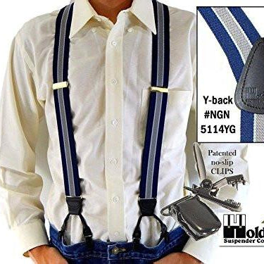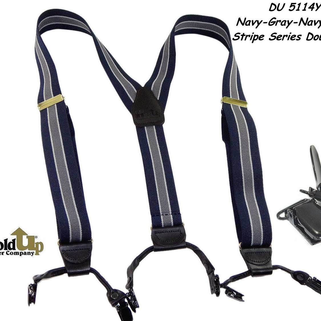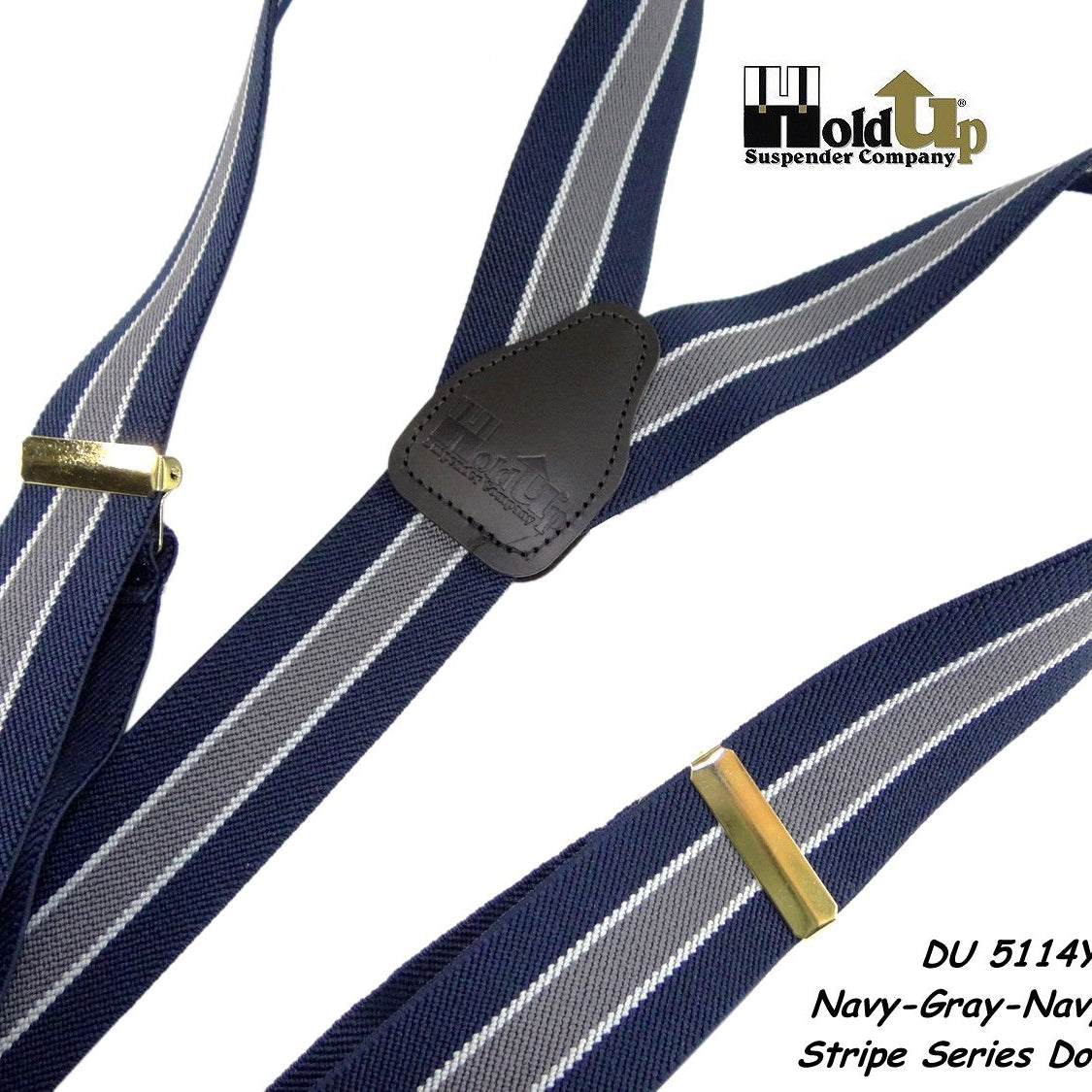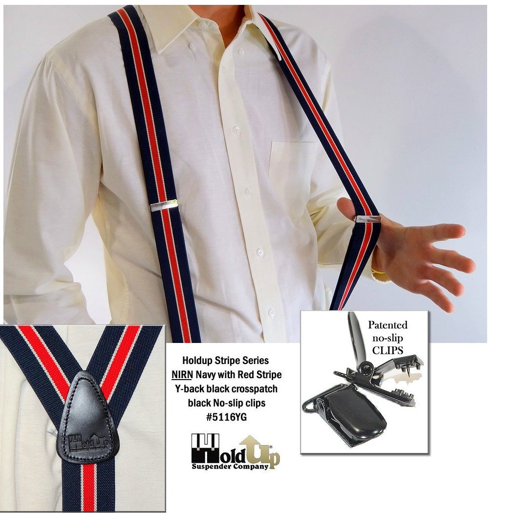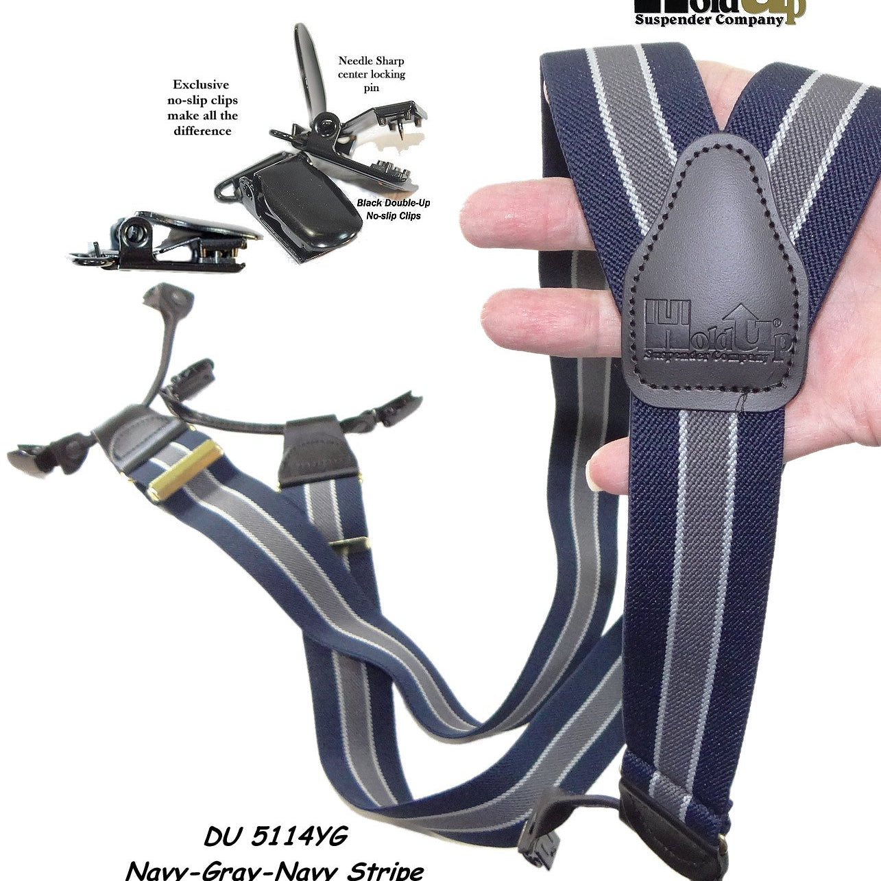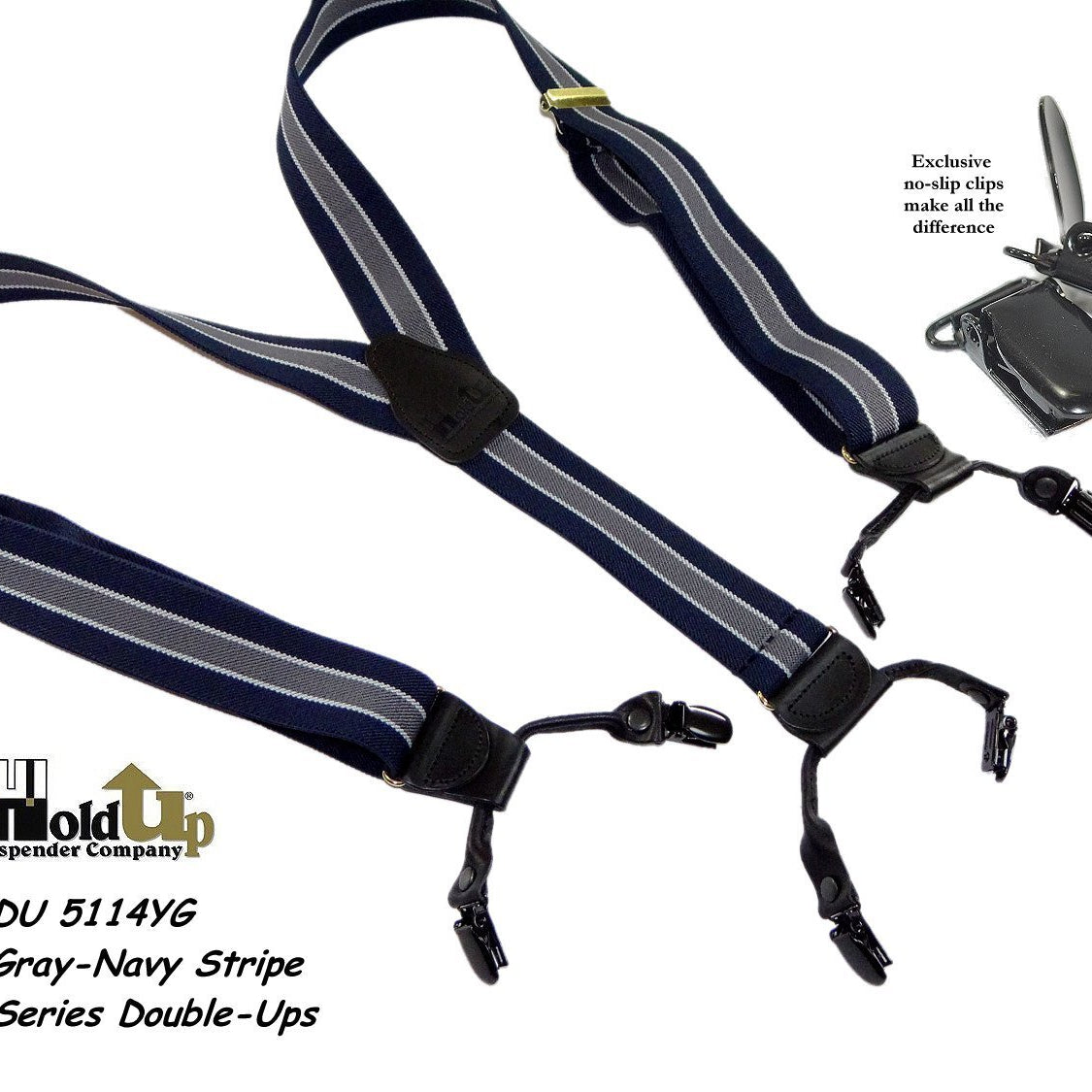 Stripes Series dual clip Double-Ups style Suspenders are made by Holdup Suspender Company. All Striped Holdups come in Y-back only with Holdup embossed logo in a top quality black leather crosspatch and have patented black no-slip center pin type clips.