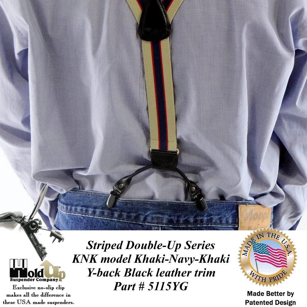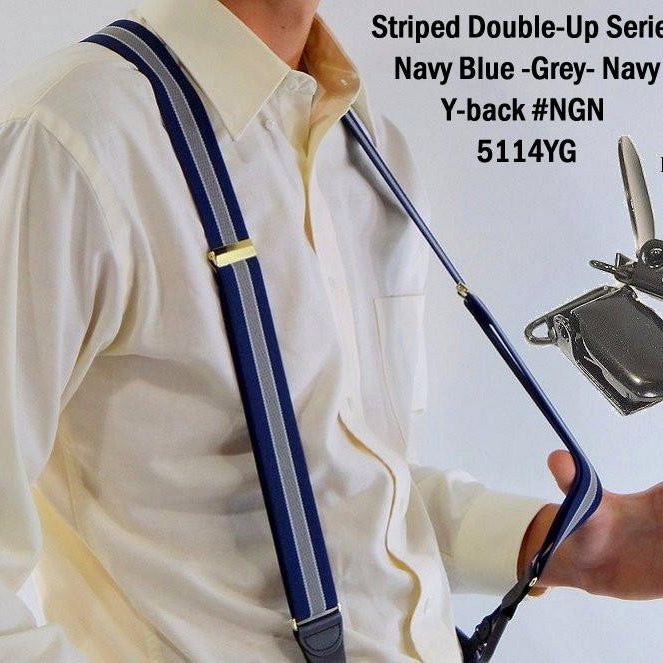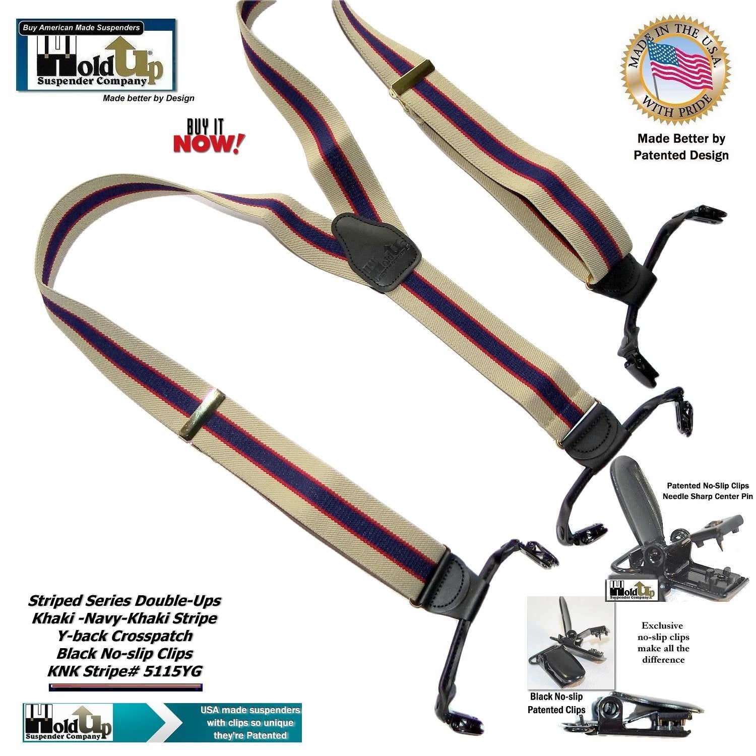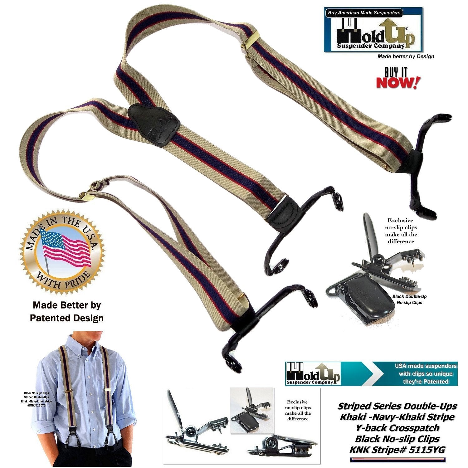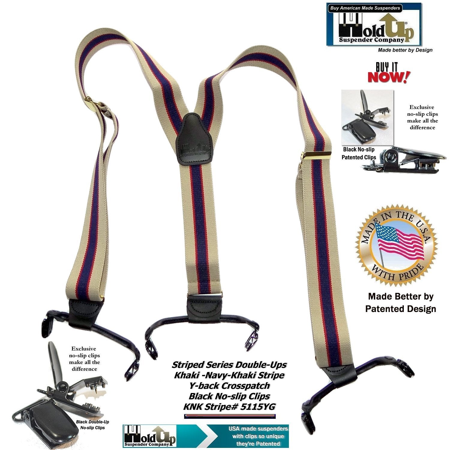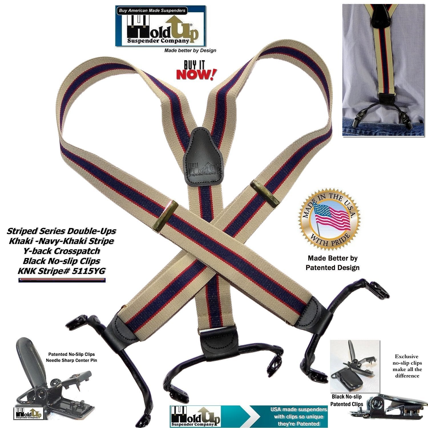 We offer several choices in Navy Blue or Khaki Tan with contrasting red or gray stripes. Now in 2016 the Holdup Suspender Company introduces 5 new tone on tone stripe colors woven right into a dressy dual Clip Double-Up striped model Holdup suspender. The jacquard weave has slightly contrasting stripe colors making them appear with a mute stripe suitable for both casual or dressy office wear. Be first to own these new Holdup stripe Series models, which come with a 30 day 100% satisfaction money back guarantee on all orders here in our holdupsuspenders.com Web Shop.