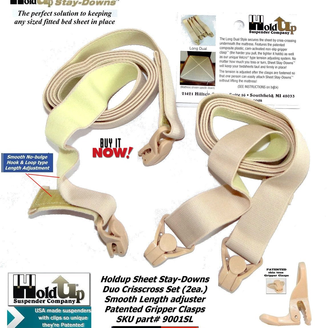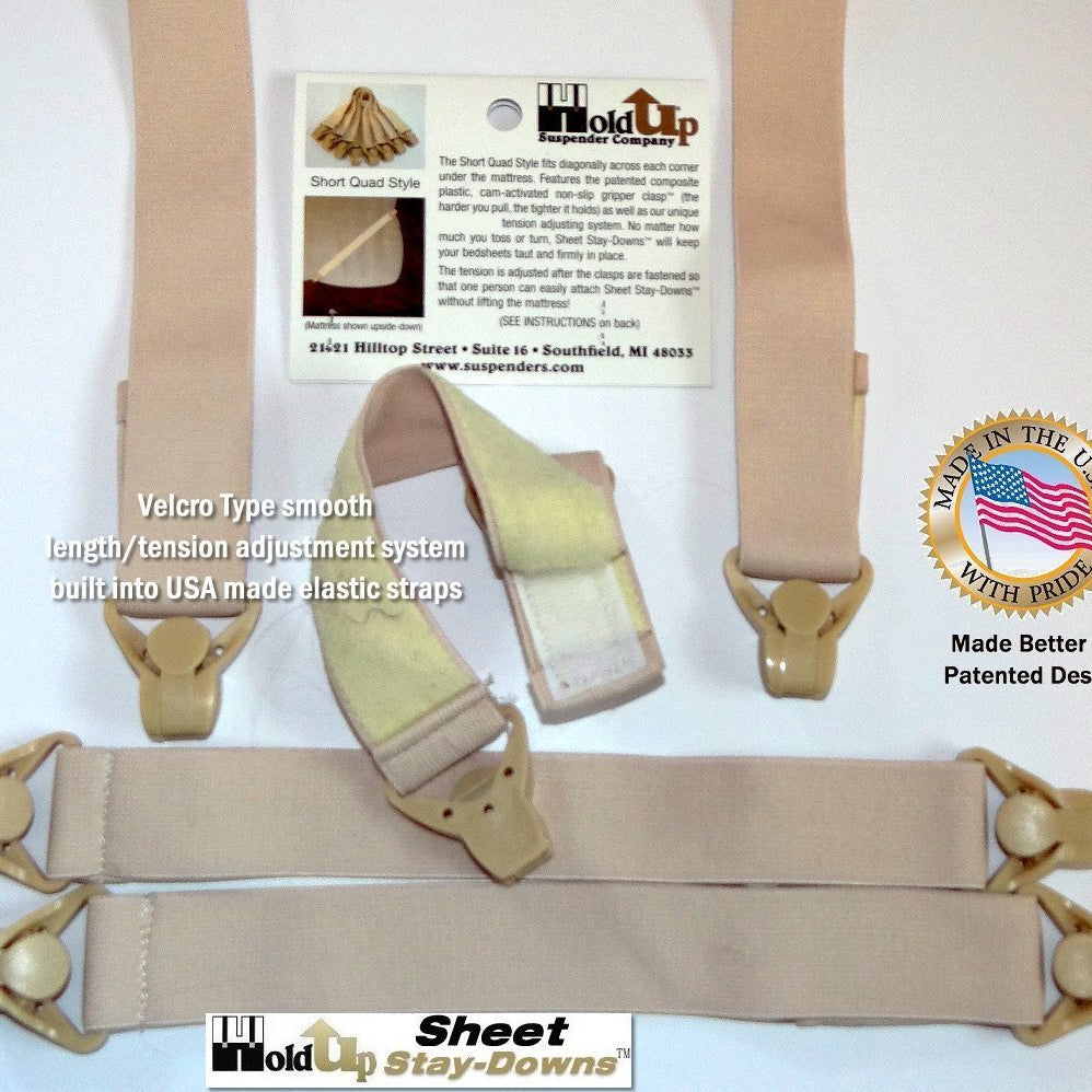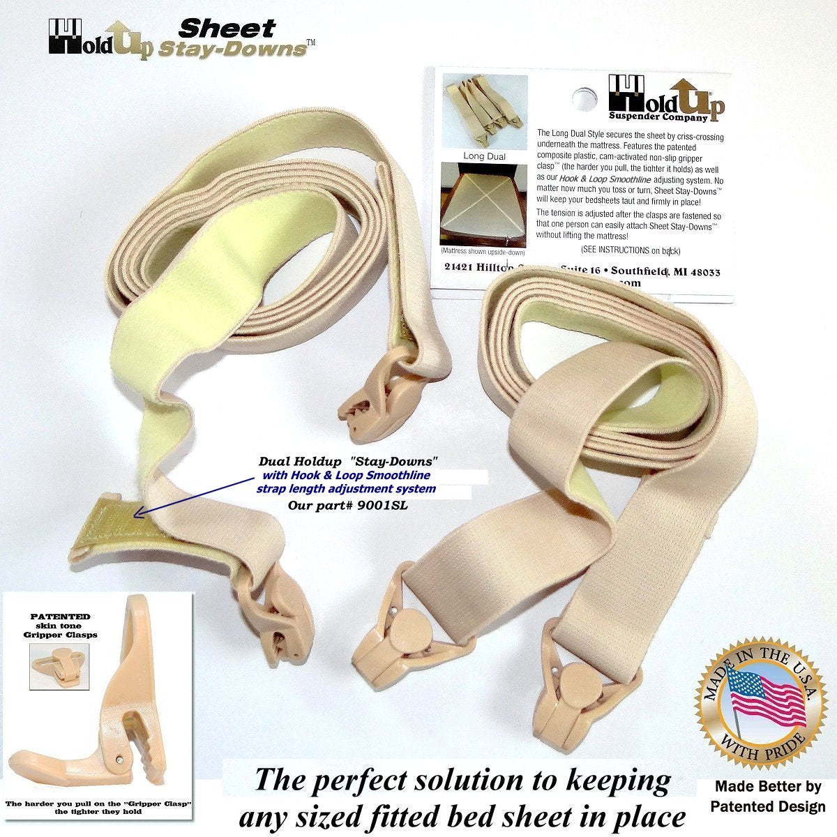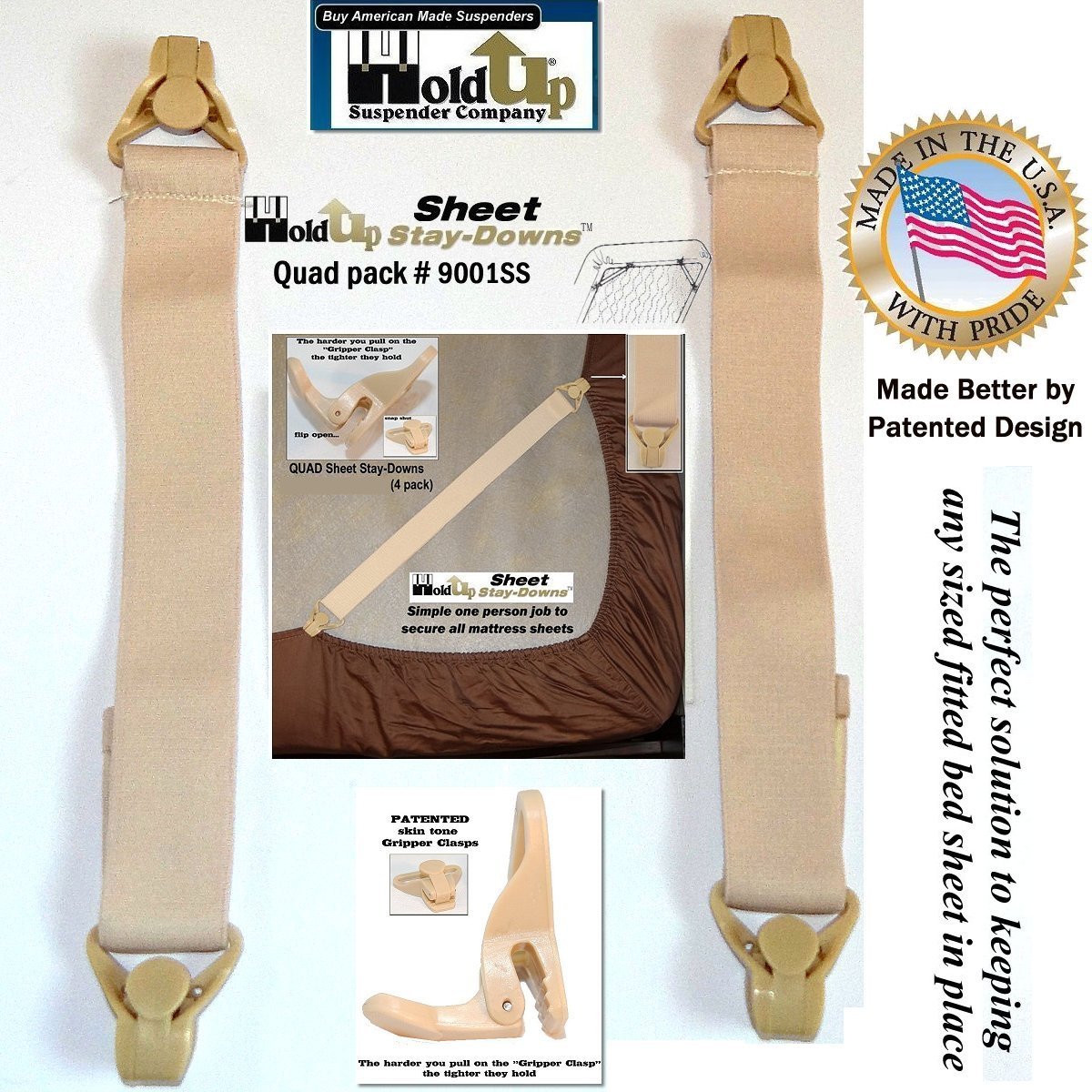 Holdup Suspender Company has created the answer to keeping all sizes of fitted bedsheets taut and in place with our new USA patented Sheet Stay-Downs™.