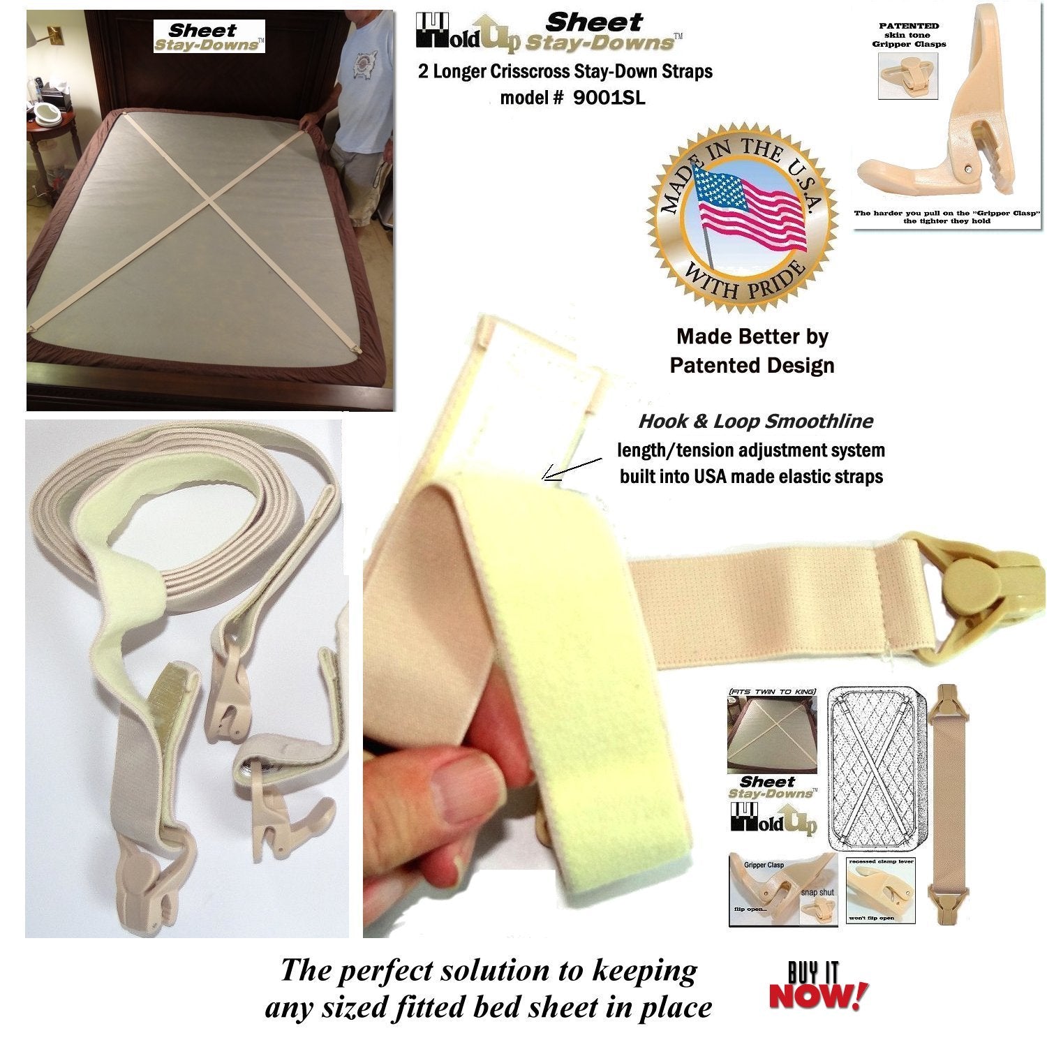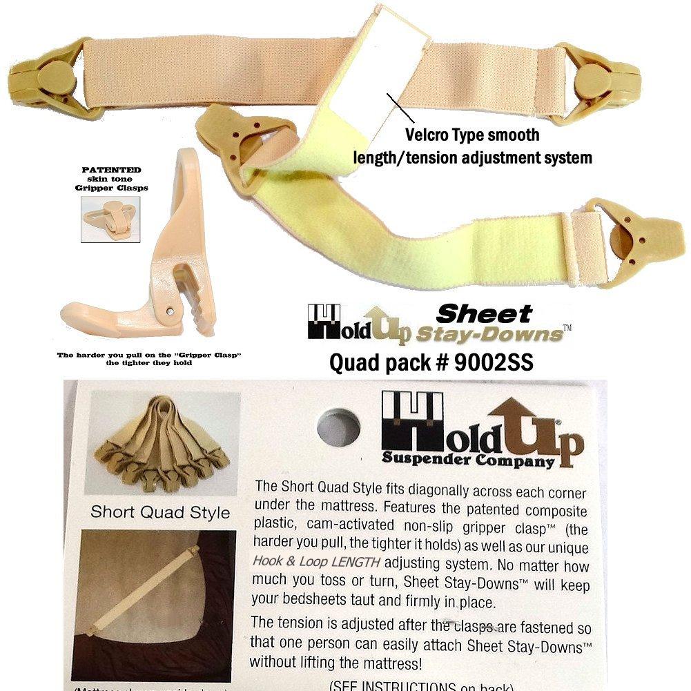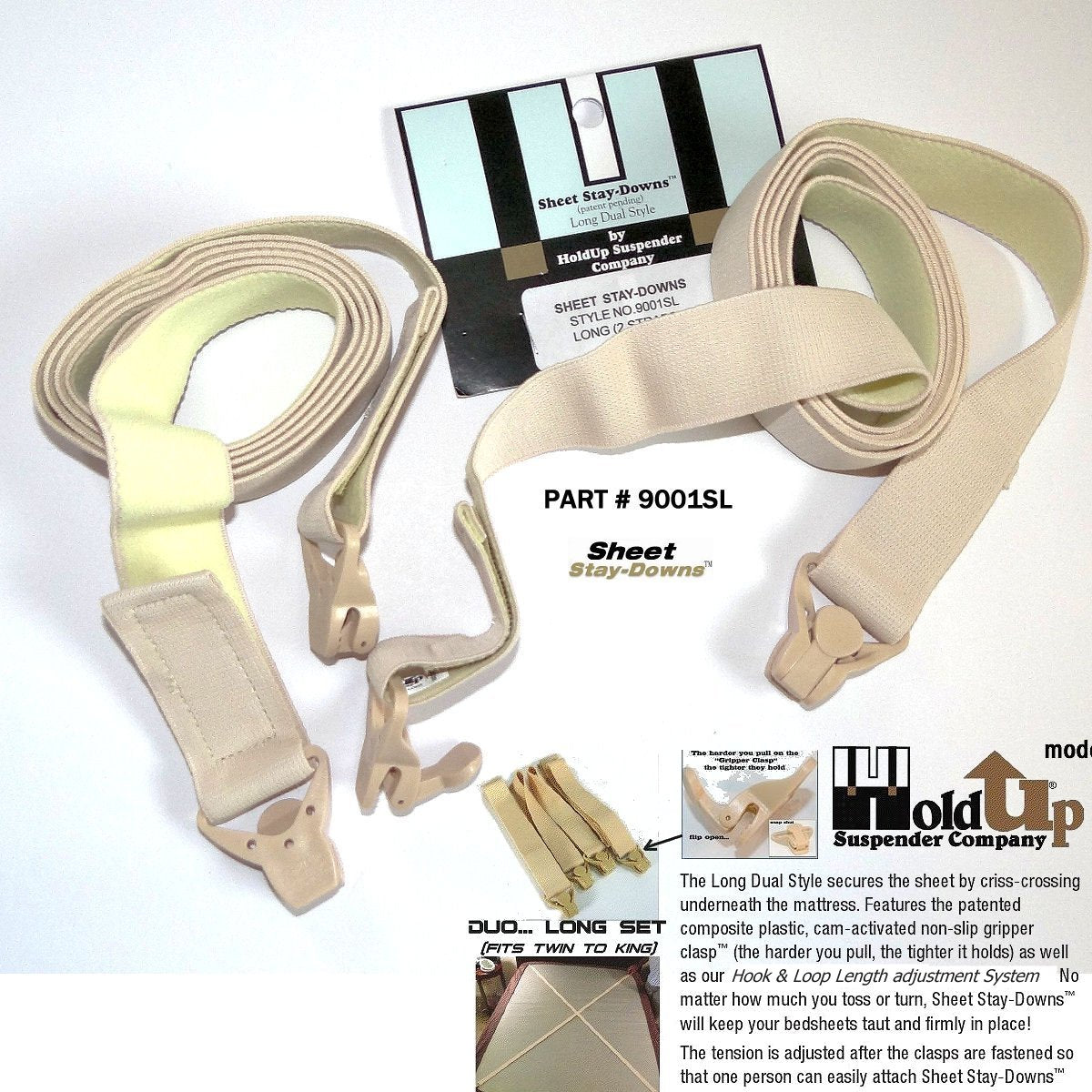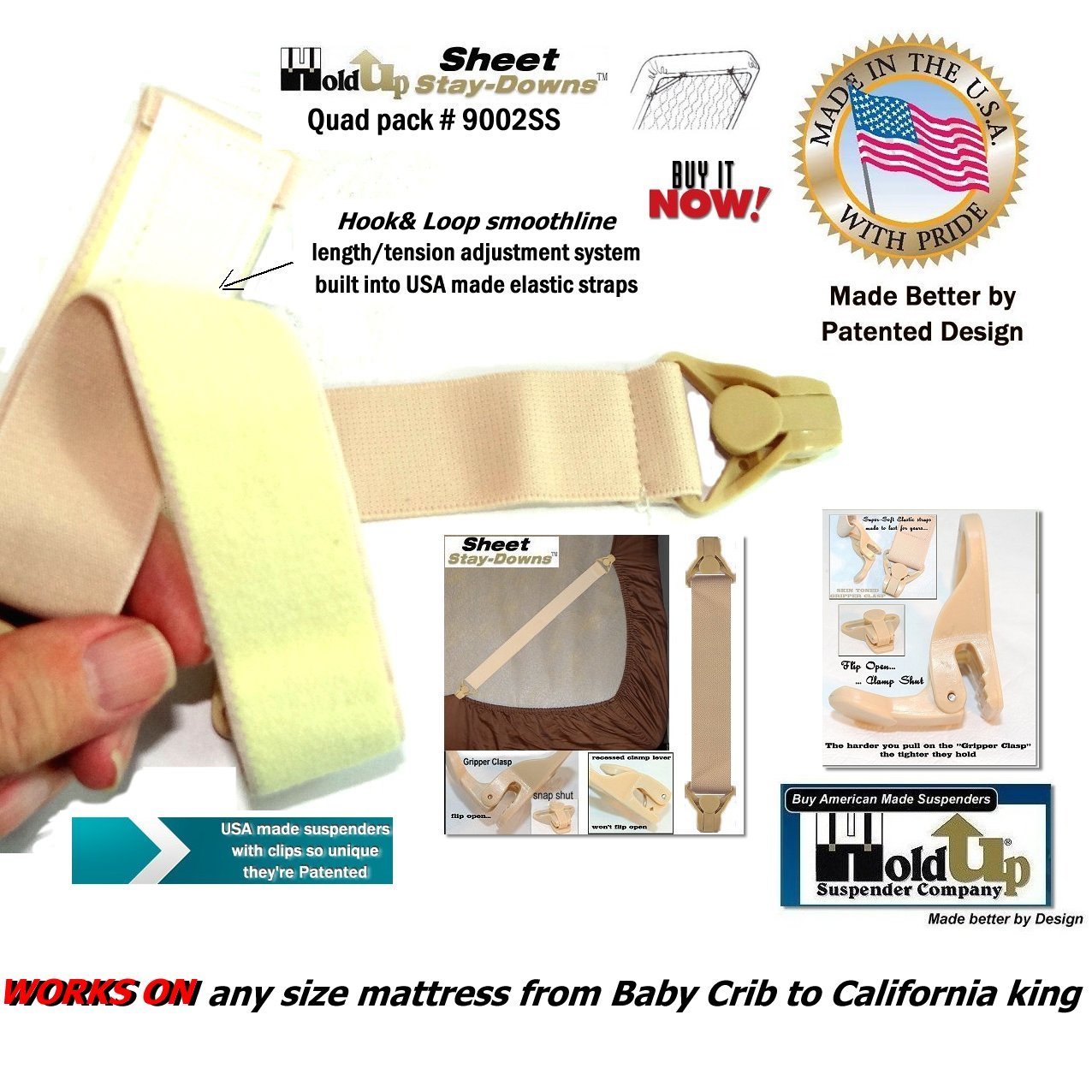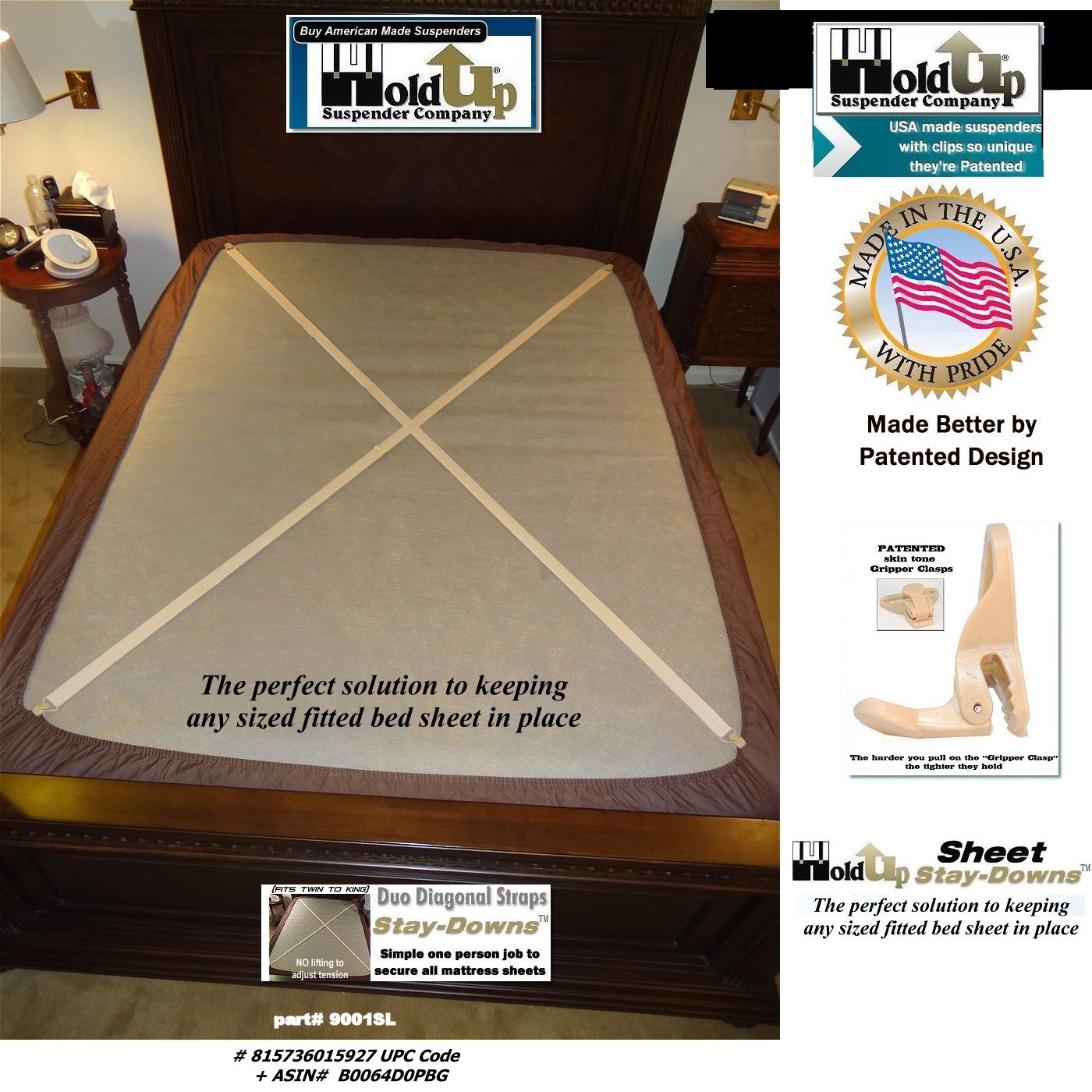 Holdup Suspender Company has created the answer to keeping all sizes of fitted bedsheets taut and in place with our new USA patented Sheet Stay-Downs™.