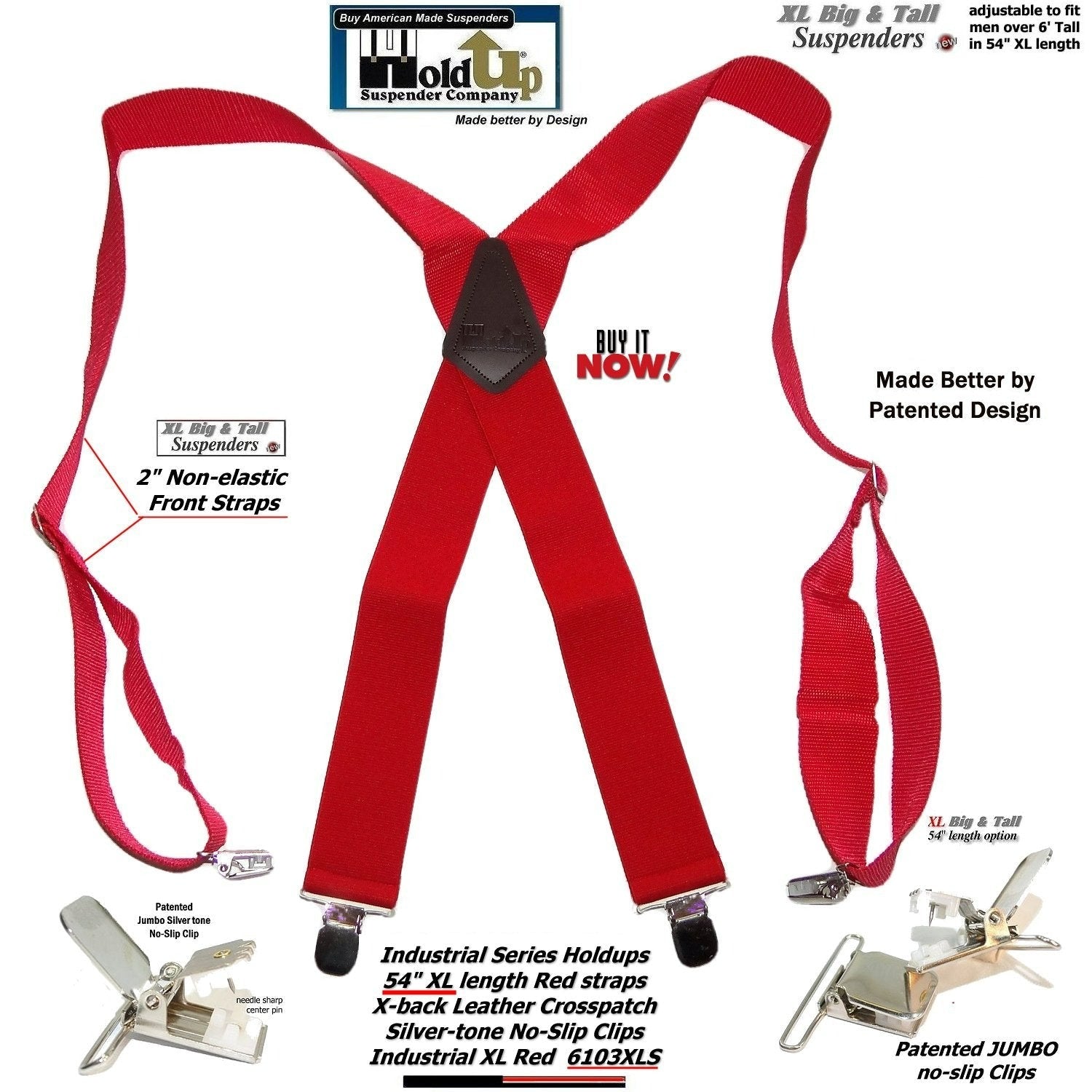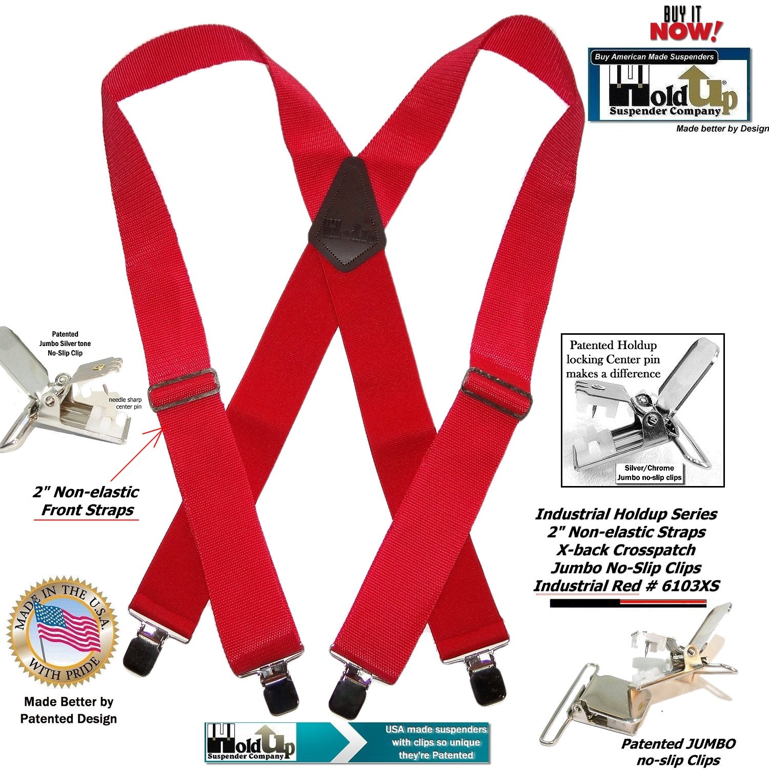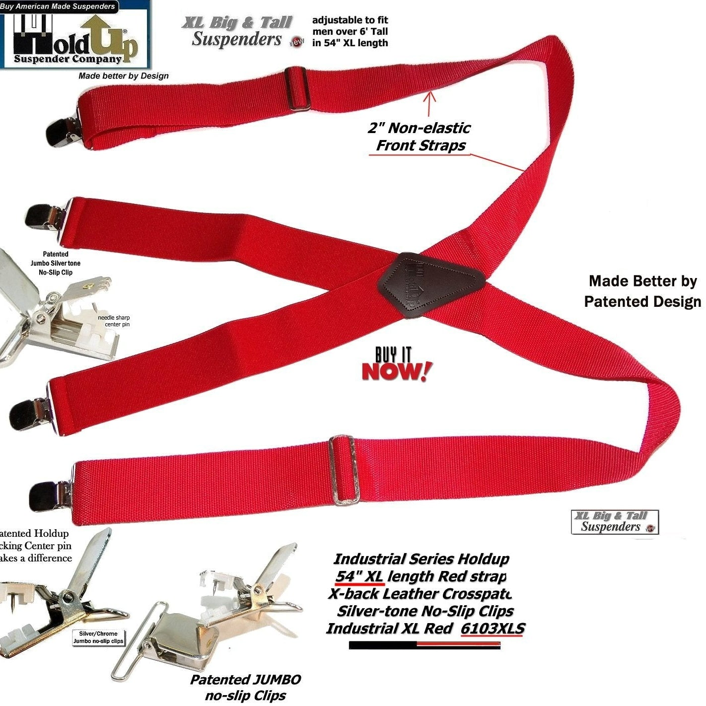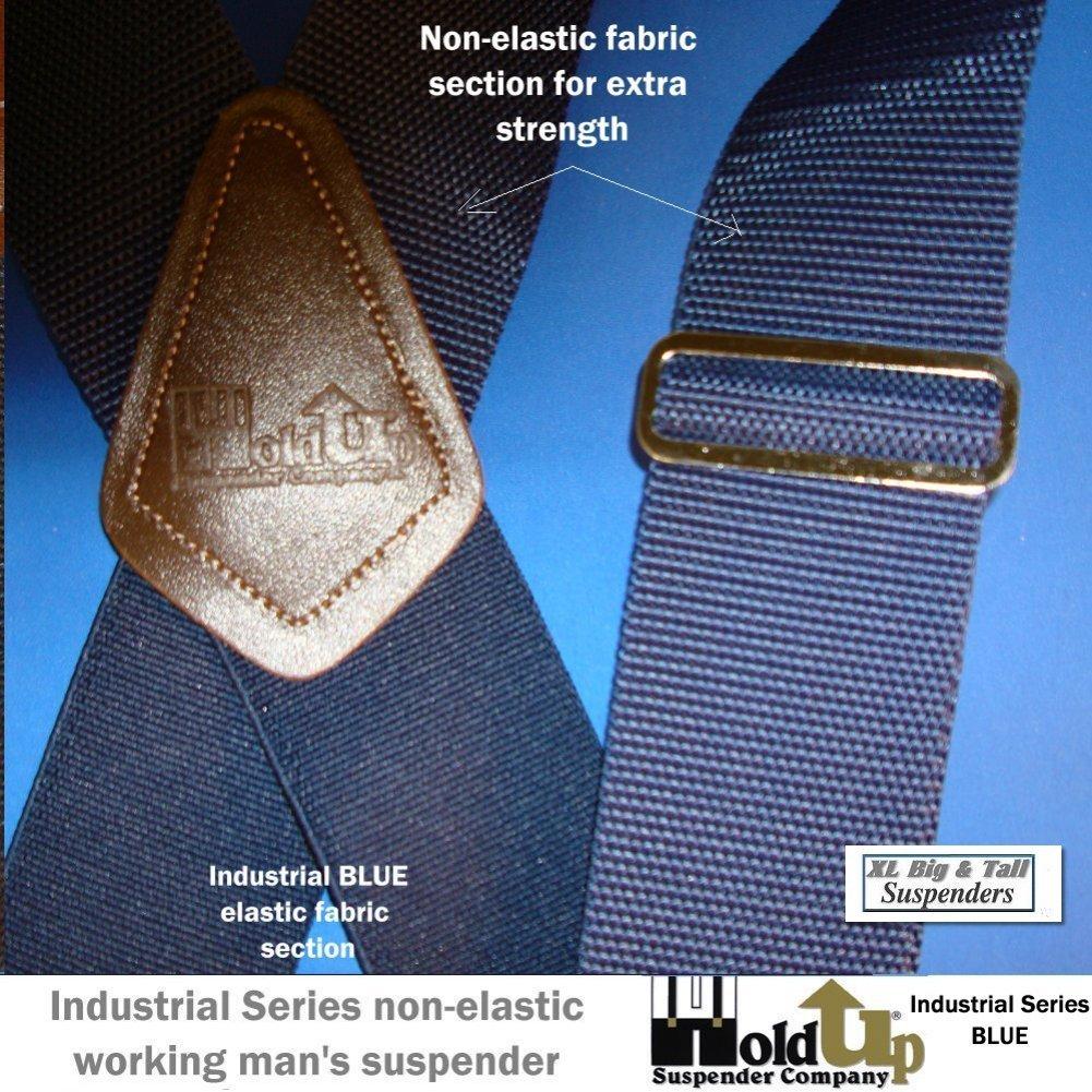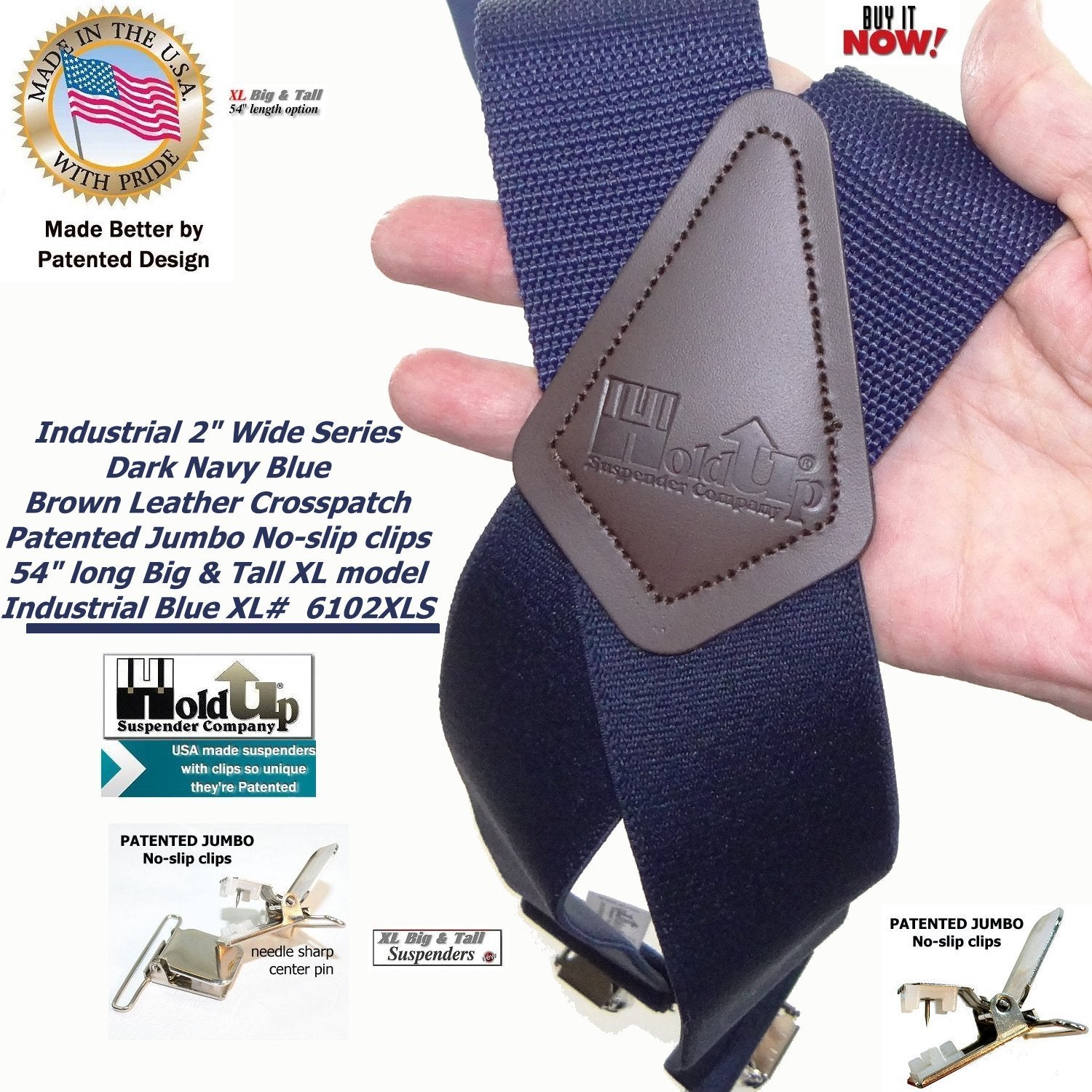 Industrial Series Holdup work suspenders in 3 solid colors with 2" wide NON -elastic front straps, X-back top gain brown leather patch & the USA patented JUMBO No-Slip SUSPENDER CLIP. Designed to last a limited of daily wear in total comfort. The rear of the Industrial work suspenders, below the Brown Leather crosspatch with embossed Holdup logo, is 2' wide elastic fabric in a matching red, black or blue color to allow comfort flexing and we have XL 54" length models for $3.00 more.