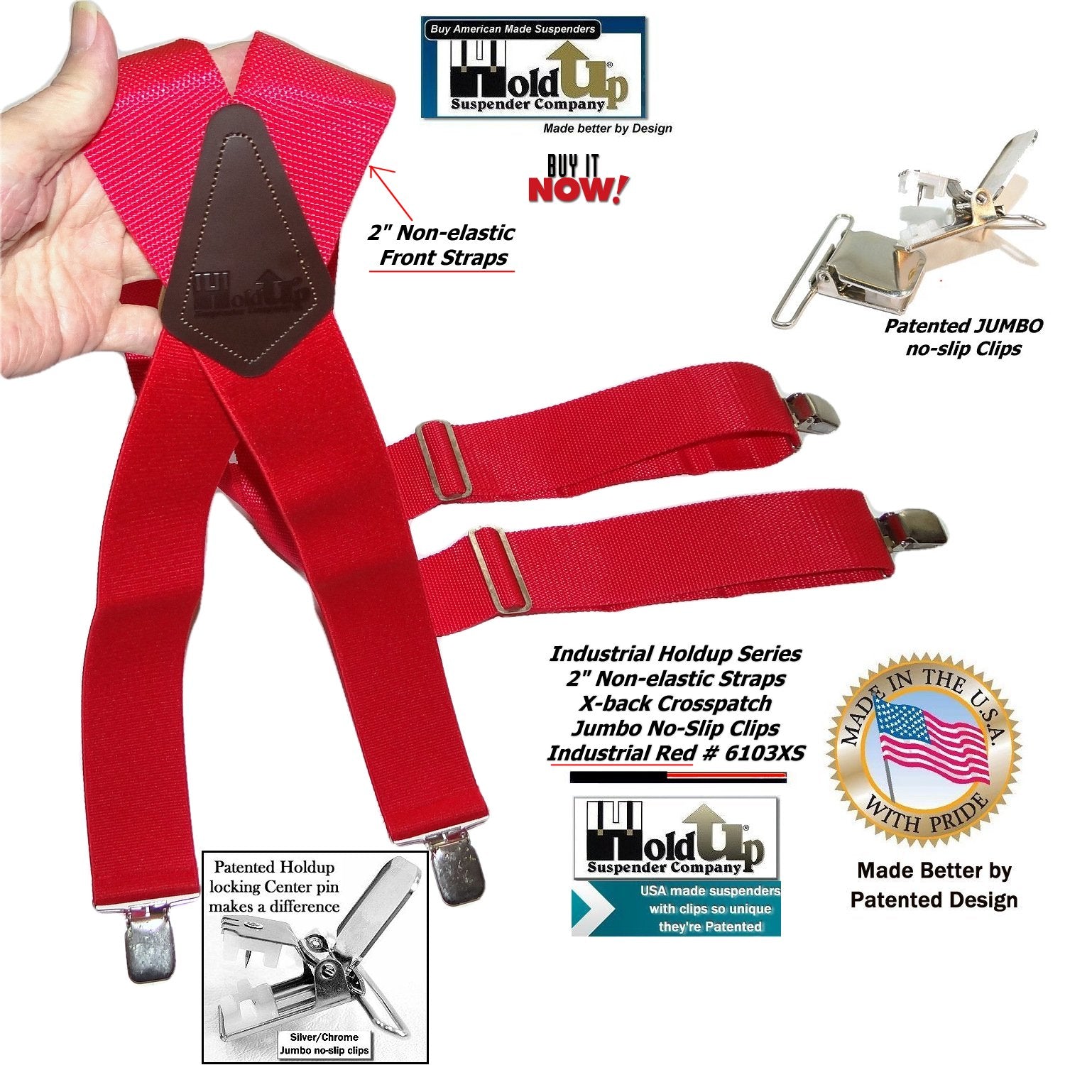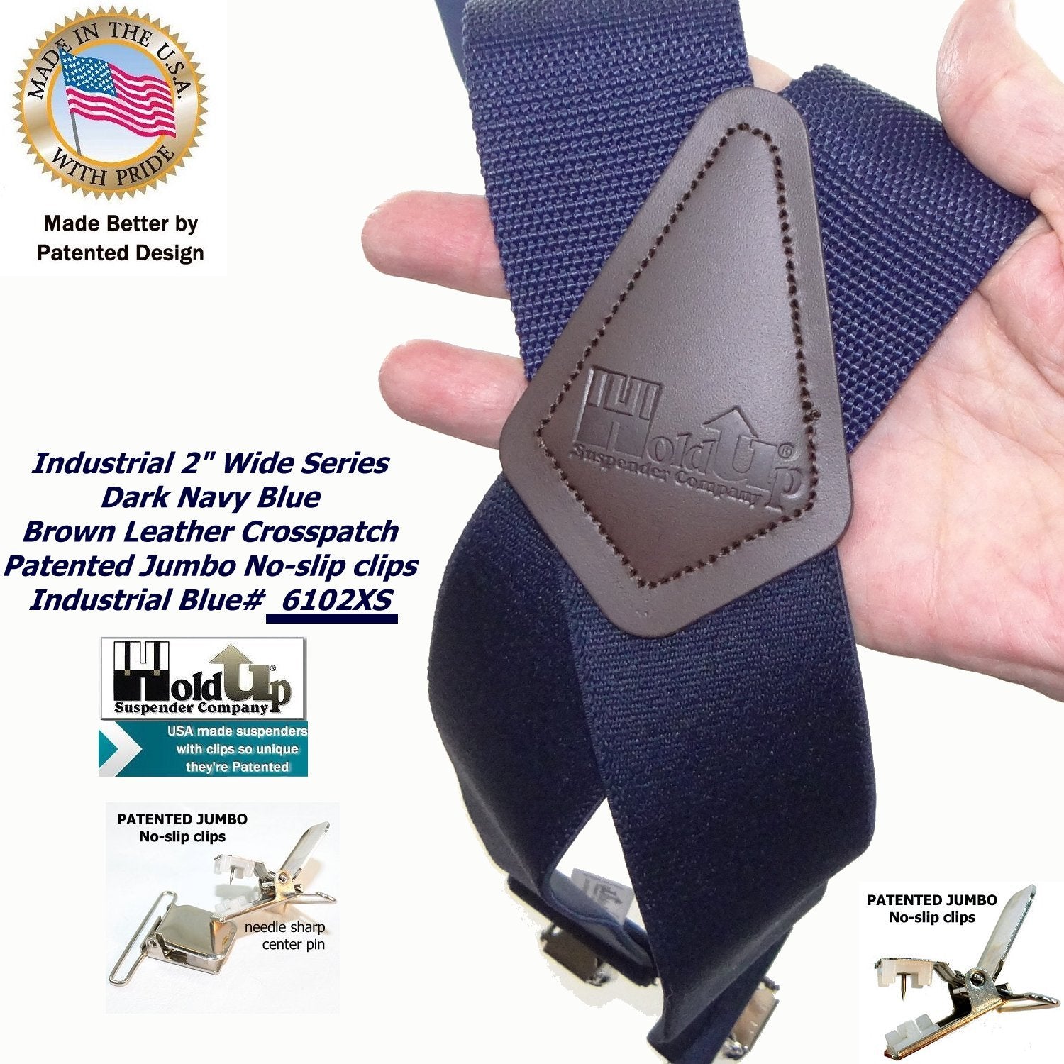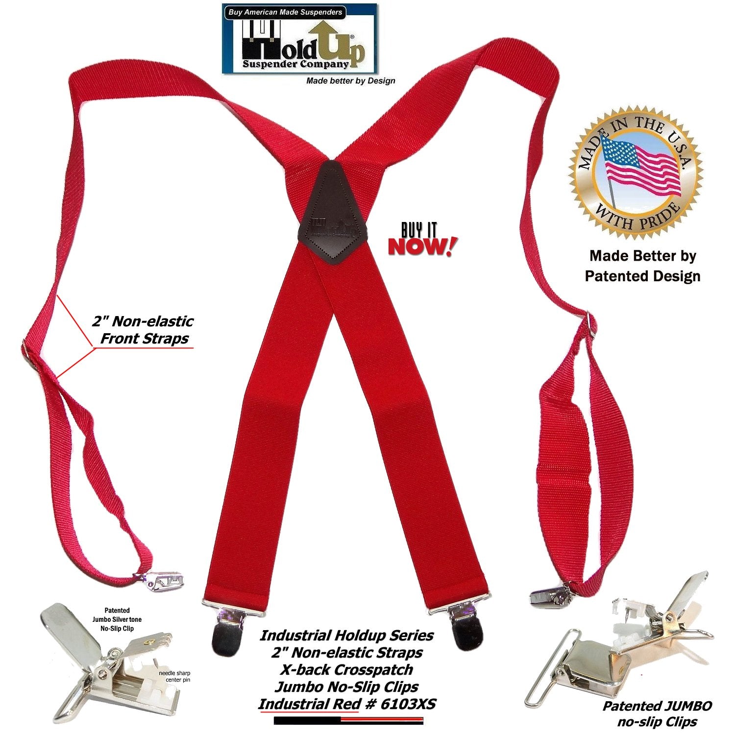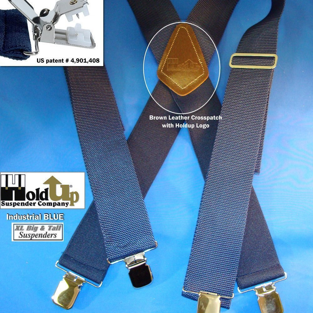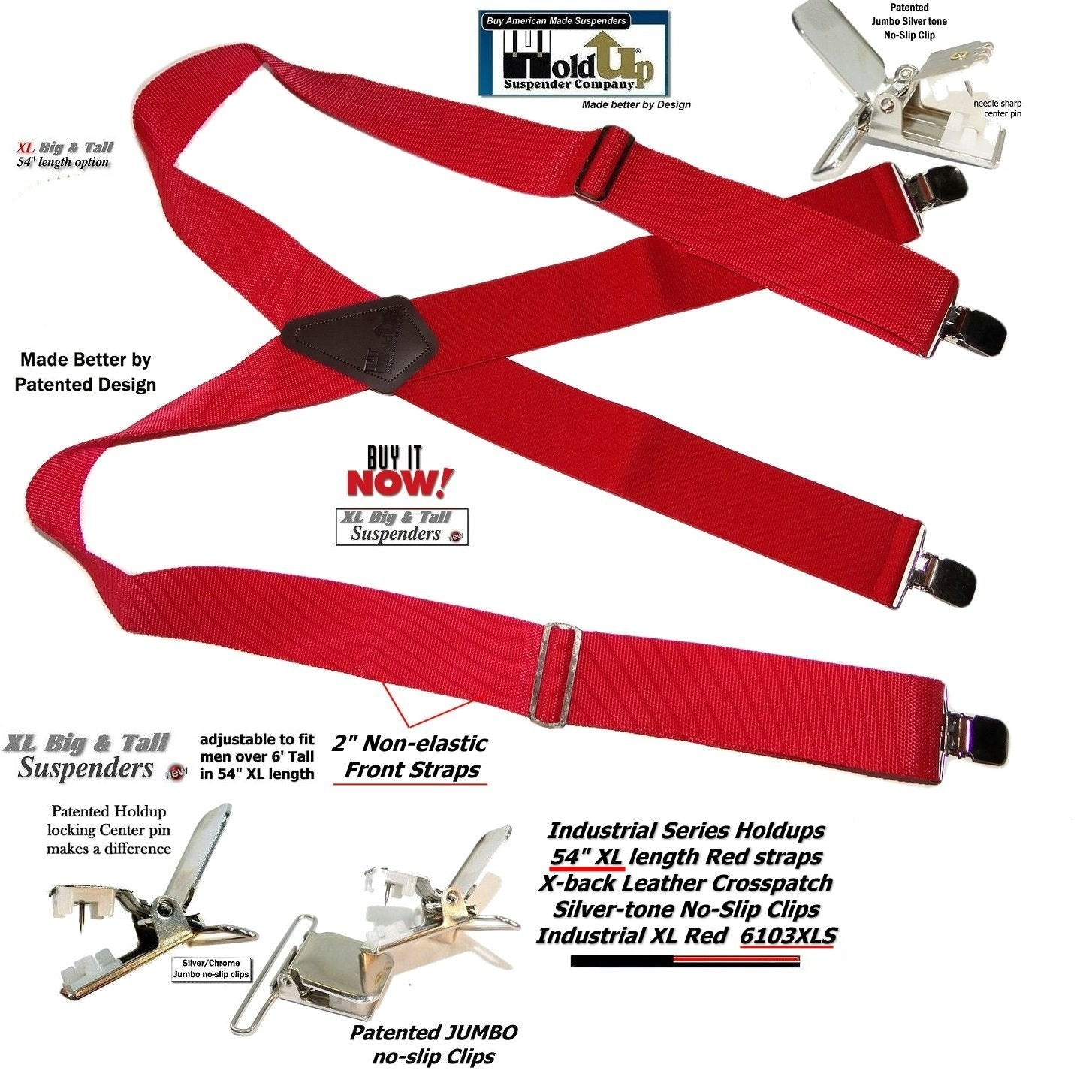 Industrial Series Holdup work suspenders in 3 solid colors with 2" wide NON -elastic front straps, X-back top gain brown leather patch & the USA patented JUMBO No-Slip SUSPENDER CLIP. Designed to last a limited of daily wear in total comfort. The rear of the Industrial work suspenders, below the Brown Leather crosspatch with embossed Holdup logo, is 2' wide elastic fabric in a matching red, black or blue color to allow comfort flexing and we have XL 54" length models for $3.00 more.