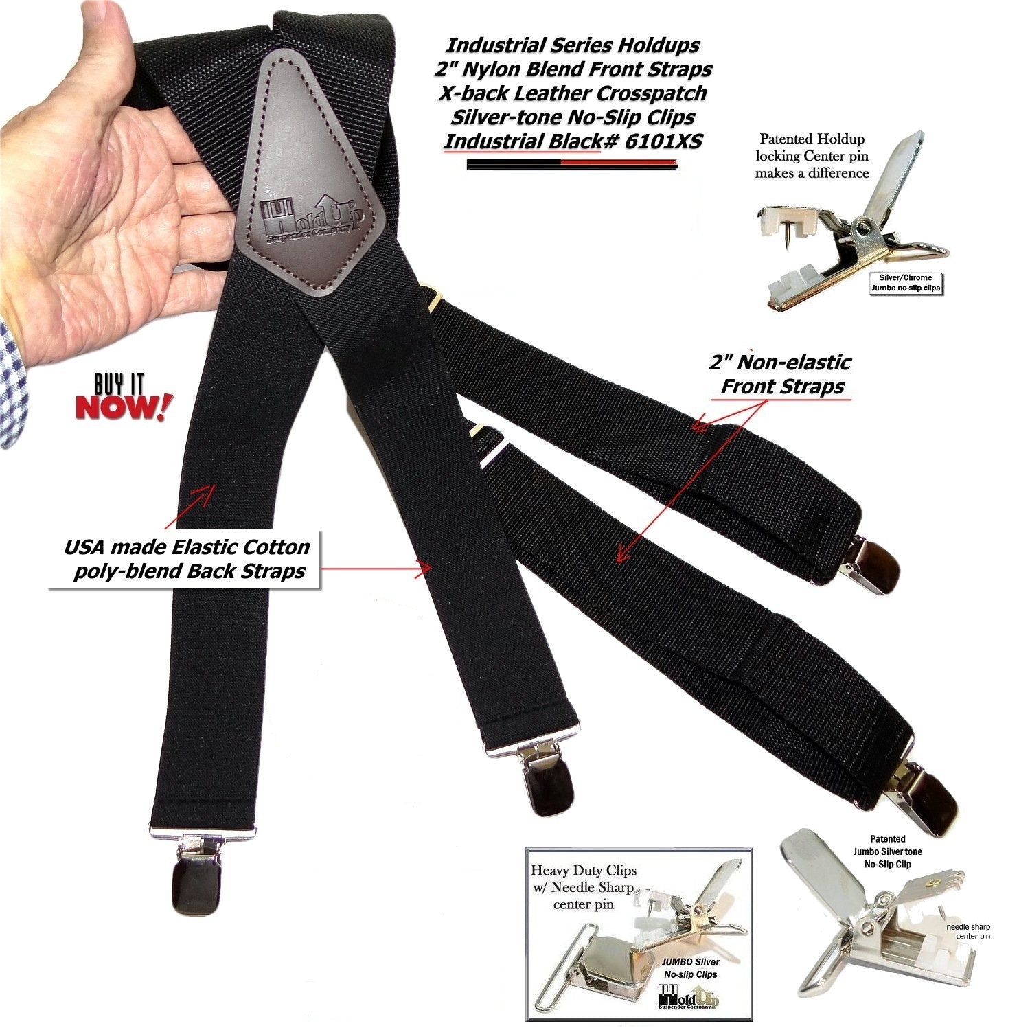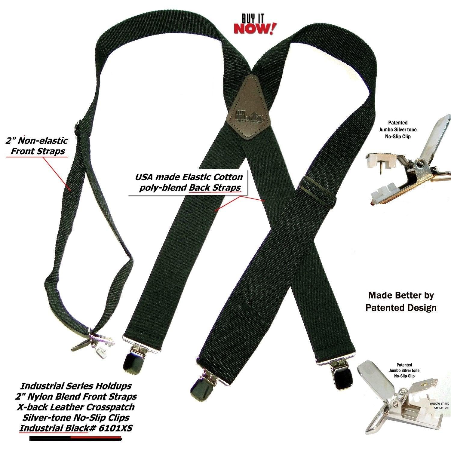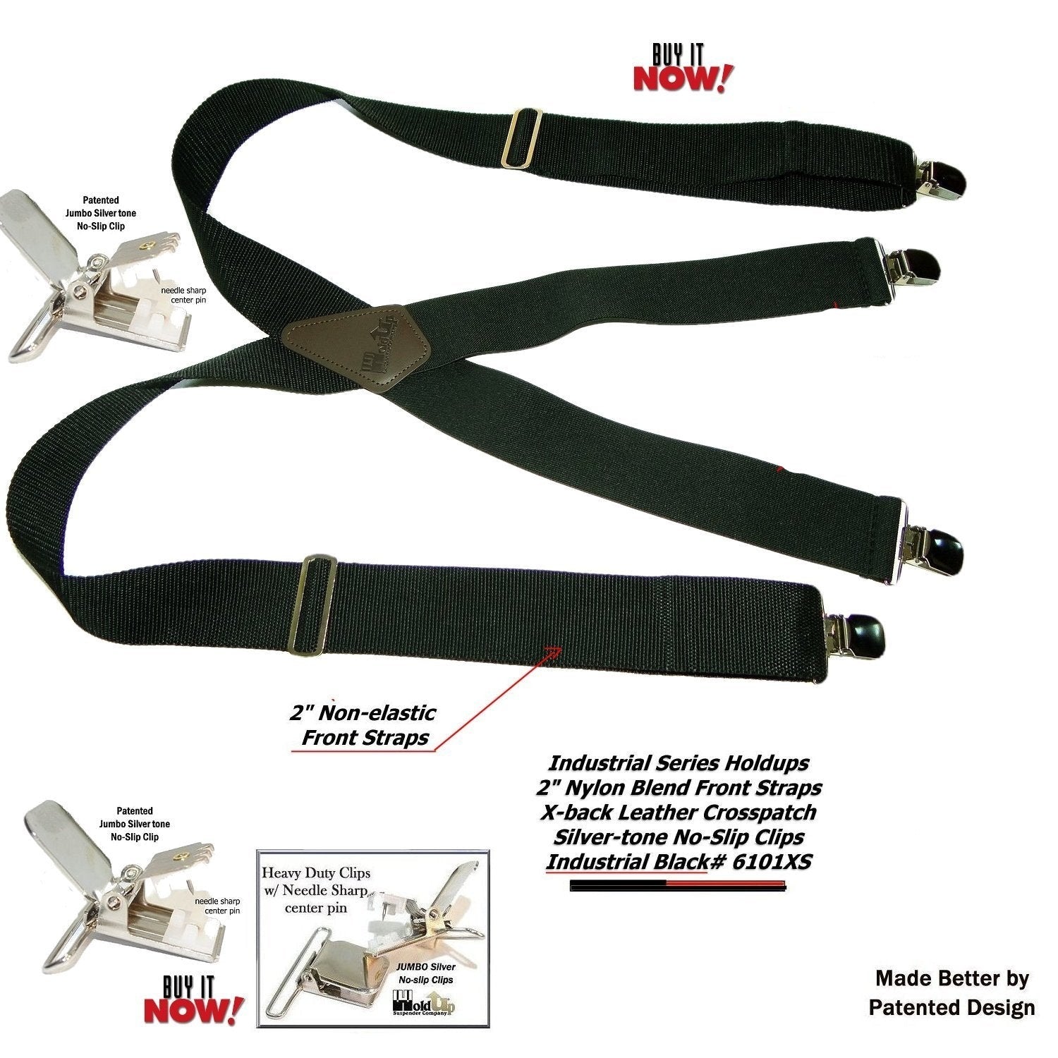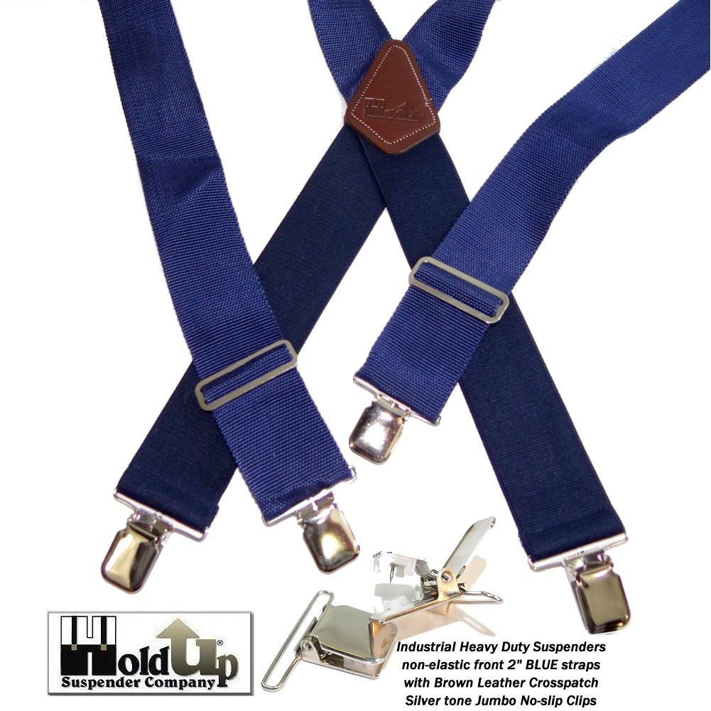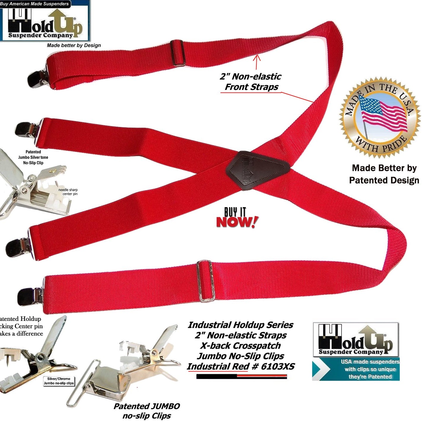 Industrial Series Holdup work suspenders in 3 solid colors with 2" wide NON -elastic front straps, X-back top gain brown leather patch & the USA patented JUMBO No-Slip SUSPENDER CLIP. Designed to last a limited of daily wear in total comfort. The rear of the Industrial work suspenders, below the Brown Leather crosspatch with embossed Holdup logo, is 2' wide elastic fabric in a matching red, black or blue color to allow comfort flexing and we have XL 54" length models for $3.00 more.