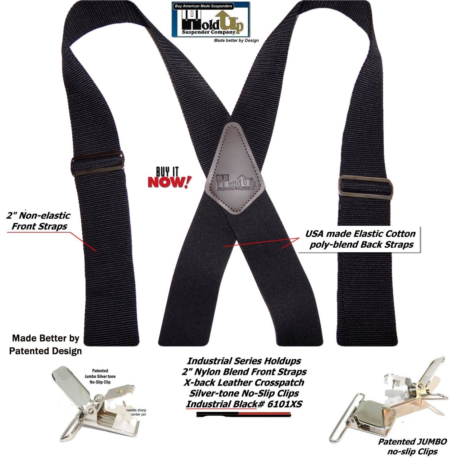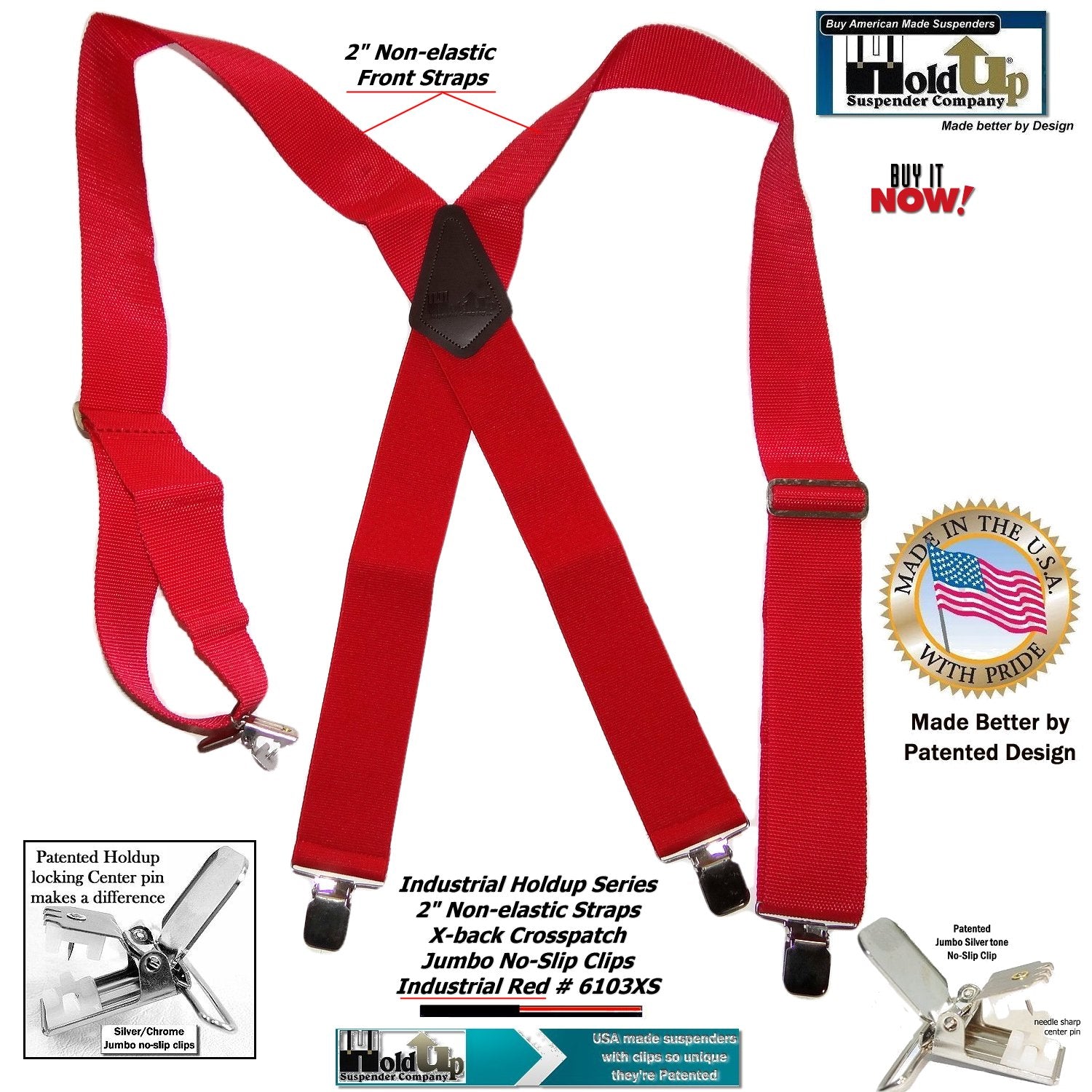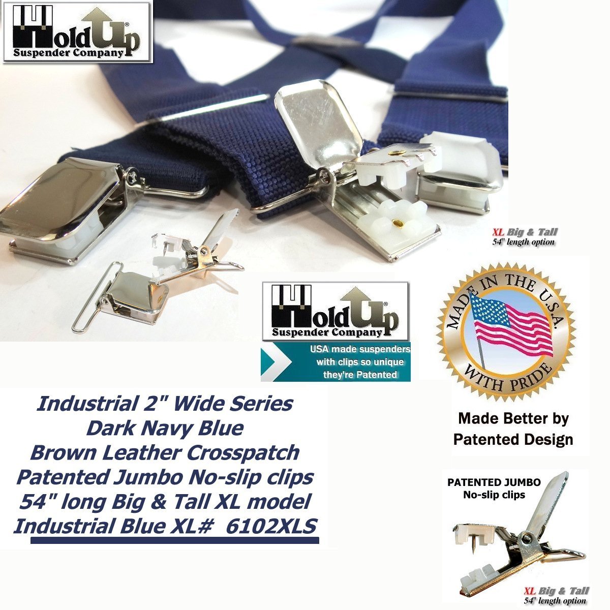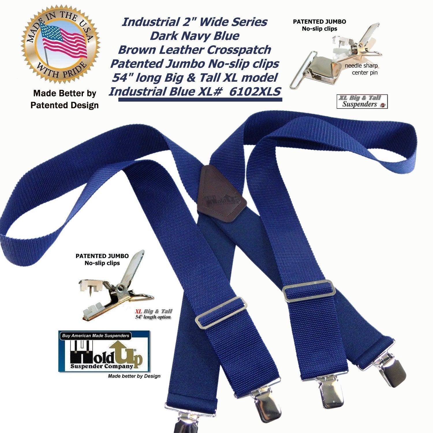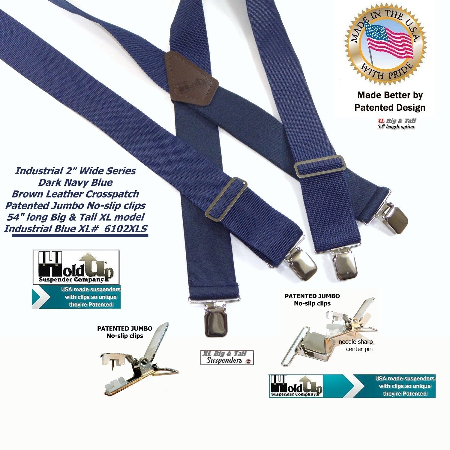 Industrial Series Holdup work suspenders in 3 solid colors with 2" wide NON -elastic front straps, X-back top gain brown leather patch & the USA patented JUMBO No-Slip SUSPENDER CLIP. Designed to last a limited of daily wear in total comfort. The rear of the Industrial work suspenders, below the Brown Leather crosspatch with embossed Holdup logo, is 2' wide elastic fabric in a matching red, black or blue color to allow comfort flexing and we have XL 54" length models for $3.00 more.