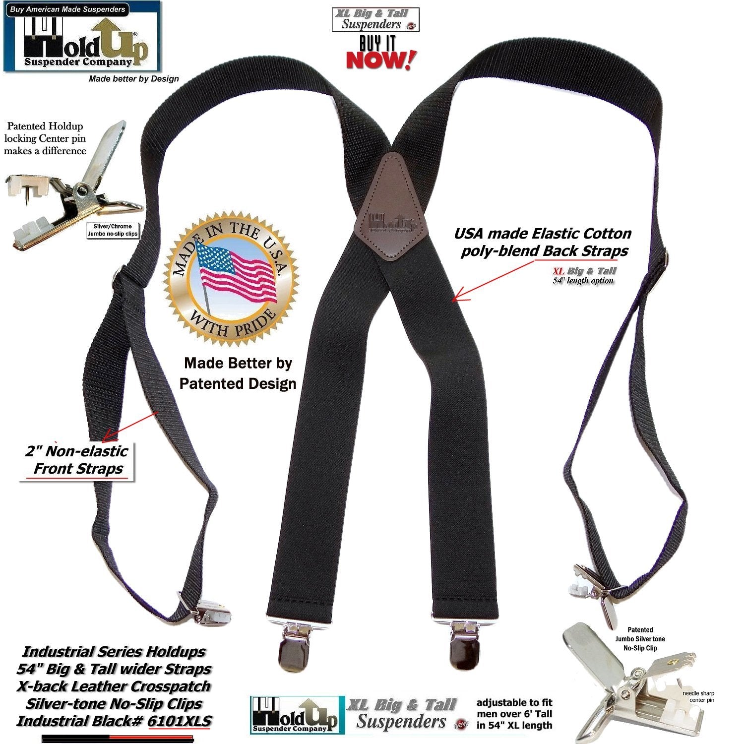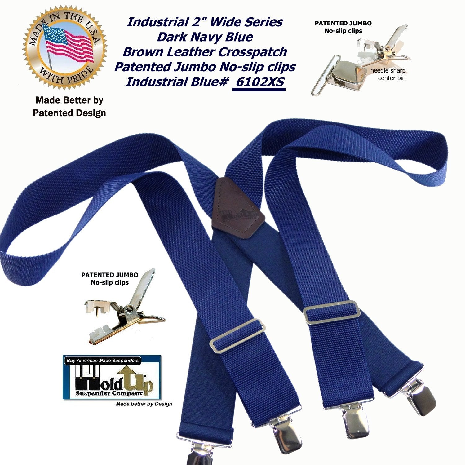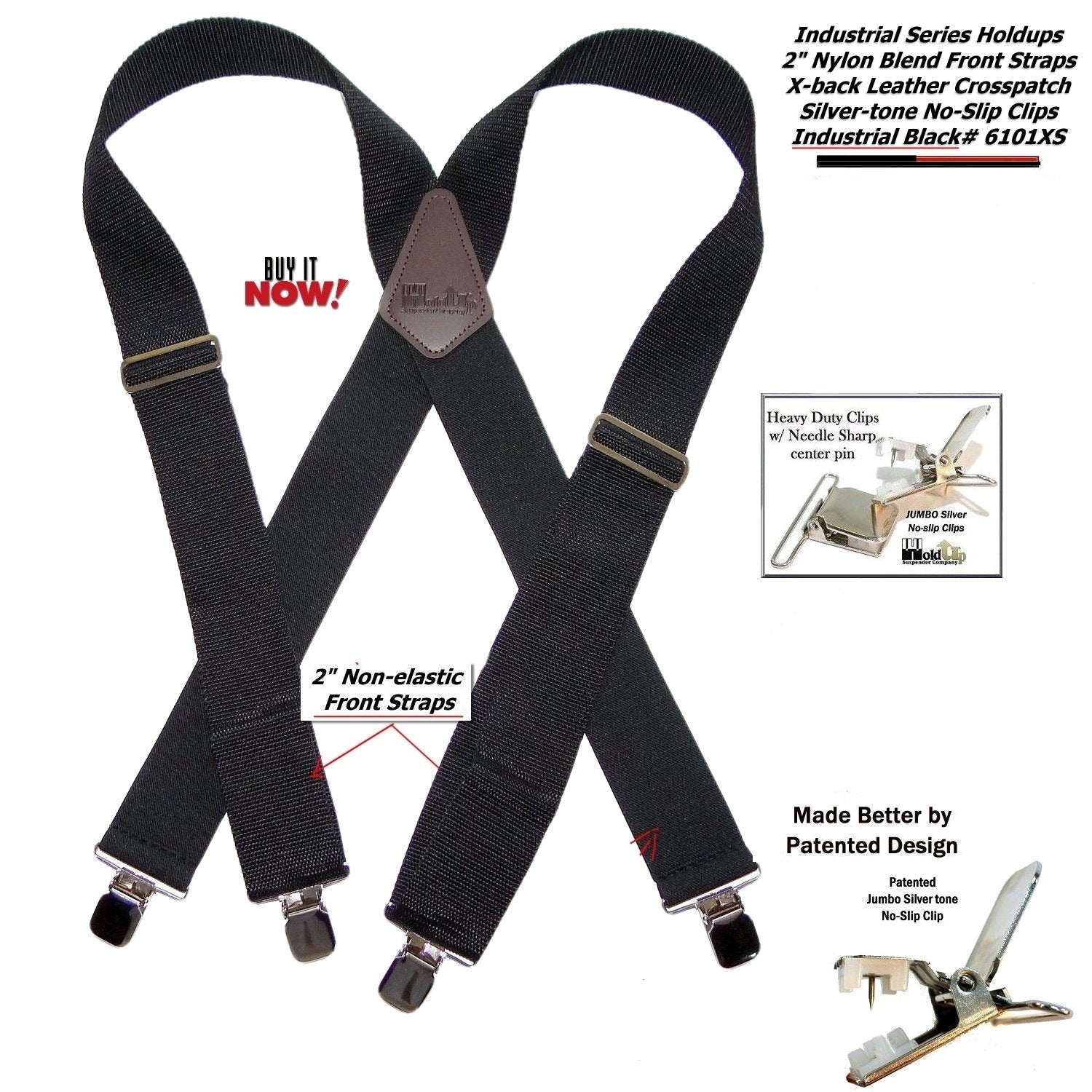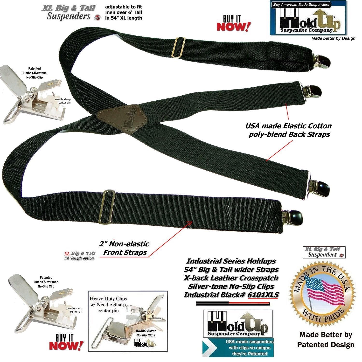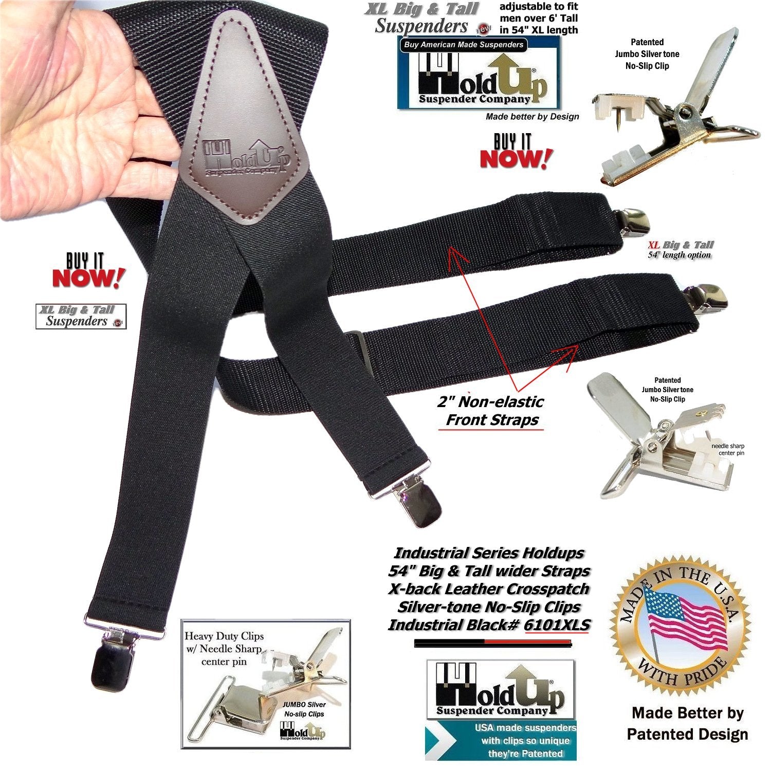 Industrial Series Holdup work suspenders in 3 solid colors with 2" wide NON -elastic front straps, X-back top gain brown leather patch & the USA patented JUMBO No-Slip SUSPENDER CLIP. Designed to last a limited of daily wear in total comfort. The rear of the Industrial work suspenders, below the Brown Leather crosspatch with embossed Holdup logo, is 2' wide elastic fabric in a matching red, black or blue color to allow comfort flexing and we have XL 54" length models for $3.00 more.