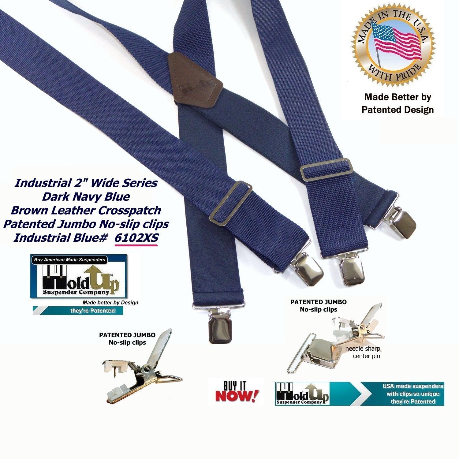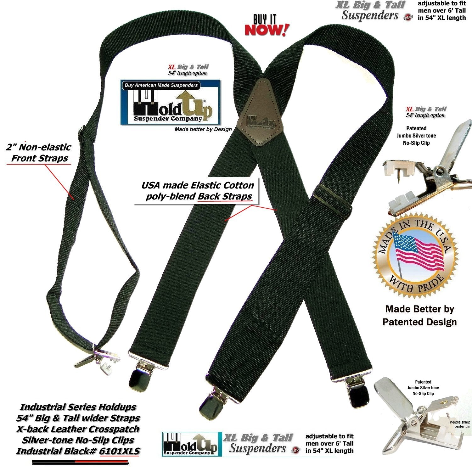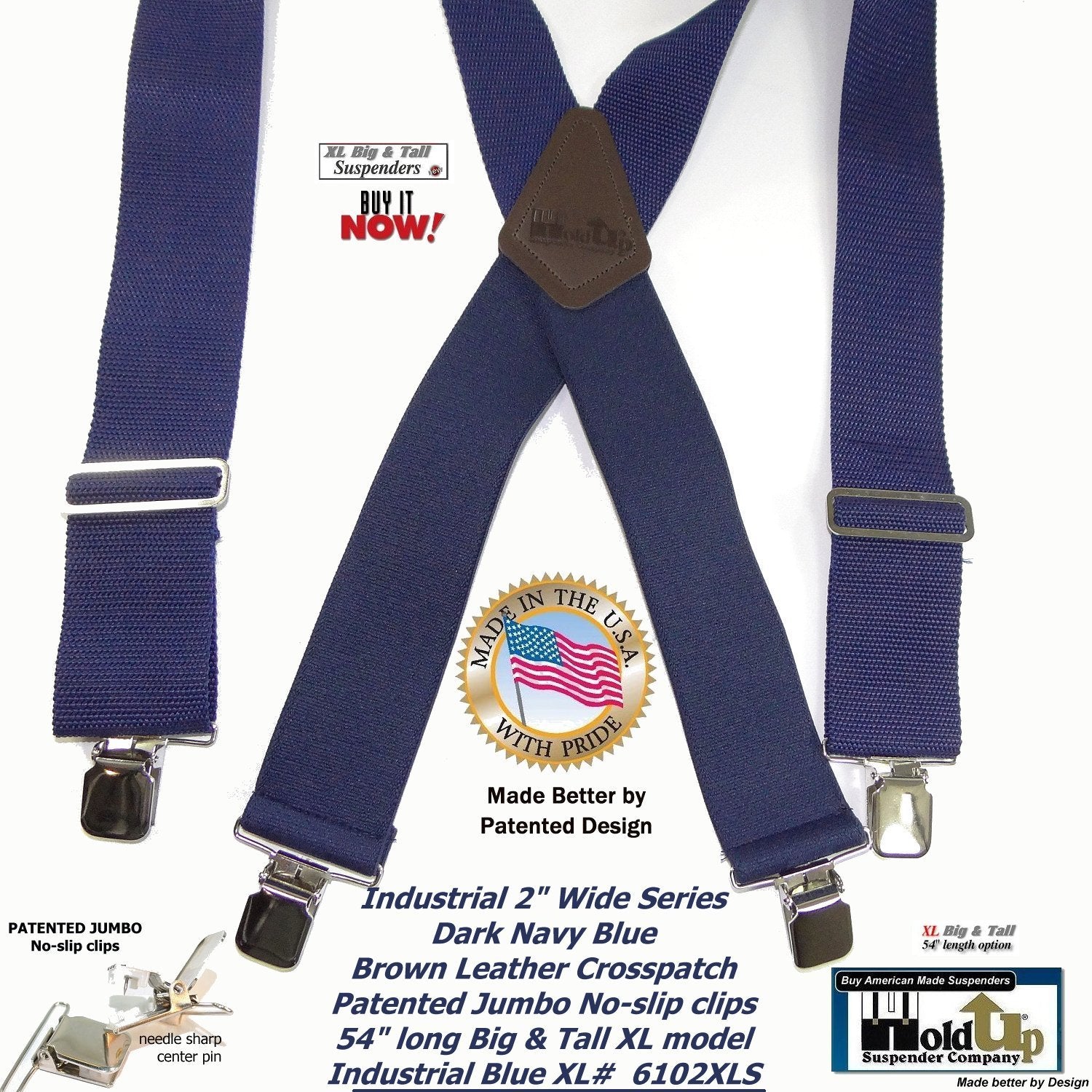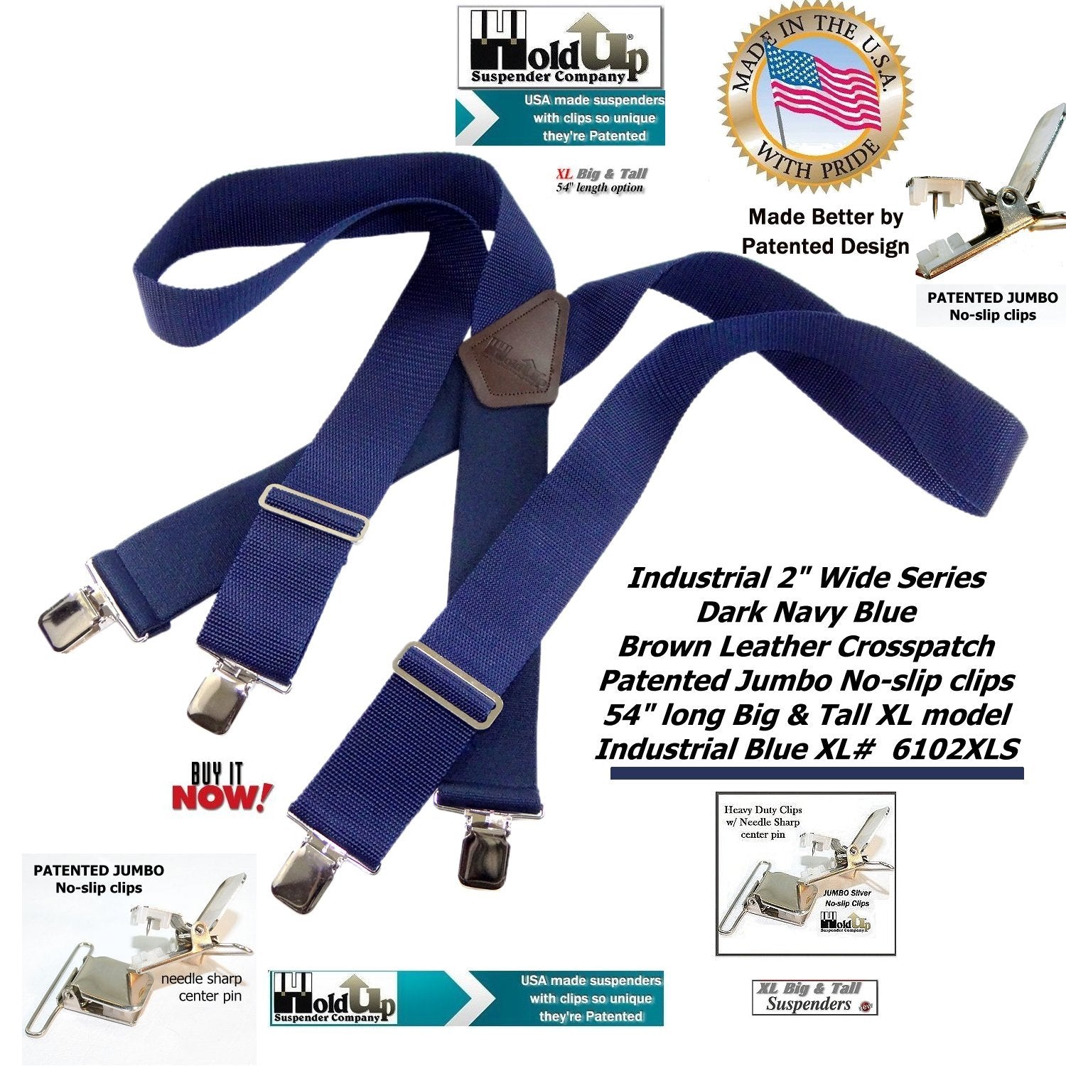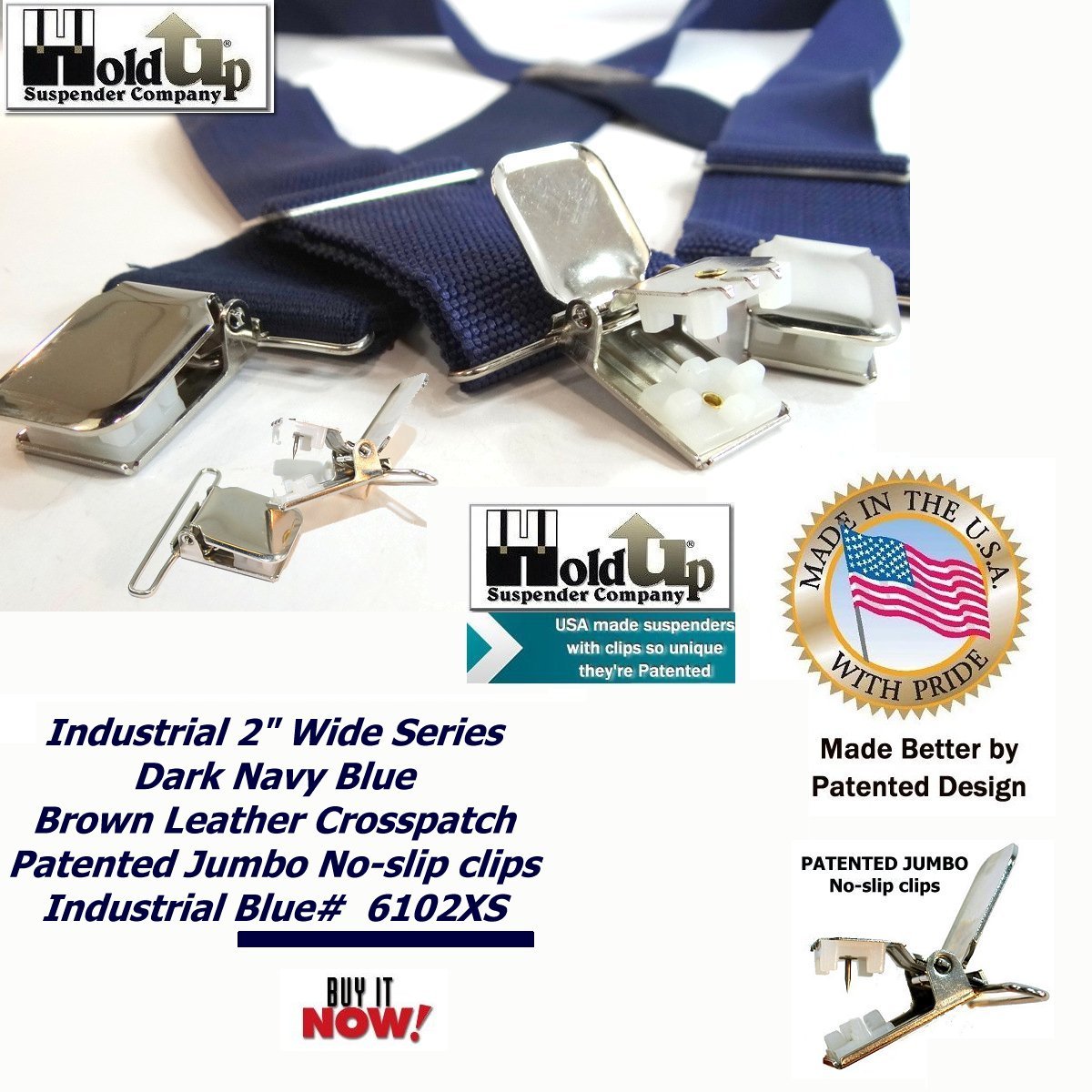 Industrial Series Holdup work suspenders in 3 solid colors with 2" wide NON -elastic front straps, X-back top gain brown leather patch & the USA patented JUMBO No-Slip SUSPENDER CLIP. Designed to last a limited of daily wear in total comfort. The rear of the Industrial work suspenders, below the Brown Leather crosspatch with embossed Holdup logo, is 2' wide elastic fabric in a matching red, black or blue color to allow comfort flexing and we have XL 54" length models for $3.00 more.