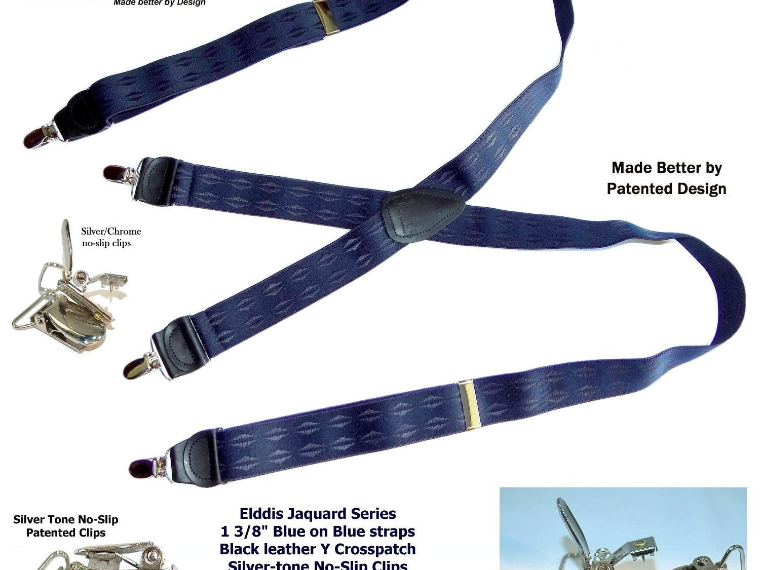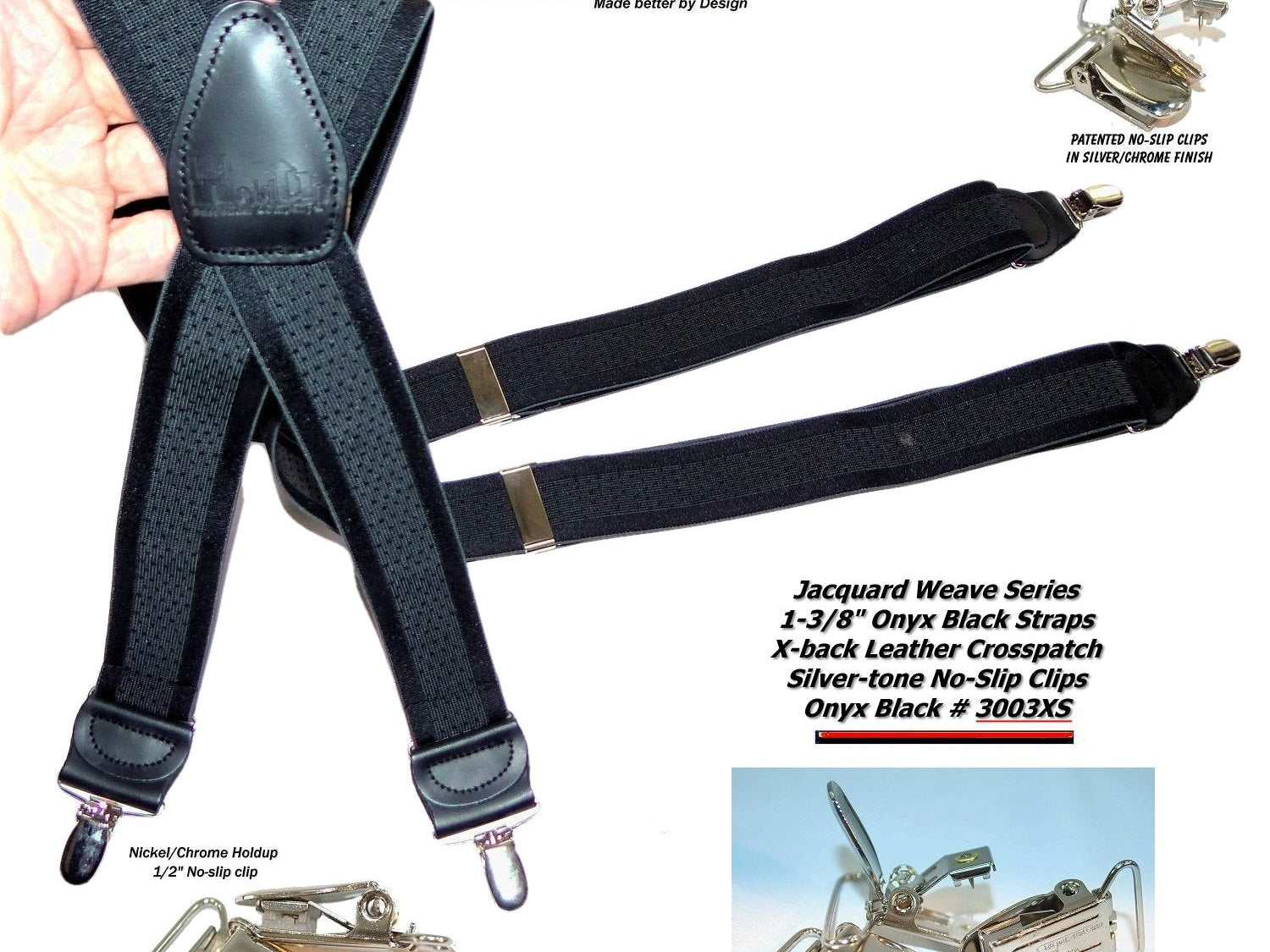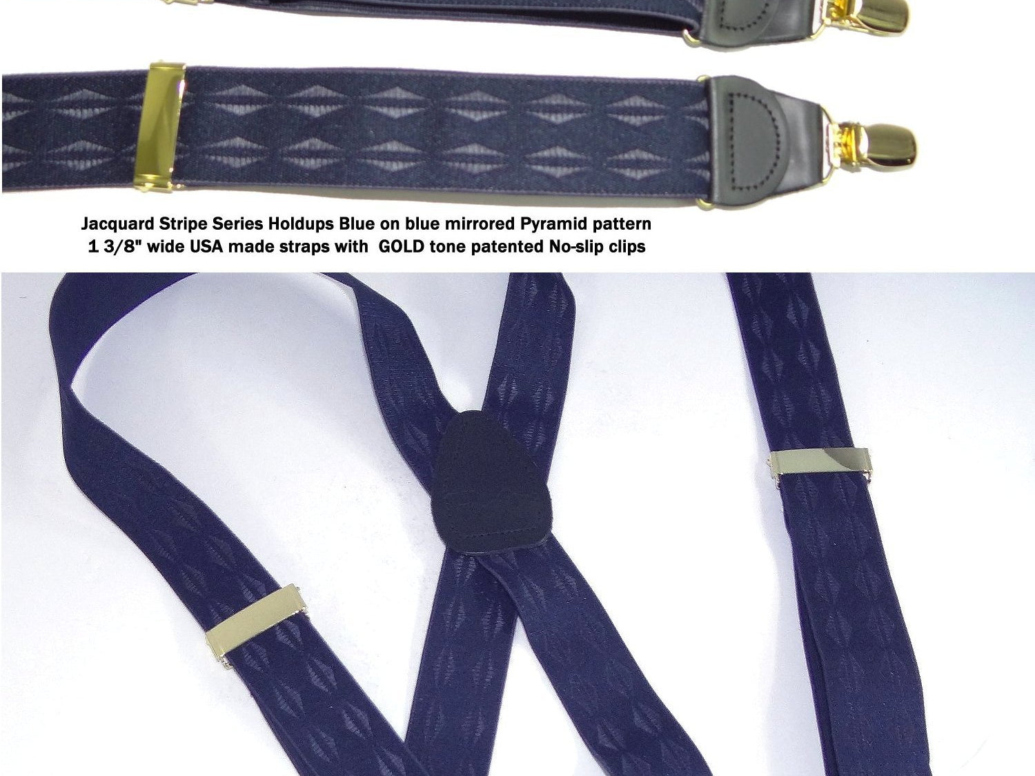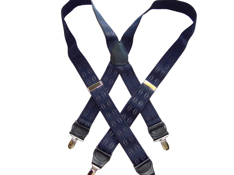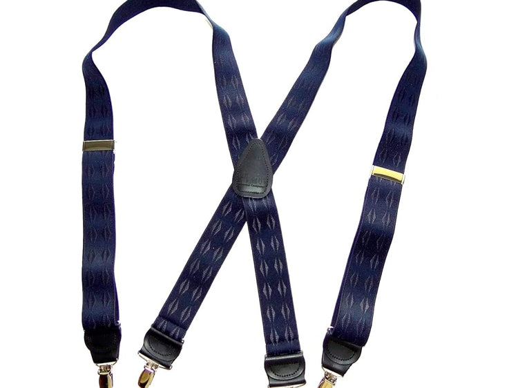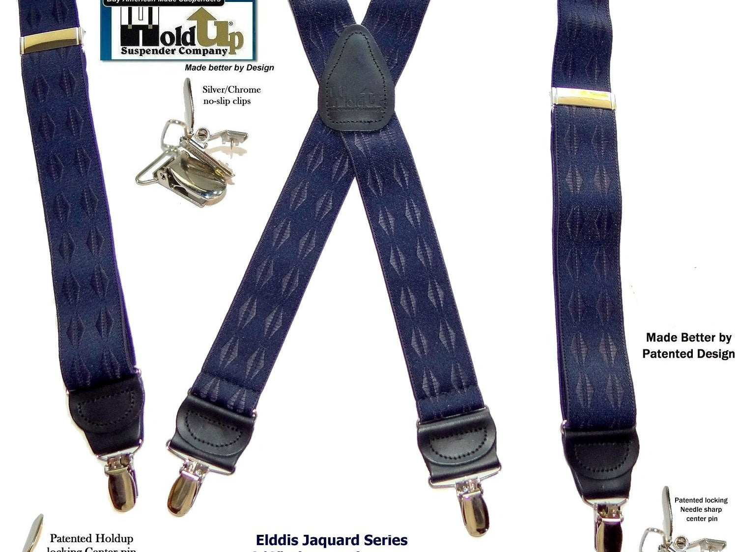 Exclusive Jacquard Color on complimentary color elastic fabric jacquard weaves set these Holdup brand suspenders apart from other cheaper made China imports!  Many models of Designer Series Holdups are discounted 50% while supply lasts.