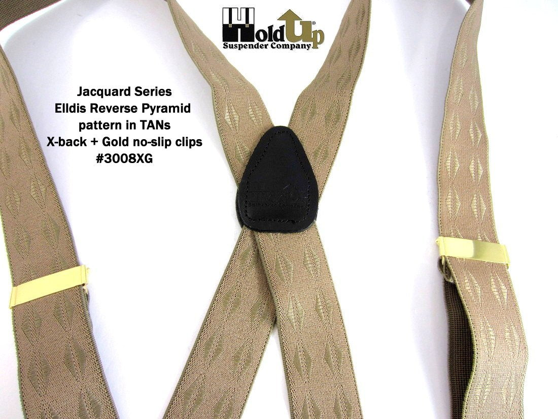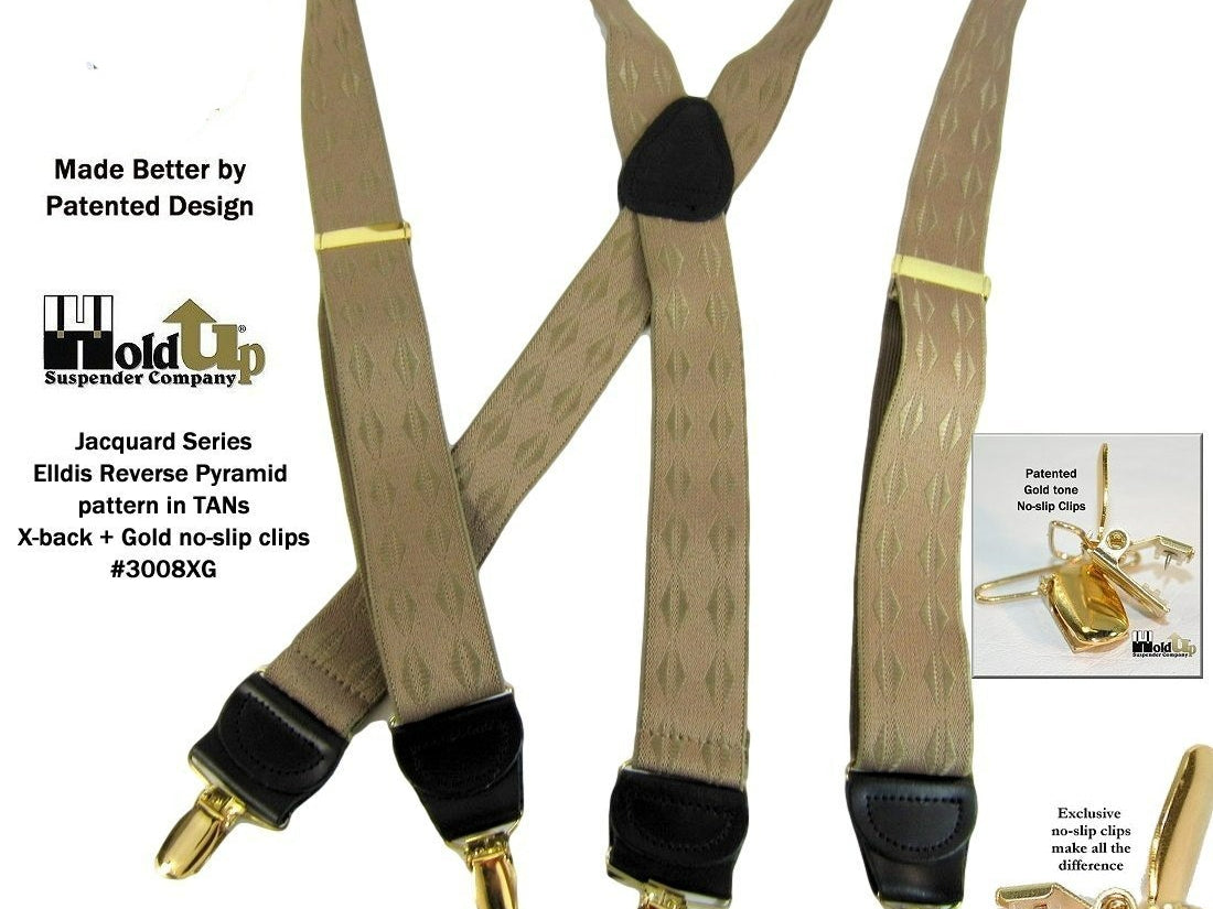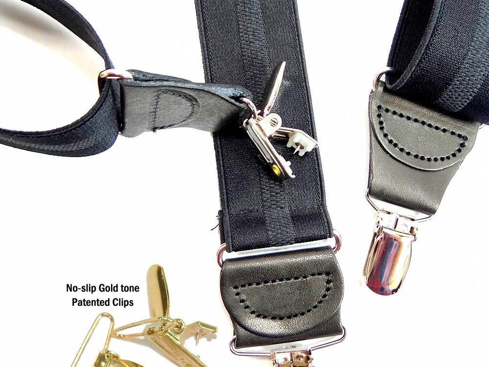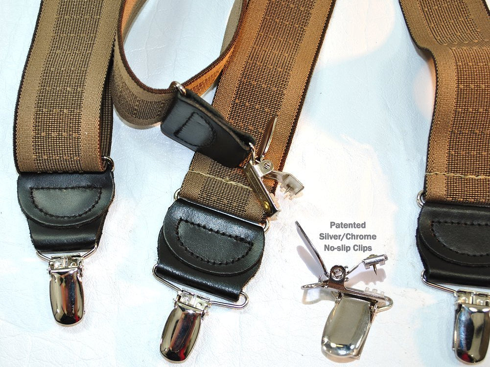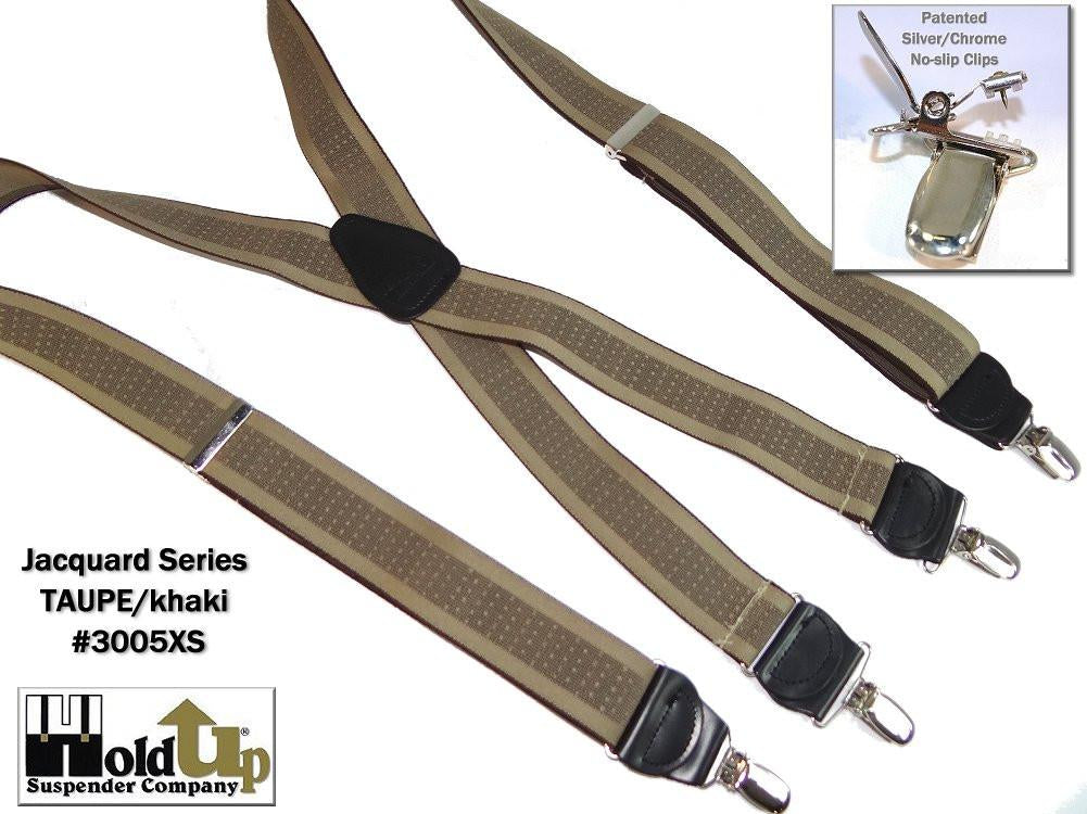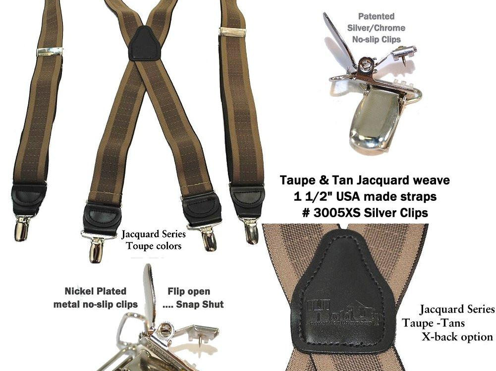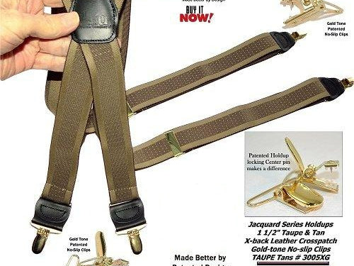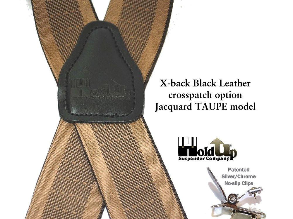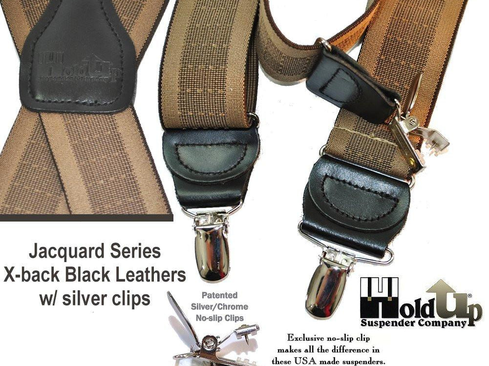 Holdup Suspender Company introduces a Jacquard Series clip-on suspenders with customer choices of Y-back or X-back crosspatch styles, or Gold or silver no-slip clip metallic finishes. These solid complementary tone on tone colorful jacquard weave suspenders. Black leather tapered no-slip clip holders and crosspatch embossed with Holdup logo make these a great choice for a tasteful office and party suspender. Choose from blended Cordovan Burgundy colors, Taupe and light tans to a Onyx black on black jacquard weave pattern. Click on color choices sold here. Now on sale here and you can purchase using your PayPal or Amazon account or Debit card and get free Freight offer at checkout.