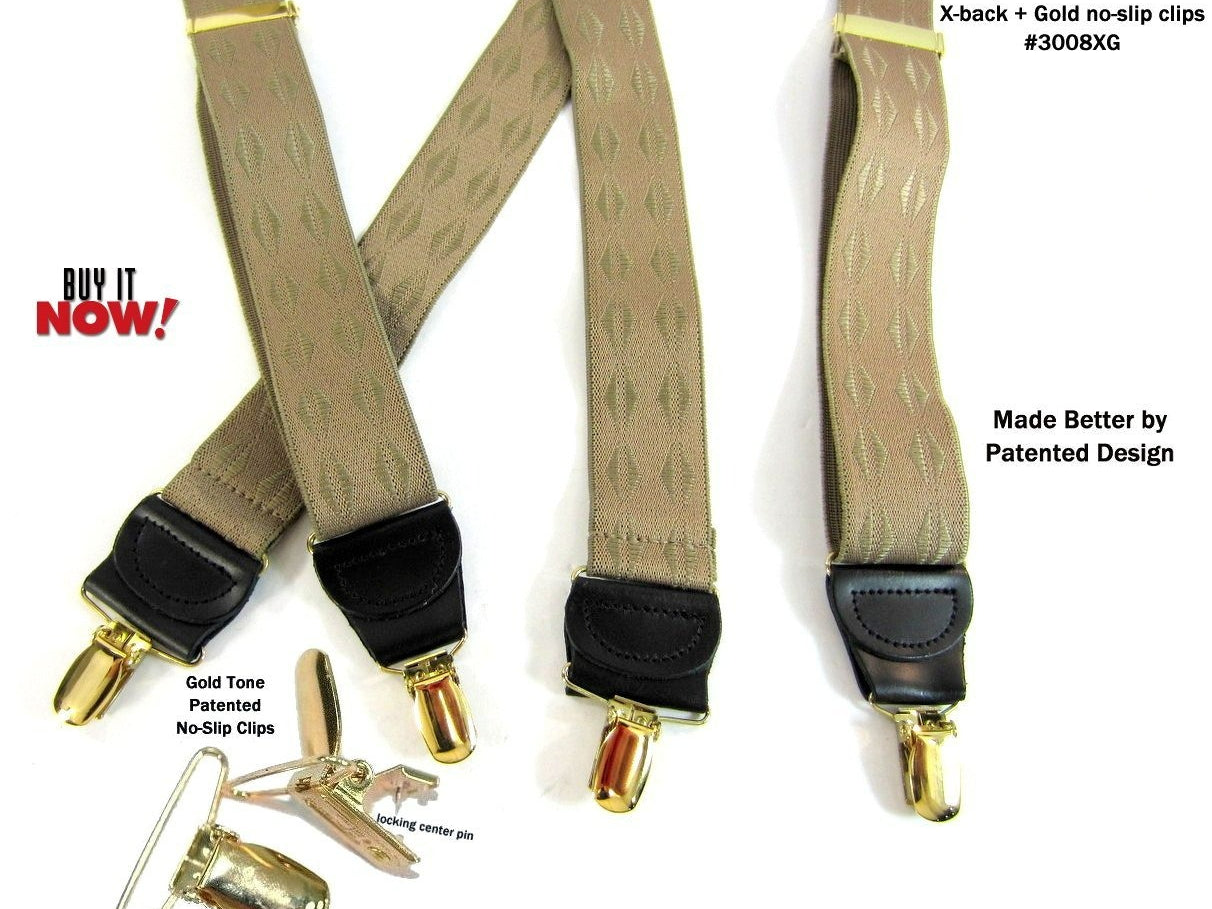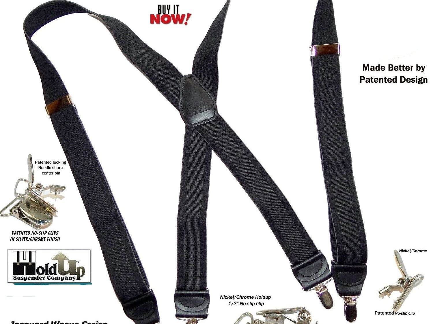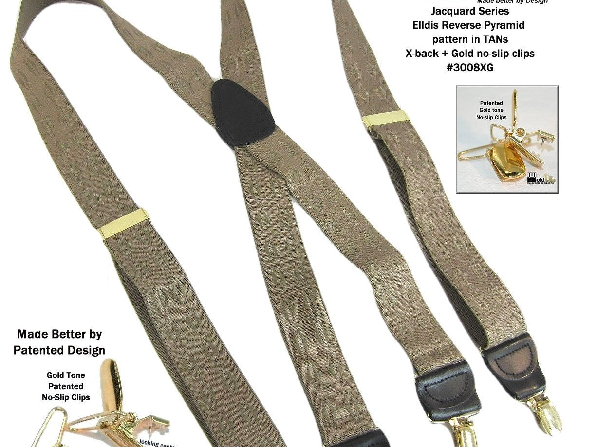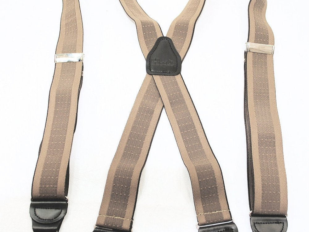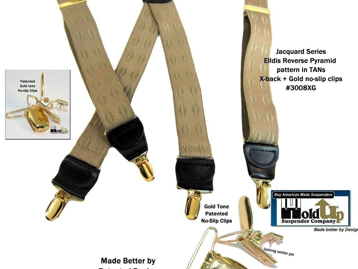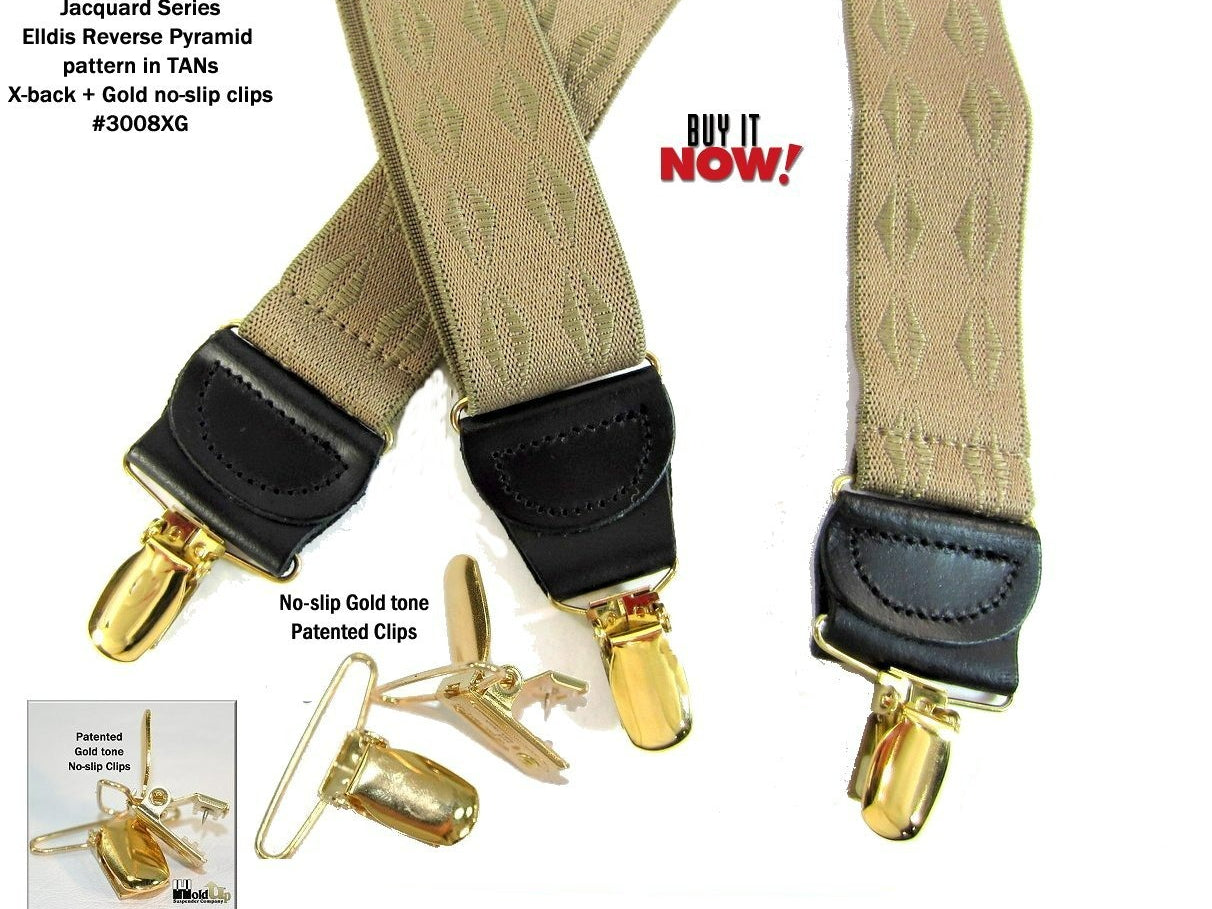 Holdup Suspender Company introduces a Jacquard Series clip-on suspenders with customer choices of Y-back or X-back crosspatch styles, or Gold or silver no-slip clip metallic finishes. These solid complementary tone on tone colorful jacquard weave suspenders. Black leather tapered no-slip clip holders and crosspatch embossed with Holdup logo make these a great choice for a tasteful office and party suspender. Choose from blended Cordovan Burgundy colors, Taupe and light tans to a Onyx black on black jacquard weave pattern. Click on color choices sold here. Now on sale here and you can purchase using your PayPal or Amazon account or Debit card and get free Freight offer at checkout.