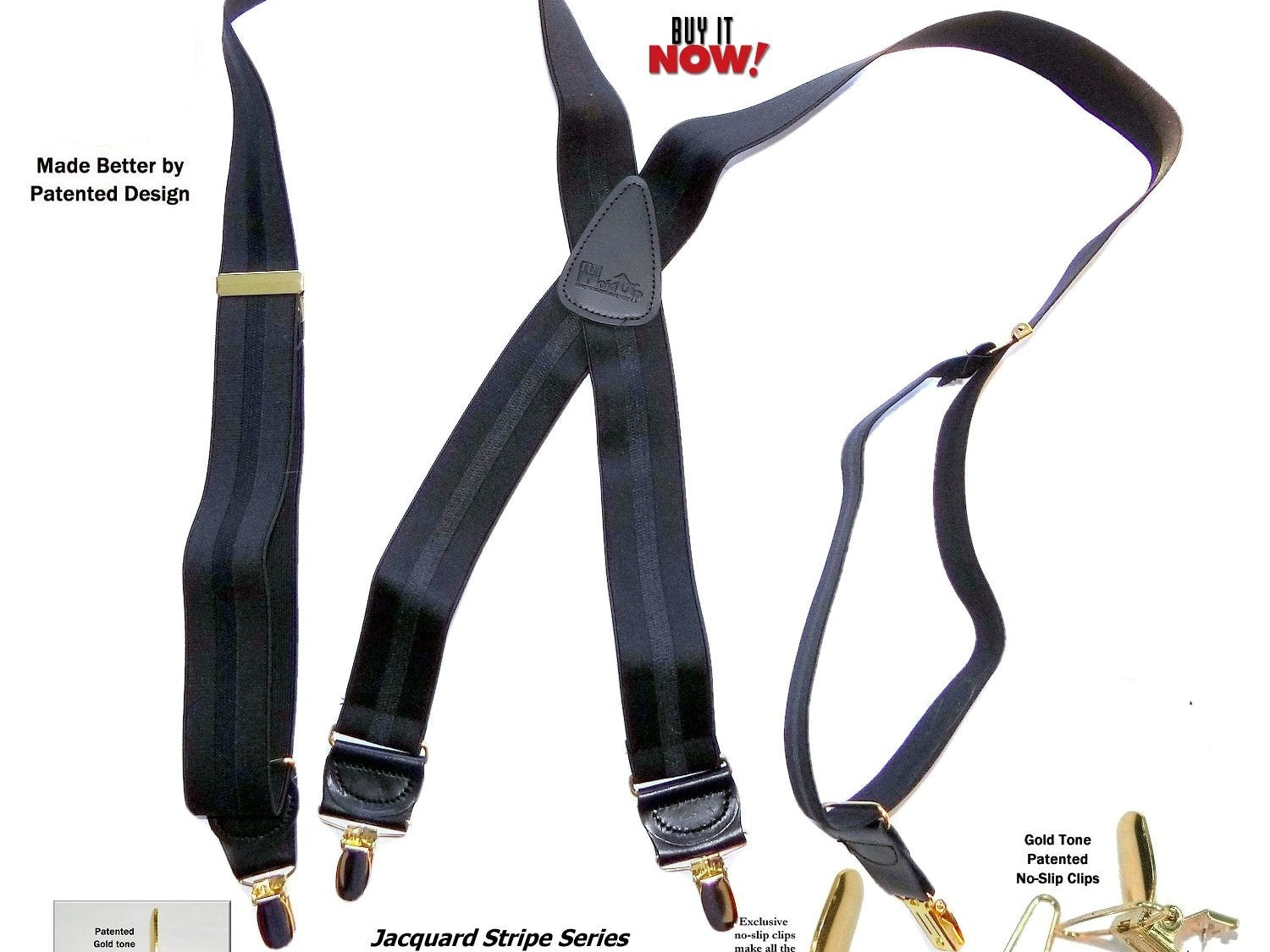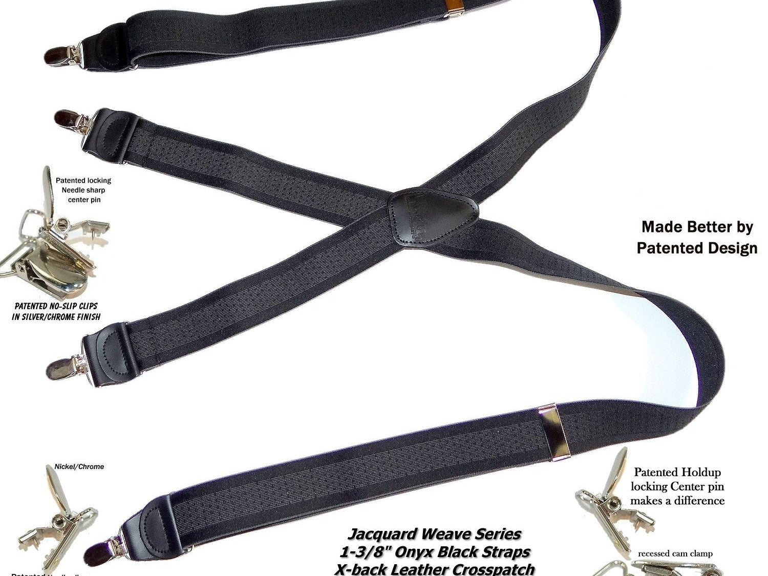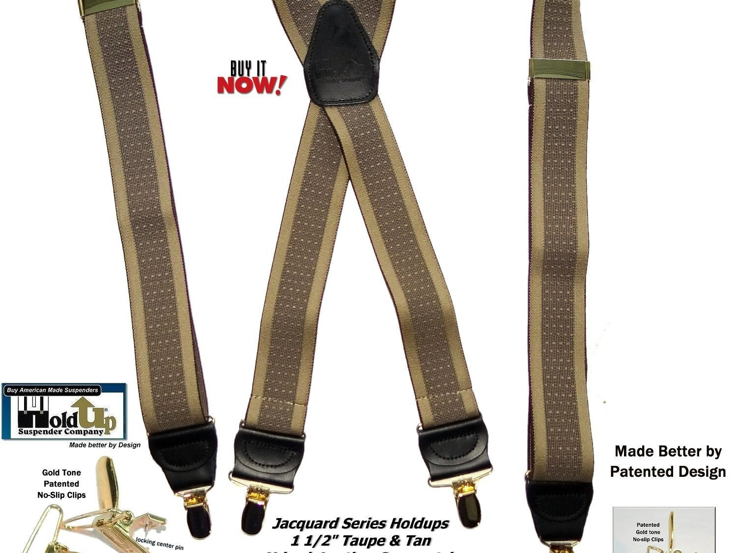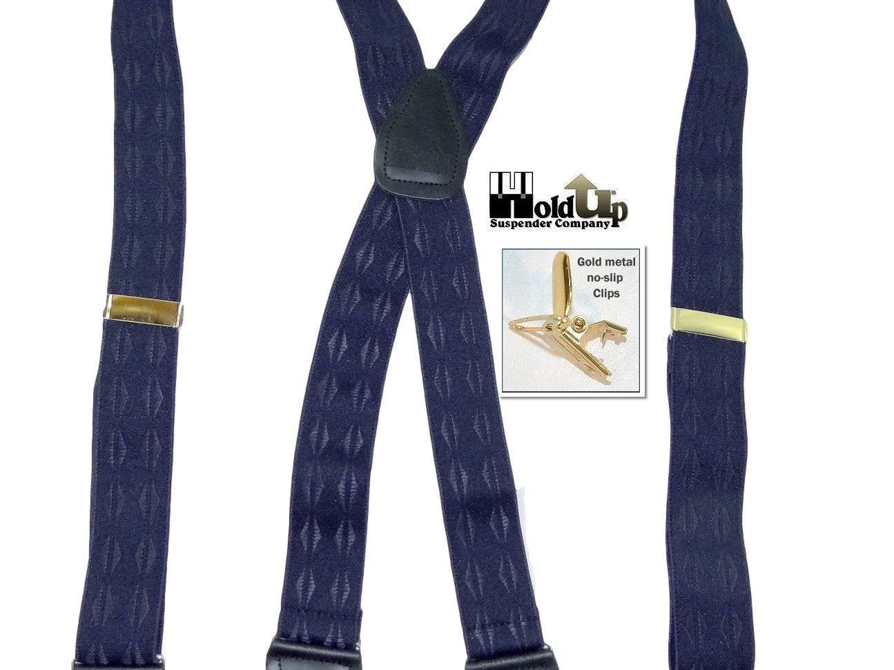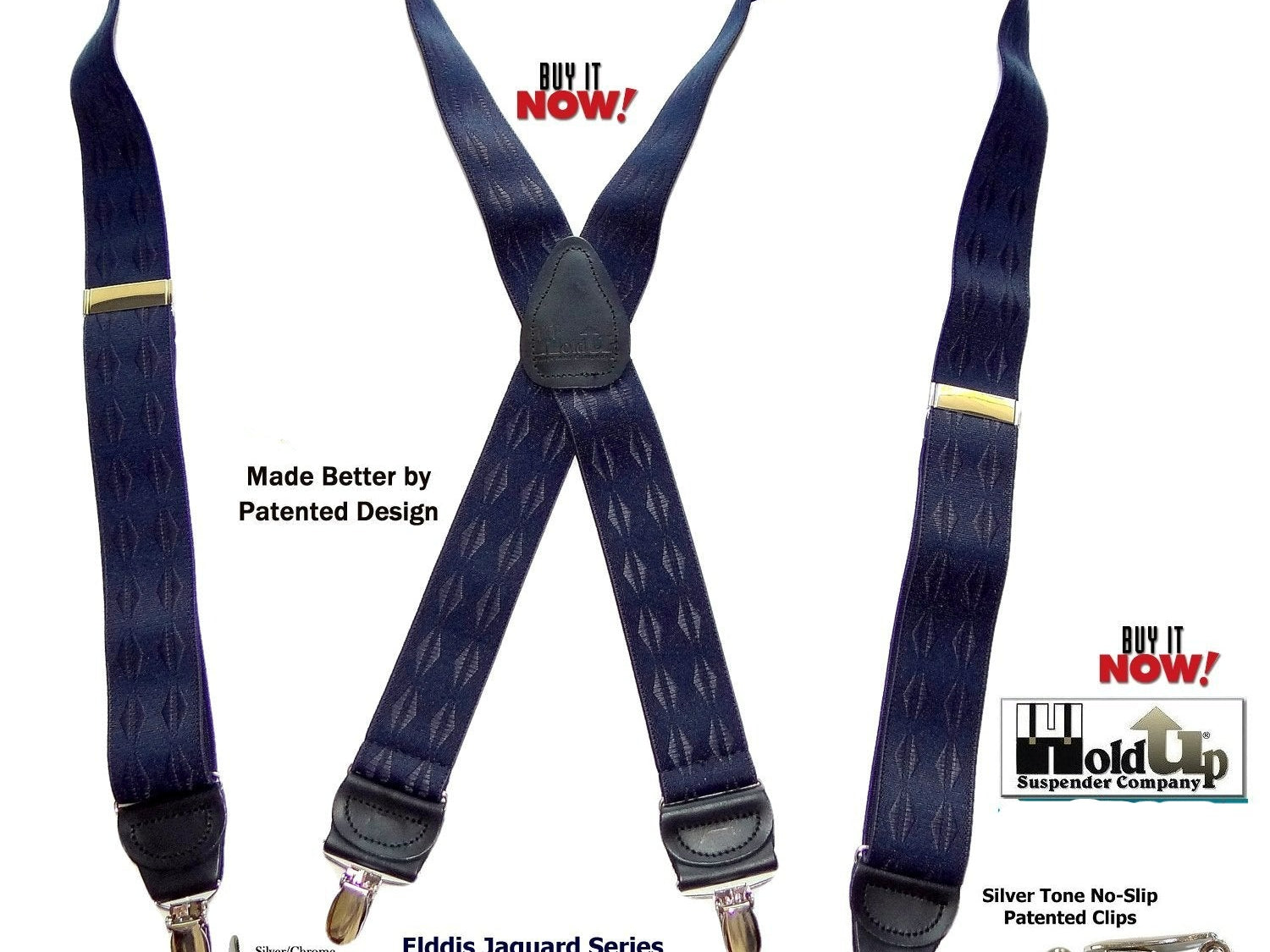 Holdup Suspender Company introduces a Jacquard Series clip-on suspenders with customer choices of Y-back or X-back crosspatch styles, or Gold or silver no-slip clip metallic finishes. These solid complementary tone on tone colorful jacquard weave suspenders. Black leather tapered no-slip clip holders and crosspatch embossed with Holdup logo make these a great choice for a tasteful office and party suspender. Choose from blended Cordovan Burgundy colors, Taupe and light tans to a Onyx black on black jacquard weave pattern. Click on color choices sold here. Now on sale here and you can purchase using your PayPal or Amazon account or Debit card and get free Freight offer at checkout.
