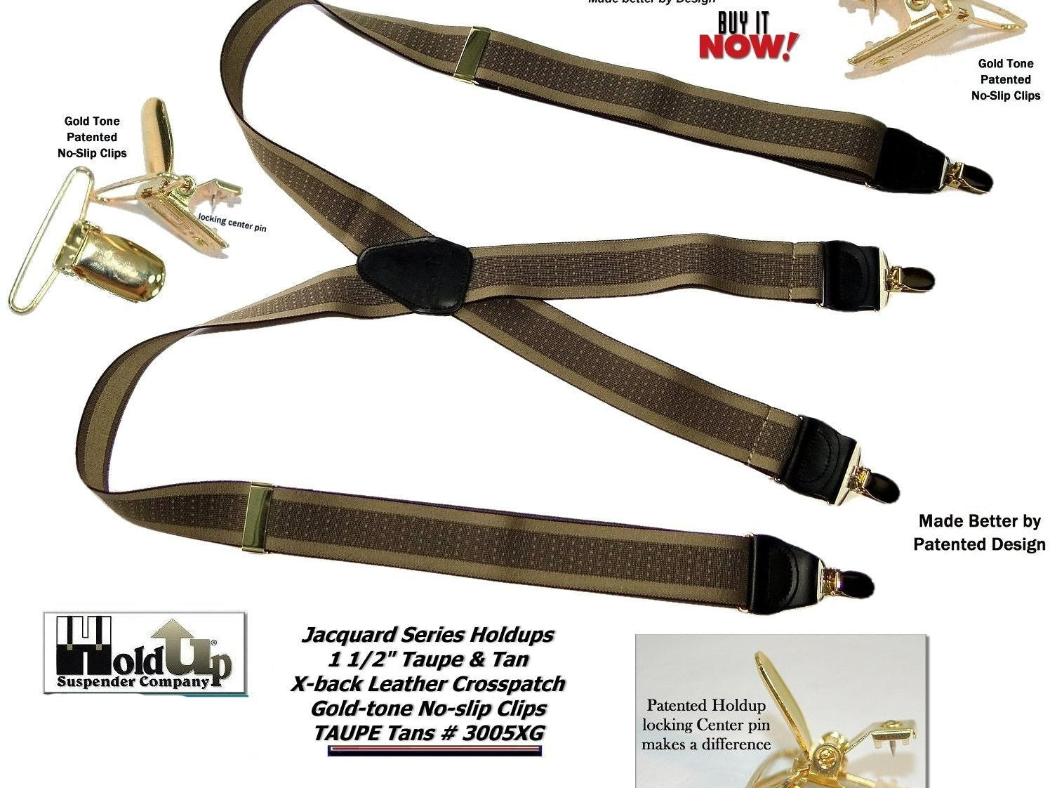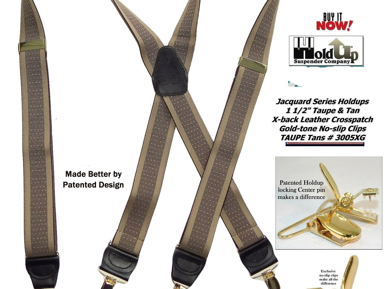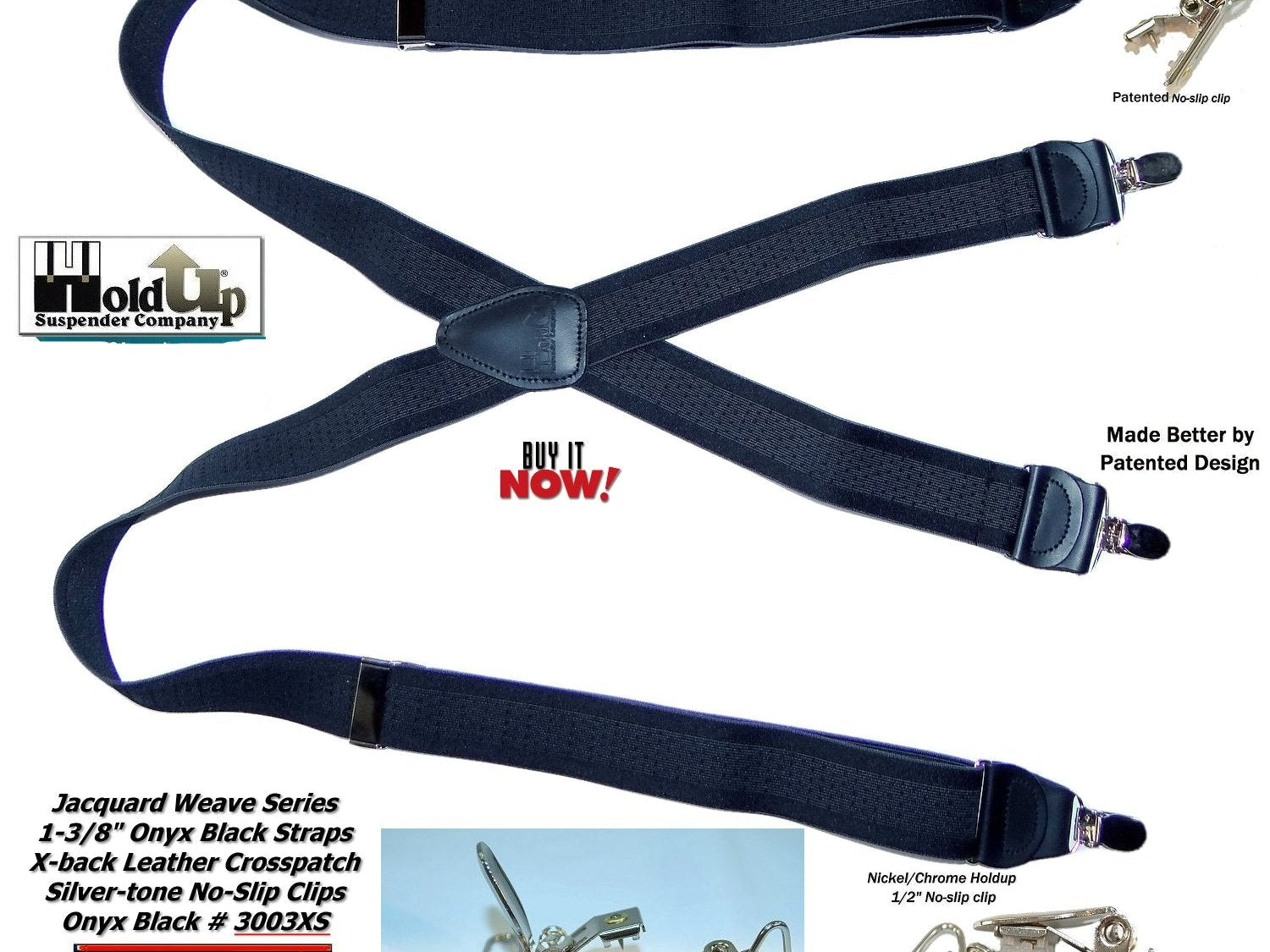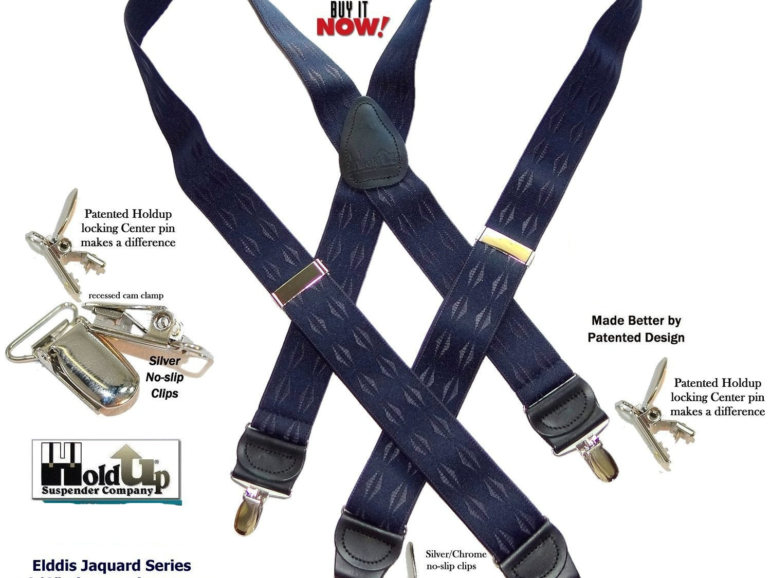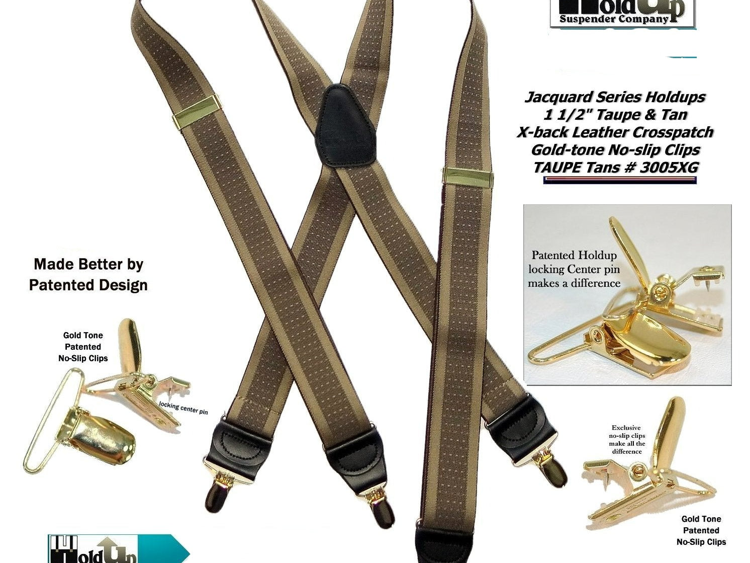 Holdup Suspender Company introduces a Jacquard Series clip-on suspenders with customer choices of Y-back or X-back crosspatch styles, or Gold or silver no-slip clip metallic finishes. These solid complementary tone on tone colorful jacquard weave suspenders. Black leather tapered no-slip clip holders and crosspatch embossed with Holdup logo make these a great choice for a tasteful office and party suspender. Choose from blended Cordovan Burgundy colors, Taupe and light tans to a Onyx black on black jacquard weave pattern. Click on color choices sold here. Now on sale here and you can purchase using your PayPal or Amazon account or Debit card and get free Freight offer at checkout.
