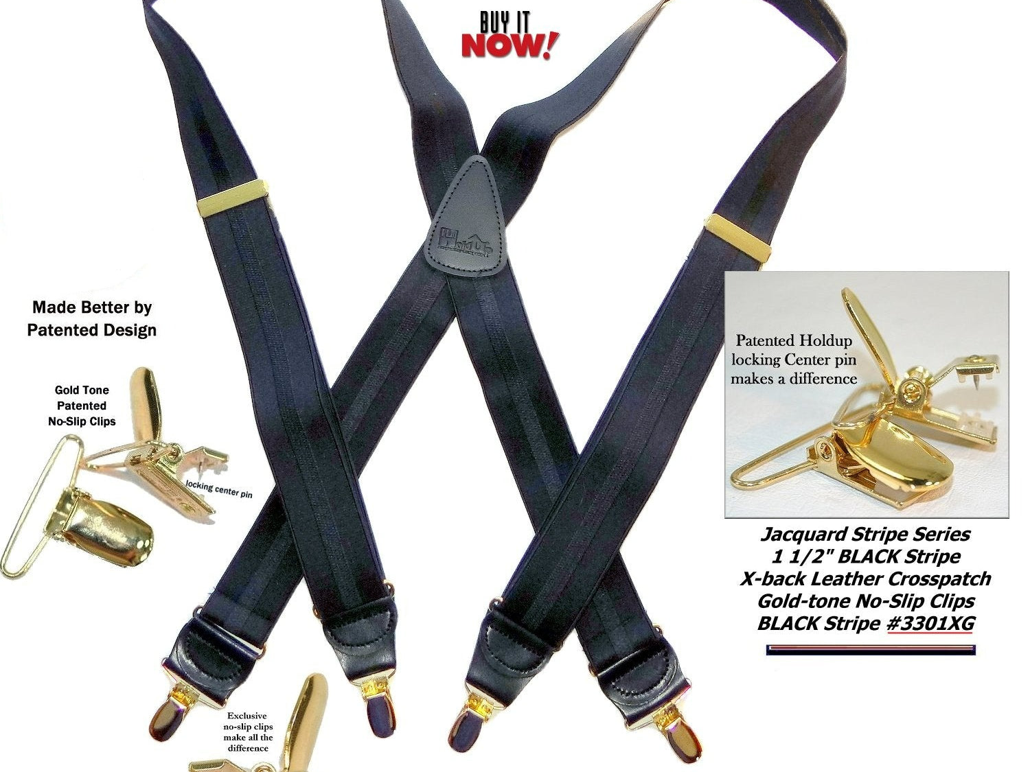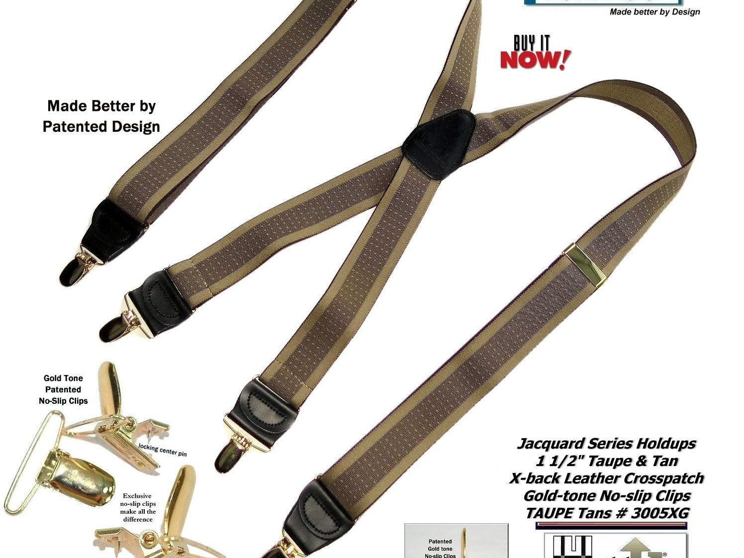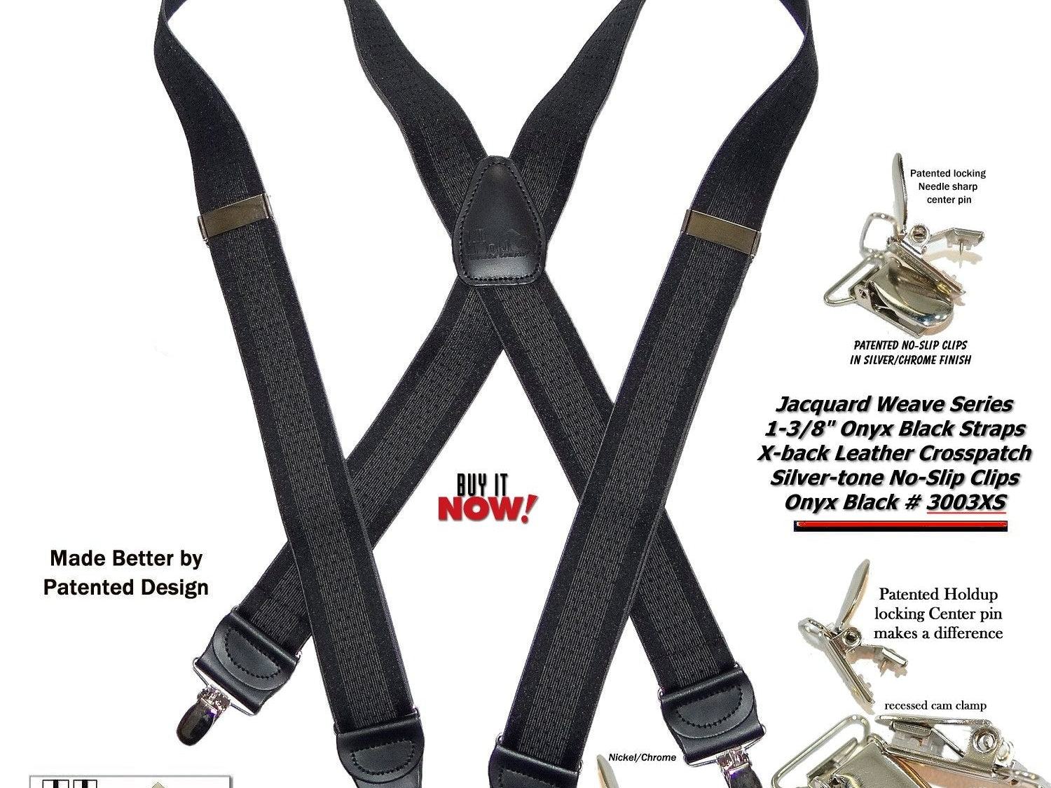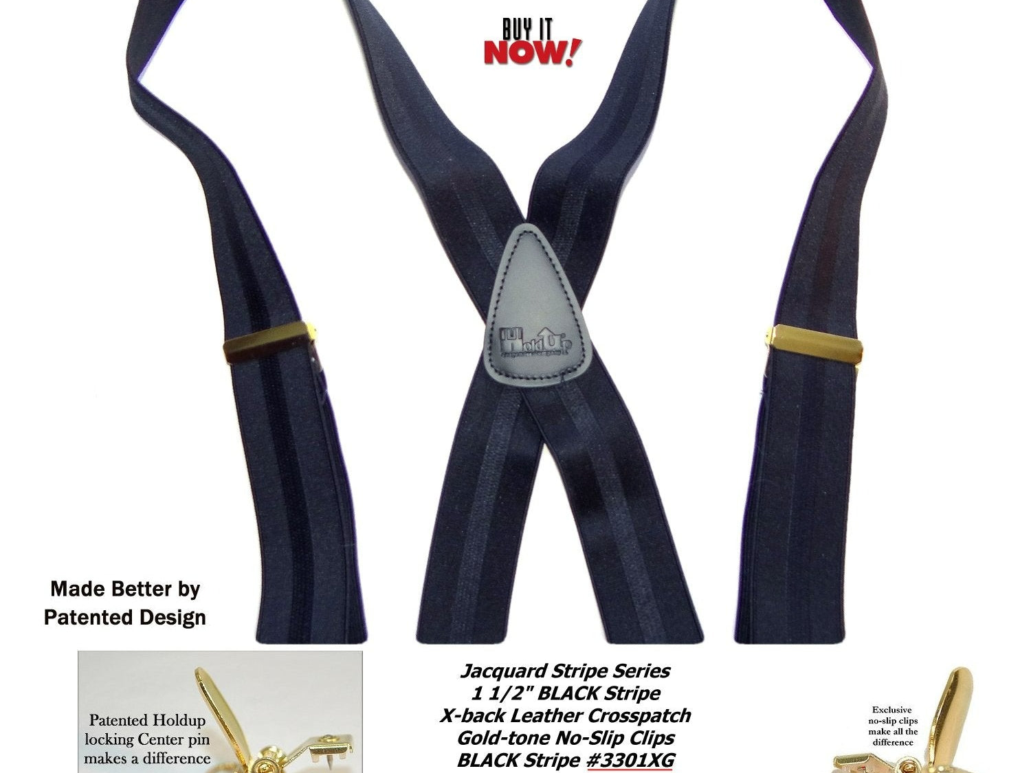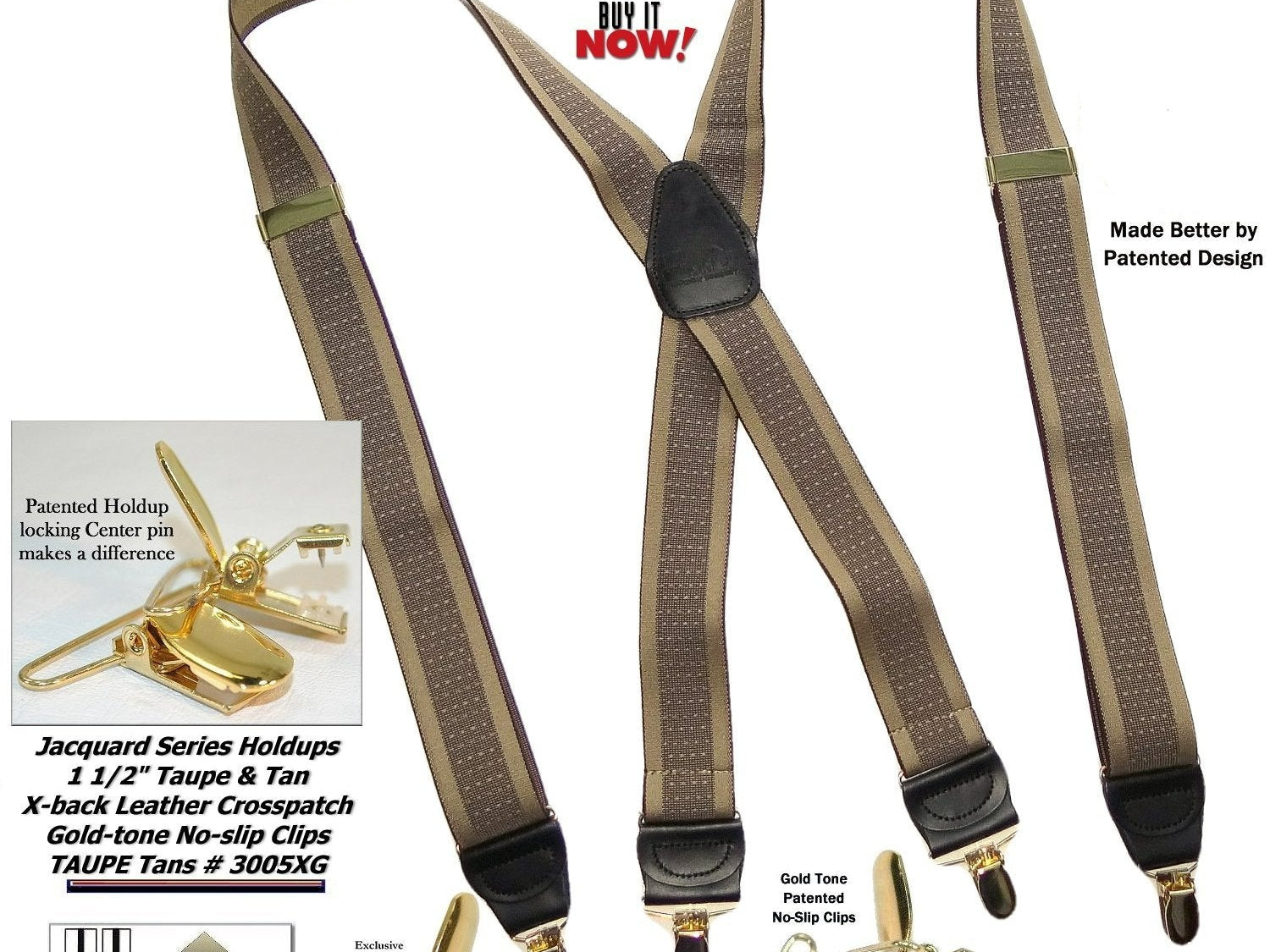 Holdup Suspender Company introduces a Jacquard Series clip-on suspenders with customer choices of Y-back or X-back crosspatch styles, or Gold or silver no-slip clip metallic finishes. These solid complementary tone on tone colorful jacquard weave suspenders. Black leather tapered no-slip clip holders and crosspatch embossed with Holdup logo make these a great choice for a tasteful office and party suspender. Choose from blended Cordovan Burgundy colors, Taupe and light tans to a Onyx black on black jacquard weave pattern. Click on color choices sold here. Now on sale here and you can purchase using your PayPal or Amazon account or Debit card and get free Freight offer at checkout.