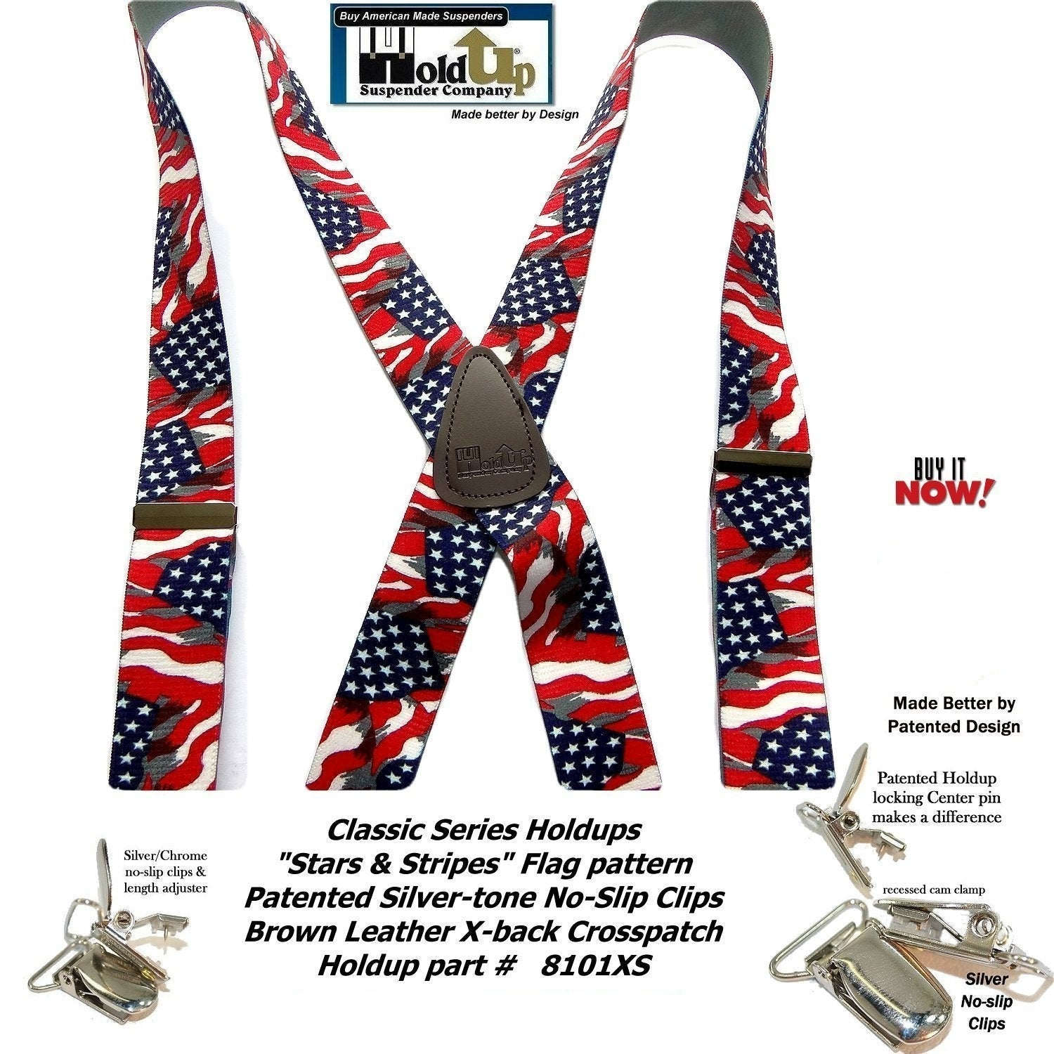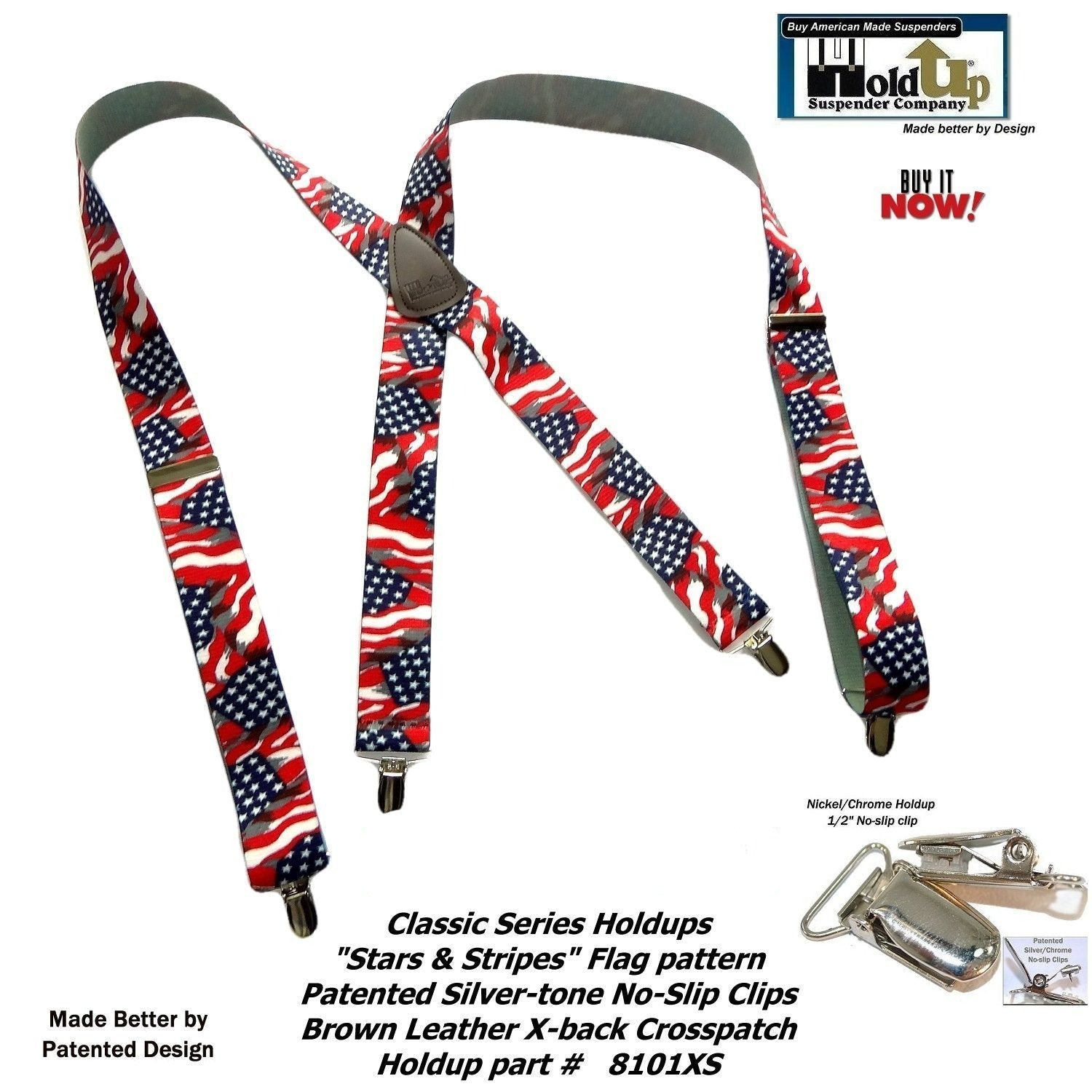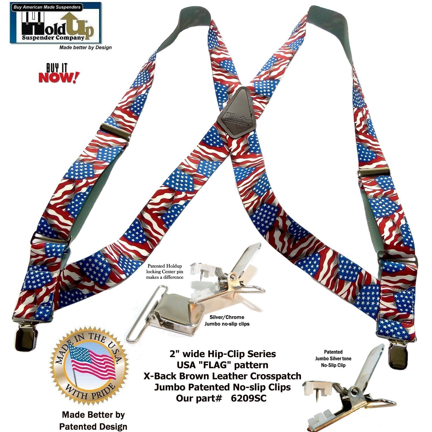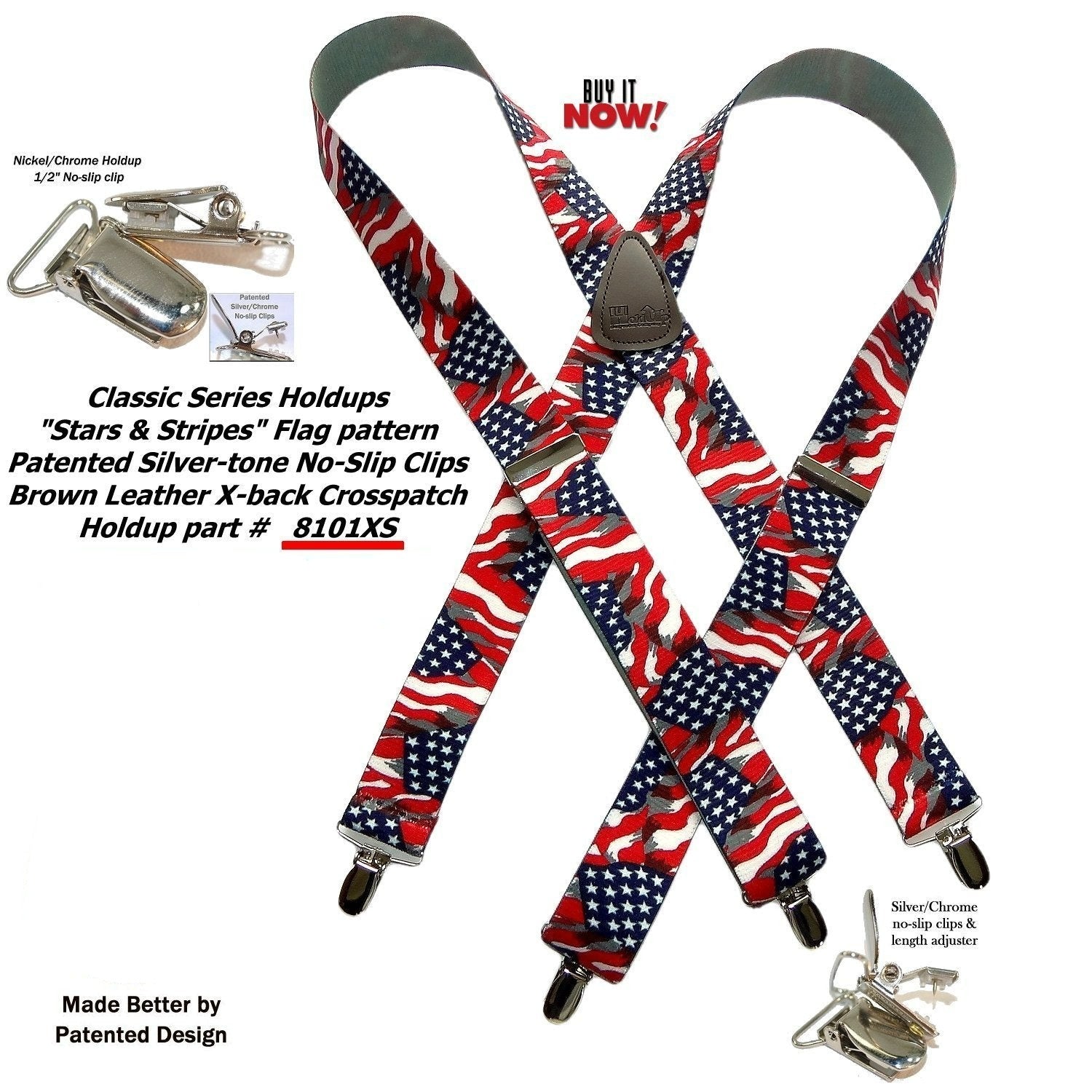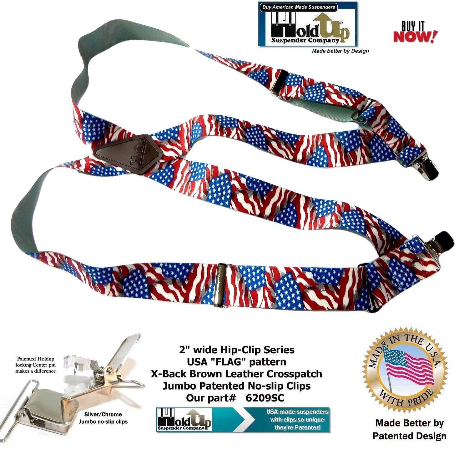 Multiple styles of Holdup clip-on suspenders with American Flag pattern in a variety of widths, styles and prices. "USA FLAG" pattern men's suspenders made better by patented and trademarked design in America.