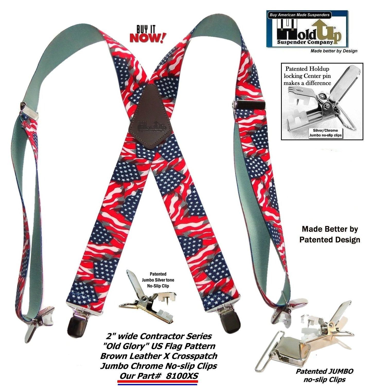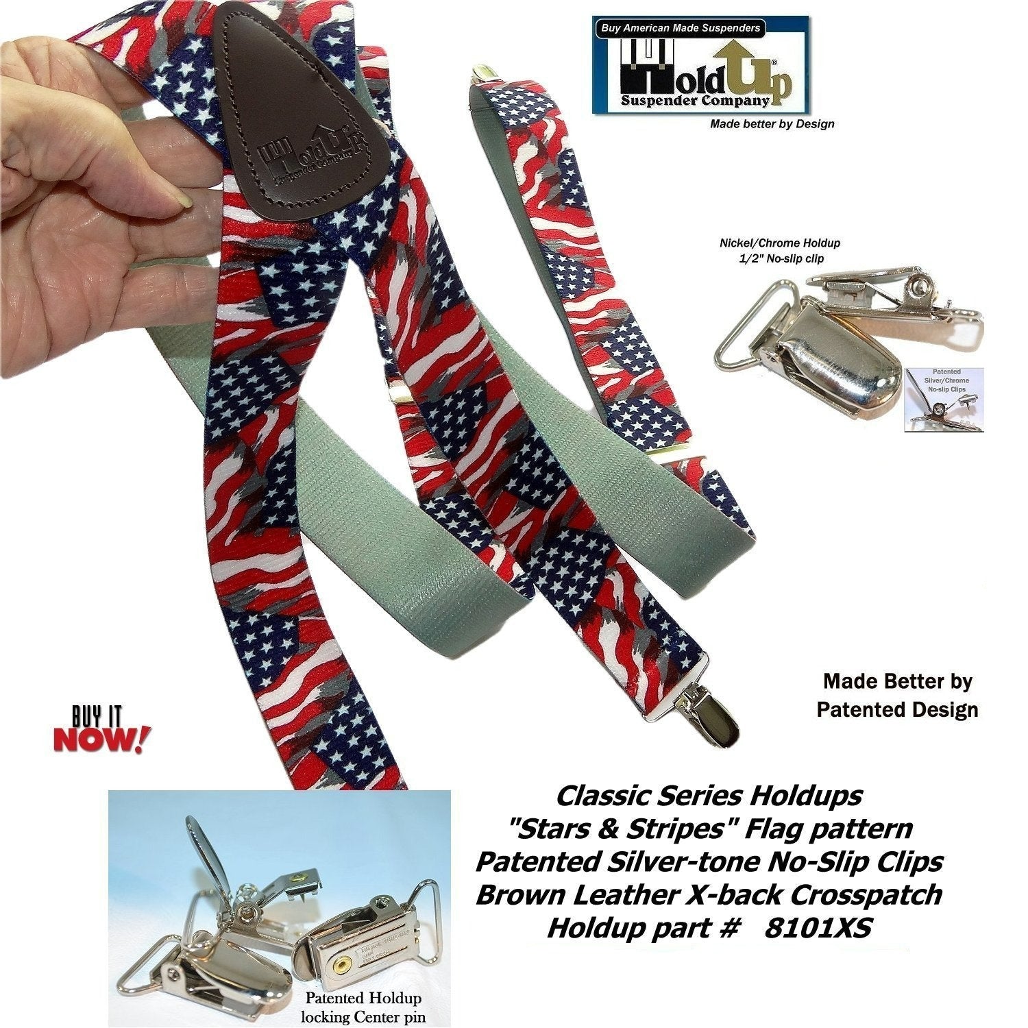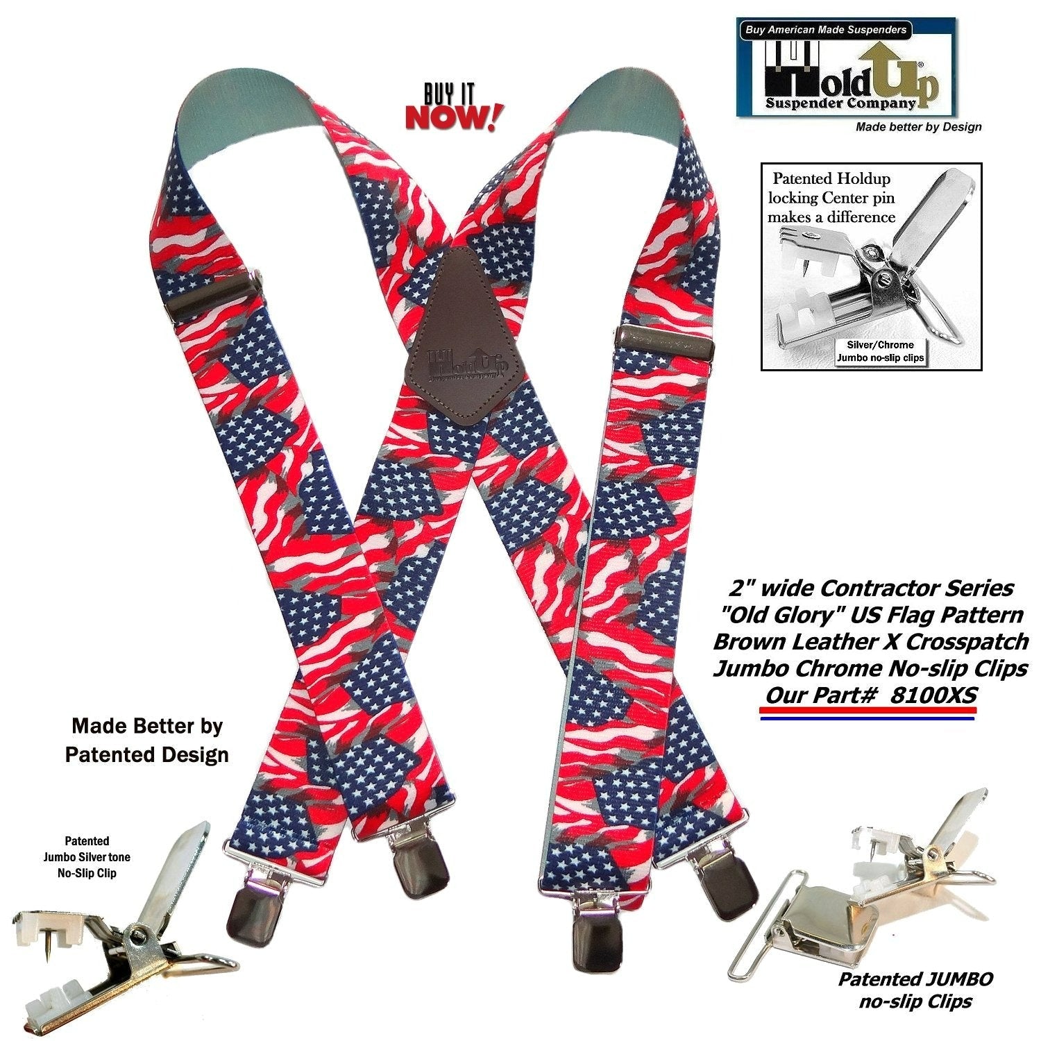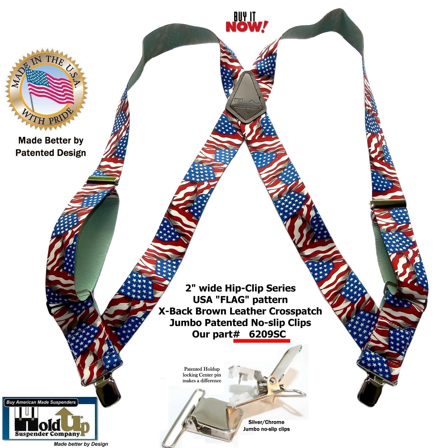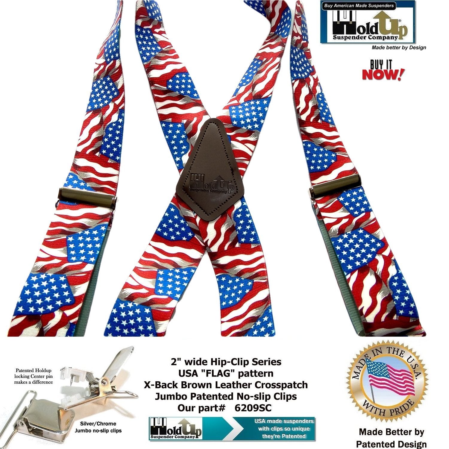Multiple styles of Holdup clip-on suspenders with American Flag pattern in a variety of widths, styles and prices. "USA FLAG" pattern men's suspenders made better by patented and trademarked design in America.