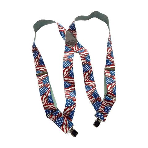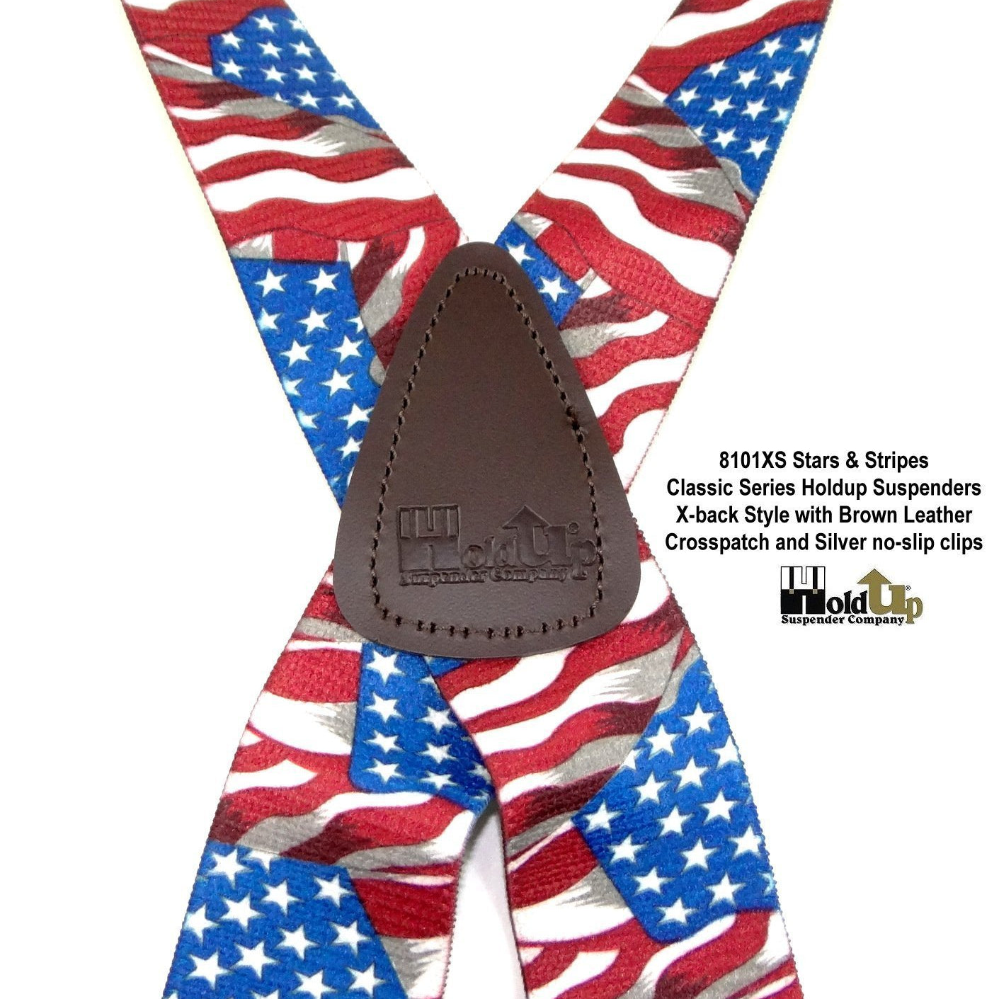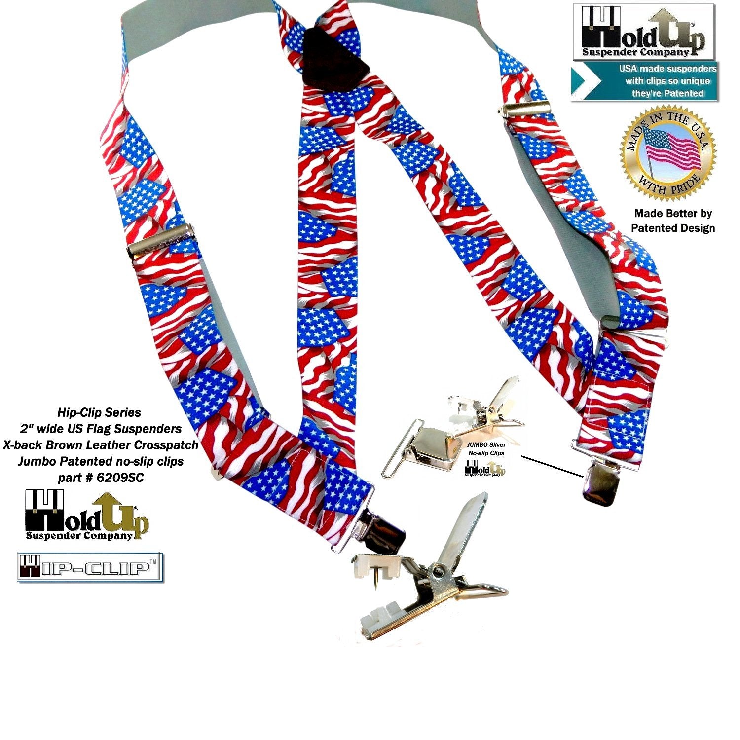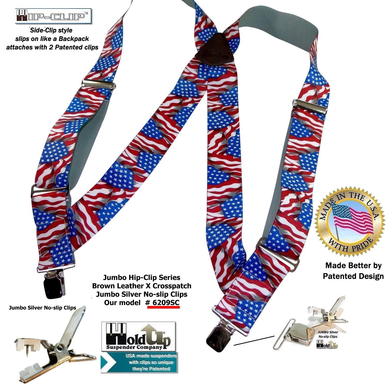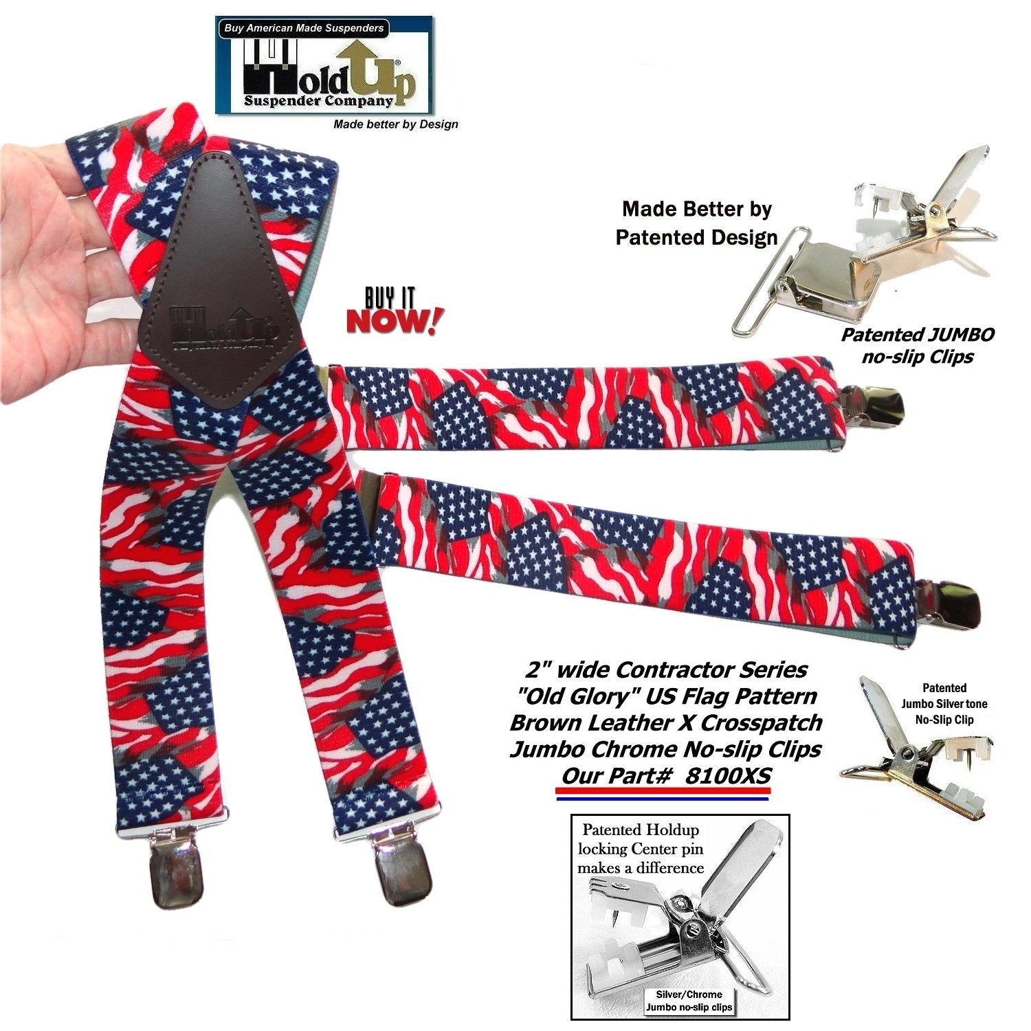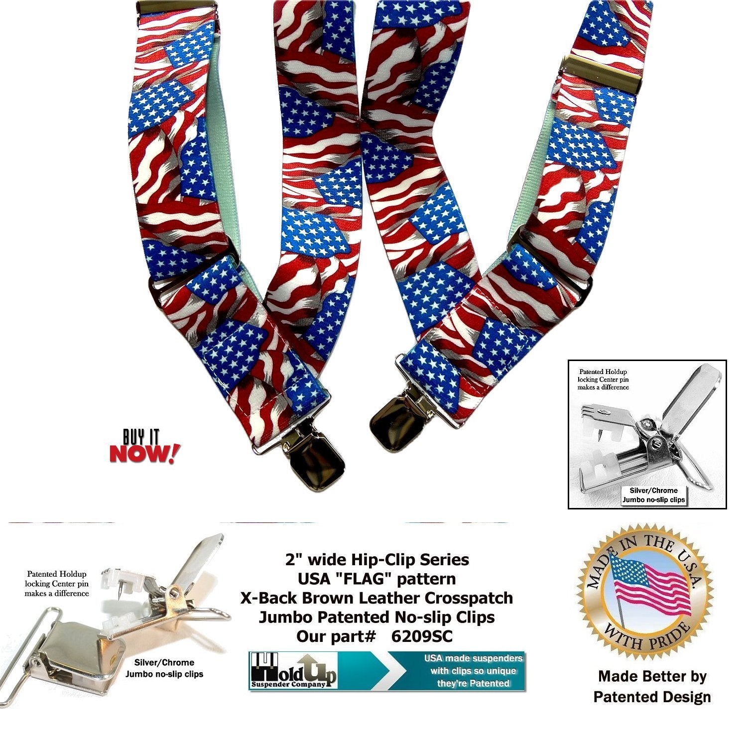 Multiple styles of Holdup clip-on suspenders with American Flag pattern in a variety of widths, styles and prices. "USA FLAG" pattern men's suspenders made better by patented and trademarked design in America.