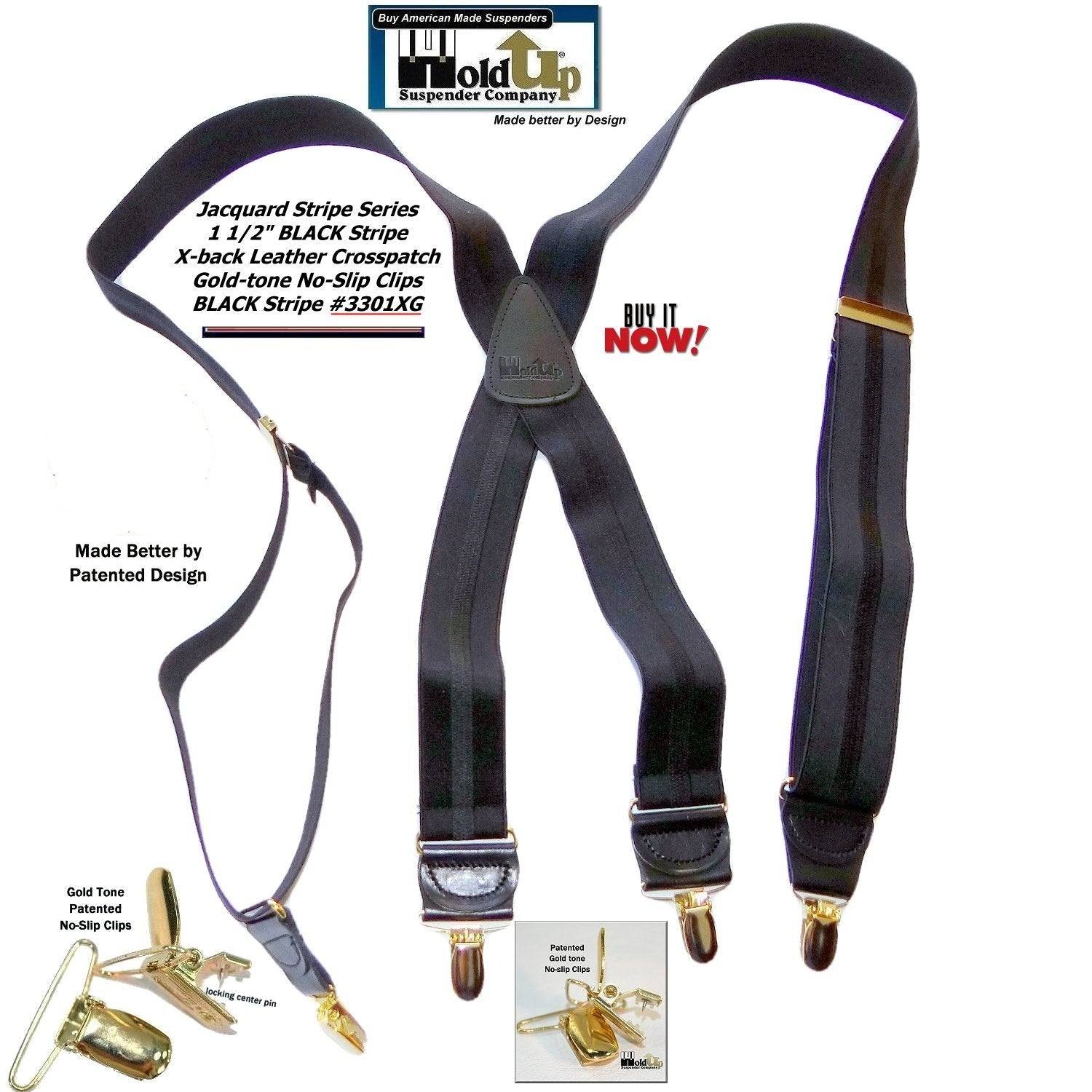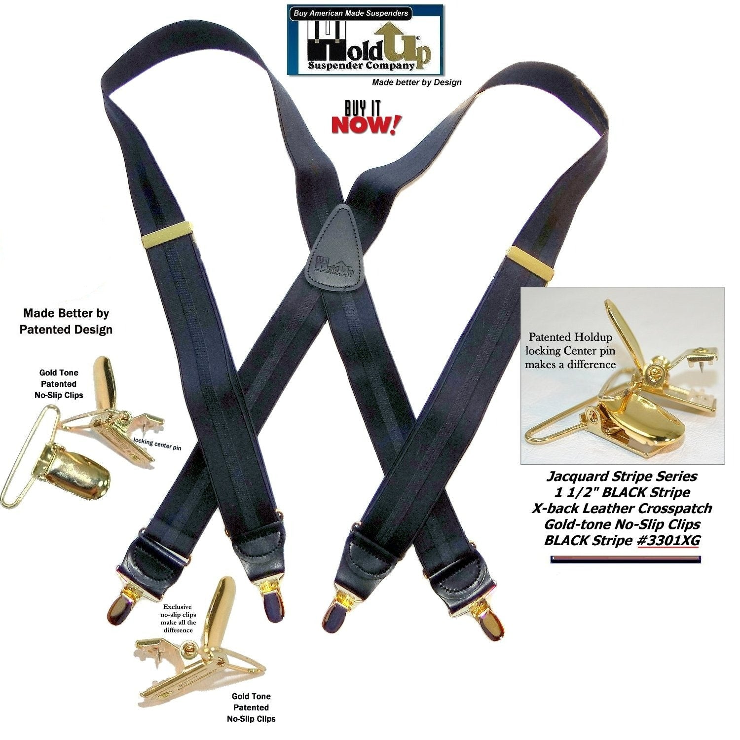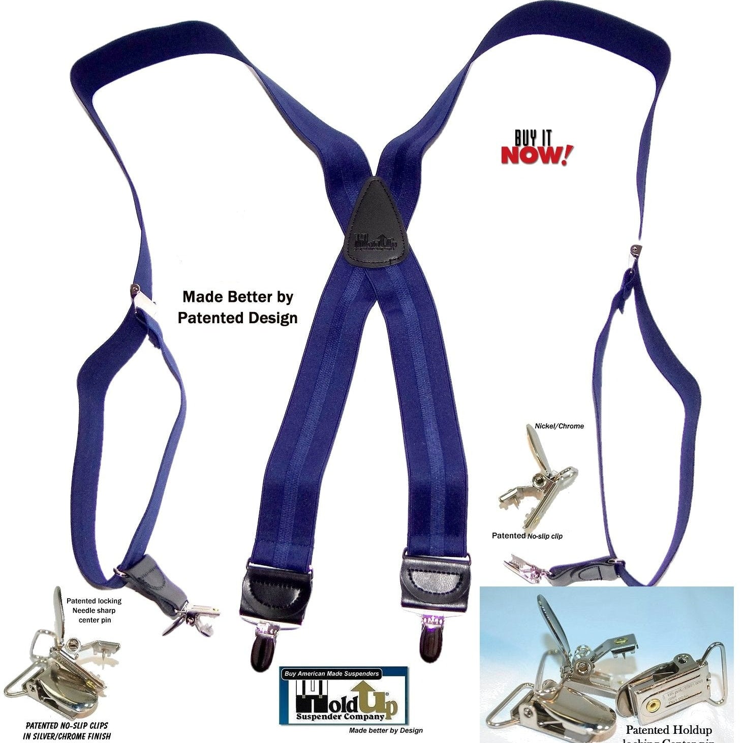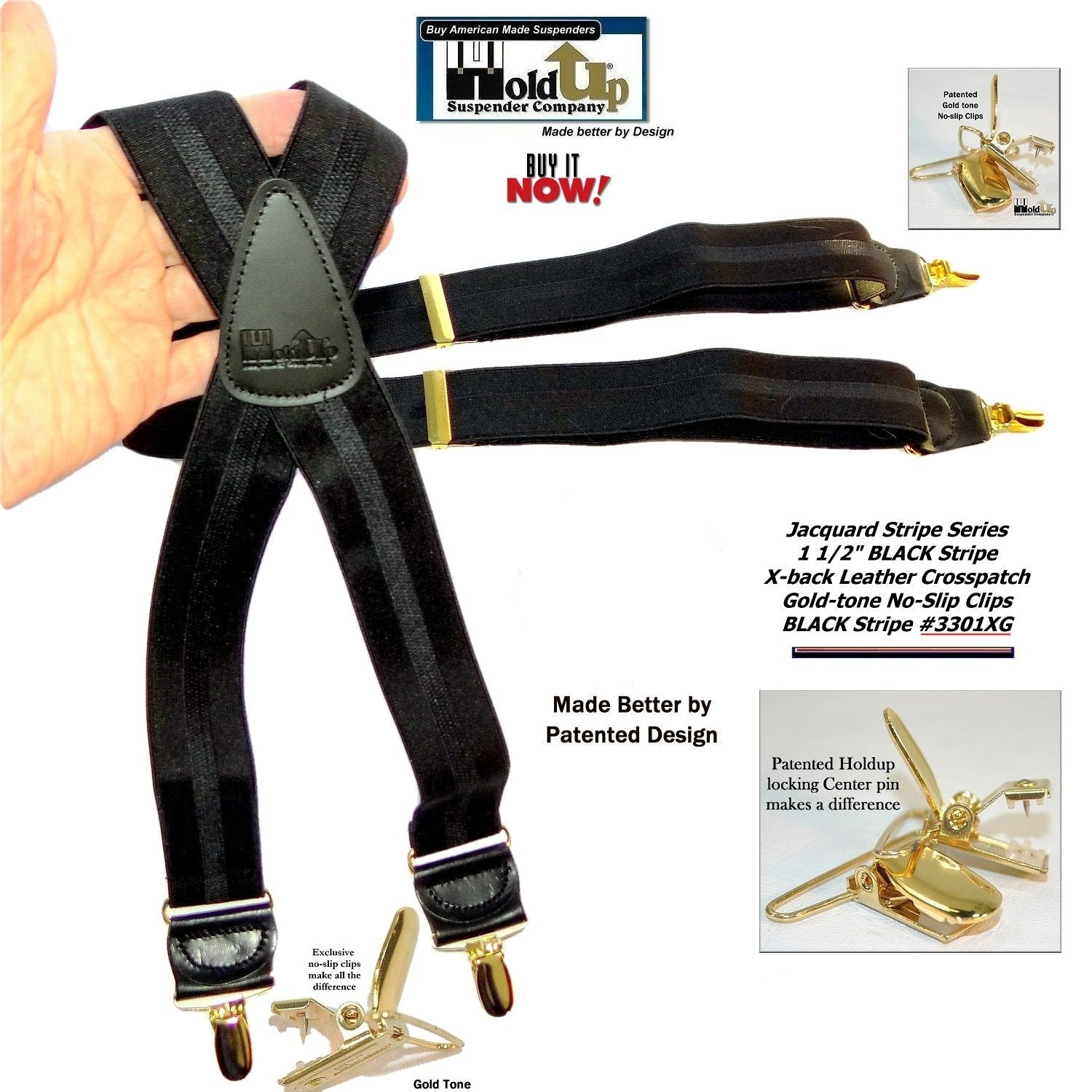The USA made Holdup Stripes Series models have USA made cotton poly-blend elastic striped 1 1/2" wide straps in several color combination choices. You also get to pick out either X-Back styles with top grade black leather crosspatch embossed with our Holdup brand logo. Choose silver-tone or gold finished no-slip metal clips and matching metal strap length adjusters. Â Buy using your Amazon or PayPal account or any credit or debit card and get free standard freight offer at secure checkout.Â
