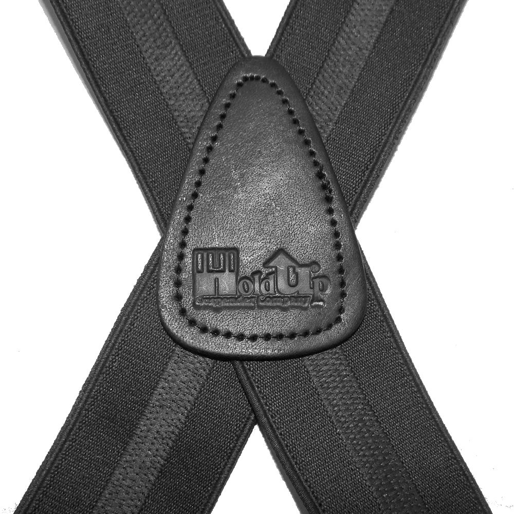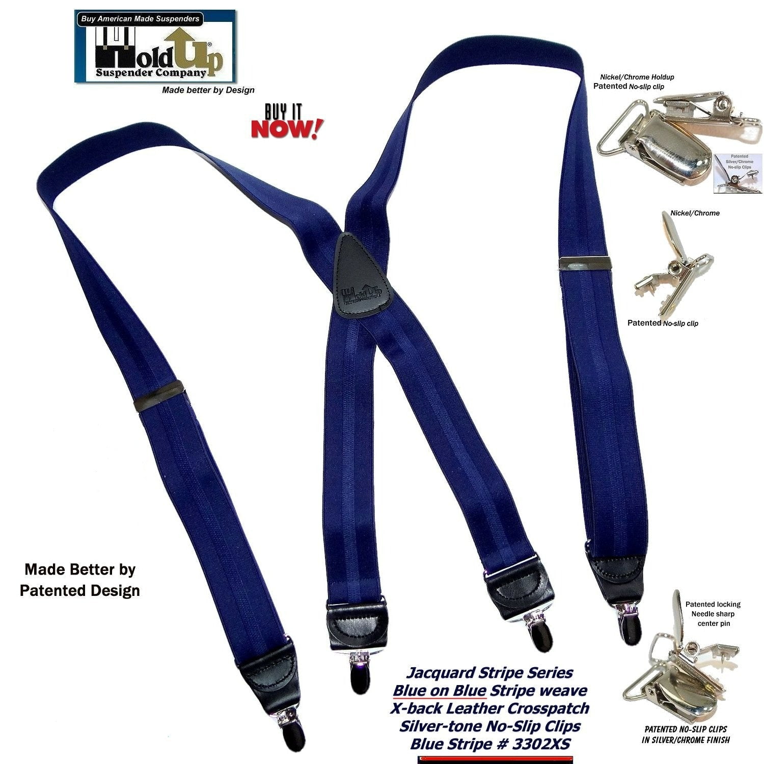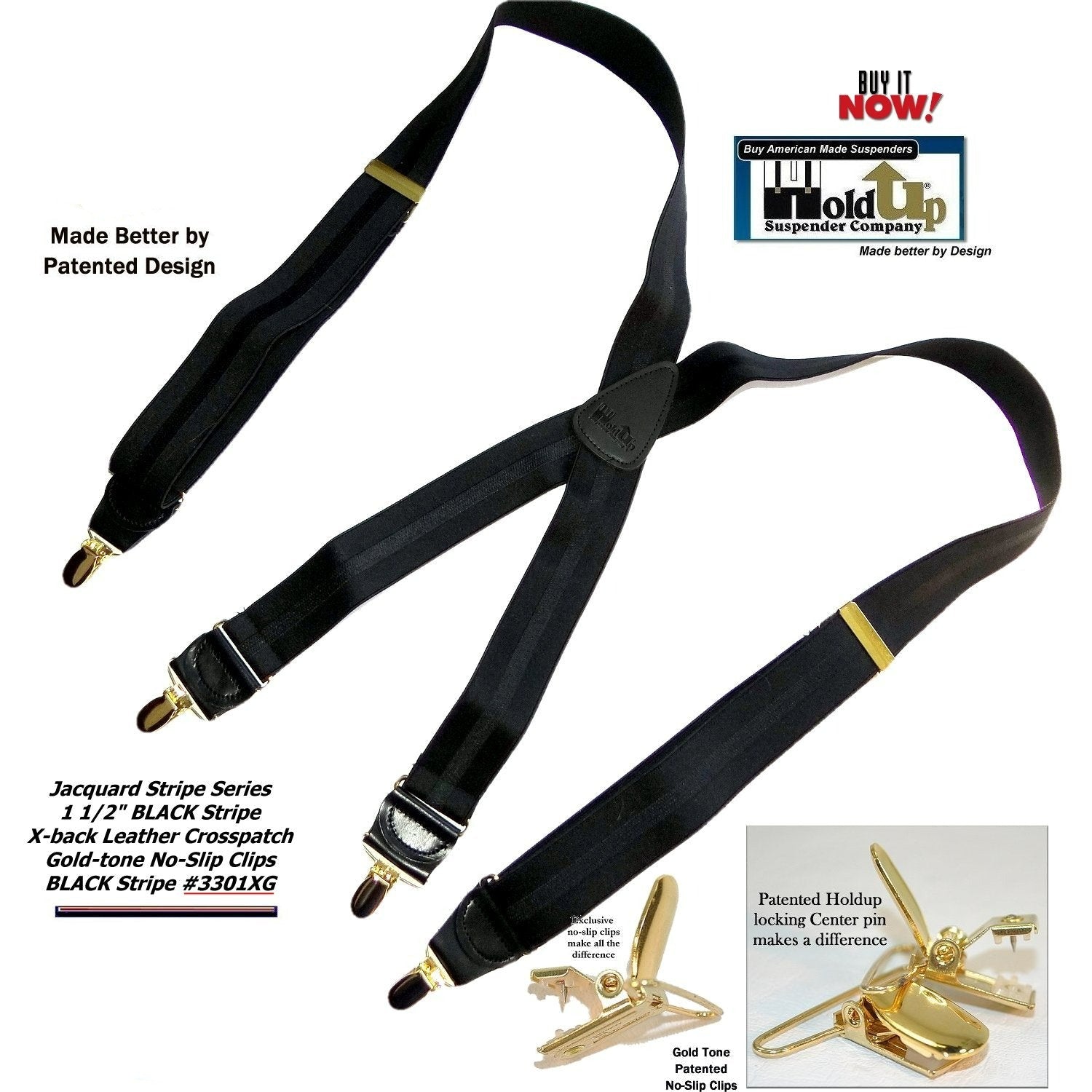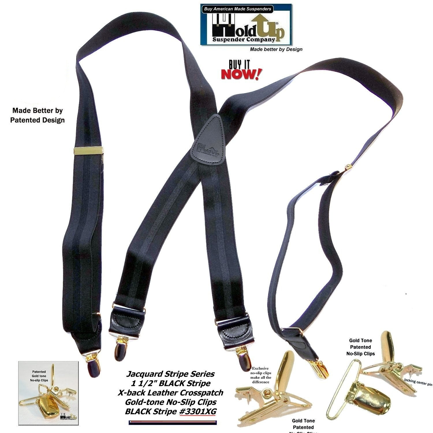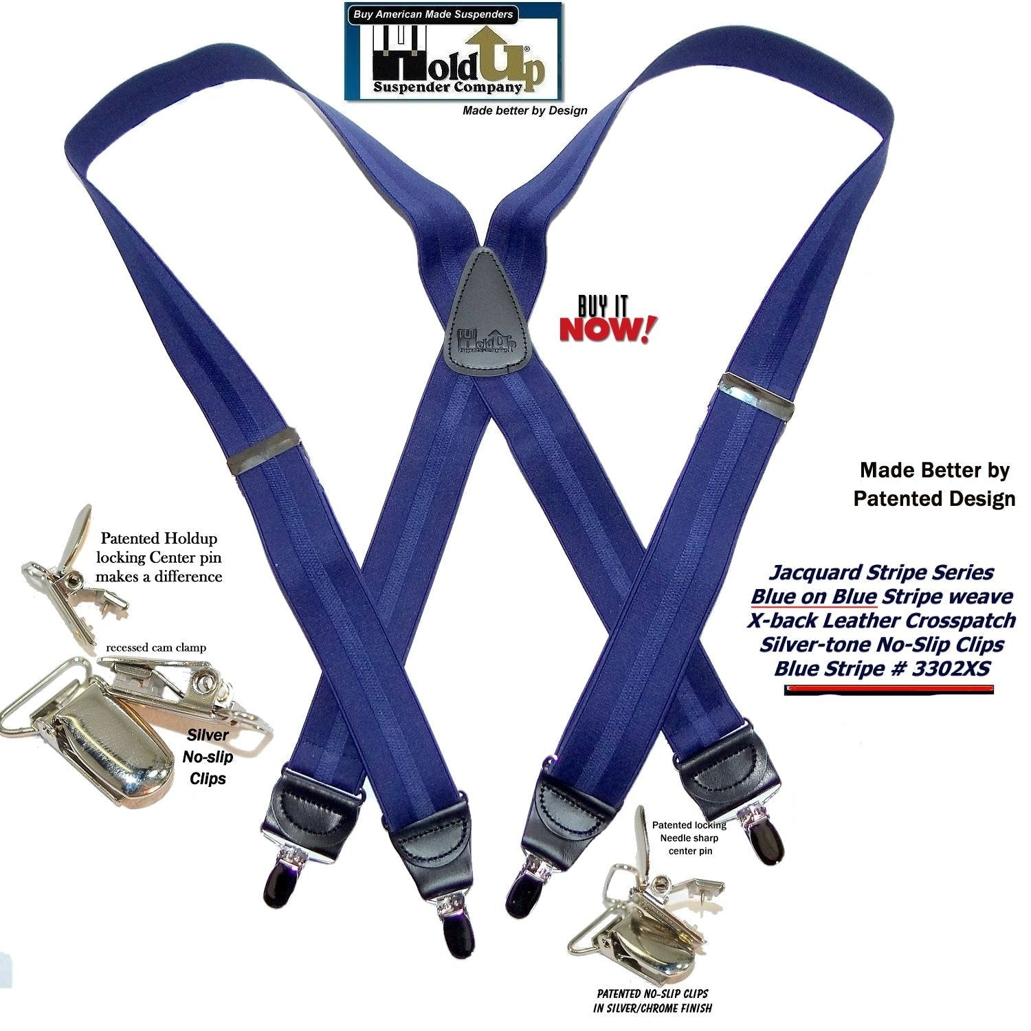 The USA made Holdup Stripes Series models have USA made cotton poly-blend elastic striped 1 1/2" wide straps in several color combination choices. You also get to pick out either X-Back styles with top grade black leather crosspatch embossed with our Holdup brand logo. Choose silver-tone or gold finished no-slip metal clips and matching metal strap length adjusters. Â Buy using your Amazon or PayPal account or any credit or debit card and get free standard freight offer at secure checkout.Â