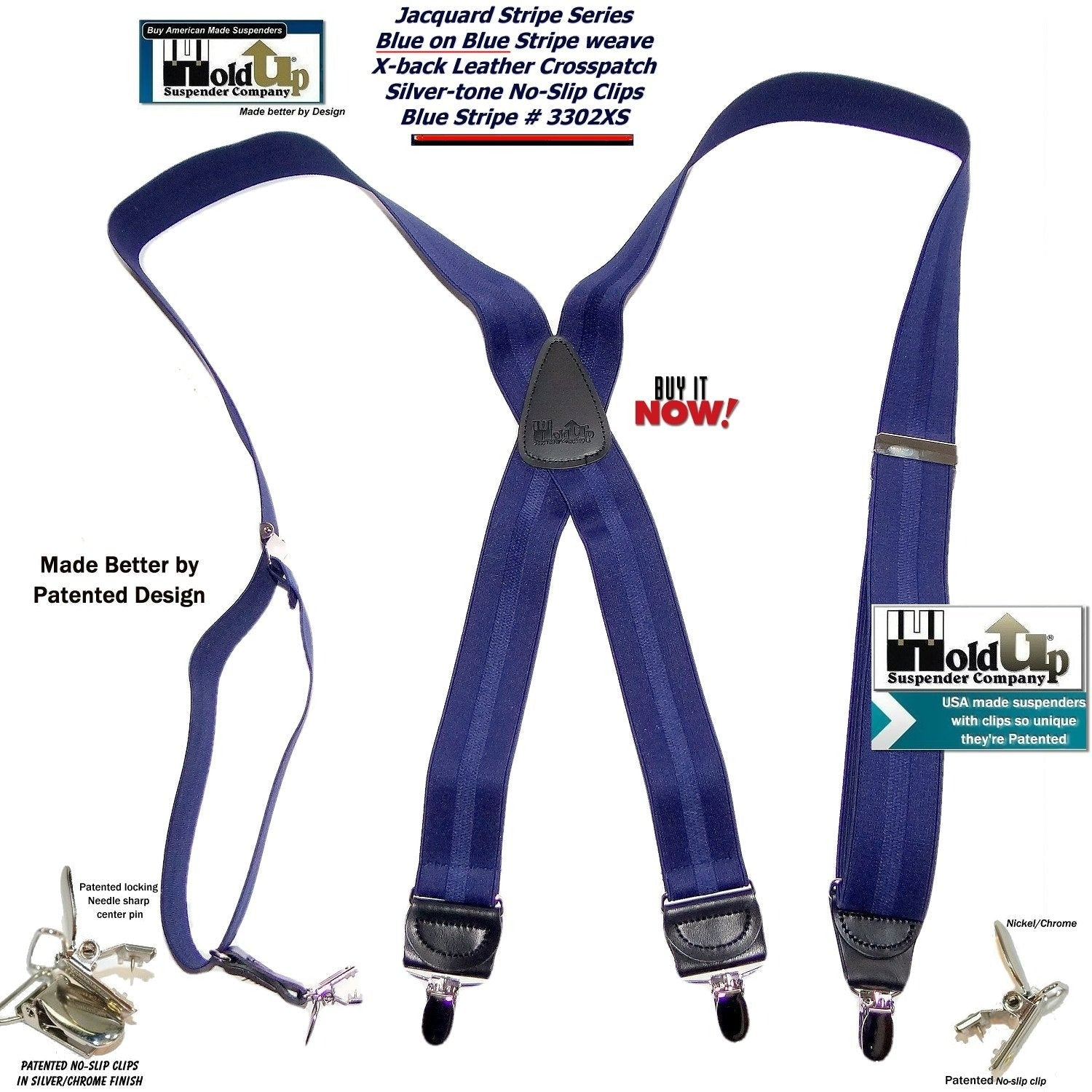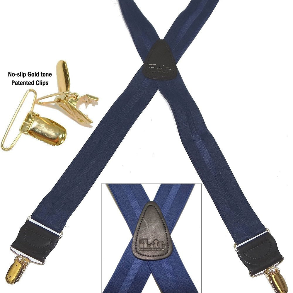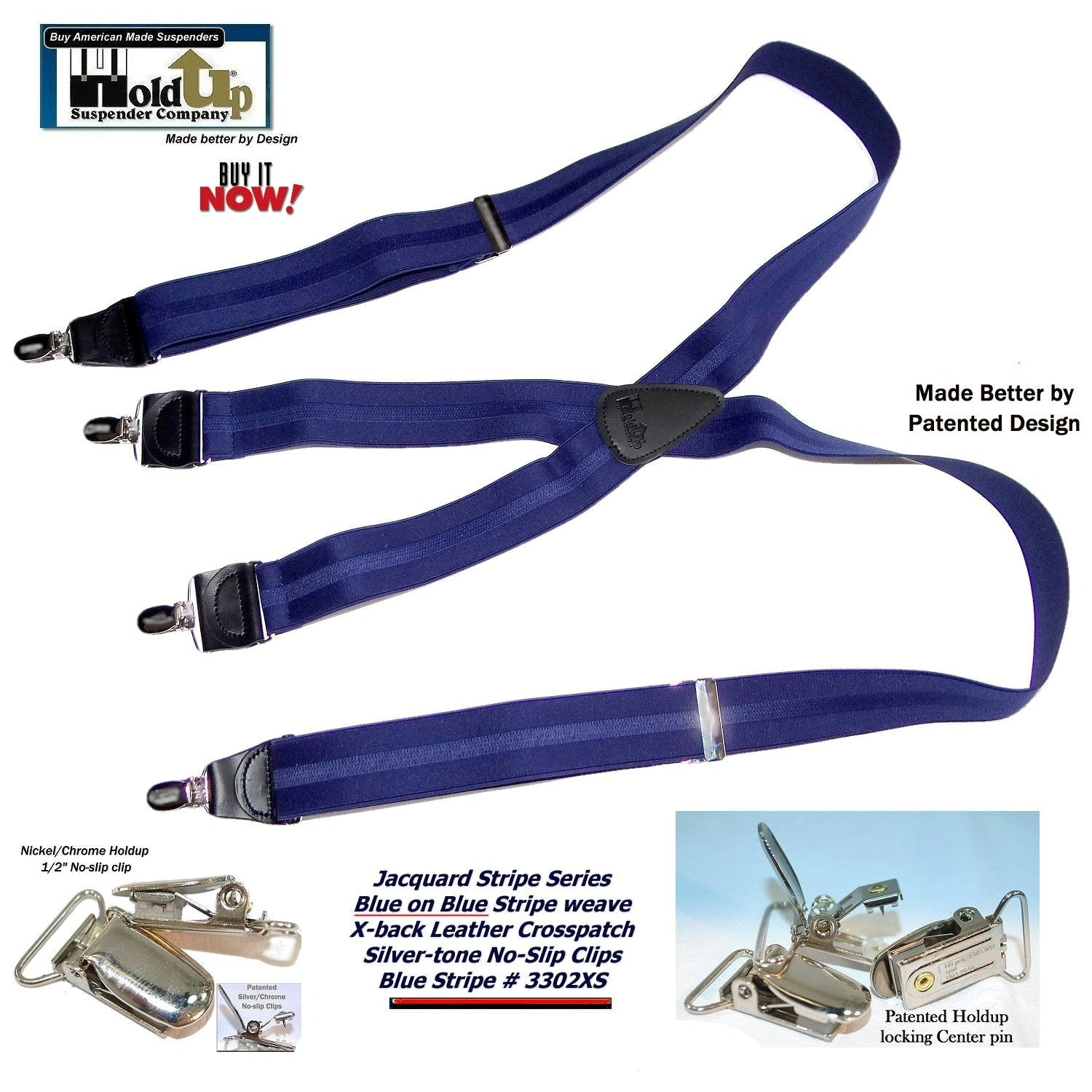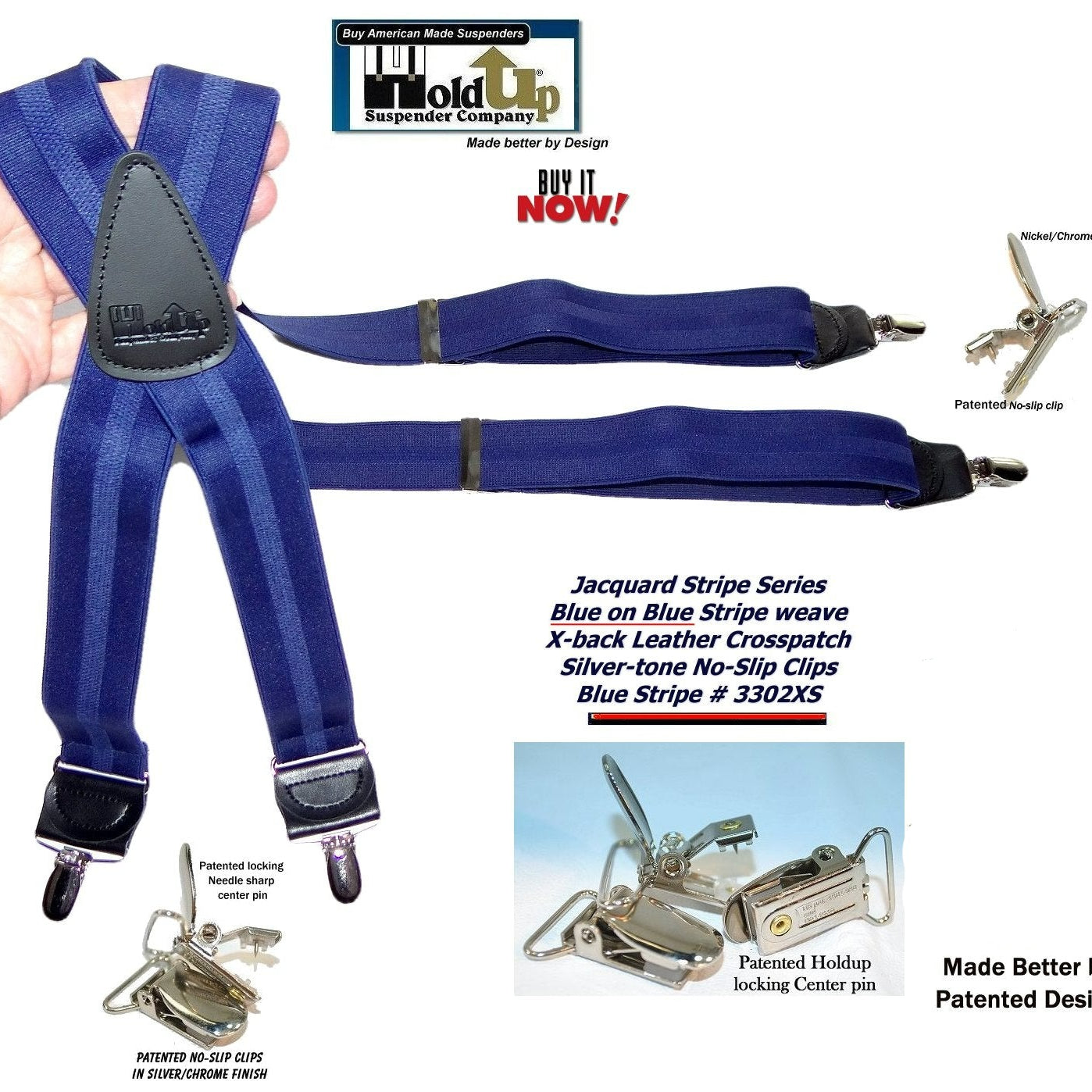 The USA made Holdup Stripes Series models have USA made cotton poly-blend elastic striped 1 1/2" wide straps in several color combination choices. You also get to pick out either X-Back styles with top grade black leather crosspatch embossed with our Holdup brand logo. Choose silver-tone or gold finished no-slip metal clips and matching metal strap length adjusters. Â Buy using your Amazon or PayPal account or any credit or debit card and get free standard freight offer at secure checkout.Â