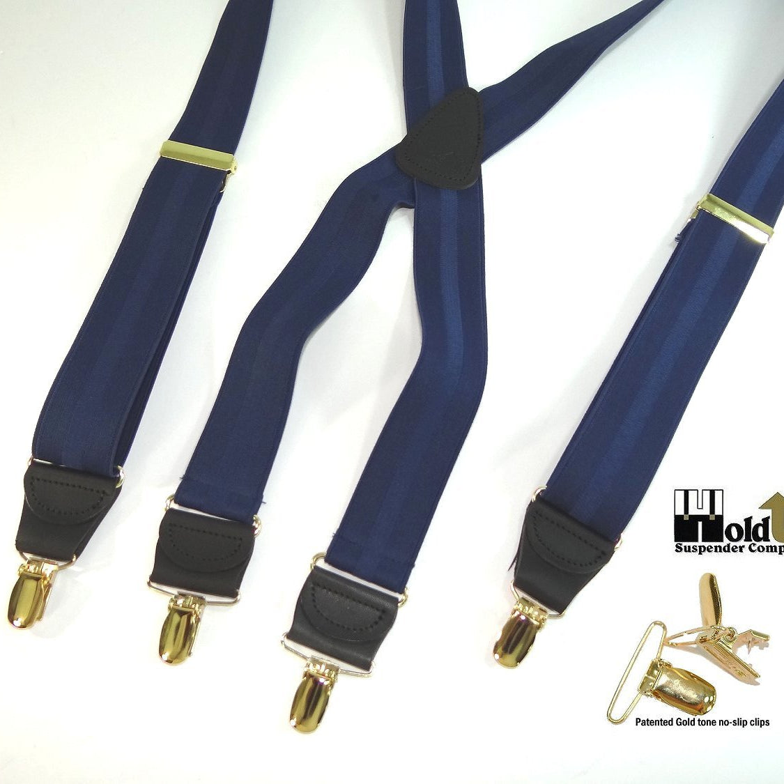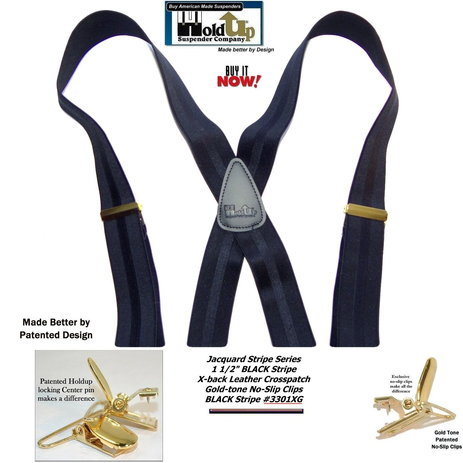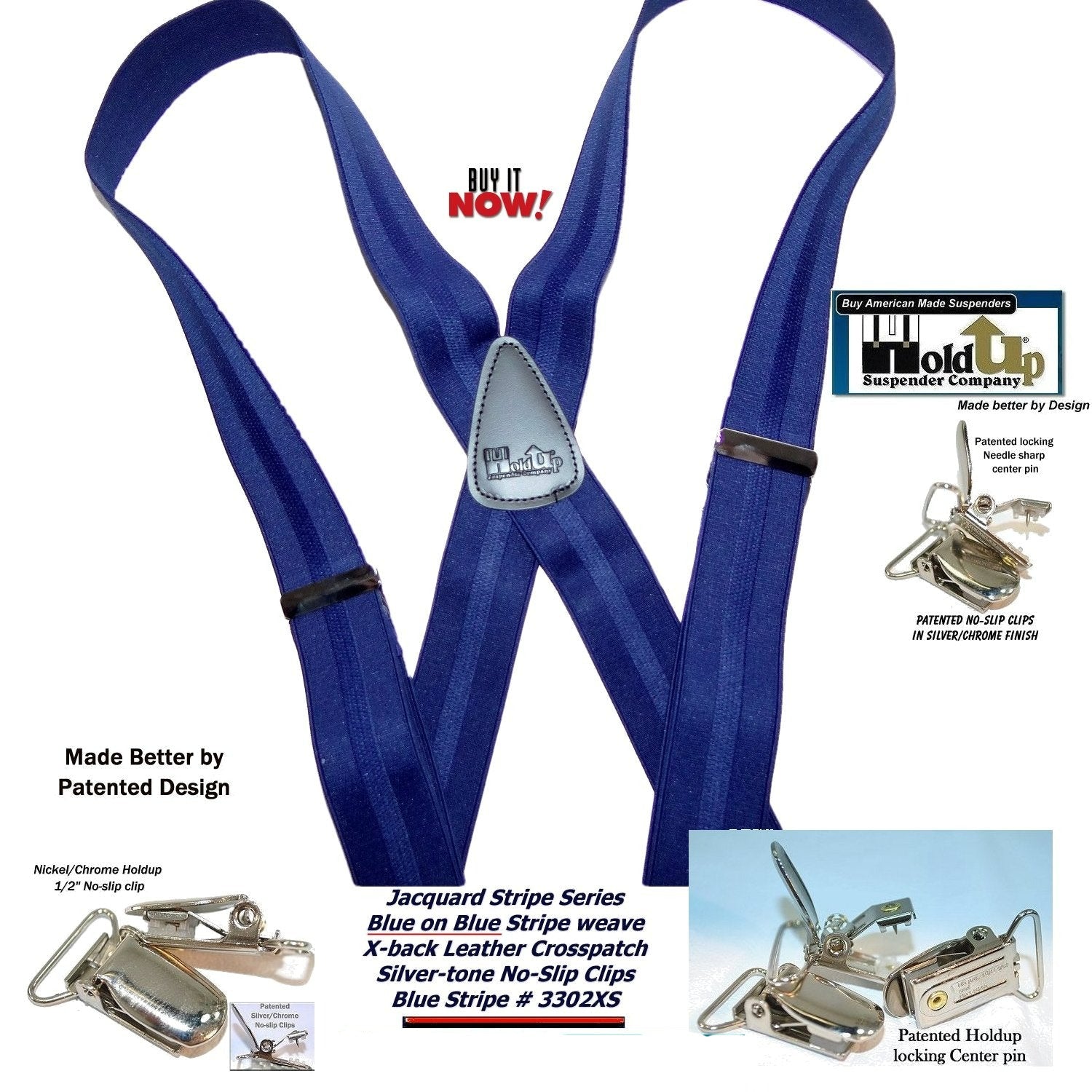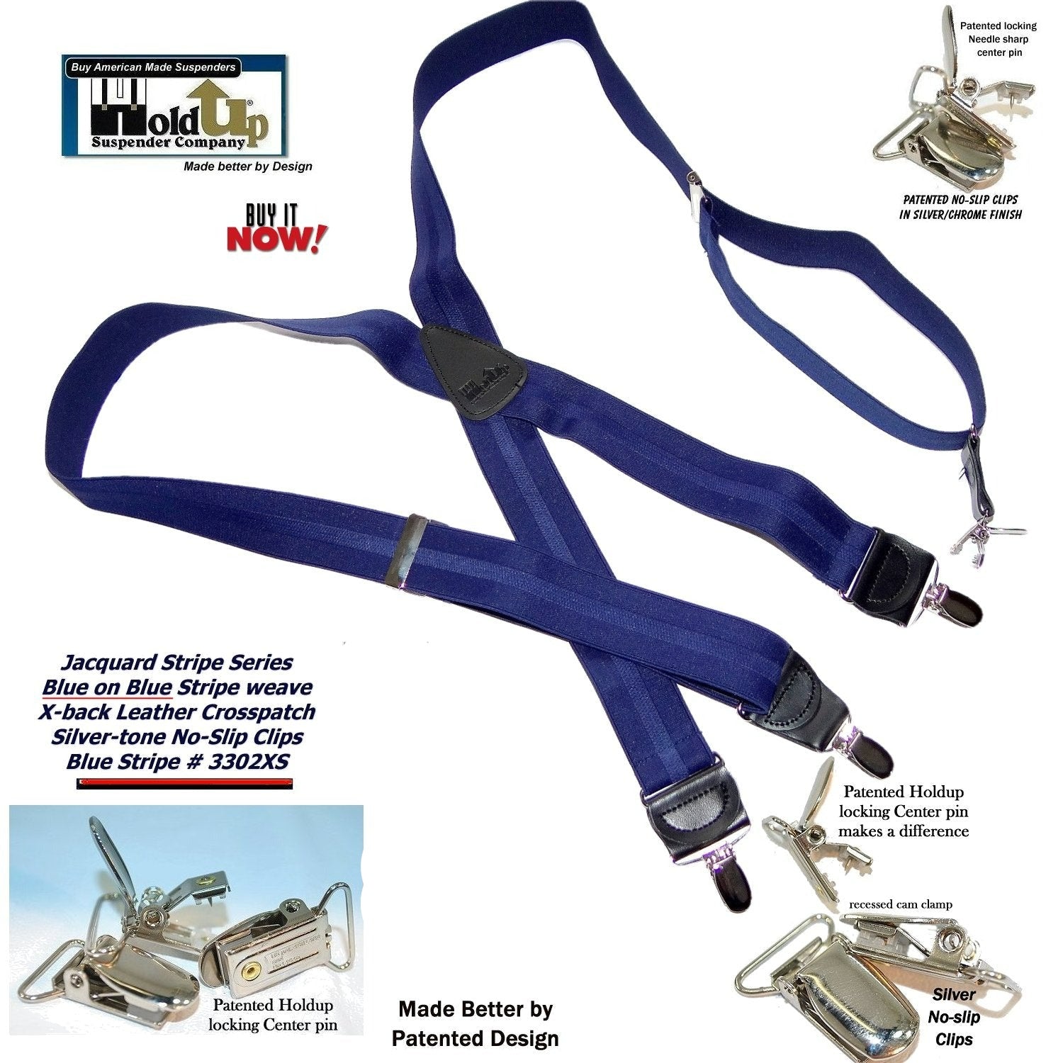 The USA made Holdup Stripes Series models have USA made cotton poly-blend elastic striped 1 1/2" wide straps in several color combination choices. You also get to pick out either X-Back styles with top grade black leather crosspatch embossed with our Holdup brand logo. Choose silver-tone or gold finished no-slip metal clips and matching metal strap length adjusters. Â Buy using your Amazon or PayPal account or any credit or debit card and get free standard freight offer at secure checkout.Â