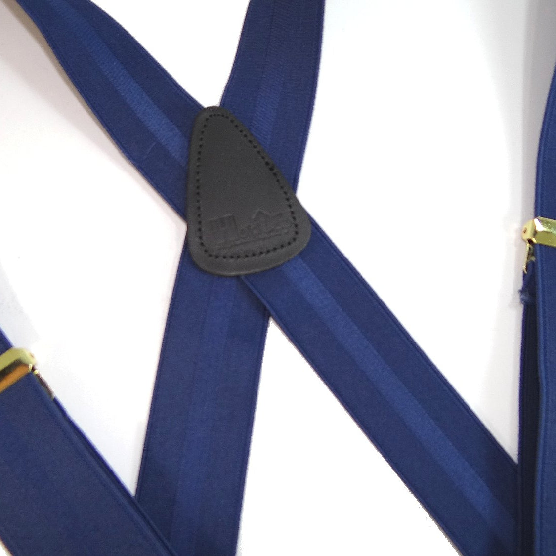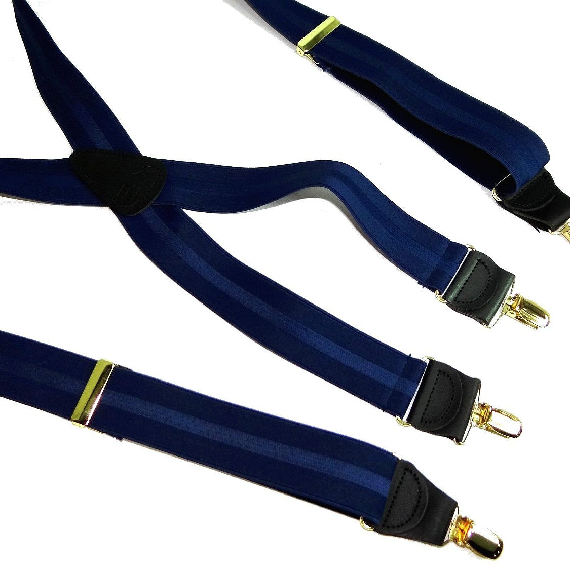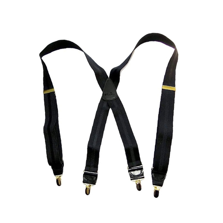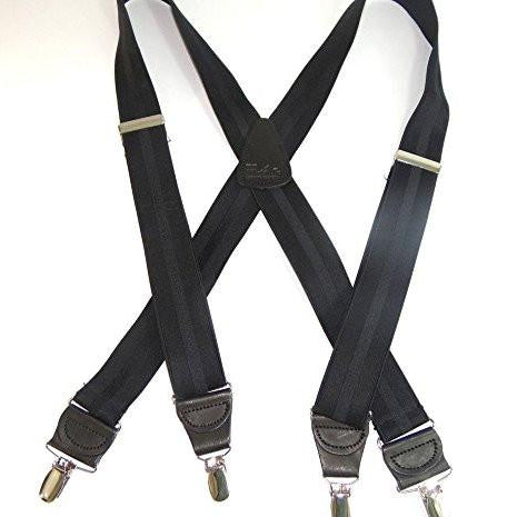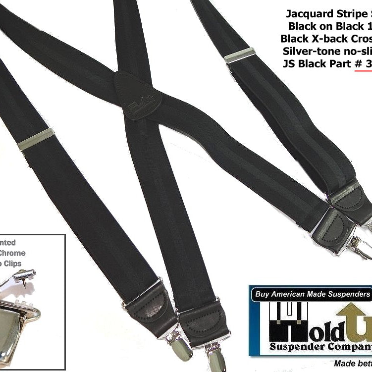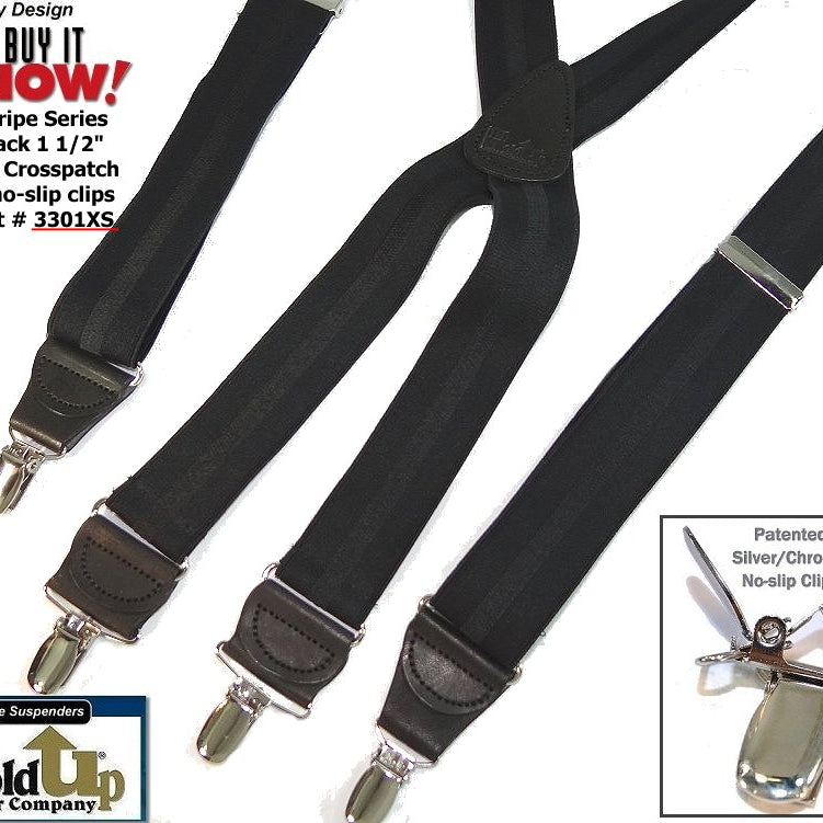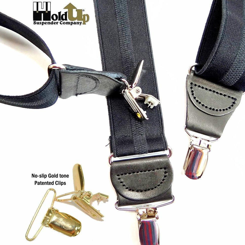 The USA made Holdup Stripes Series models have USA made cotton poly-blend elastic striped 1 1/2" wide straps in several color combination choices. You also get to pick out either X-Back styles with top grade black leather crosspatch embossed with our Holdup brand logo. Choose silver-tone or gold finished no-slip metal clips and matching metal strap length adjusters. Â Buy using your Amazon or PayPal account or any credit or debit card and get free standard freight offer at secure checkout.Â