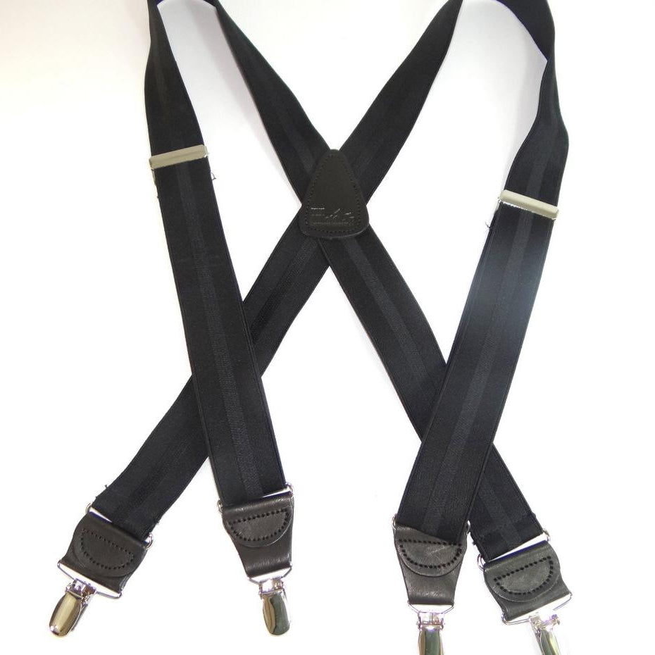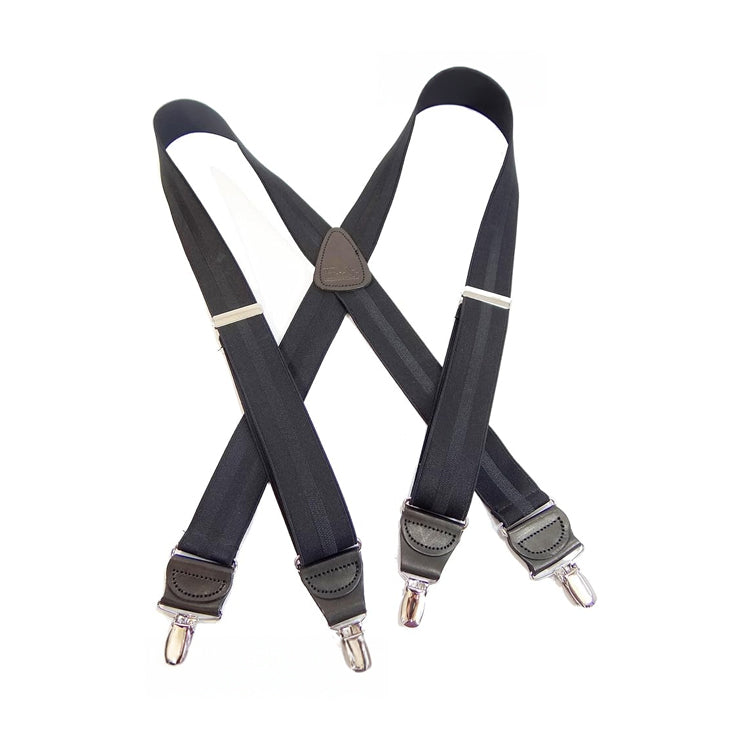 JACQUARD WEAVE AND STRIPED SINGLE CLIP SERIES HOLDUP SUSPENDERS with patented no-slip clips.