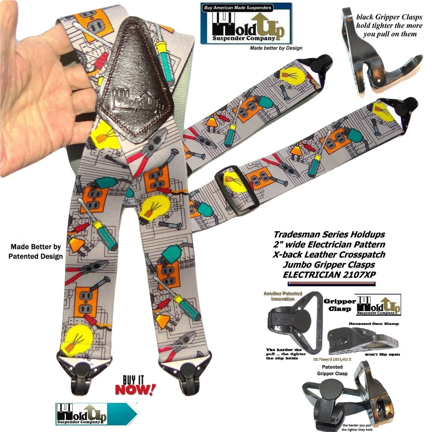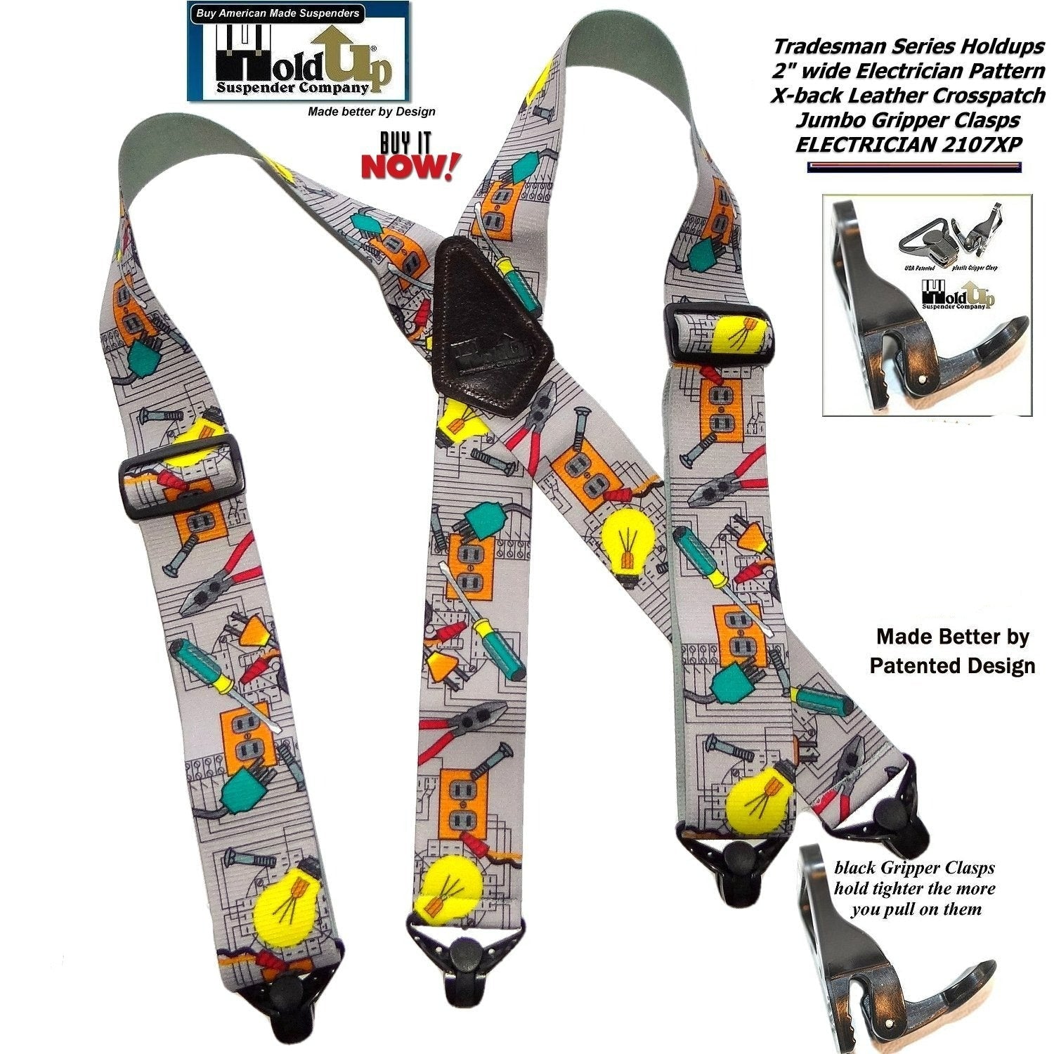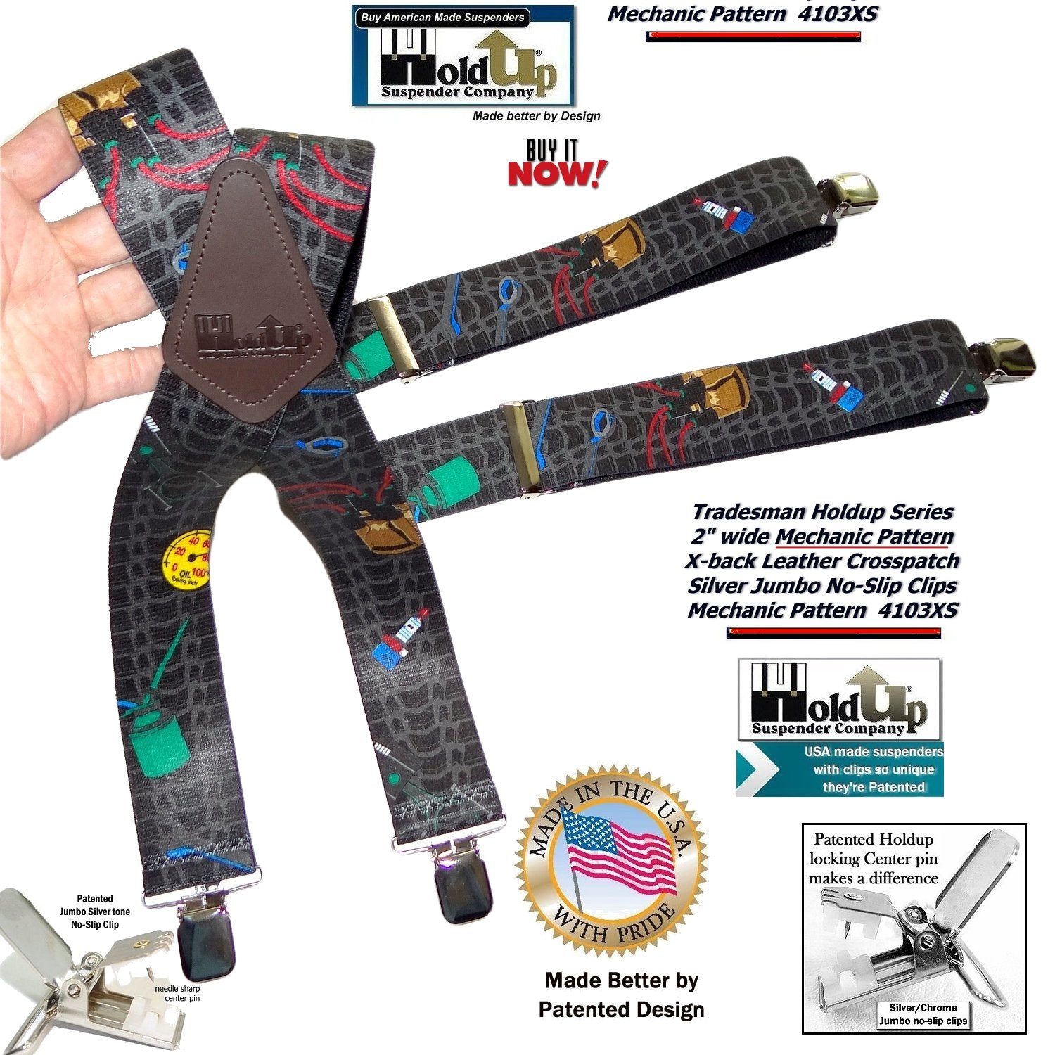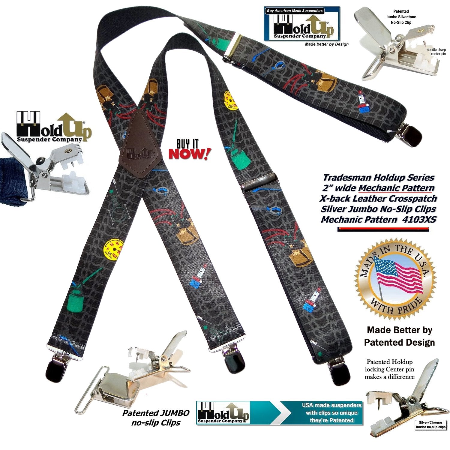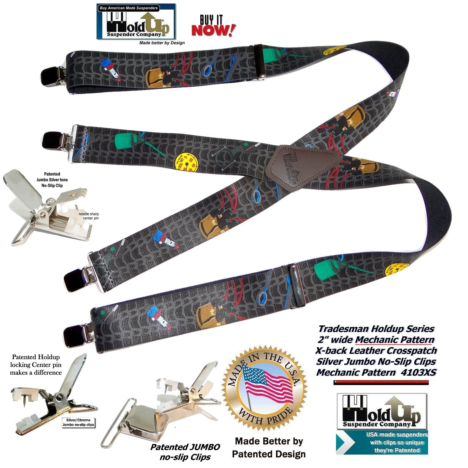 All Tradesmen Series Work Suspenders have chrome plated exclusive USA Patented Jumbo no-slip clips and are designed for the working man needing a wider heavy duty pant suspender. The colorfast patterned straps are 2" wide and all have a Genuine Brown leather logo embossed crosspatch.