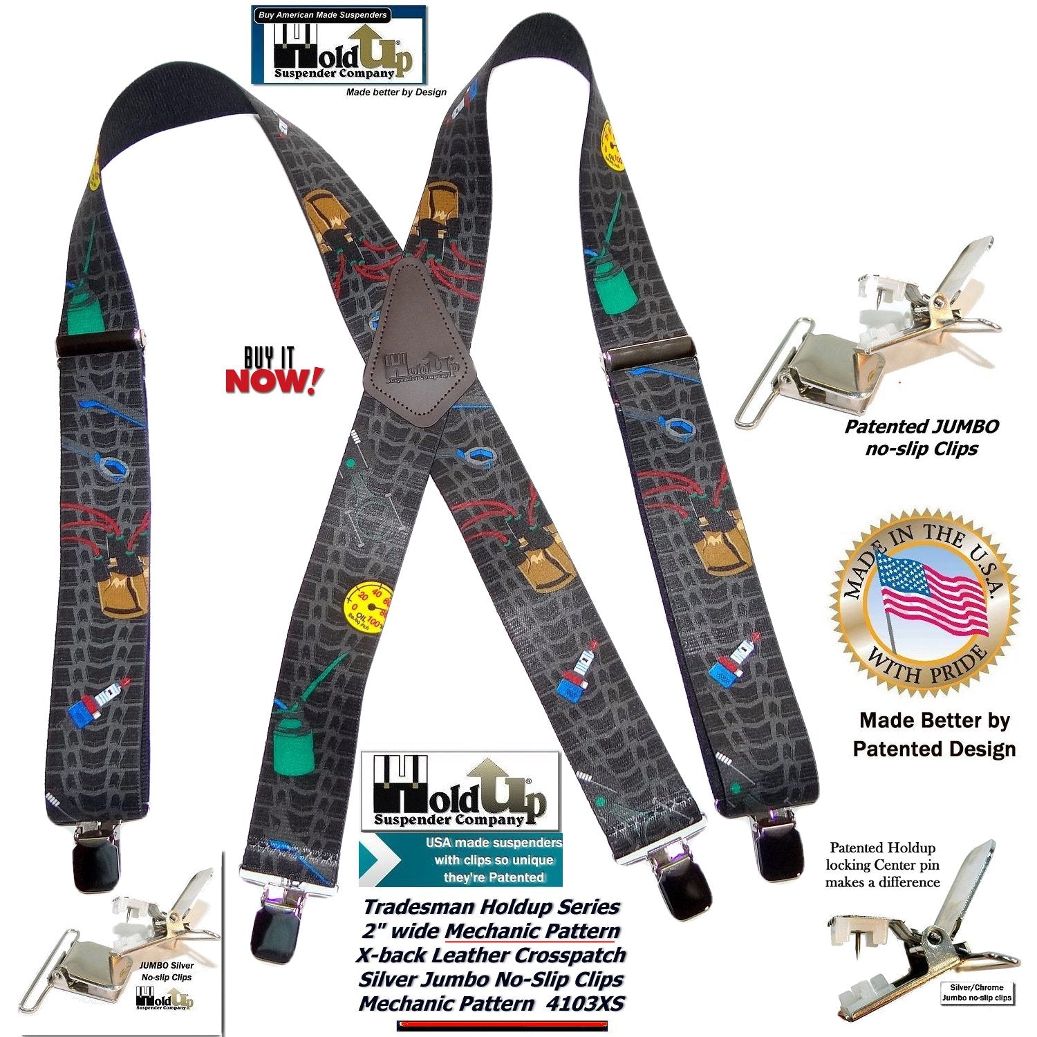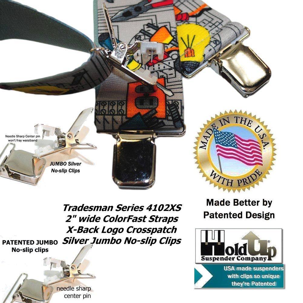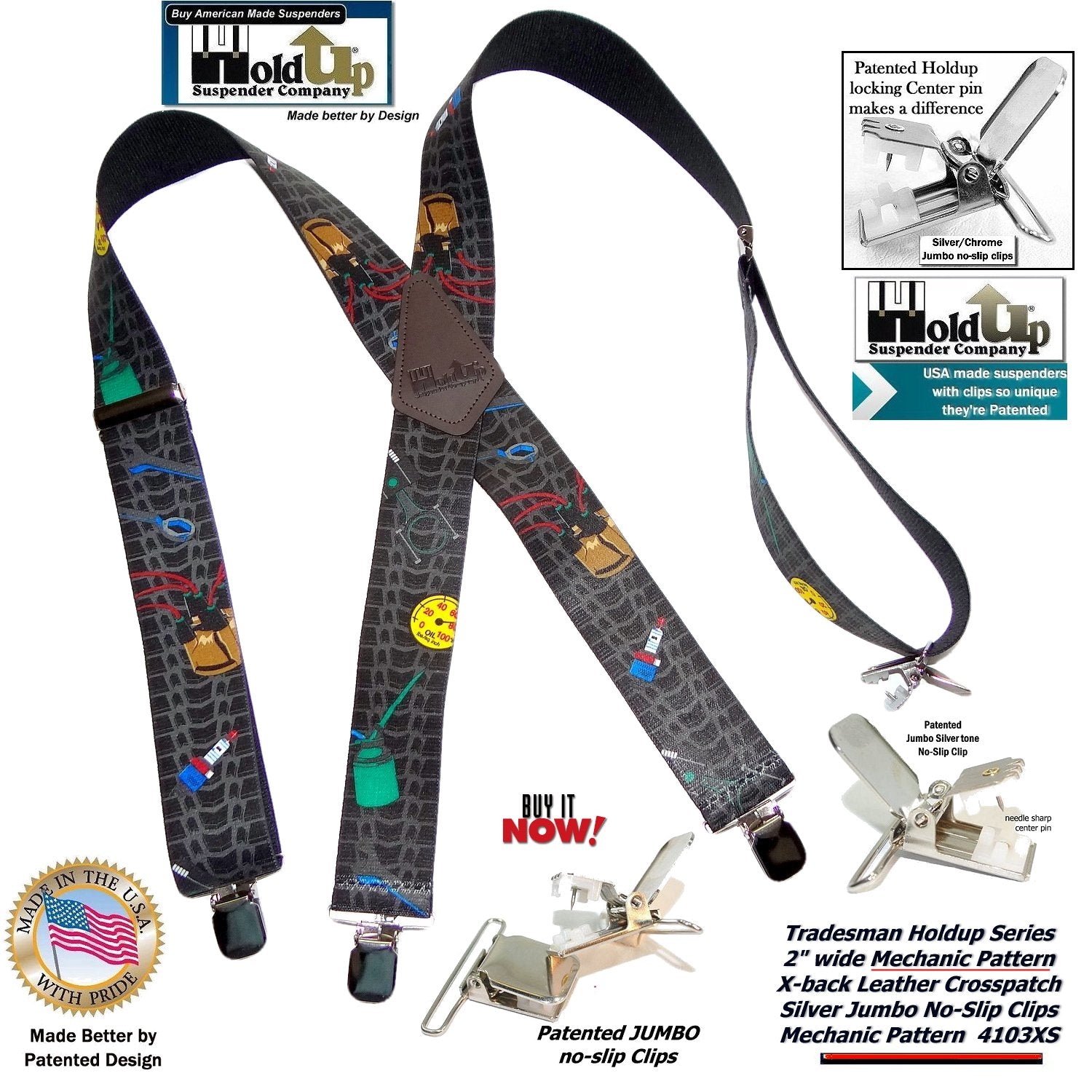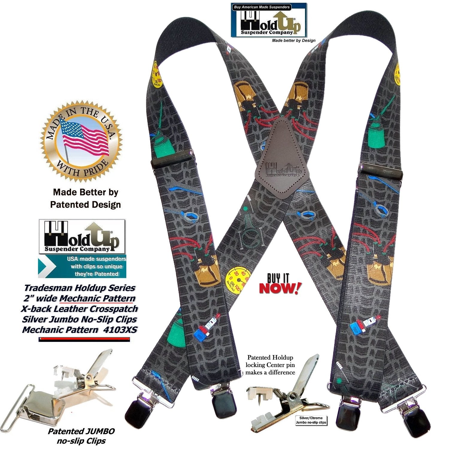 All Tradesmen Series Work Suspenders have chrome plated exclusive USA Patented Jumbo no-slip clips and are designed for the working man needing a wider heavy duty pant suspender. The colorfast patterned straps are 2" wide and all have a Genuine Brown leather logo embossed crosspatch.