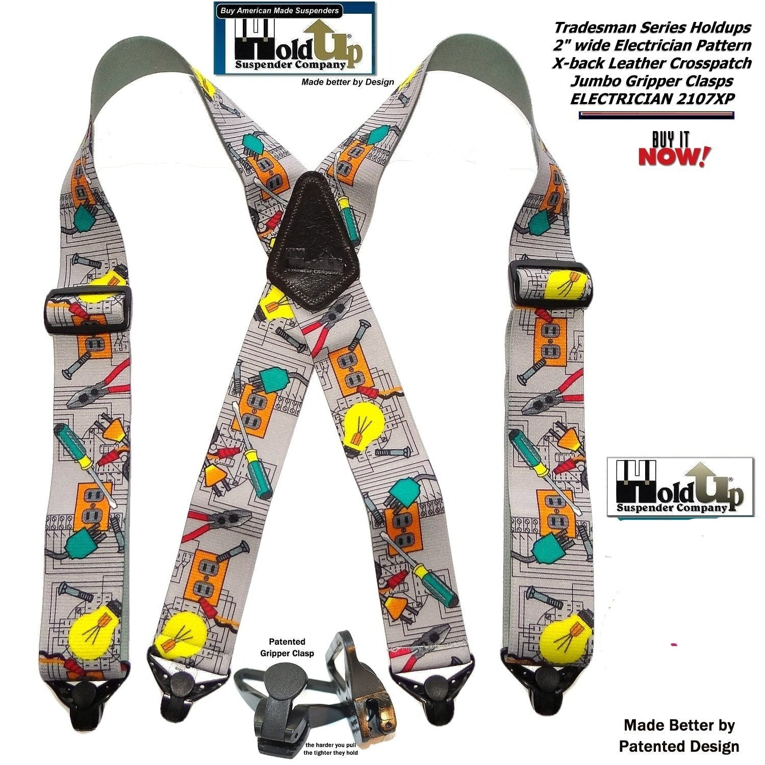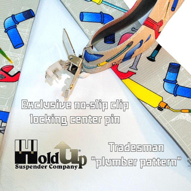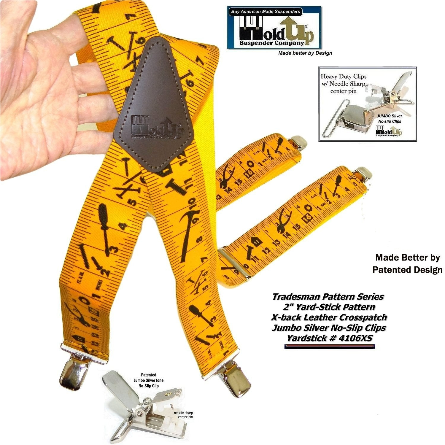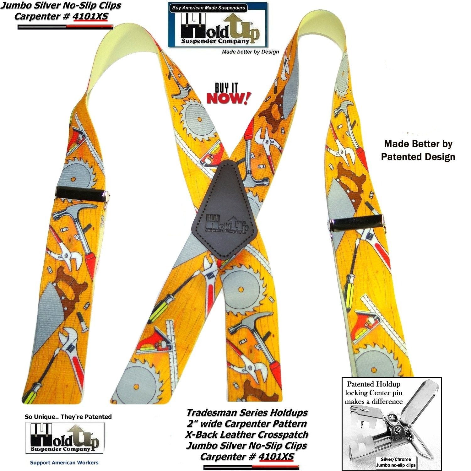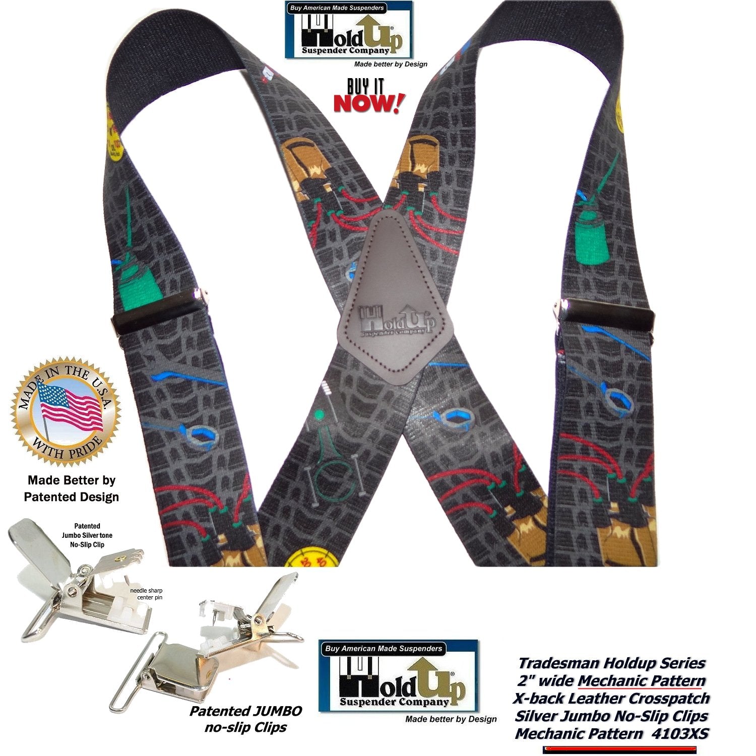 All Tradesmen Series Work Suspenders have chrome plated exclusive USA Patented Jumbo no-slip clips and are designed for the working man needing a wider heavy duty pant suspender. The colorfast patterned straps are 2" wide and all have a Genuine Brown leather logo embossed crosspatch.