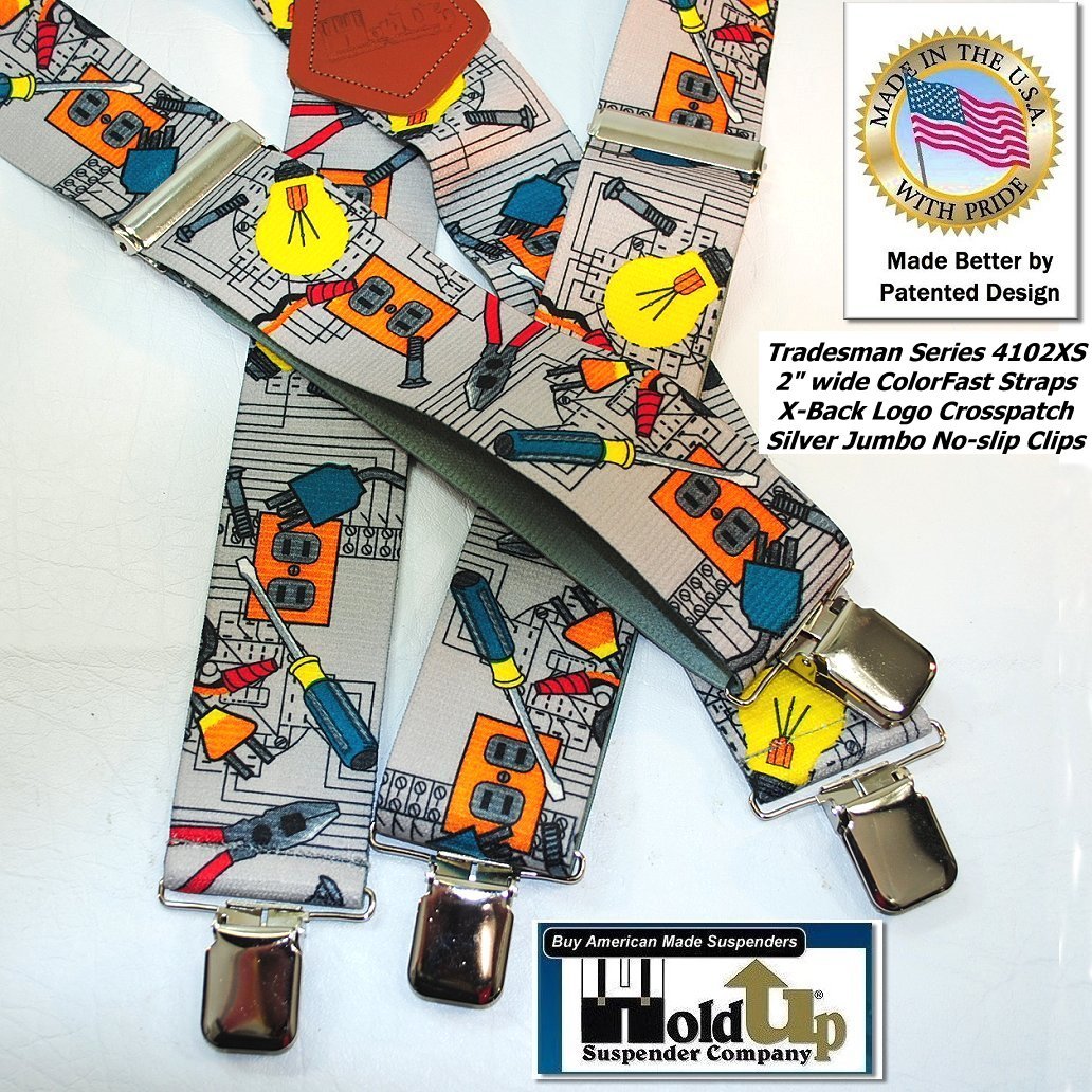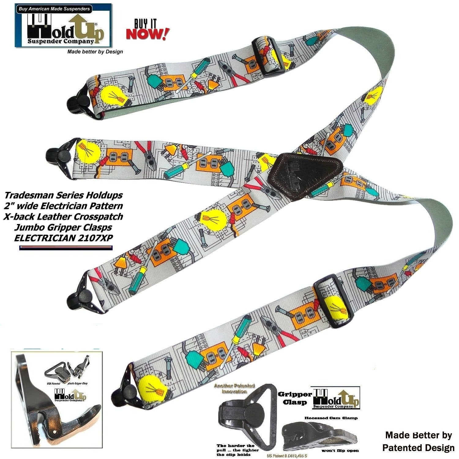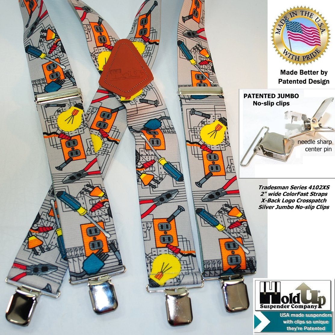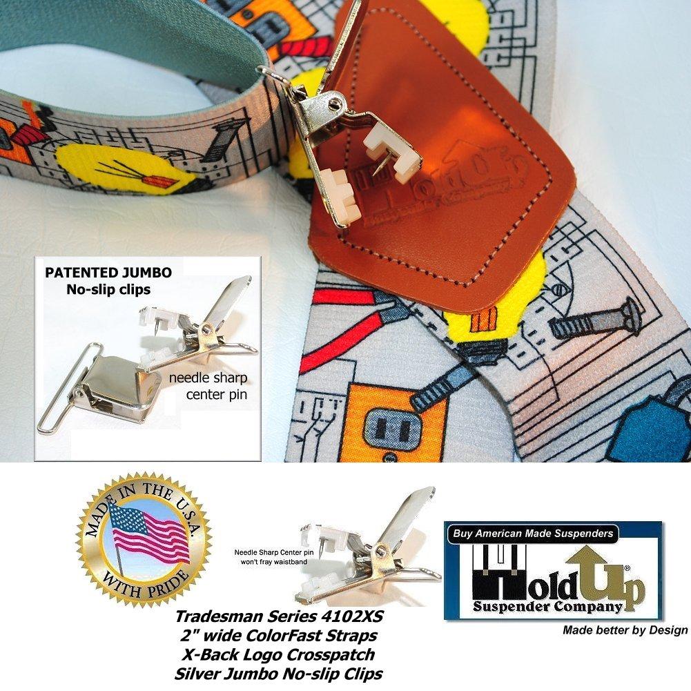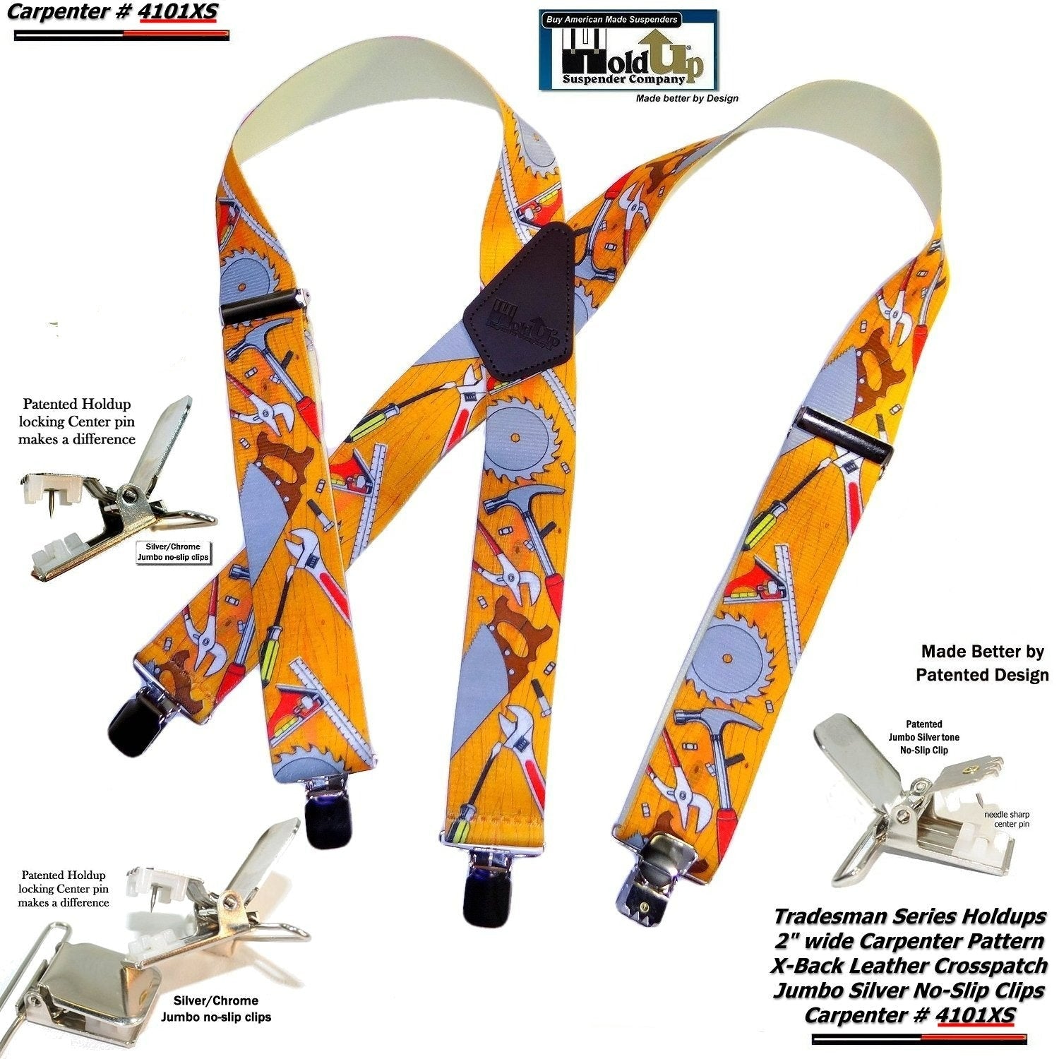 All Tradesmen Series Work Suspenders have chrome plated exclusive USA Patented Jumbo no-slip clips and are designed for the working man needing a wider heavy duty pant suspender. The colorfast patterned straps are 2" wide and all have a Genuine Brown leather logo embossed crosspatch.
