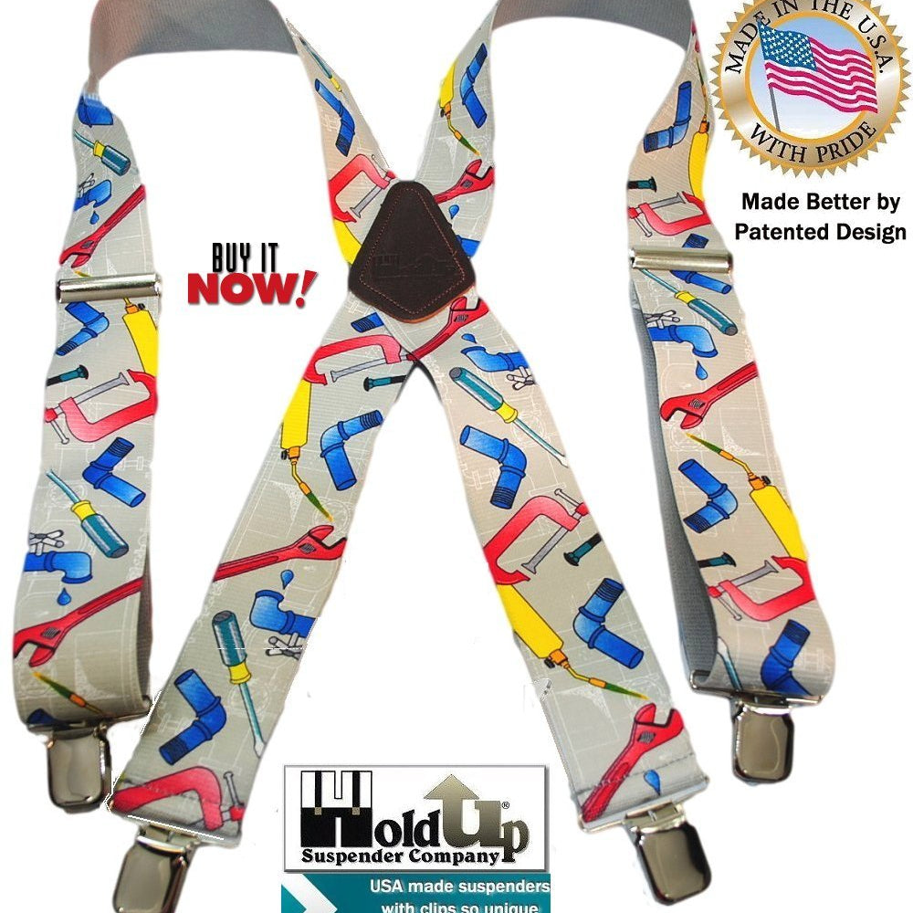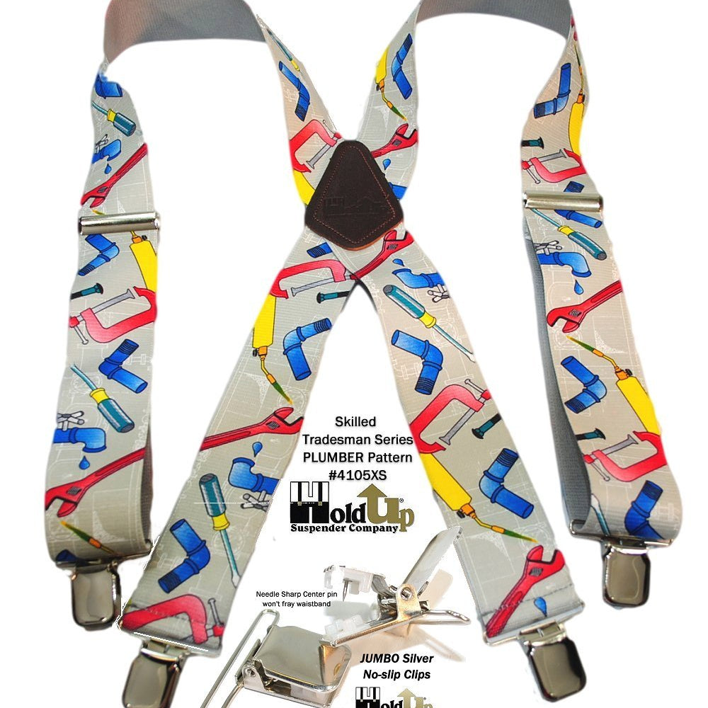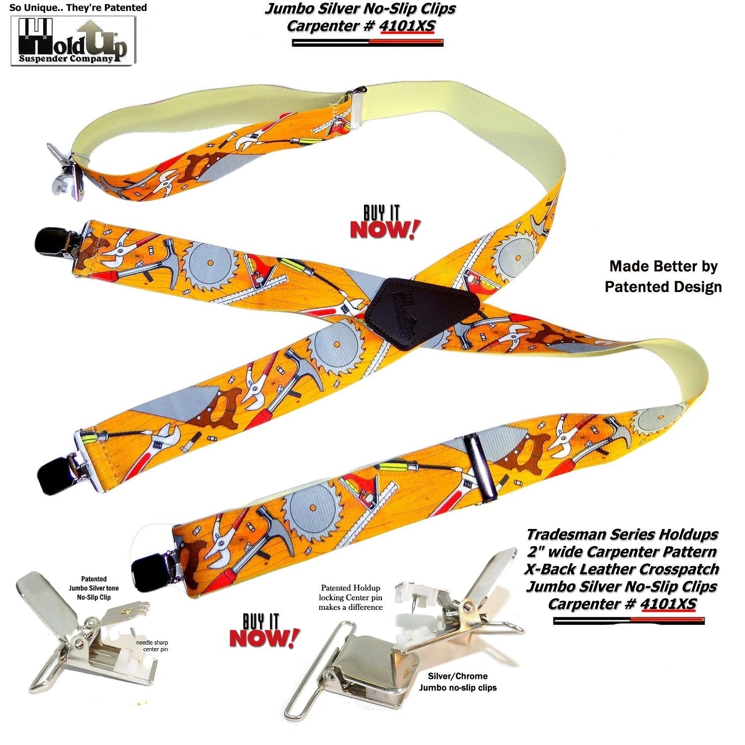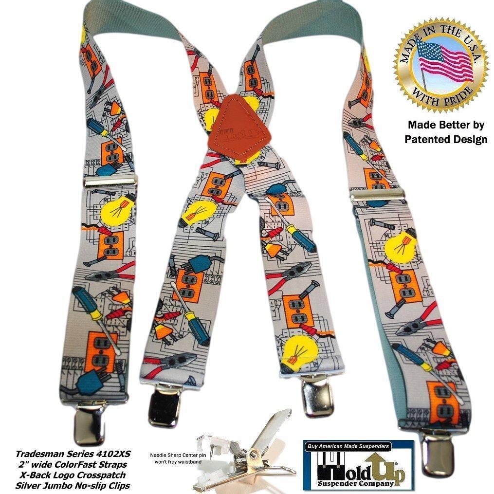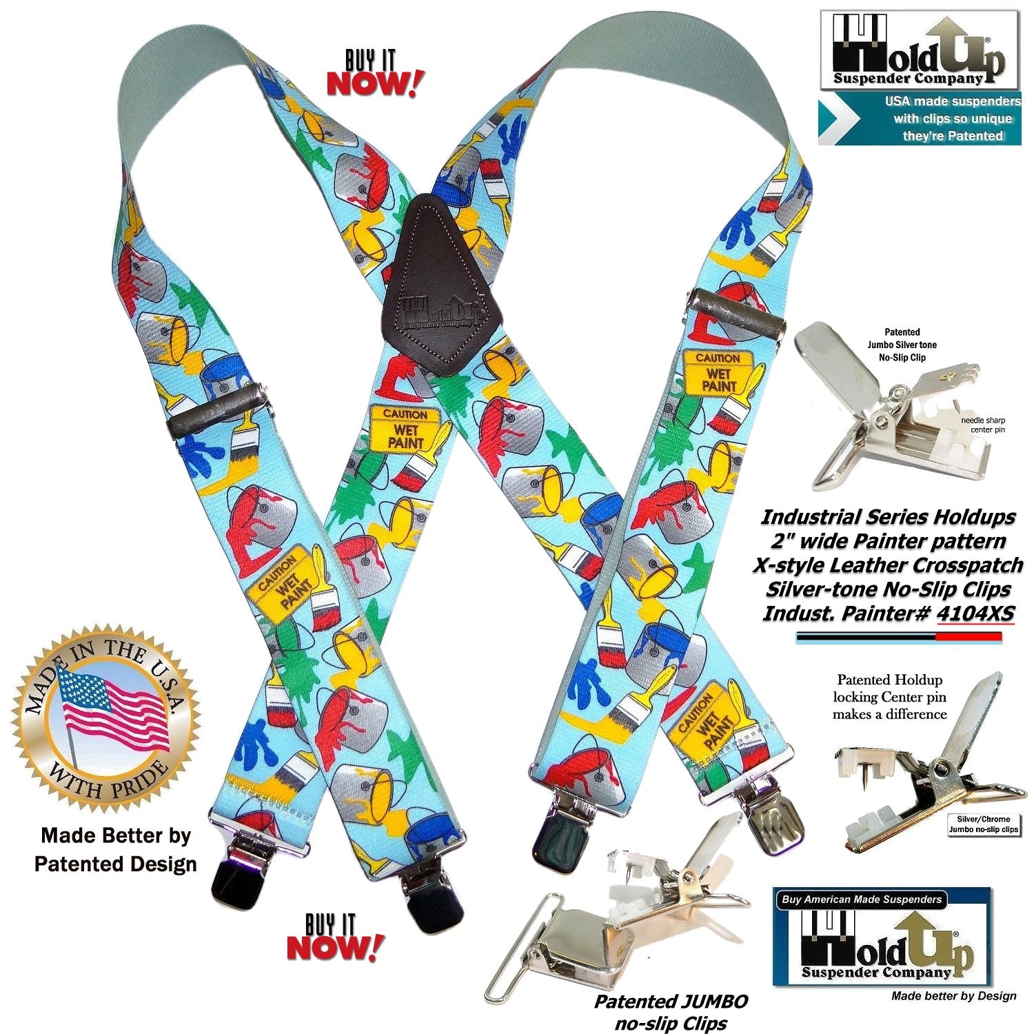 All Tradesmen Series Work Suspenders have chrome plated exclusive USA Patented Jumbo no-slip clips and are designed for the working man needing a wider heavy duty pant suspender. The colorfast patterned straps are 2" wide and all have a Genuine Brown leather logo embossed crosspatch.