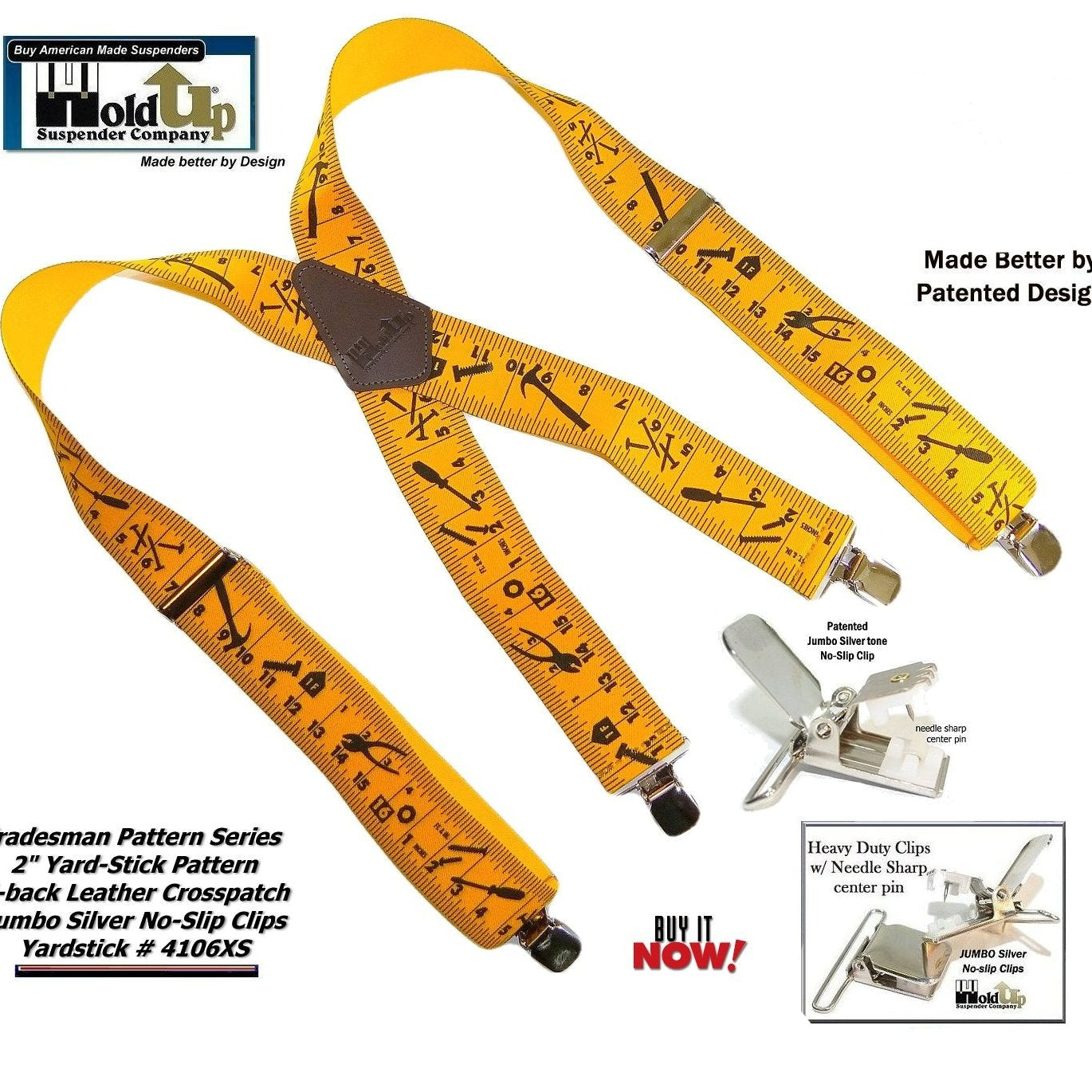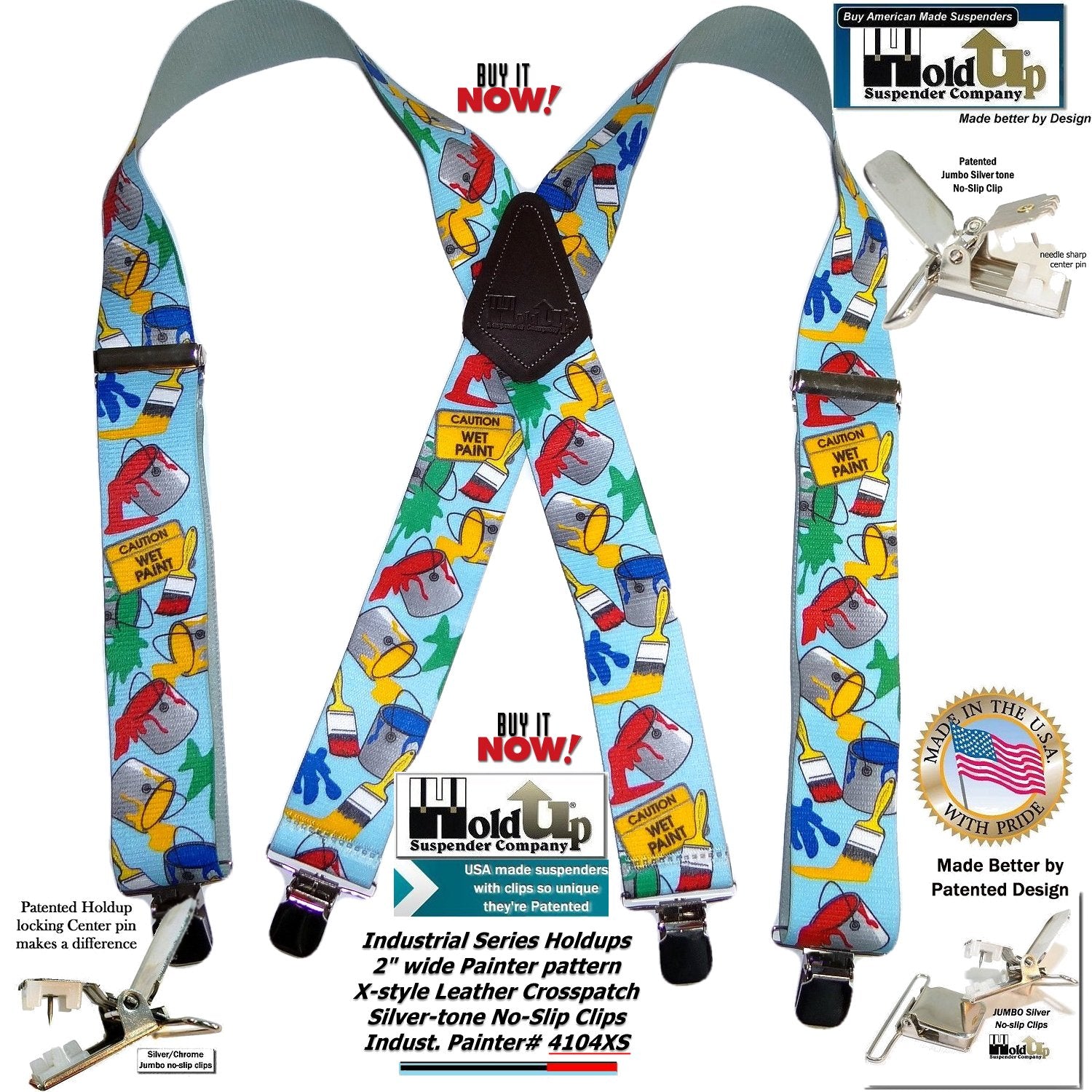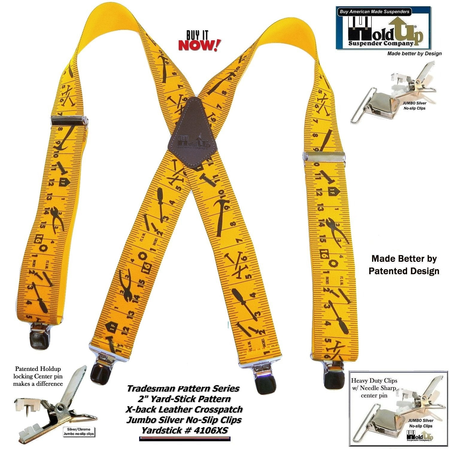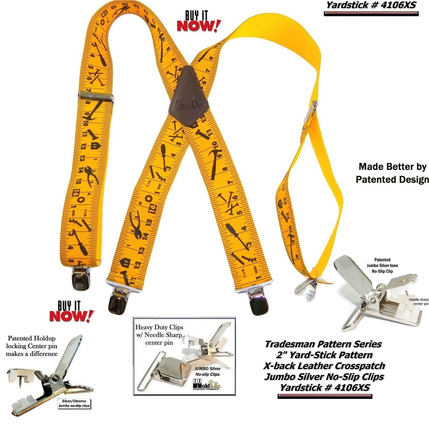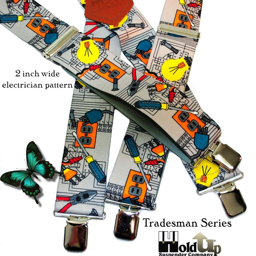 All Tradesmen Series Work Suspenders have chrome plated exclusive USA Patented Jumbo no-slip clips and are designed for the working man needing a wider heavy duty pant suspender. The colorfast patterned straps are 2" wide and all have a Genuine Brown leather logo embossed crosspatch.
