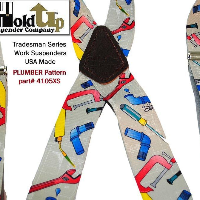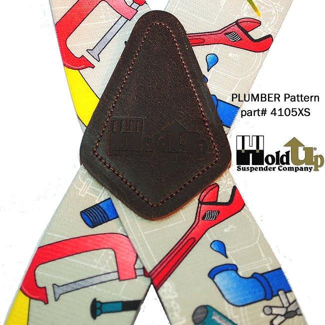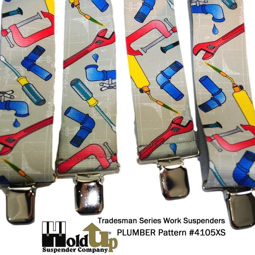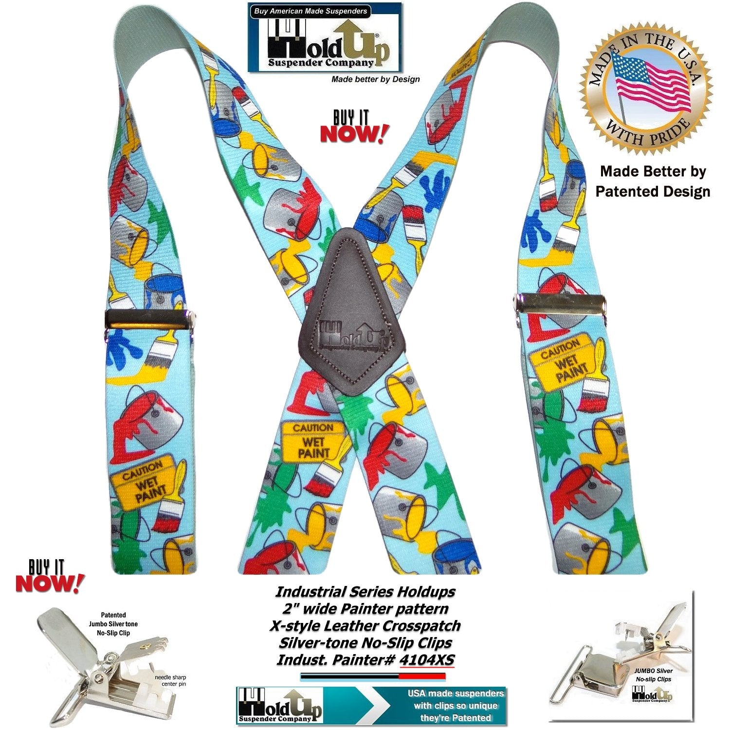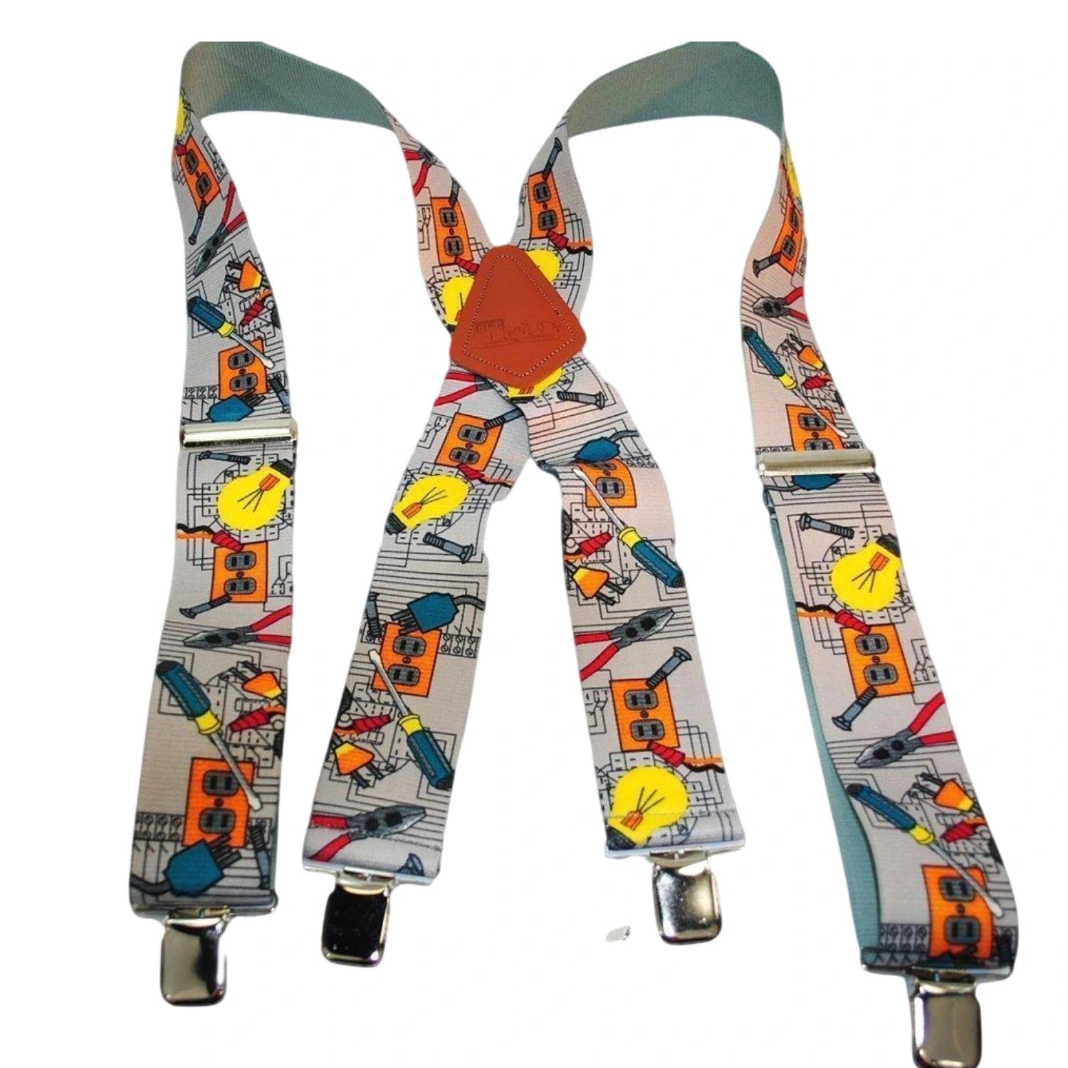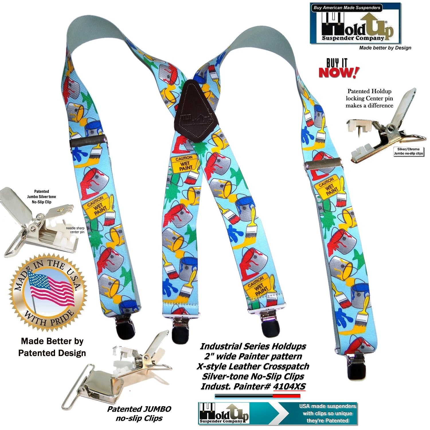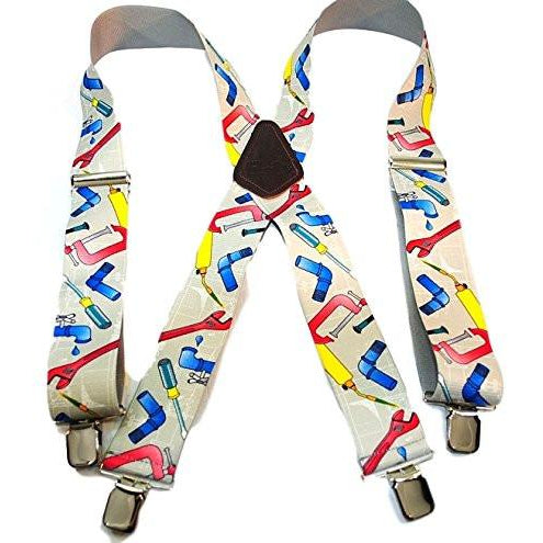 All Tradesmen Series Work Suspenders have chrome plated exclusive USA Patented Jumbo no-slip clips and are designed for the working man needing a wider heavy duty pant suspender. The colorfast patterned straps are 2" wide and all have a Genuine Brown leather logo embossed crosspatch.