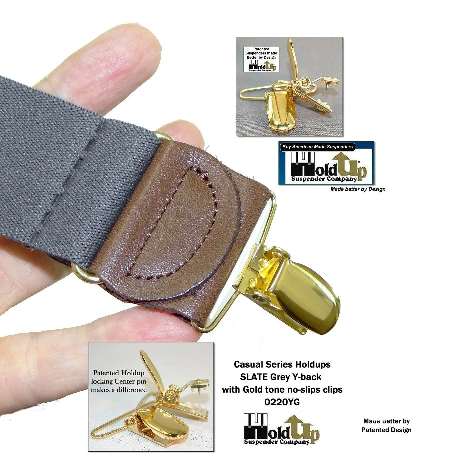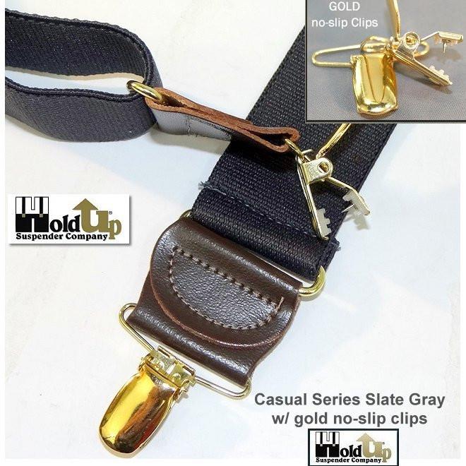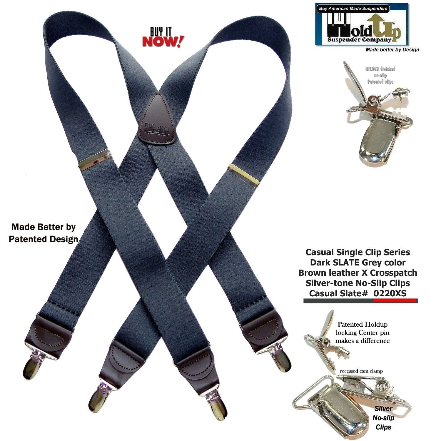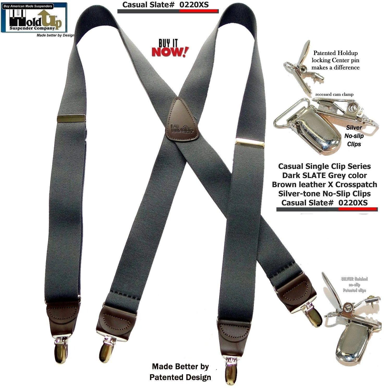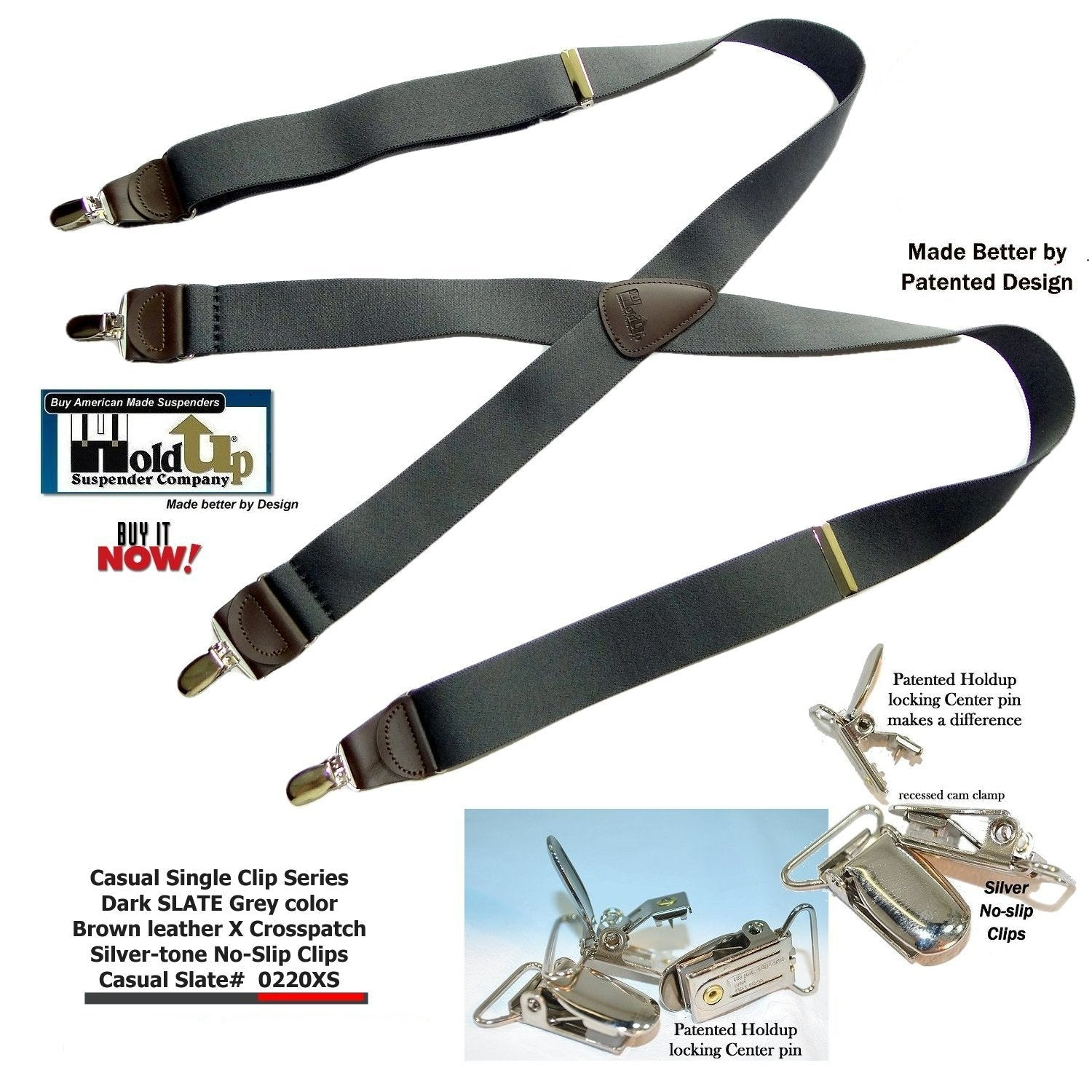 Our casual finger clip series Holdup Suspenders are all about choices. You get to choose from course weave elastic washable poly blend fabric colors. These casual series Holdups come in either X-Back or Y-Back styles with brown leather crosspatch embossed with our Holdup logo. Then you choose silver or gold finished no-slip metal clips and matching length adjusters. Securely Order your favorite color, back style preference and clip polished finish color options from our new Web shop collection of Casual Series Holdup Suspenders. Pay using your Amazon or PayPal account using your preferred credit/Debit Card with Free Freight option at checkout.