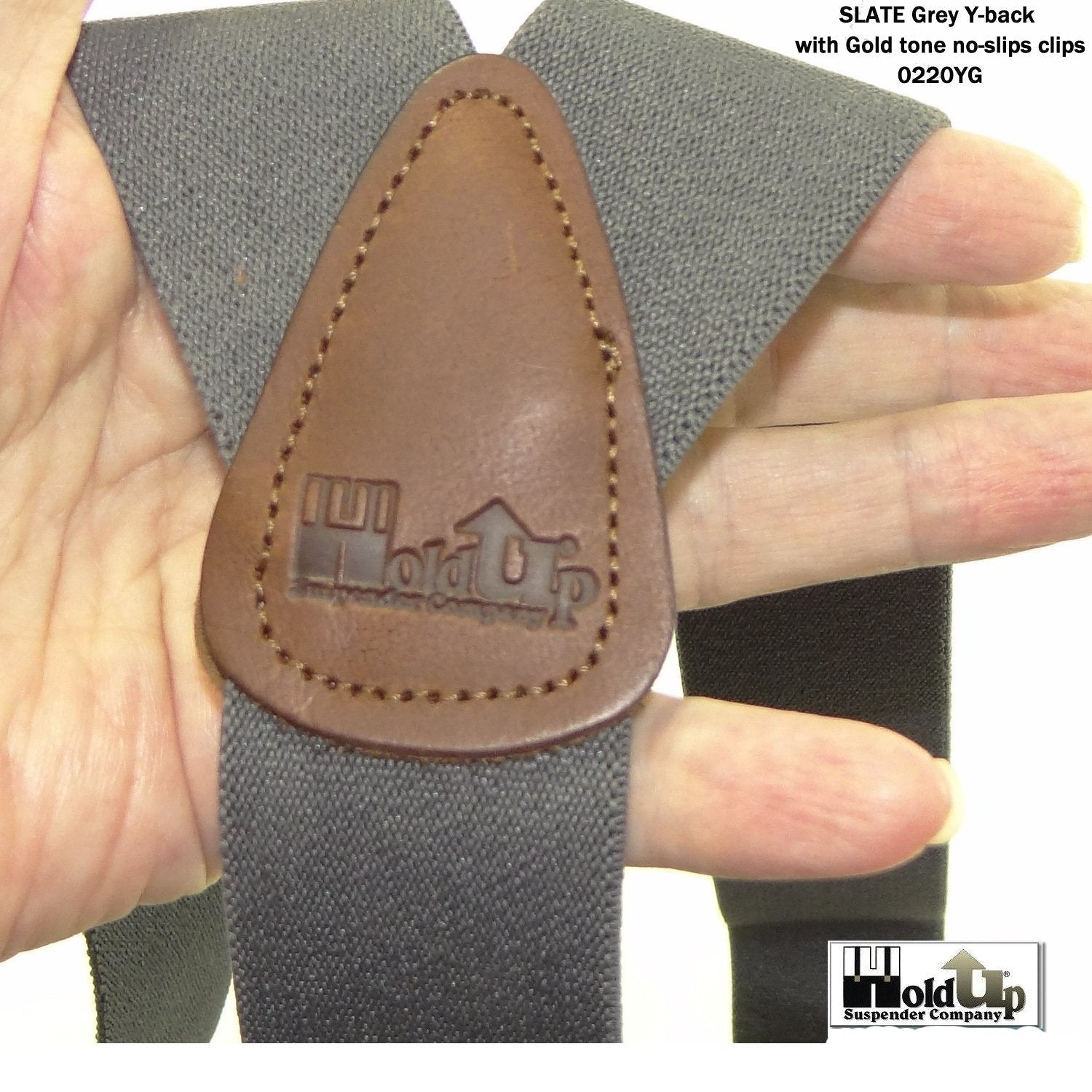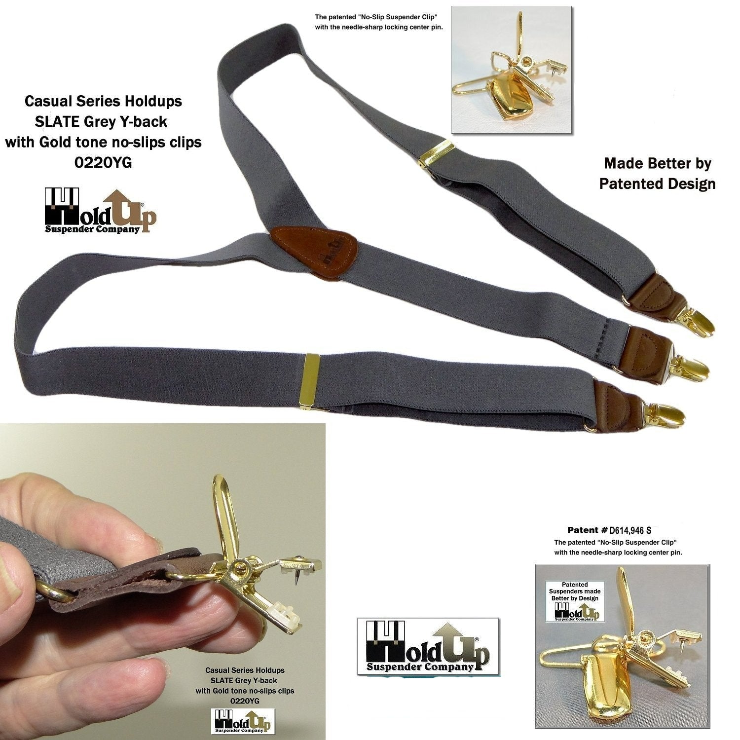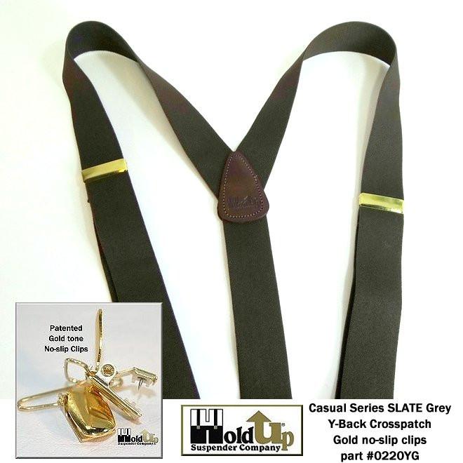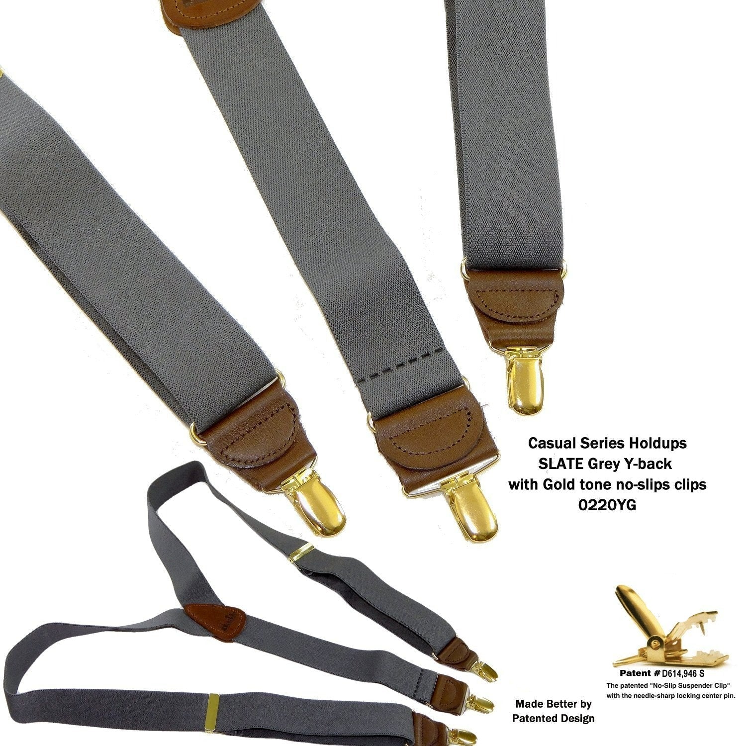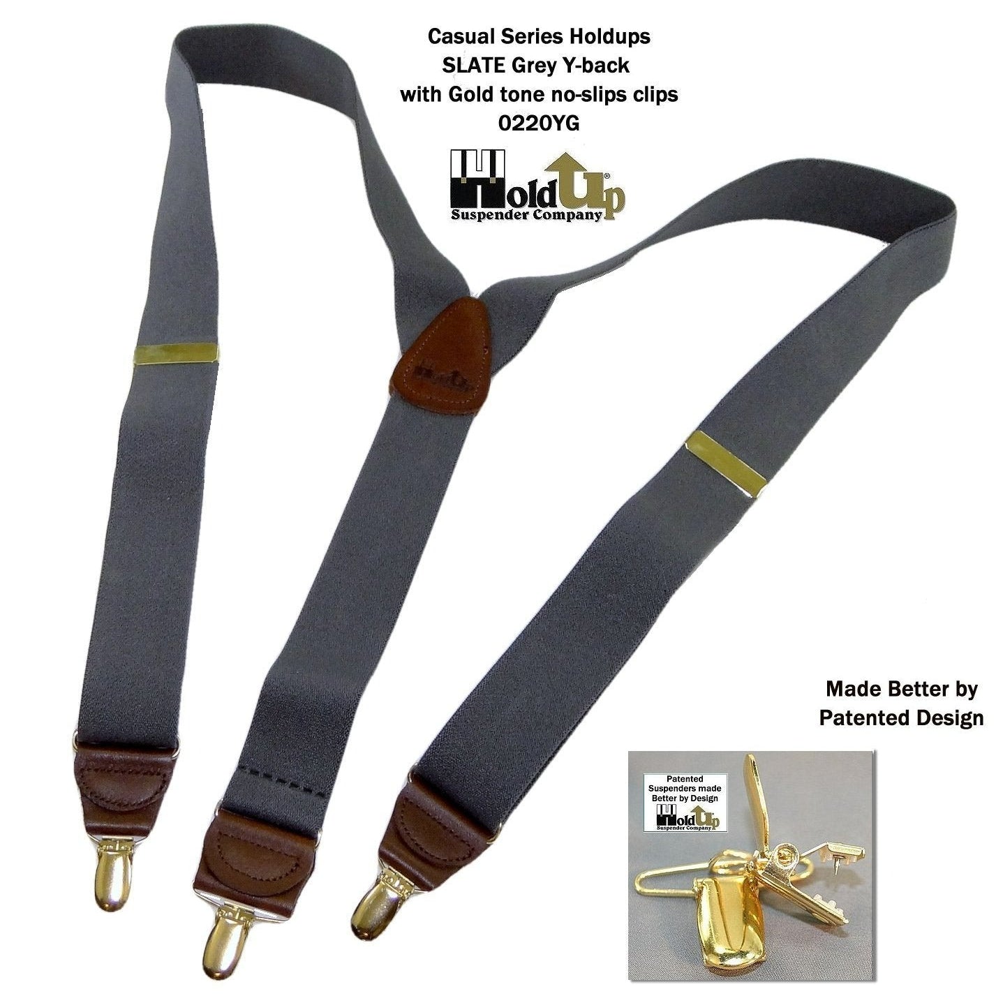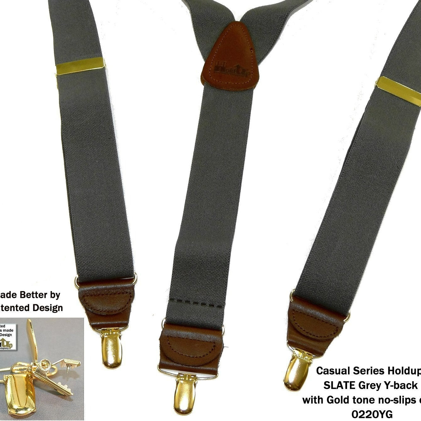 Our casual finger clip series Holdup Suspenders are all about choices. You get to choose from course weave elastic washable poly blend fabric colors. These casual series Holdups come in either X-Back or Y-Back styles with brown leather crosspatch embossed with our Holdup logo. Then you choose silver or gold finished no-slip metal clips and matching length adjusters. Securely Order your favorite color, back style preference and clip polished finish color options from our new Web shop collection of Casual Series Holdup Suspenders. Pay using your Amazon or PayPal account using your preferred credit/Debit Card with Free Freight option at checkout.
